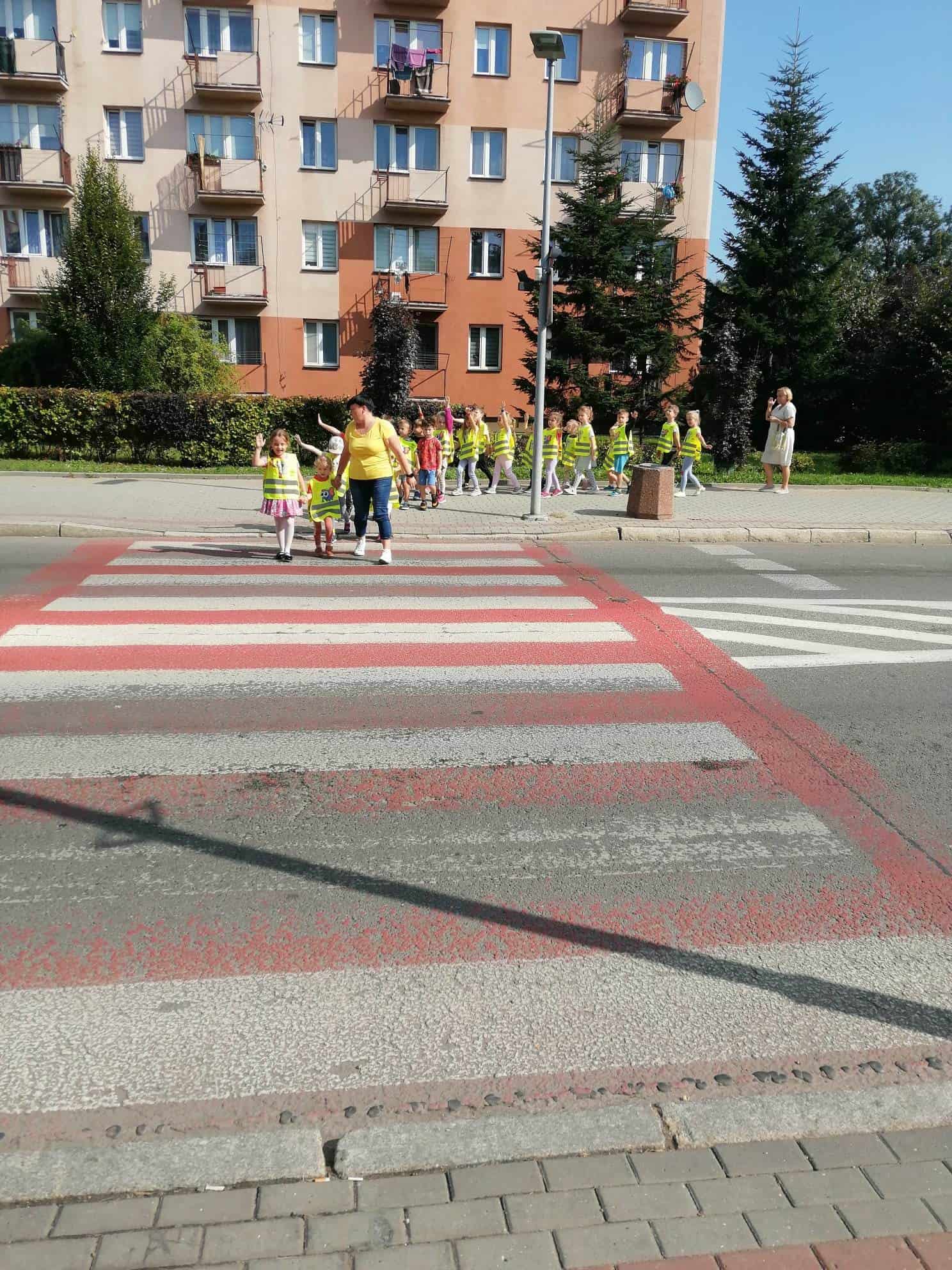 We wrześniu, przedszkolaki z Grupy Zielonej, uczestniczyły w cyklu zajęć związanych z bezpieczeństwem na drodze. Poznawaliśmy elementarne zasady ruchu drogowego. Poprzez wykorzystanie scenek dramowych uczyliśmy się poprawnie przechodzić przez jezdnię. Wcielaliśmy się w role przechodniów, którzy muszą przejść w miejscach bez sygnalizatora świetlnego, rozmawialiśmy także o odblaskach, o niebezpieczeństwie używania telefonów komórkowych podczas przechodzenia przez jezdnię, o pośpiechu, który może doprowadzić do nieszczęścia. Wszyscy utrwaliliśmy sobie najważniejsze numery alarmowe. Wykorzystując nasz interaktywny monitor oraz materiał rozwojowy mogliśmy poznać i utrwalić znaki drogowe, głównie te które spotykamy na naszych ulicach czy osiedlowych dróżkach. Nasze zajęcia teoretyczne miały swoje odzwierciedlenie w działaniach praktycznych – na pobliskim przejściu dla pieszych, ubrani w odblaskowe kamizelki, ćwiczyliśmy właściwe przechodzenie przez jezdnię.