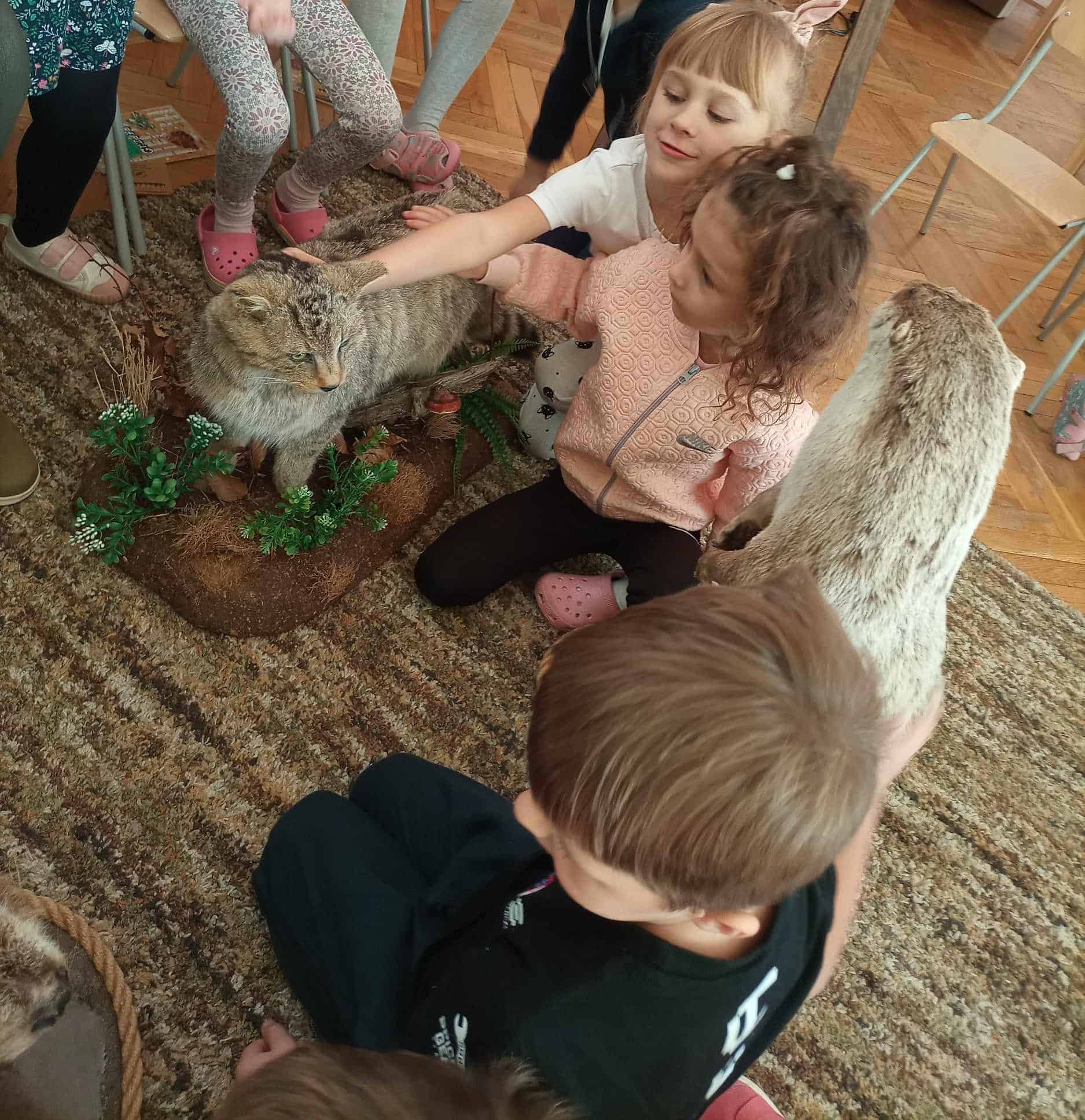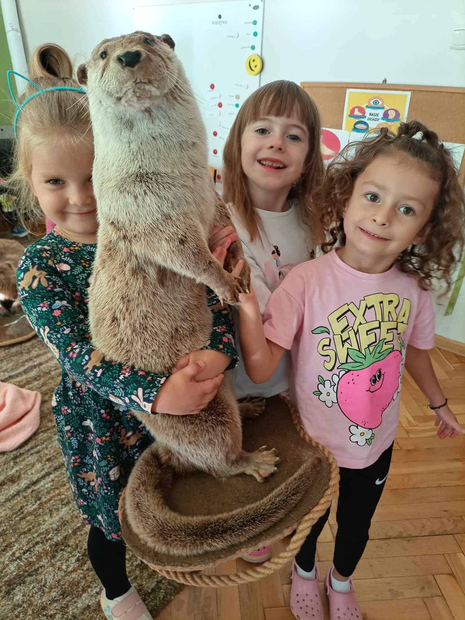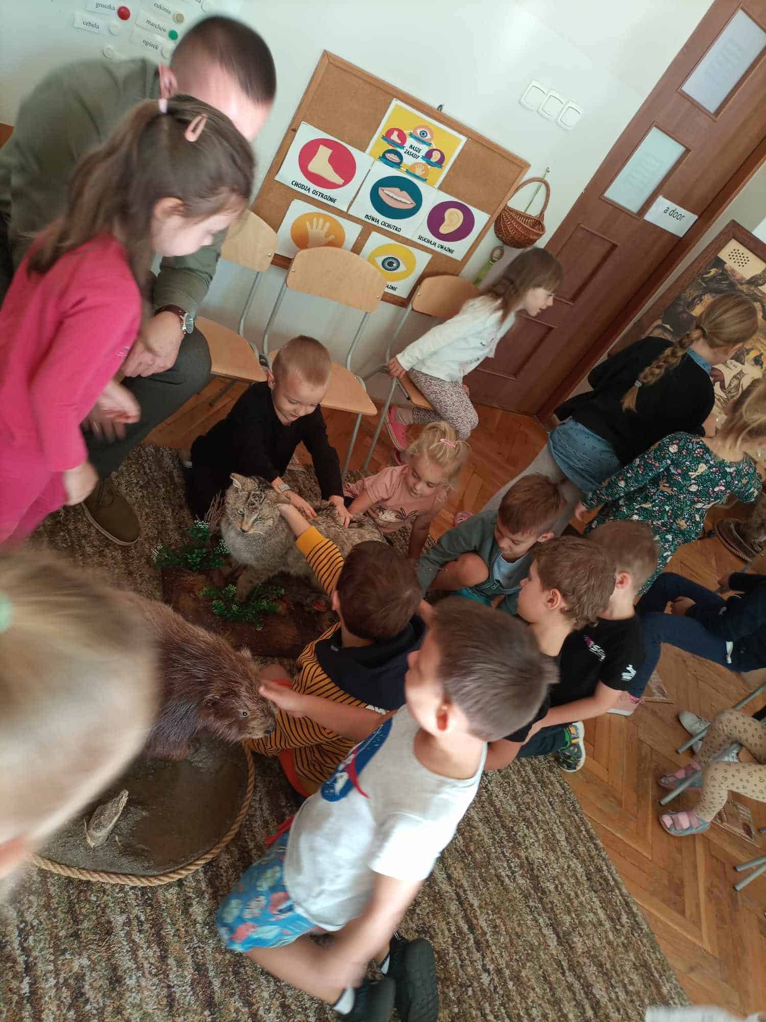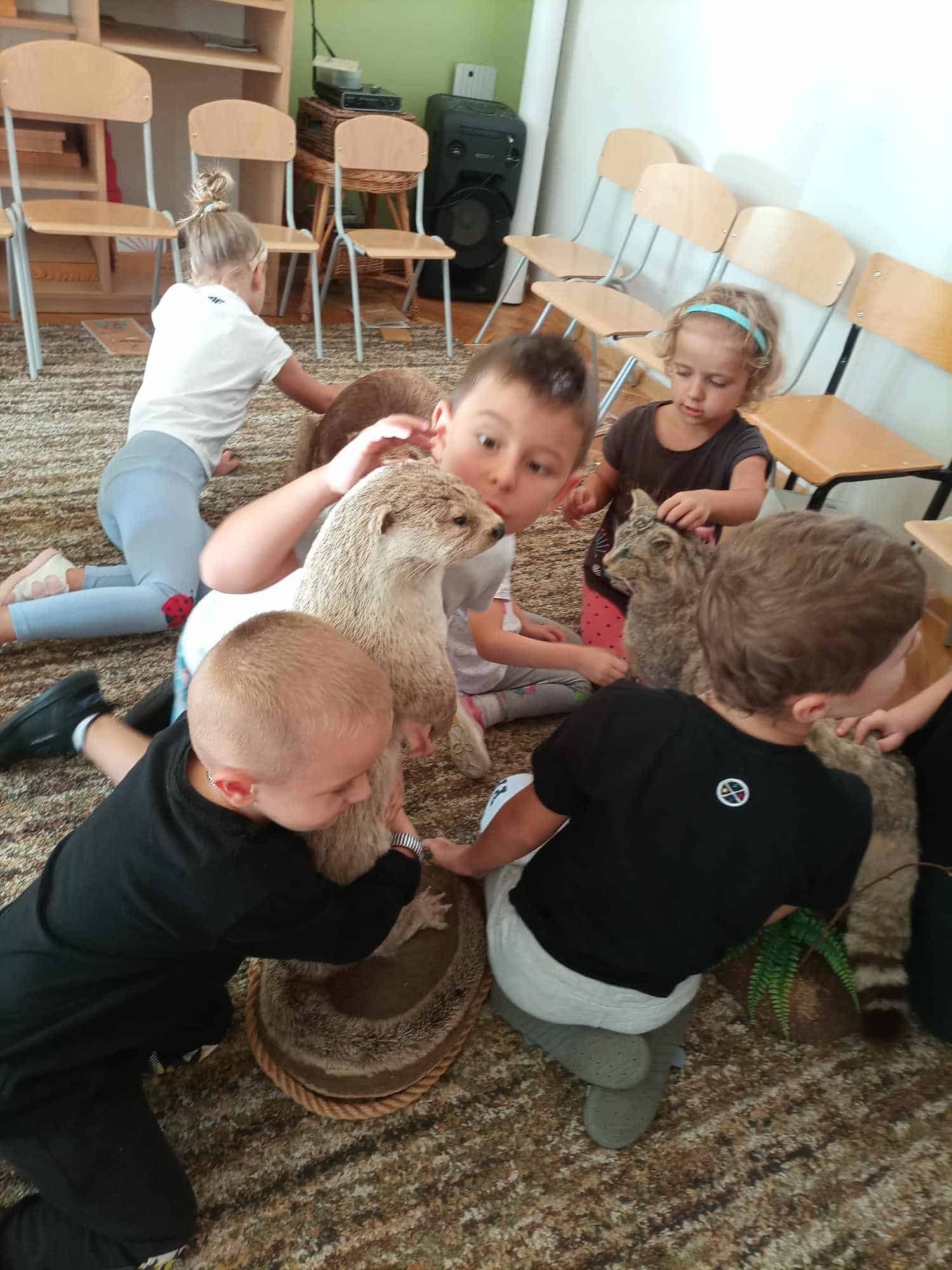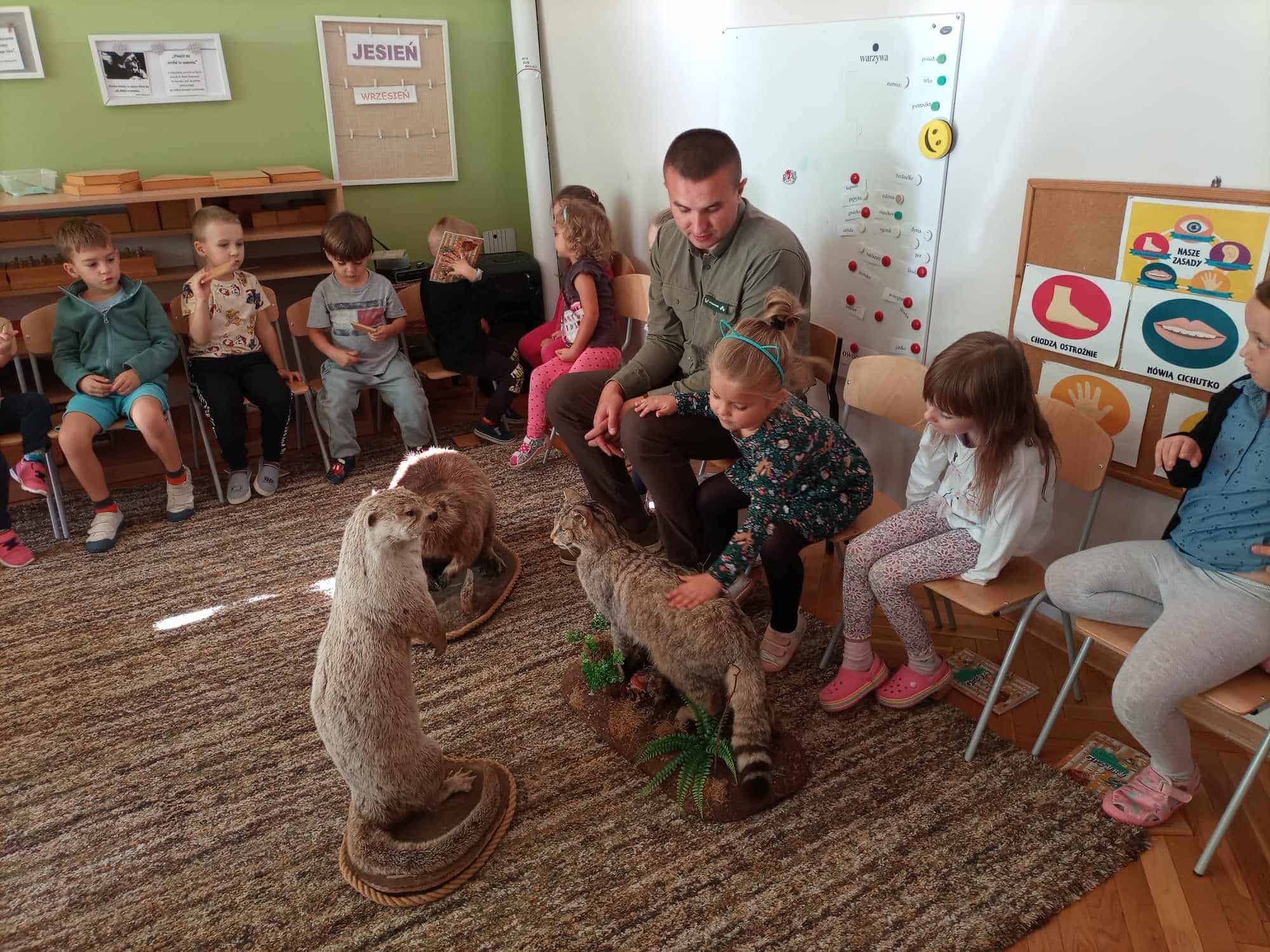 Na zakończenie spotkania słuchaliśmy informacji o żbiku, bobrze i wydrze. Dzieci chętnie podchodziły i z bliska przyglądały się poszczególnym zwierzętom, dotykały sierści (bo takie eksponaty także dostarczył na lekcję Pan Rafał 🙂 ) Żegnając się z nami, Pan Rafał obdarował wszystkie dzieci kolorowankami i zestawem kredek, a nasze przedszkolaki gromkimi podziękowaniami i uśmiechem na twarzy pożegnały naszego gościa. Kolejne spotkanie już na wiosnę, tym razem to my odwiedzimy Jarosławskie Nadleśnictwo 🙂 Nie możemy się już doczekać…😍
