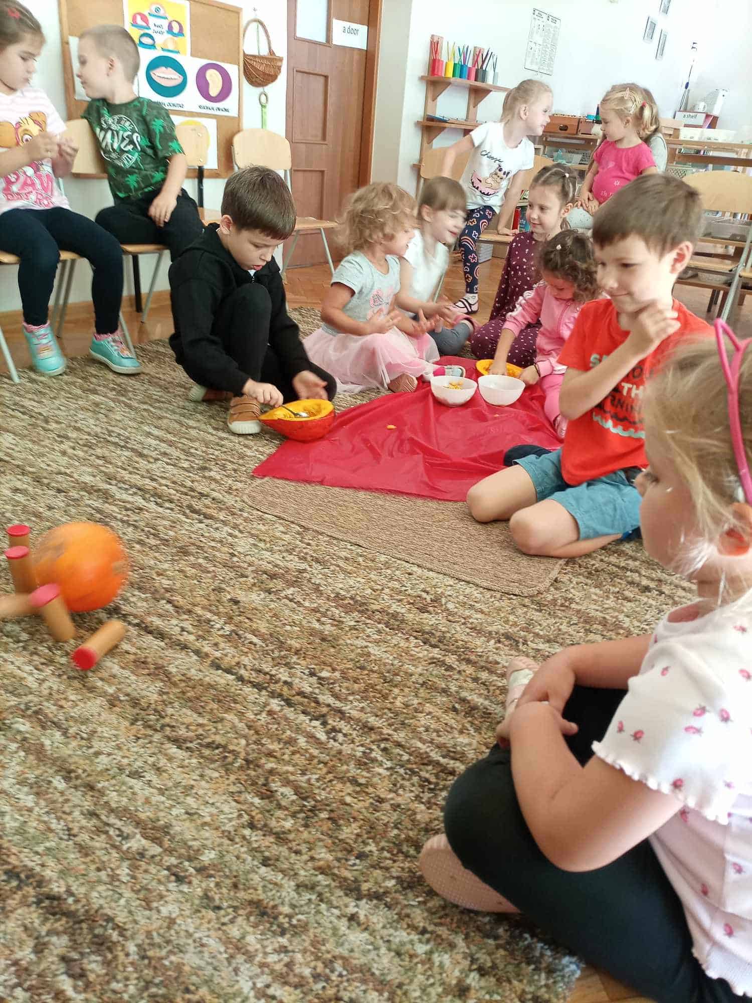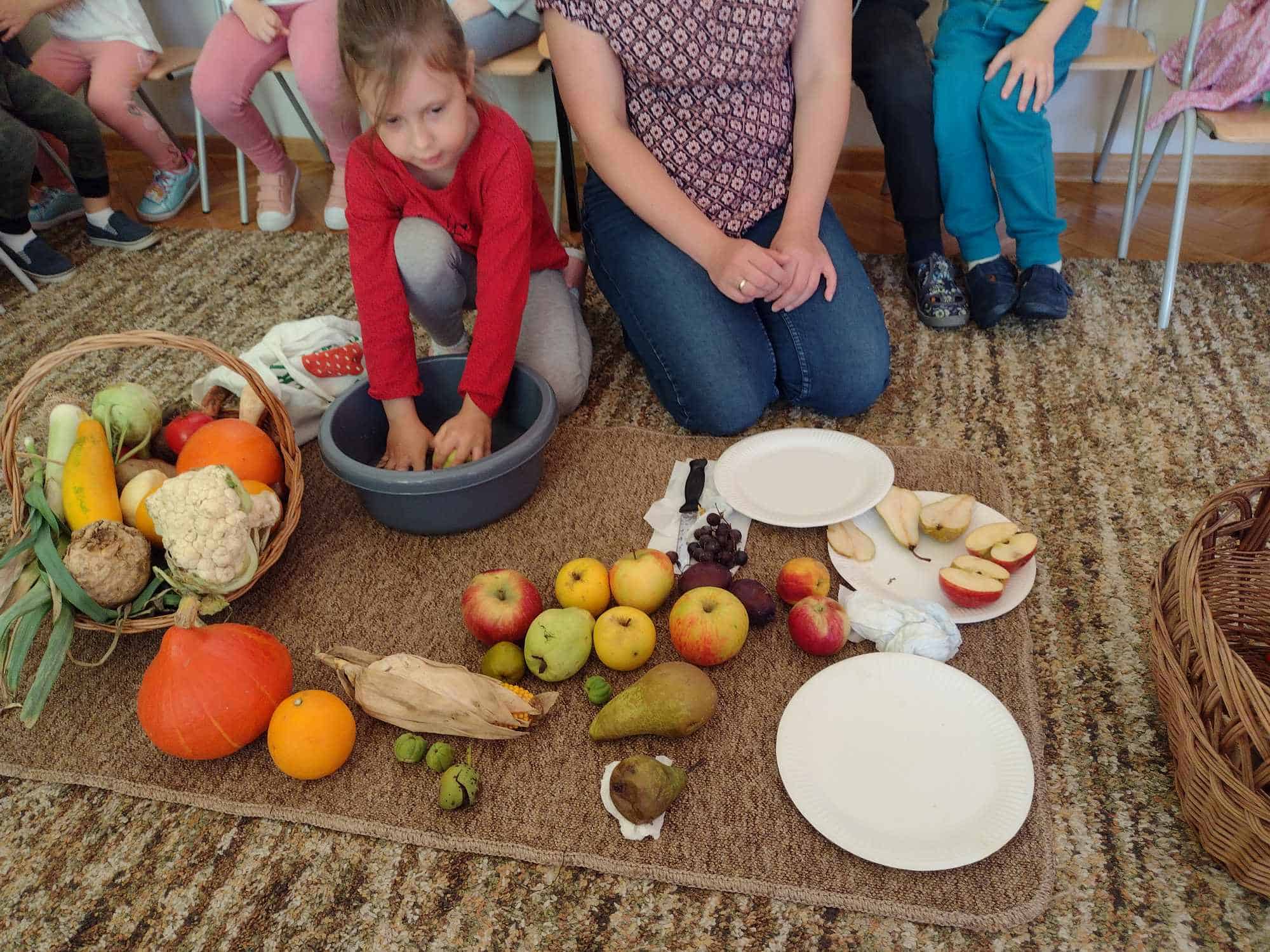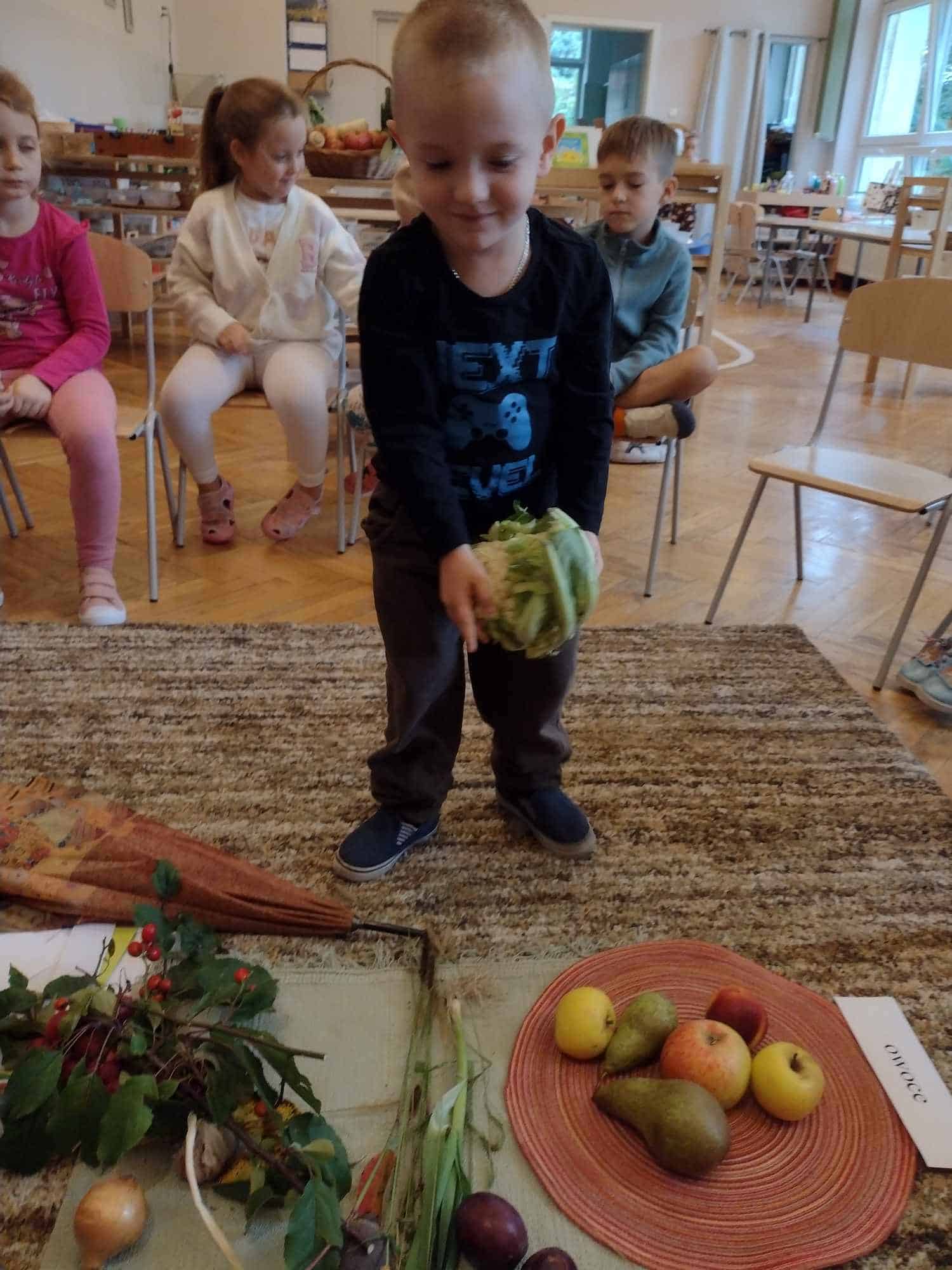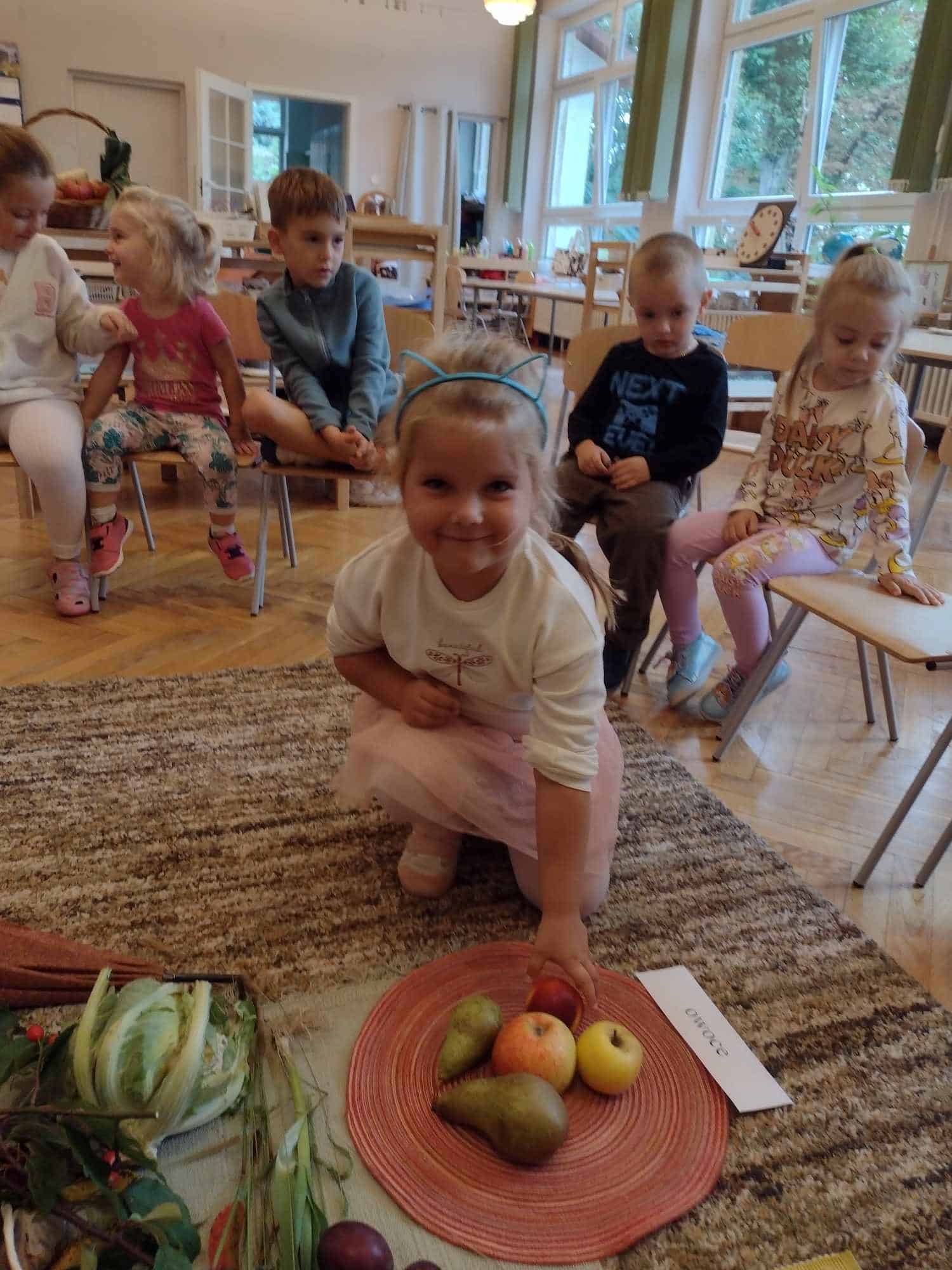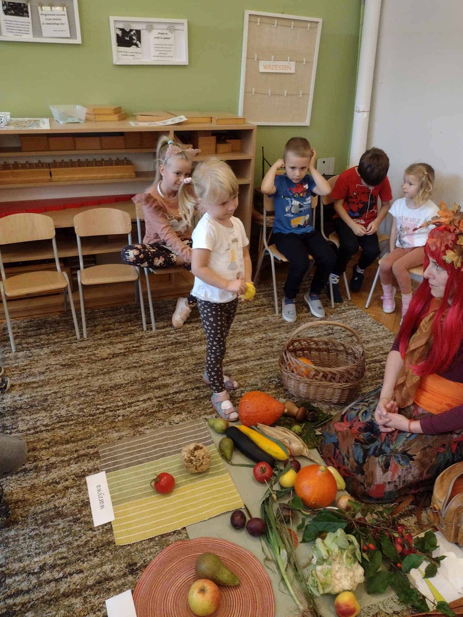 W ostatnim tygodniu dzieci z grupy zielonej przywitały Jesień, która zawitała także do ich sali. Na początku tygodnia przypomnieliśmy sobie nazwy pór roku i dopasowaliśmy nazwy do ilustracji. Później dzieci zaprosiły Jesień do sali – przyszła z pełnym koszem owoców i warzyw, a w torebce przyniosła jesienną pogodę i jesienne zagadki. Dzieci oglądały dary jesieni z grządek, ogrodów i sadów, nazywały je, a także rozdzieliły na zbiór owoców i warzyw. Starszaki dobierały podpisy do owoców i warzyw. Tworzyliśmy też zbiory w danym kolorze, a także zbiory figur geometrycznych i przeliczaliśmy elementy w zbiorach. Nauczyliśmy się piosenki o Jesieni z pełnym koszem, wspólnie zaśpiewaliśmy i zagraliśmy na instrumentach. Aby usprawnić motorykę małą i przygotować rękę do pisania, dzieci pracowały z metalowymi matrycami, odrysowując kształty owoców (jabłka gruszki i śliwki), które następnie wypełniały suchymi pastelami. Poznaliśmy też budowę dyni przy pomocy kart trójdzielnych, a następnie użyliśmy prawdziwej dyni – dzieci wskazywały poszczególne elementy, wyłuskiwały i przeliczały pestki. Graliśmy też w dyniowe kręgle. Był też czas na owocowe wyszywanki, pracę z szorstkim, ruchomym i żłobionym alfabetem. Rozmawialiśmy o przygotowaniu jedzenia do spożycia, myliśmy owoce, oglądaliśmy i porównywaliśmy wnętrze owoców i warzyw. Mówiliśmy o witaminach, które zawarte są w owocach i warzywach, sprawdzaliśmy jakie kolory pozostawiają warzywne stemple. Chłopcy intensywnie zajęli się łuskaniem fasoli i orzechów, a na koniec mogliśmy spróbować jak smakują przyniesione przez dzieci dary Jesieni.