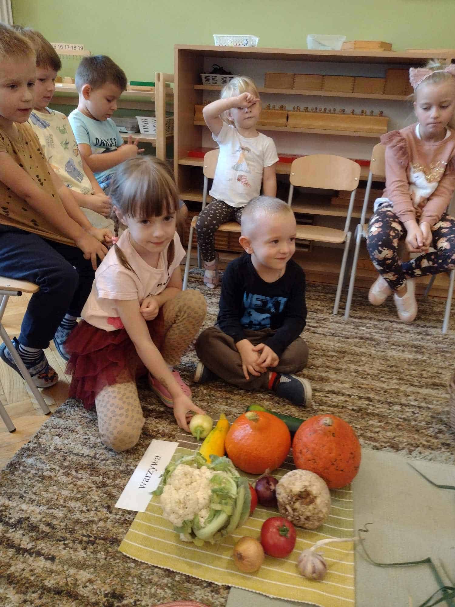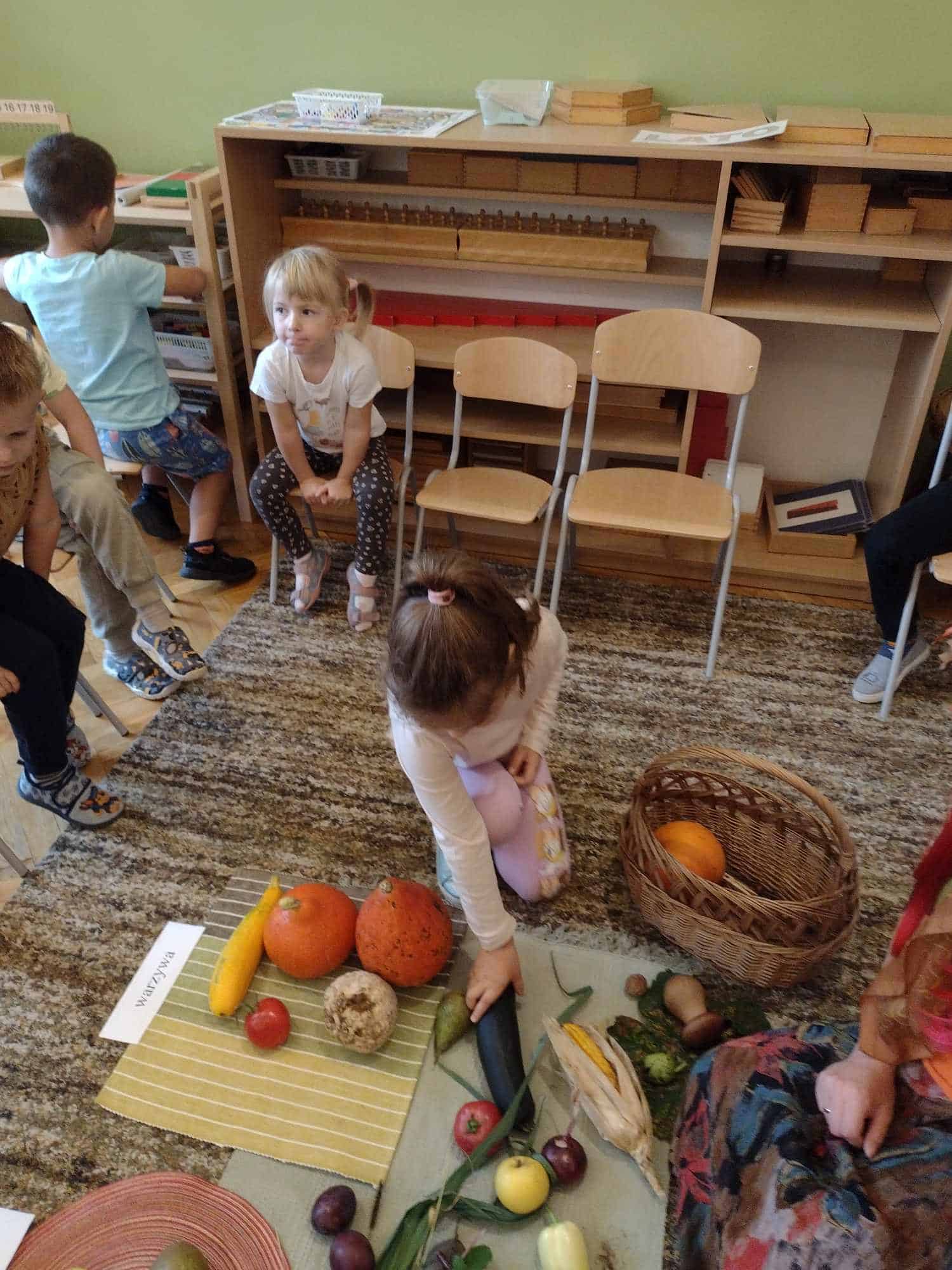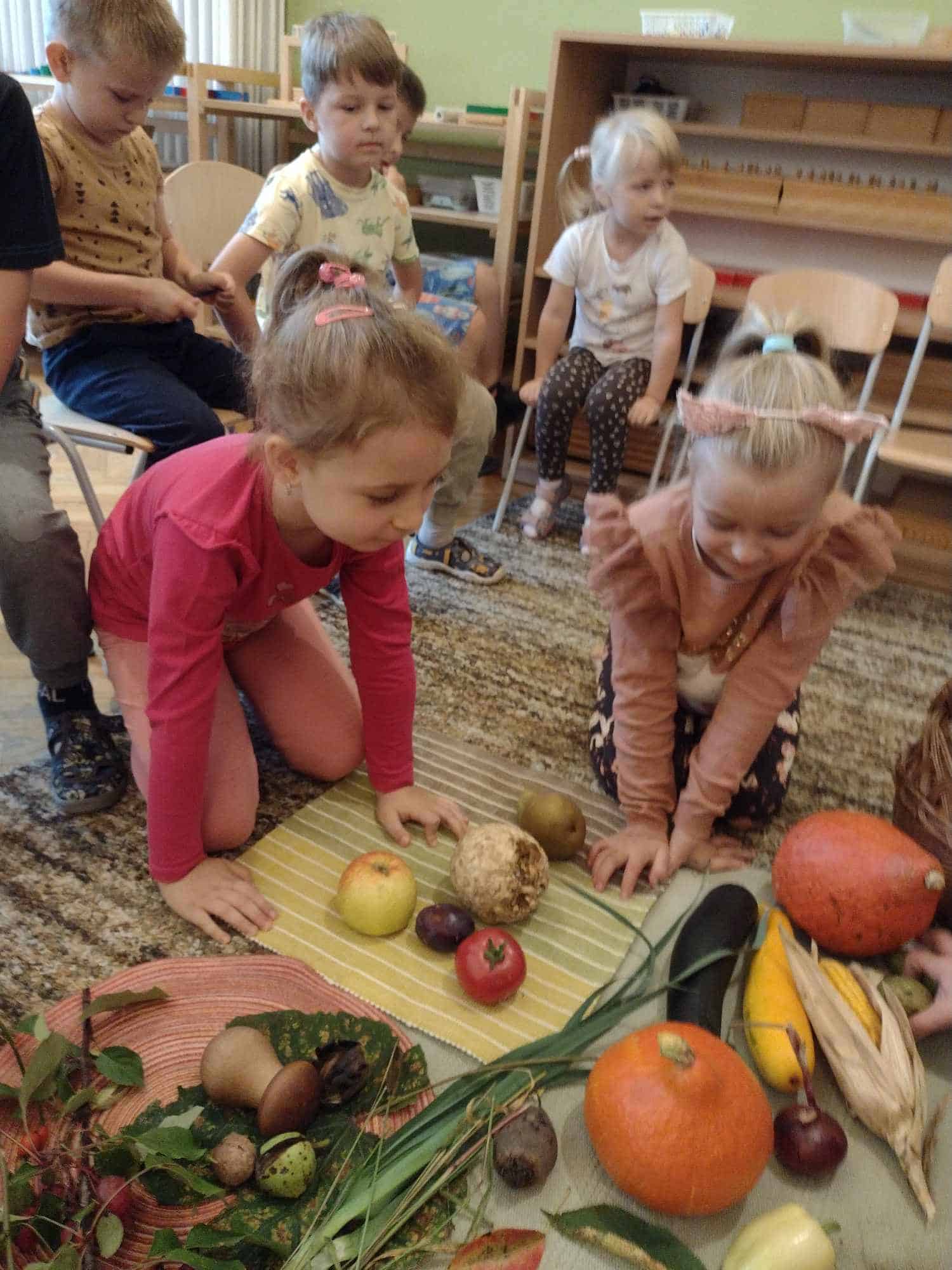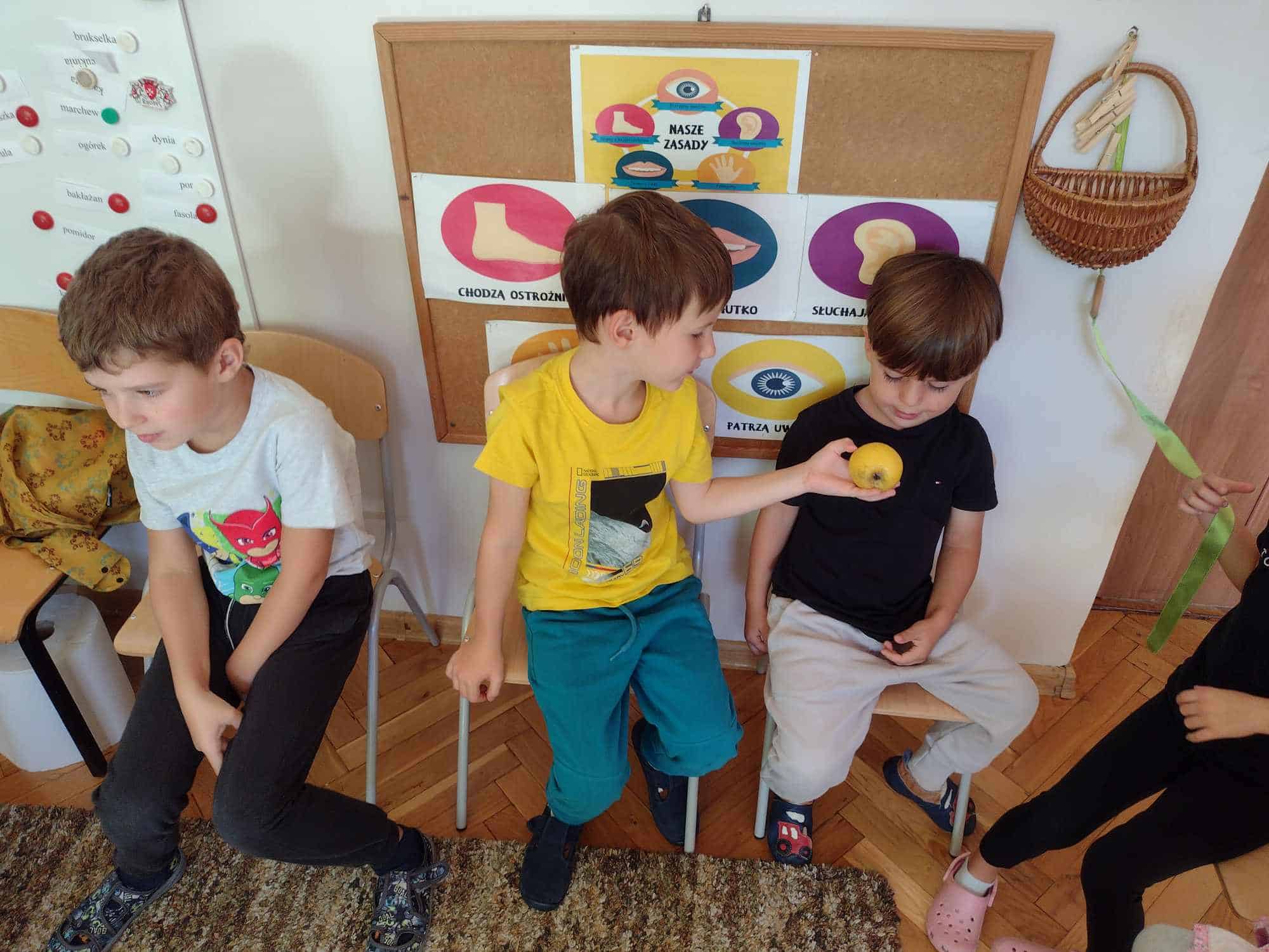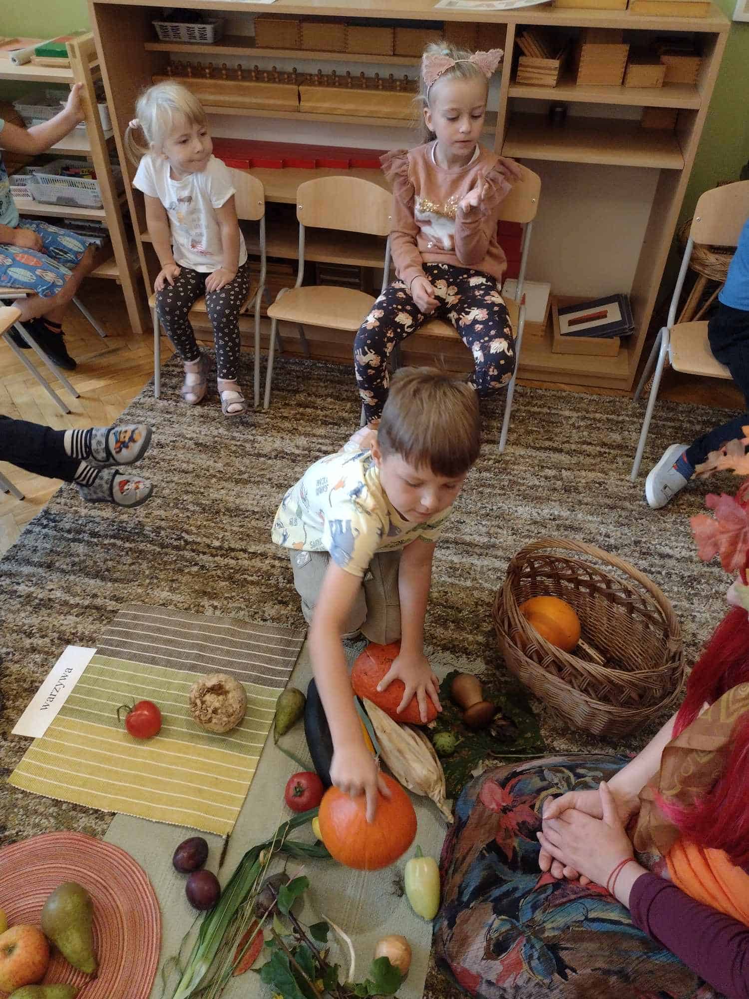 W ostatnim tygodniu dzieci z grupy zielonej przywitały Jesień, która zawitała także do ich sali. Na początku tygodnia przypomnieliśmy sobie nazwy pór roku i dopasowaliśmy nazwy do ilustracji. Później dzieci zaprosiły Jesień do sali – przyszła z pełnym koszem owoców i warzyw, a w torebce przyniosła jesienną pogodę i jesienne zagadki. Dzieci oglądały dary jesieni z grządek, ogrodów i sadów, nazywały je, a także rozdzieliły na zbiór owoców i warzyw. Starszaki dobierały podpisy do owoców i warzyw. Tworzyliśmy też zbiory w danym kolorze, a także zbiory figur geometrycznych i przeliczaliśmy elementy w zbiorach. Nauczyliśmy się piosenki o Jesieni z pełnym koszem, wspólnie zaśpiewaliśmy i zagraliśmy na instrumentach. Aby usprawnić motorykę małą i przygotować rękę do pisania, dzieci pracowały z metalowymi matrycami, odrysowując kształty owoców (jabłka gruszki i śliwki), które następnie wypełniały suchymi pastelami. Poznaliśmy też budowę dyni przy pomocy kart trójdzielnych, a następnie użyliśmy prawdziwej dyni – dzieci wskazywały poszczególne elementy, wyłuskiwały i przeliczały pestki. Graliśmy też w dyniowe kręgle. Był też czas na owocowe wyszywanki, pracę z szorstkim, ruchomym i żłobionym alfabetem. Rozmawialiśmy o przygotowaniu jedzenia do spożycia, myliśmy owoce, oglądaliśmy i porównywaliśmy wnętrze owoców i warzyw. Mówiliśmy o witaminach, które zawarte są w owocach i warzywach, sprawdzaliśmy jakie kolory pozostawiają warzywne stemple. Chłopcy intensywnie zajęli się łuskaniem fasoli i orzechów, a na koniec mogliśmy spróbować jak smakują przyniesione przez dzieci dary Jesieni.