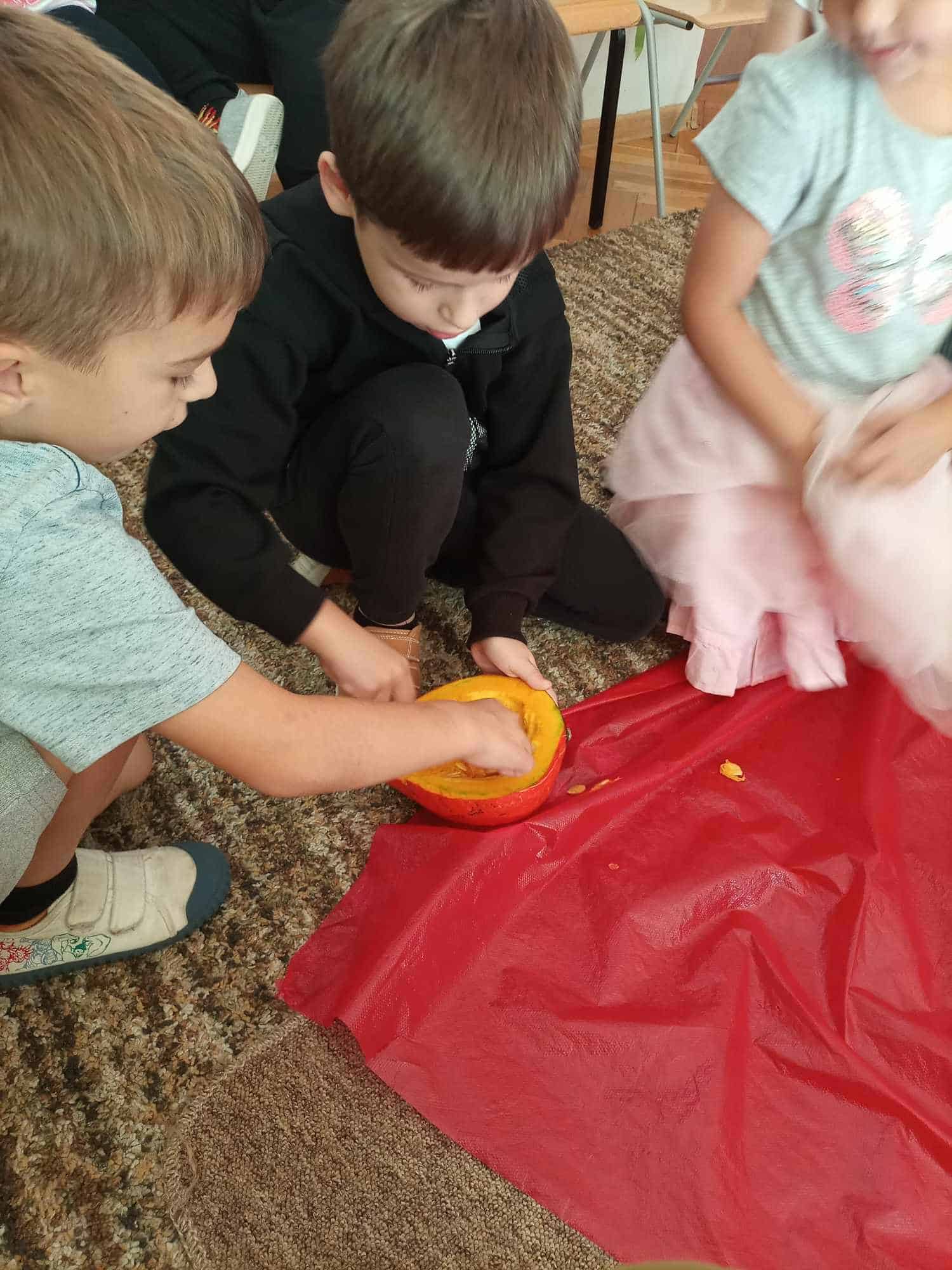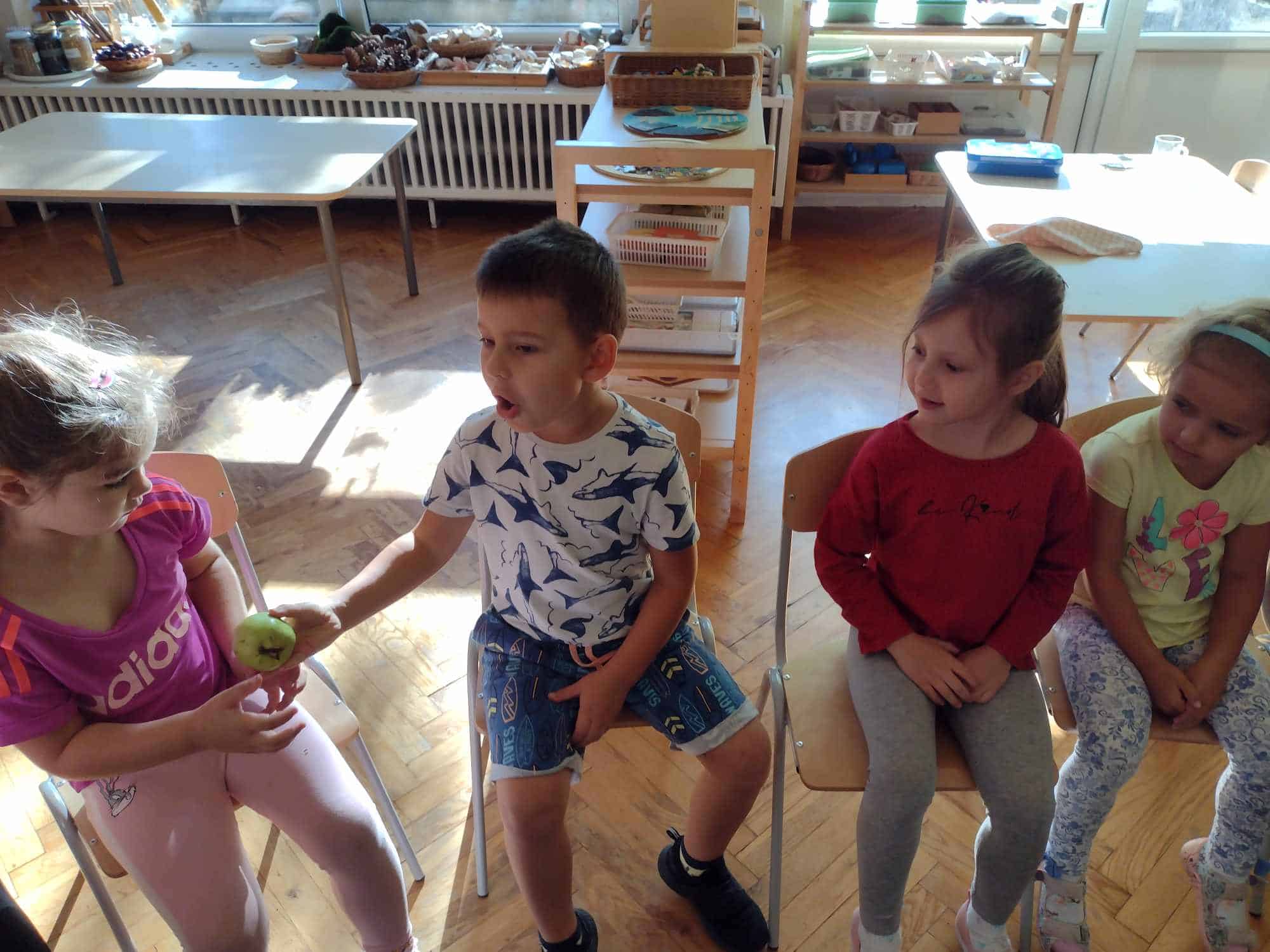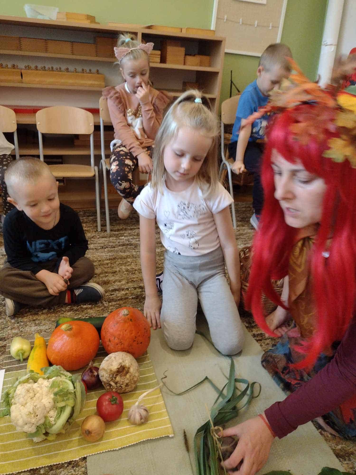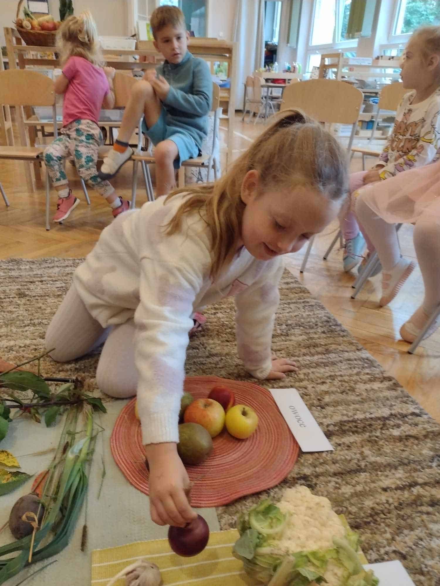 W ostatnim tygodniu dzieci z grupy zielonej przywitały Jesień, która zawitała także do ich sali. Na początku tygodnia przypomnieliśmy sobie nazwy pór roku i dopasowaliśmy nazwy do ilustracji. Później dzieci zaprosiły Jesień do sali – przyszła z pełnym koszem owoców i warzyw, a w torebce przyniosła jesienną pogodę i jesienne zagadki. Dzieci oglądały dary jesieni z grządek, ogrodów i sadów, nazywały je, a także rozdzieliły na zbiór owoców i warzyw. Starszaki dobierały podpisy do owoców i warzyw. Tworzyliśmy też zbiory w danym kolorze, a także zbiory figur geometrycznych i przeliczaliśmy elementy w zbiorach. Nauczyliśmy się piosenki o Jesieni z pełnym koszem, wspólnie zaśpiewaliśmy i zagraliśmy na instrumentach. Aby usprawnić motorykę małą i przygotować rękę do pisania, dzieci pracowały z metalowymi matrycami, odrysowując kształty owoców (jabłka gruszki i śliwki), które następnie wypełniały suchymi pastelami. Poznaliśmy też budowę dyni przy pomocy kart trójdzielnych, a następnie użyliśmy prawdziwej dyni – dzieci wskazywały poszczególne elementy, wyłuskiwały i przeliczały pestki. Graliśmy też w dyniowe kręgle. Był też czas na owocowe wyszywanki, pracę z szorstkim, ruchomym i żłobionym alfabetem. Rozmawialiśmy o przygotowaniu jedzenia do spożycia, myliśmy owoce, oglądaliśmy i porównywaliśmy wnętrze owoców i warzyw. Mówiliśmy o witaminach, które zawarte są w owocach i warzywach, sprawdzaliśmy jakie kolory pozostawiają warzywne stemple. Chłopcy intensywnie zajęli się łuskaniem fasoli i orzechów, a na koniec mogliśmy spróbować jak smakują przyniesione przez dzieci dary Jesieni.