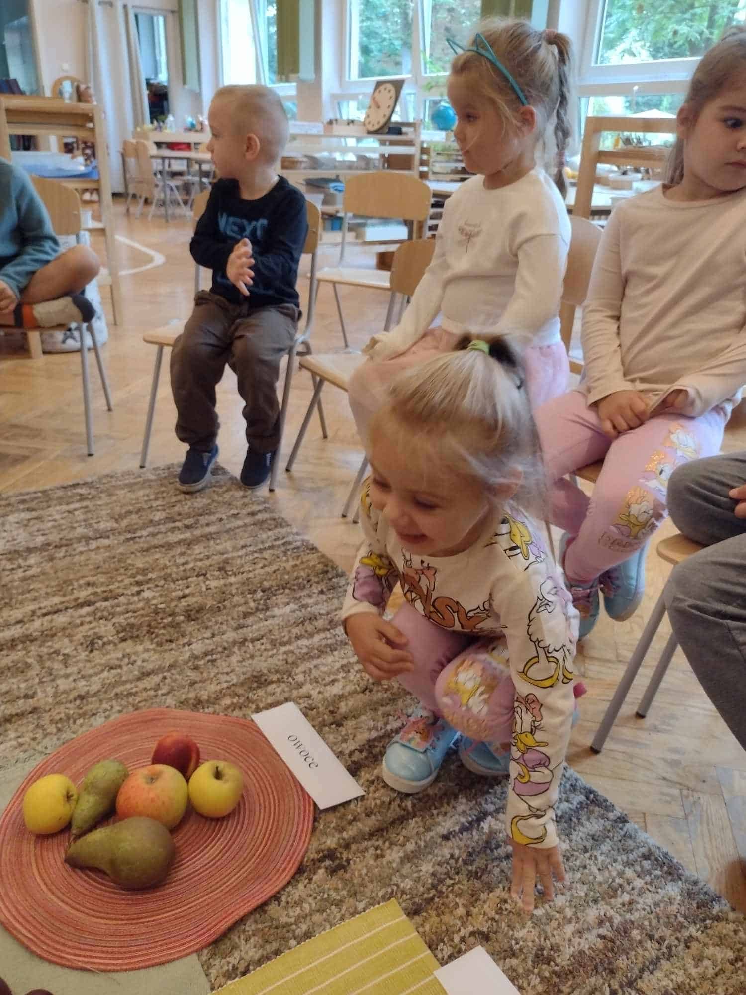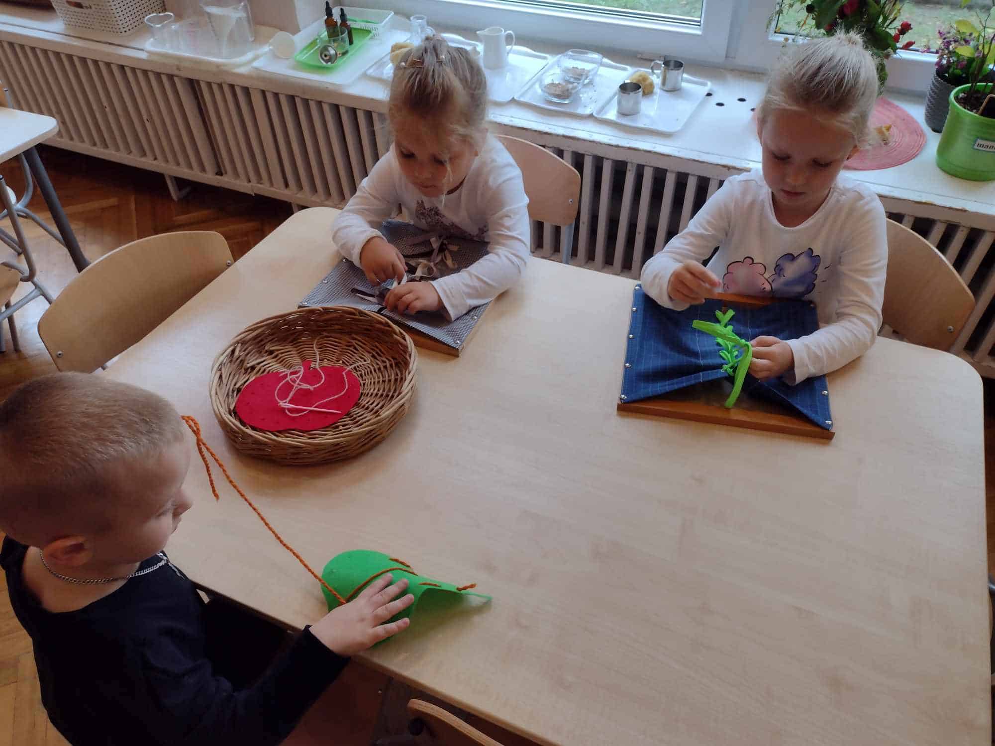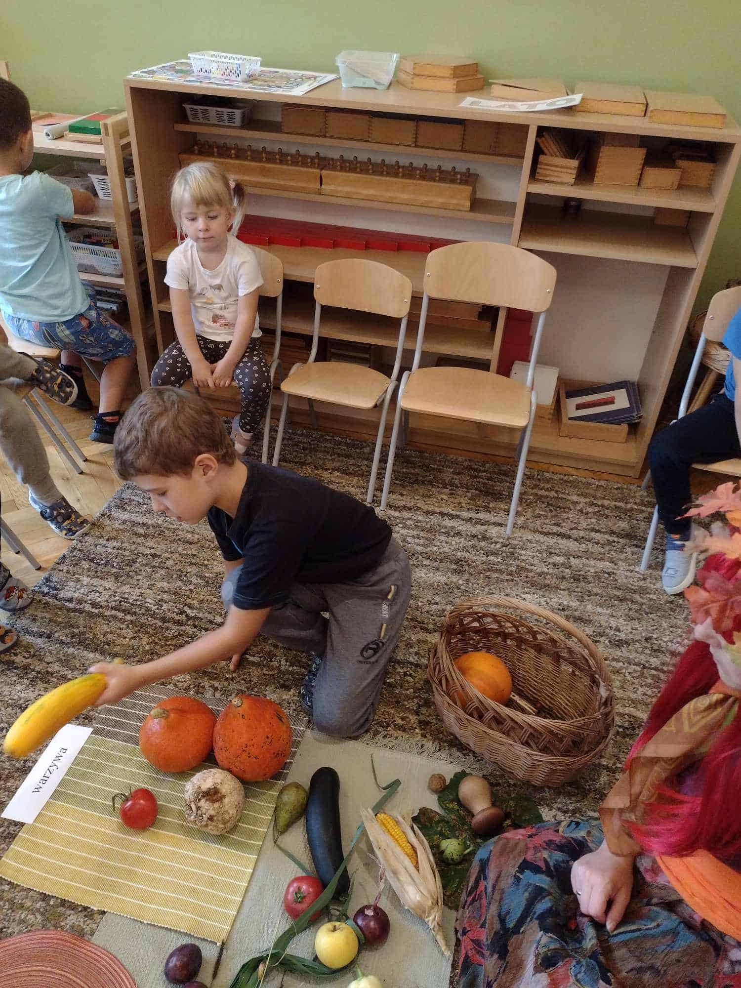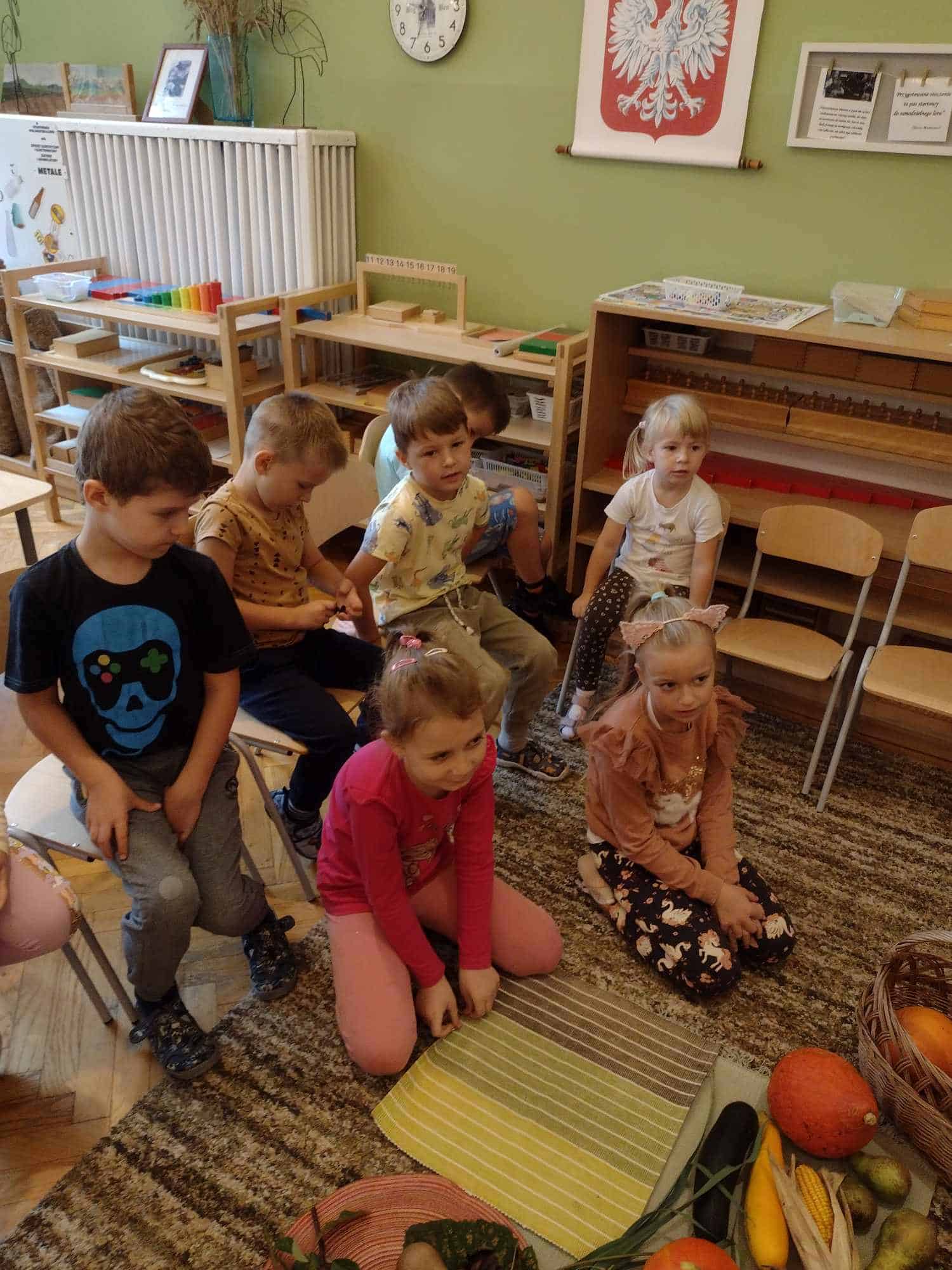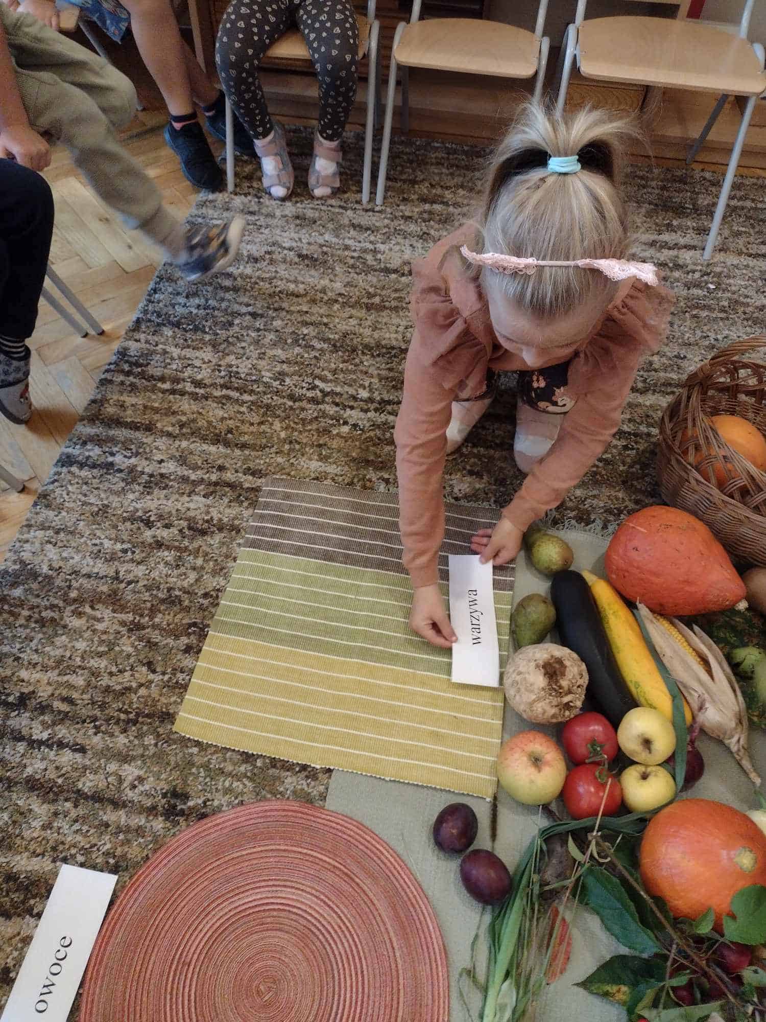 W ostatnim tygodniu dzieci z grupy zielonej przywitały Jesień, która zawitała także do ich sali. Na początku tygodnia przypomnieliśmy sobie nazwy pór roku i dopasowaliśmy nazwy do ilustracji. Później dzieci zaprosiły Jesień do sali – przyszła z pełnym koszem owoców i warzyw, a w torebce przyniosła jesienną pogodę i jesienne zagadki. Dzieci oglądały dary jesieni z grządek, ogrodów i sadów, nazywały je, a także rozdzieliły na zbiór owoców i warzyw. Starszaki dobierały podpisy do owoców i warzyw. Tworzyliśmy też zbiory w danym kolorze, a także zbiory figur geometrycznych i przeliczaliśmy elementy w zbiorach. Nauczyliśmy się piosenki o Jesieni z pełnym koszem, wspólnie zaśpiewaliśmy i zagraliśmy na instrumentach. Aby usprawnić motorykę małą i przygotować rękę do pisania, dzieci pracowały z metalowymi matrycami, odrysowując kształty owoców (jabłka gruszki i śliwki), które następnie wypełniały suchymi pastelami. Poznaliśmy też budowę dyni przy pomocy kart trójdzielnych, a następnie użyliśmy prawdziwej dyni – dzieci wskazywały poszczególne elementy, wyłuskiwały i przeliczały pestki. Graliśmy też w dyniowe kręgle. Był też czas na owocowe wyszywanki, pracę z szorstkim, ruchomym i żłobionym alfabetem. Rozmawialiśmy o przygotowaniu jedzenia do spożycia, myliśmy owoce, oglądaliśmy i porównywaliśmy wnętrze owoców i warzyw. Mówiliśmy o witaminach, które zawarte są w owocach i warzywach, sprawdzaliśmy jakie kolory pozostawiają warzywne stemple. Chłopcy intensywnie zajęli się łuskaniem fasoli i orzechów, a na koniec mogliśmy spróbować jak smakują przyniesione przez dzieci dary Jesieni.