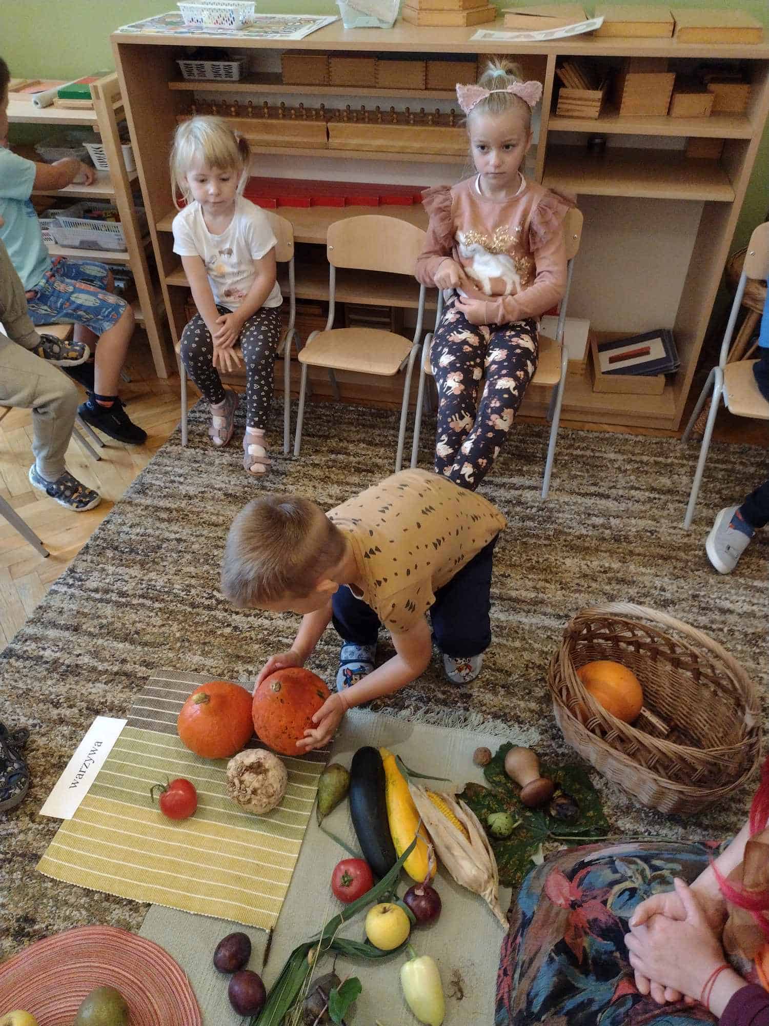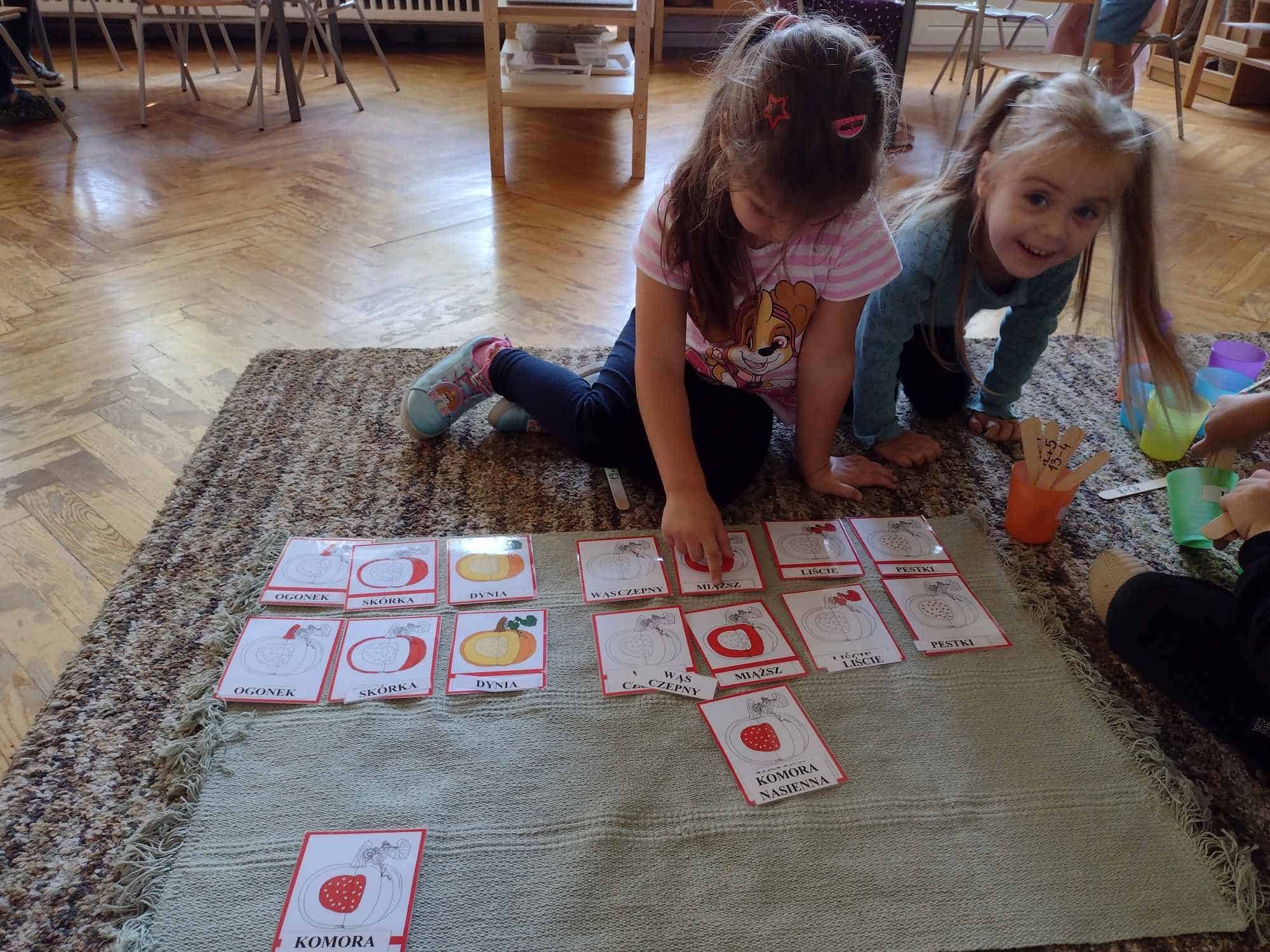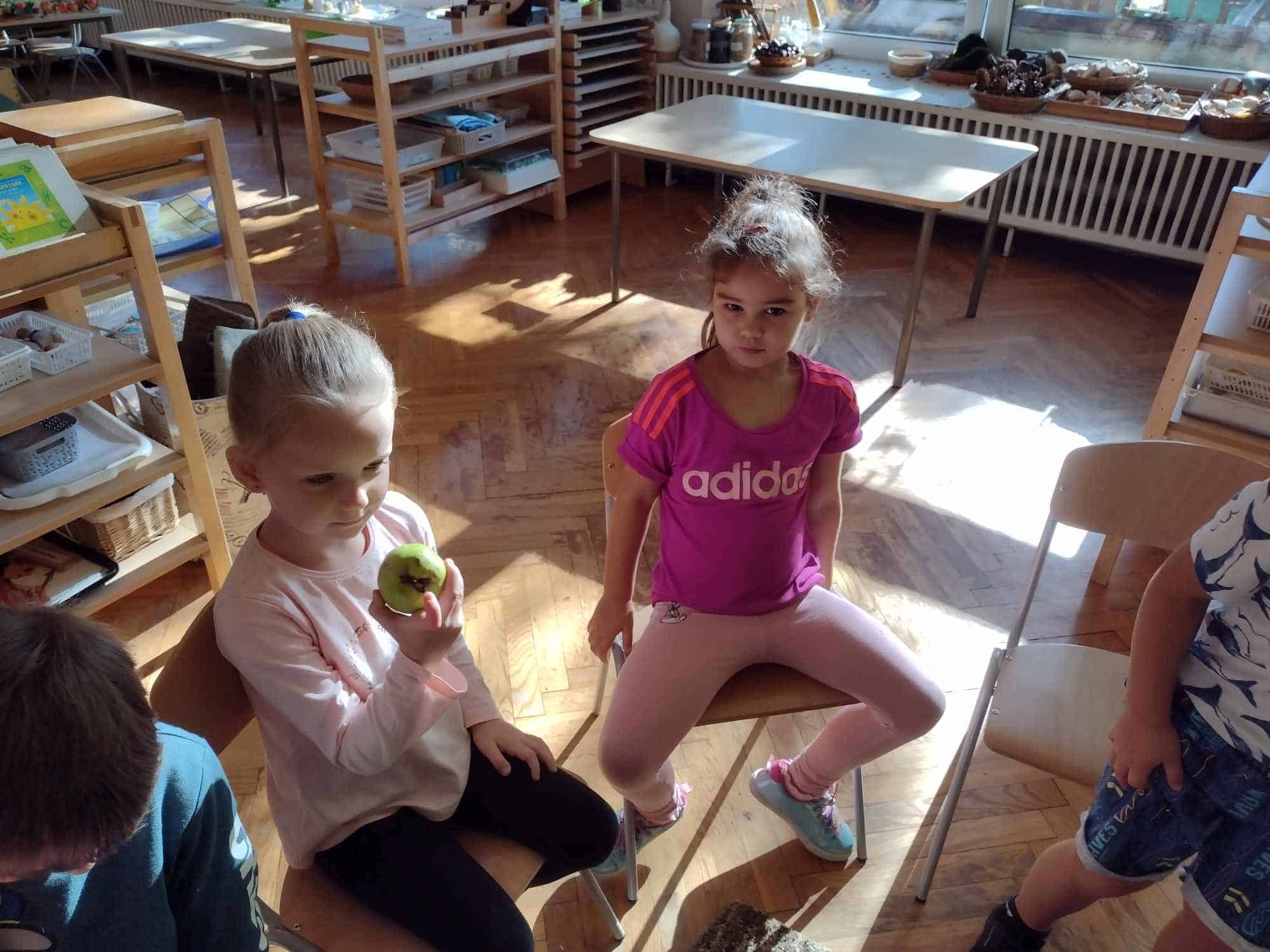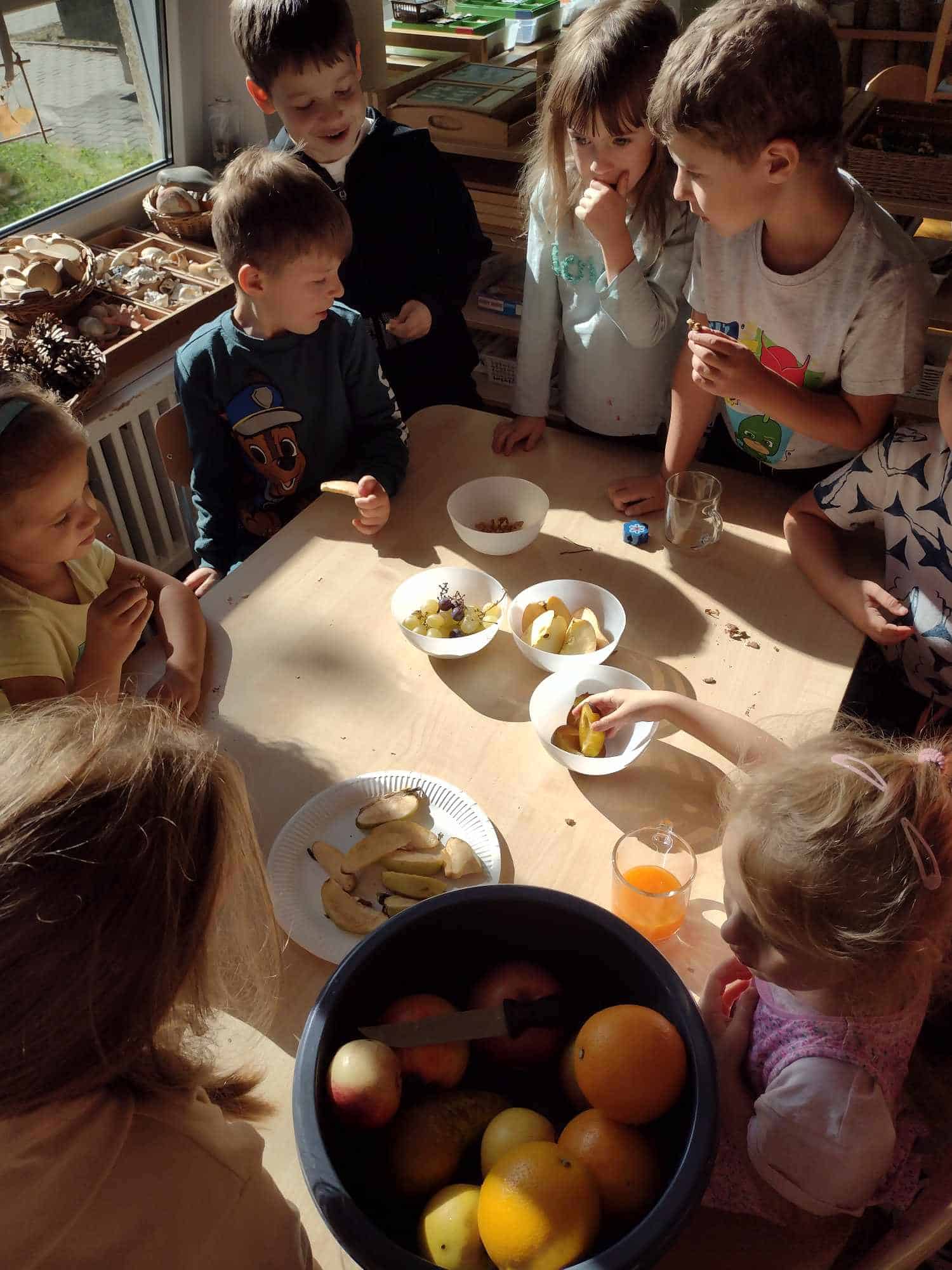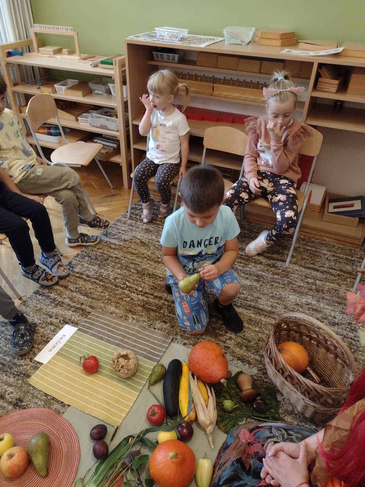 W ostatnim tygodniu dzieci z grupy zielonej przywitały Jesień, która zawitała także do ich sali. Na początku tygodnia przypomnieliśmy sobie nazwy pór roku i dopasowaliśmy nazwy do ilustracji. Później dzieci zaprosiły Jesień do sali – przyszła z pełnym koszem owoców i warzyw, a w torebce przyniosła jesienną pogodę i jesienne zagadki. Dzieci oglądały dary jesieni z grządek, ogrodów i sadów, nazywały je, a także rozdzieliły na zbiór owoców i warzyw. Starszaki dobierały podpisy do owoców i warzyw. Tworzyliśmy też zbiory w danym kolorze, a także zbiory figur geometrycznych i przeliczaliśmy elementy w zbiorach. Nauczyliśmy się piosenki o Jesieni z pełnym koszem, wspólnie zaśpiewaliśmy i zagraliśmy na instrumentach. Aby usprawnić motorykę małą i przygotować rękę do pisania, dzieci pracowały z metalowymi matrycami, odrysowując kształty owoców (jabłka gruszki i śliwki), które następnie wypełniały suchymi pastelami. Poznaliśmy też budowę dyni przy pomocy kart trójdzielnych, a następnie użyliśmy prawdziwej dyni – dzieci wskazywały poszczególne elementy, wyłuskiwały i przeliczały pestki. Graliśmy też w dyniowe kręgle. Był też czas na owocowe wyszywanki, pracę z szorstkim, ruchomym i żłobionym alfabetem. Rozmawialiśmy o przygotowaniu jedzenia do spożycia, myliśmy owoce, oglądaliśmy i porównywaliśmy wnętrze owoców i warzyw. Mówiliśmy o witaminach, które zawarte są w owocach i warzywach, sprawdzaliśmy jakie kolory pozostawiają warzywne stemple. Chłopcy intensywnie zajęli się łuskaniem fasoli i orzechów, a na koniec mogliśmy spróbować jak smakują przyniesione przez dzieci dary Jesieni.