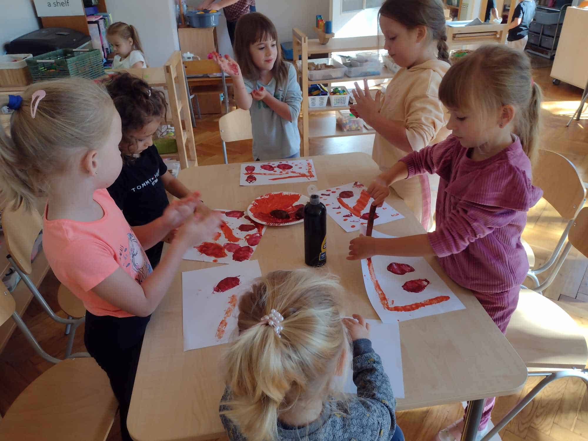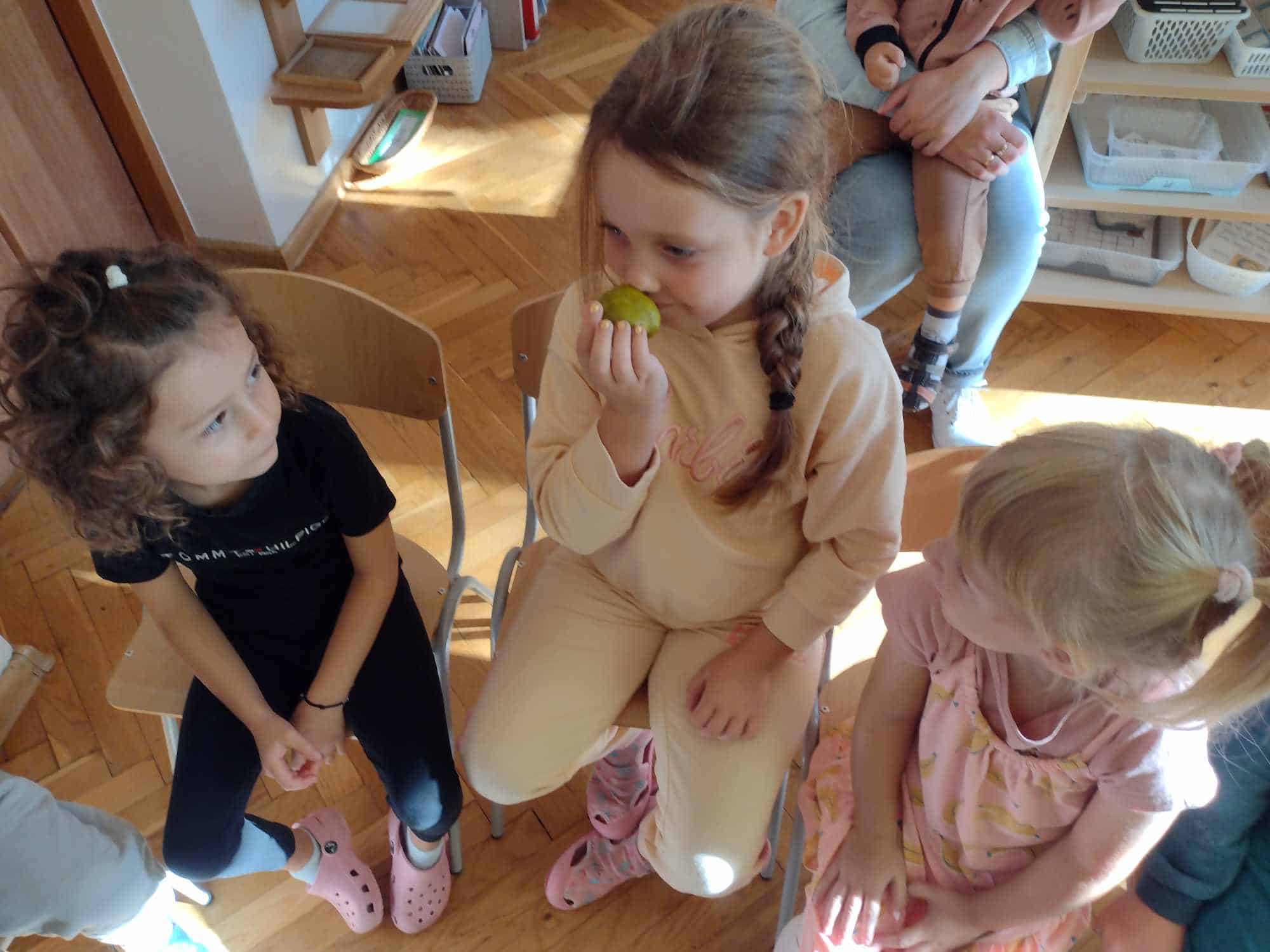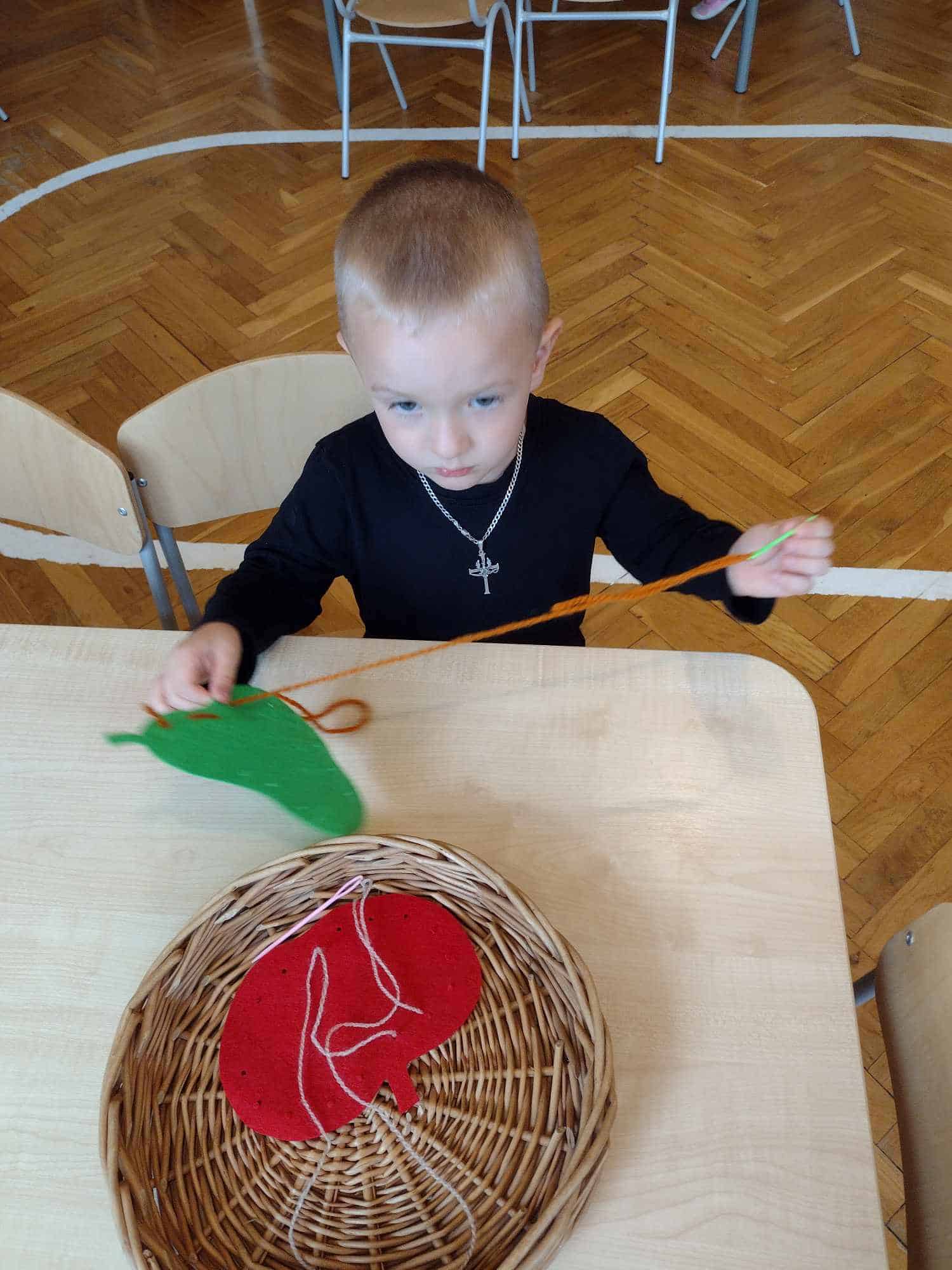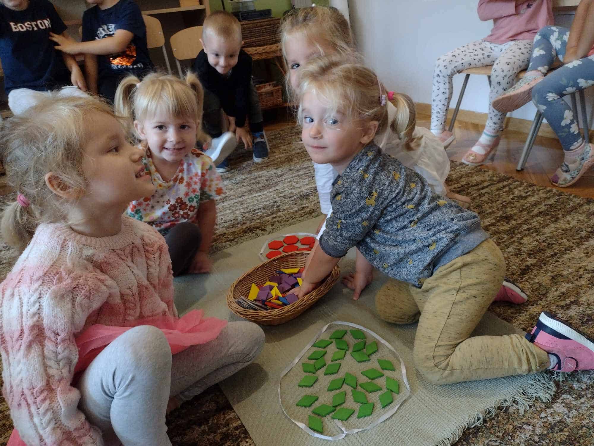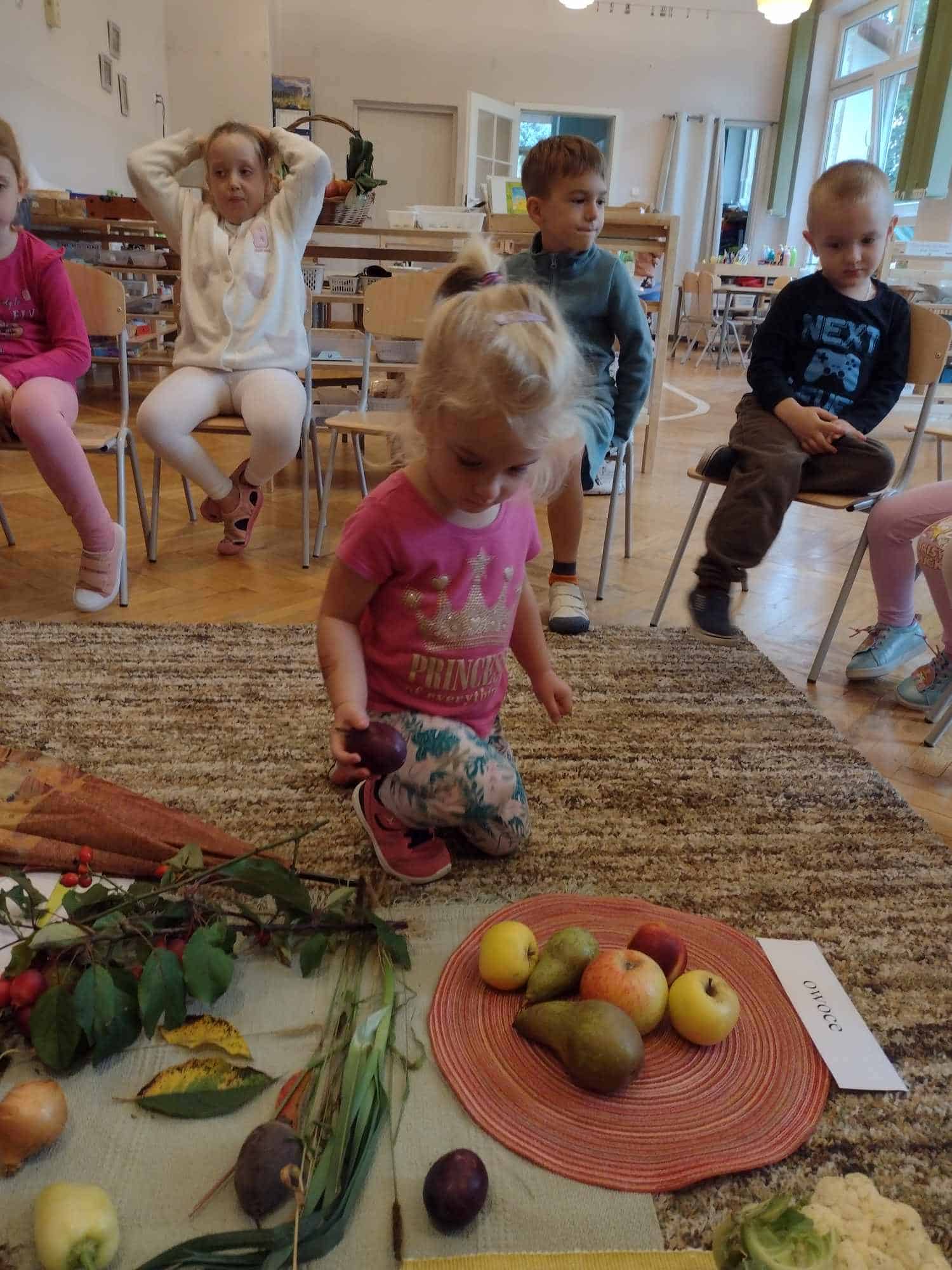 W ostatnim tygodniu dzieci z grupy zielonej przywitały Jesień, która zawitała także do ich sali. Na początku tygodnia przypomnieliśmy sobie nazwy pór roku i dopasowaliśmy nazwy do ilustracji. Później dzieci zaprosiły Jesień do sali – przyszła z pełnym koszem owoców i warzyw, a w torebce przyniosła jesienną pogodę i jesienne zagadki. Dzieci oglądały dary jesieni z grządek, ogrodów i sadów, nazywały je, a także rozdzieliły na zbiór owoców i warzyw. Starszaki dobierały podpisy do owoców i warzyw. Tworzyliśmy też zbiory w danym kolorze, a także zbiory figur geometrycznych i przeliczaliśmy elementy w zbiorach. Nauczyliśmy się piosenki o Jesieni z pełnym koszem, wspólnie zaśpiewaliśmy i zagraliśmy na instrumentach. Aby usprawnić motorykę małą i przygotować rękę do pisania, dzieci pracowały z metalowymi matrycami, odrysowując kształty owoców (jabłka gruszki i śliwki), które następnie wypełniały suchymi pastelami. Poznaliśmy też budowę dyni przy pomocy kart trójdzielnych, a następnie użyliśmy prawdziwej dyni – dzieci wskazywały poszczególne elementy, wyłuskiwały i przeliczały pestki. Graliśmy też w dyniowe kręgle. Był też czas na owocowe wyszywanki, pracę z szorstkim, ruchomym i żłobionym alfabetem. Rozmawialiśmy o przygotowaniu jedzenia do spożycia, myliśmy owoce, oglądaliśmy i porównywaliśmy wnętrze owoców i warzyw. Mówiliśmy o witaminach, które zawarte są w owocach i warzywach, sprawdzaliśmy jakie kolory pozostawiają warzywne stemple. Chłopcy intensywnie zajęli się łuskaniem fasoli i orzechów, a na koniec mogliśmy spróbować jak smakują przyniesione przez dzieci dary Jesieni.