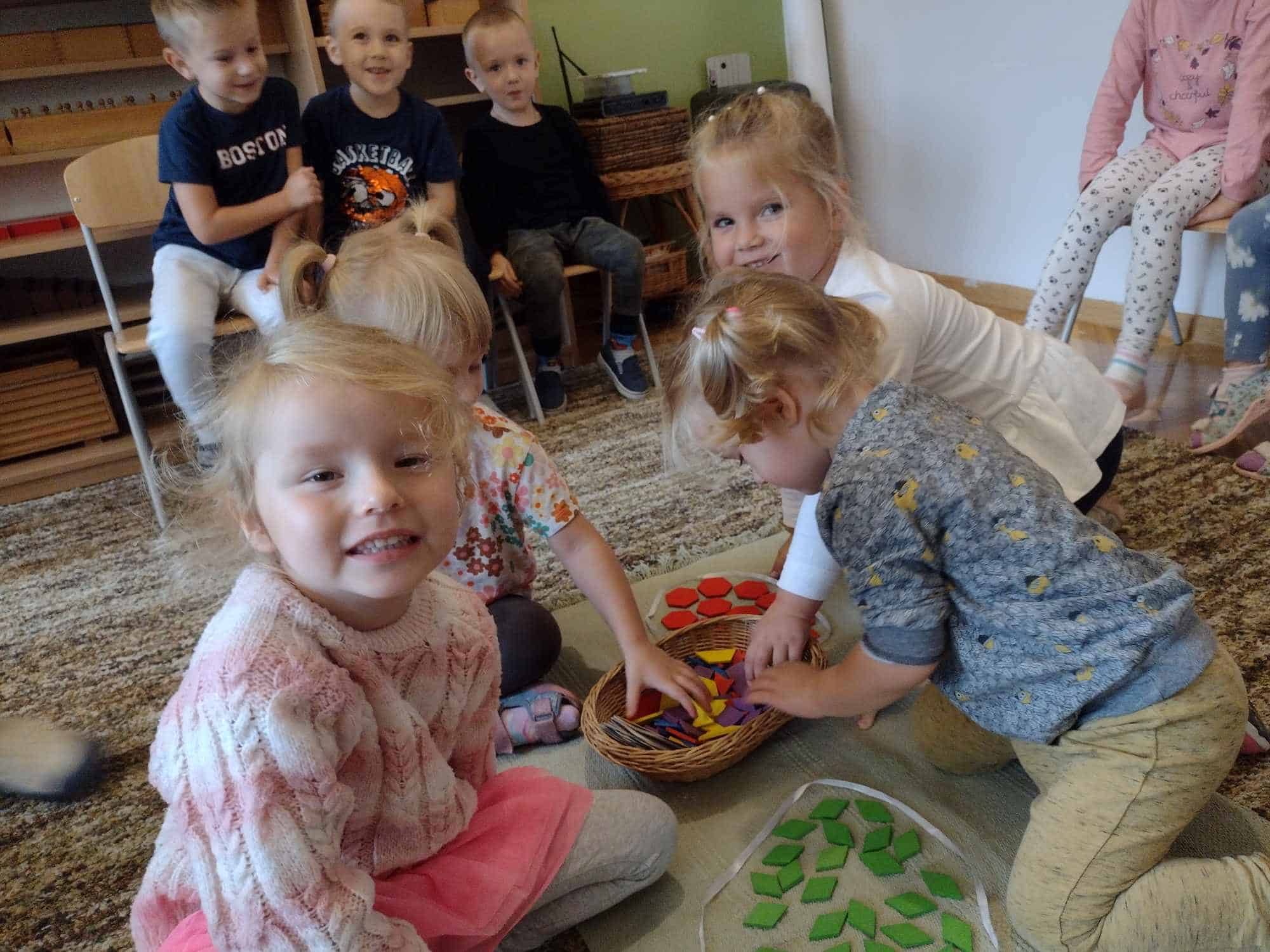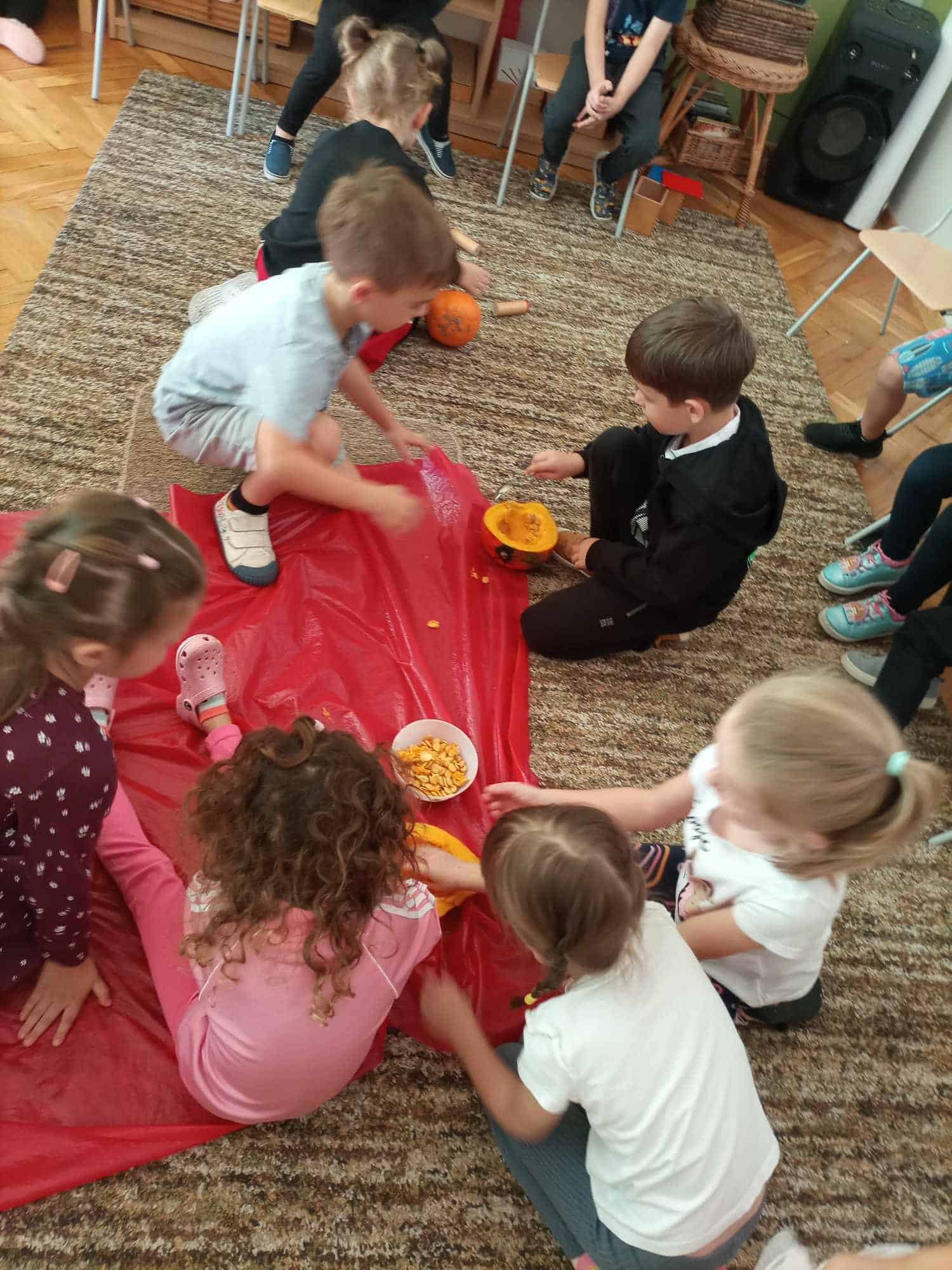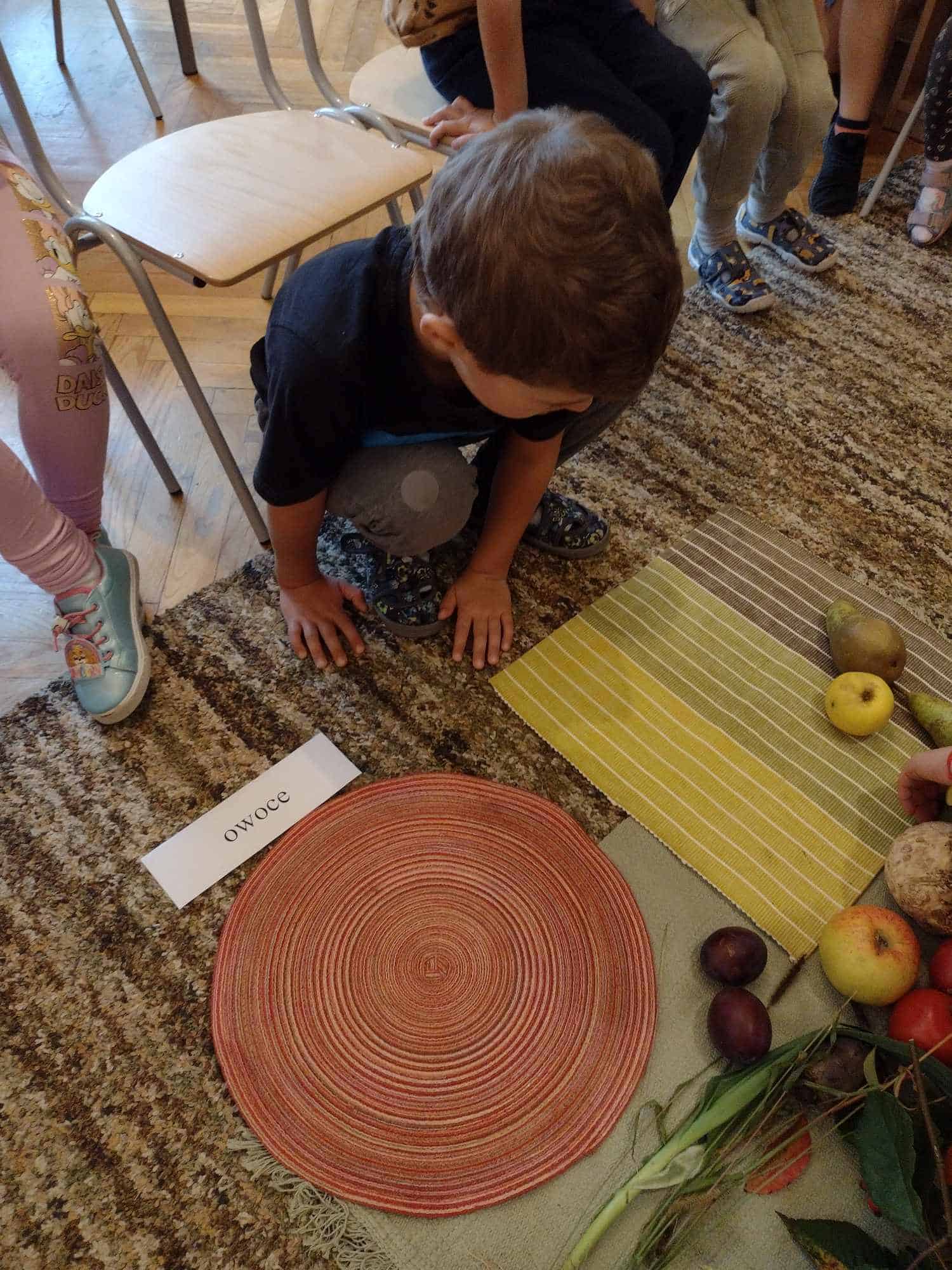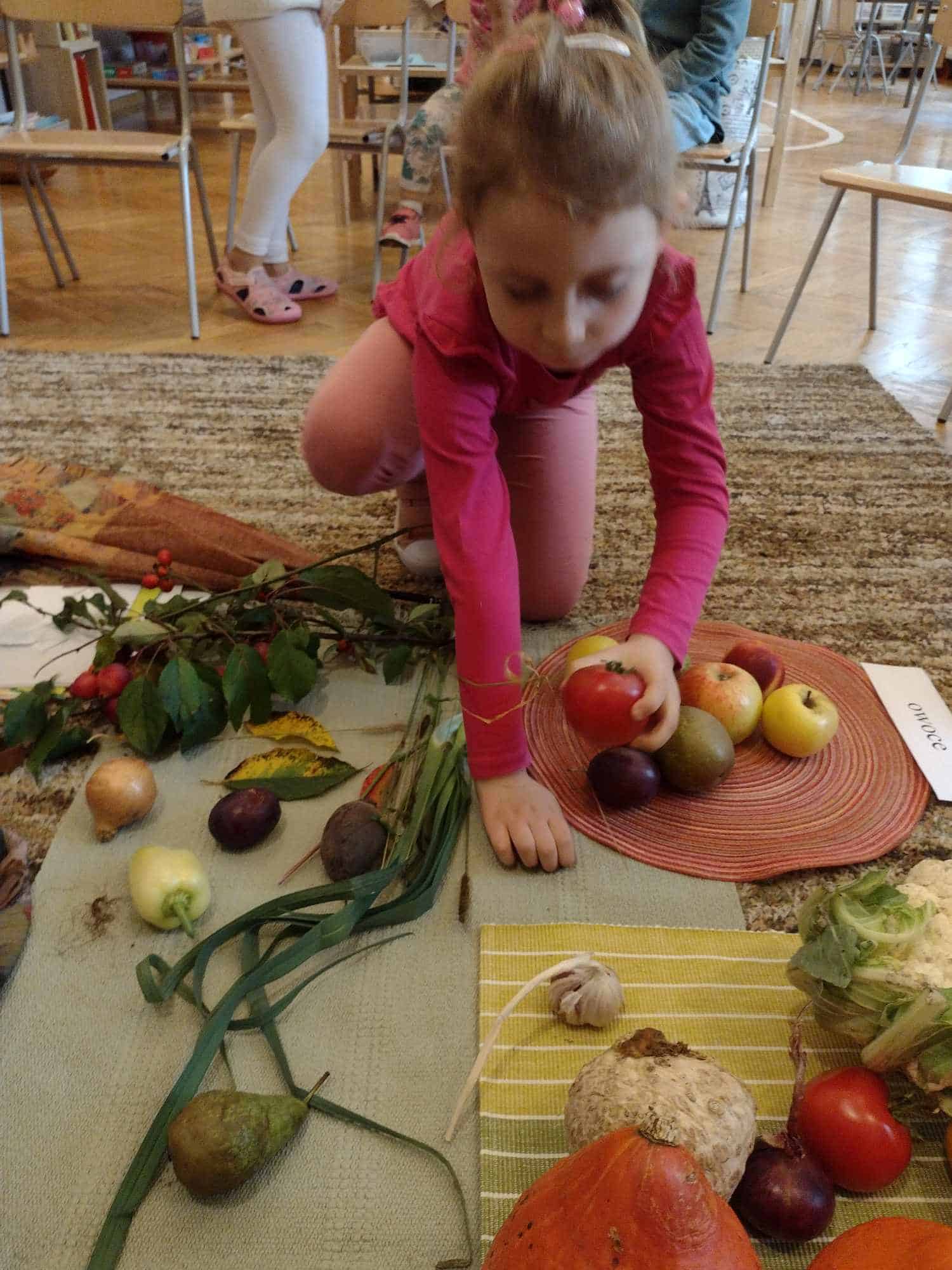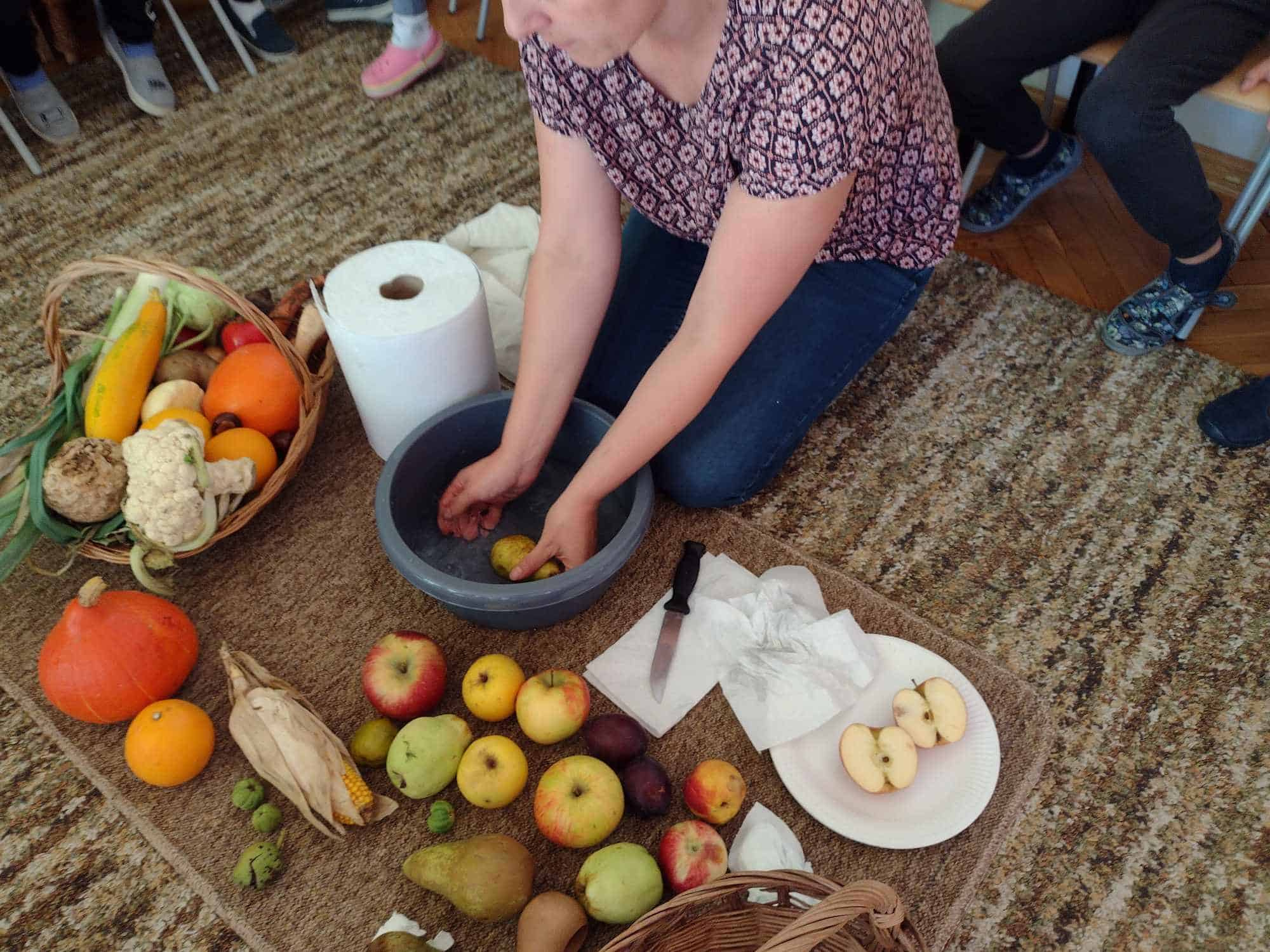W ostatnim tygodniu dzieci z grupy zielonej przywitały Jesień, która zawitała także do ich sali. Na początku tygodnia przypomnieliśmy sobie nazwy pór roku i dopasowaliśmy nazwy do ilustracji. Później dzieci zaprosiły Jesień do sali – przyszła z pełnym koszem owoców i warzyw, a w torebce przyniosła jesienną pogodę i jesienne zagadki. Dzieci oglądały dary jesieni z grządek, ogrodów i sadów, nazywały je, a także rozdzieliły na zbiór owoców i warzyw. Starszaki dobierały podpisy do owoców i warzyw. Tworzyliśmy też zbiory w danym kolorze, a także zbiory figur geometrycznych i przeliczaliśmy elementy w zbiorach. Nauczyliśmy się piosenki o Jesieni z pełnym koszem, wspólnie zaśpiewaliśmy i zagraliśmy na instrumentach. Aby usprawnić motorykę małą i przygotować rękę do pisania, dzieci pracowały z metalowymi matrycami, odrysowując kształty owoców (jabłka gruszki i śliwki), które następnie wypełniały suchymi pastelami. Poznaliśmy też budowę dyni przy pomocy kart trójdzielnych, a następnie użyliśmy prawdziwej dyni – dzieci wskazywały poszczególne elementy, wyłuskiwały i przeliczały pestki. Graliśmy też w dyniowe kręgle. Był też czas na owocowe wyszywanki, pracę z szorstkim, ruchomym i żłobionym alfabetem. Rozmawialiśmy o przygotowaniu jedzenia do spożycia, myliśmy owoce, oglądaliśmy i porównywaliśmy wnętrze owoców i warzyw. Mówiliśmy o witaminach, które zawarte są w owocach i warzywach, sprawdzaliśmy jakie kolory pozostawiają warzywne stemple. Chłopcy intensywnie zajęli się łuskaniem fasoli i orzechów, a na koniec mogliśmy spróbować jak smakują przyniesione przez dzieci dary Jesieni.