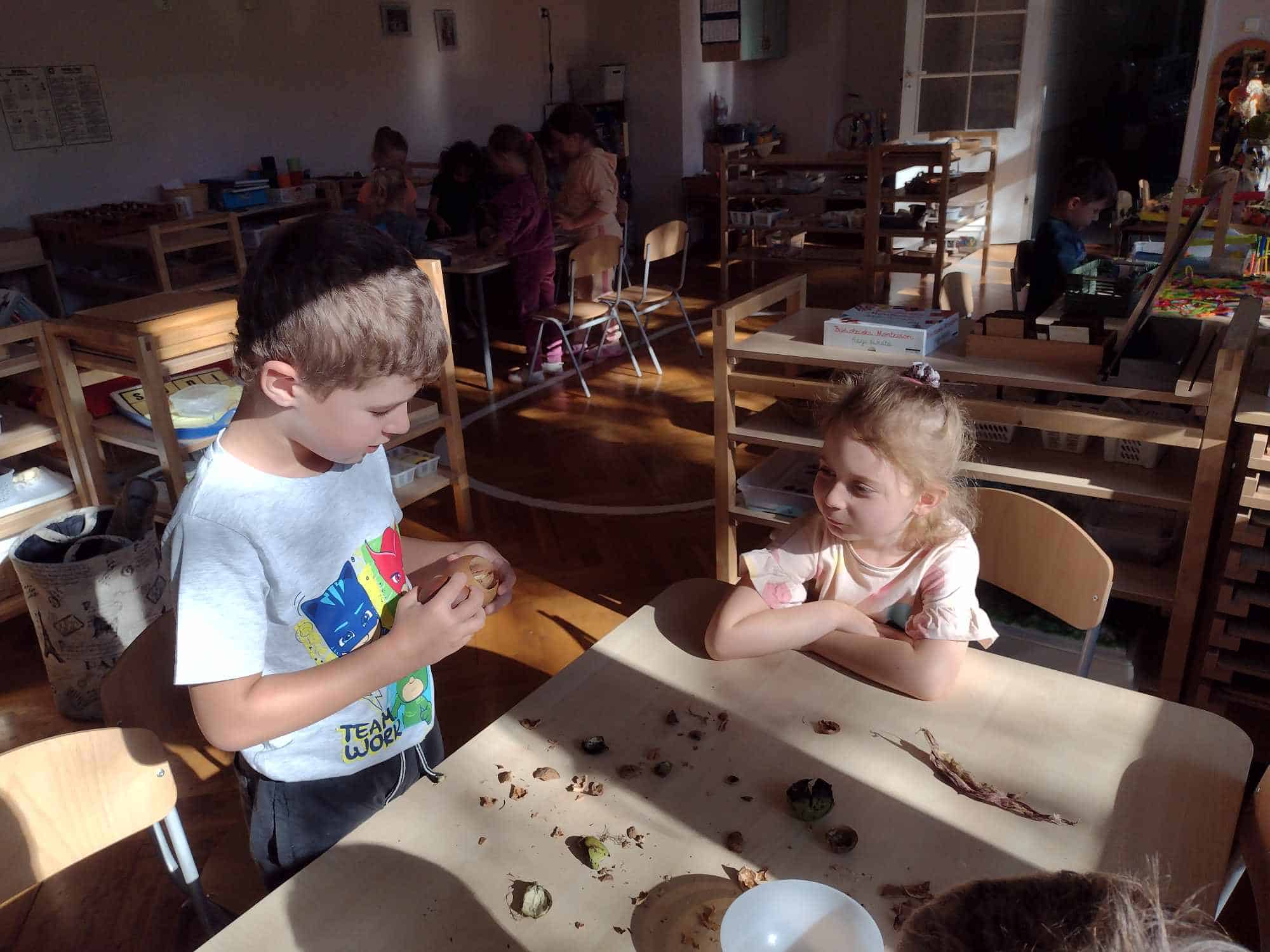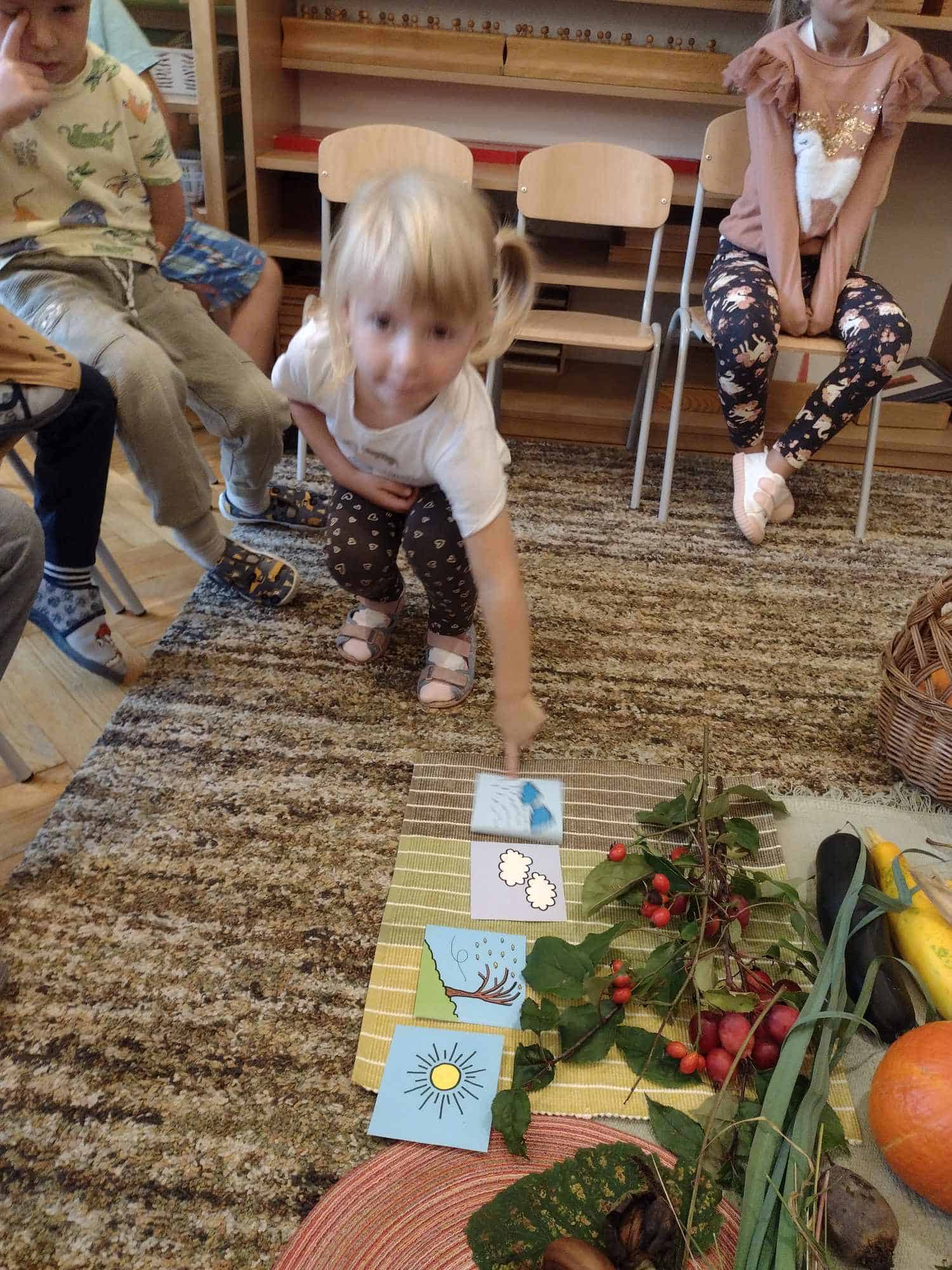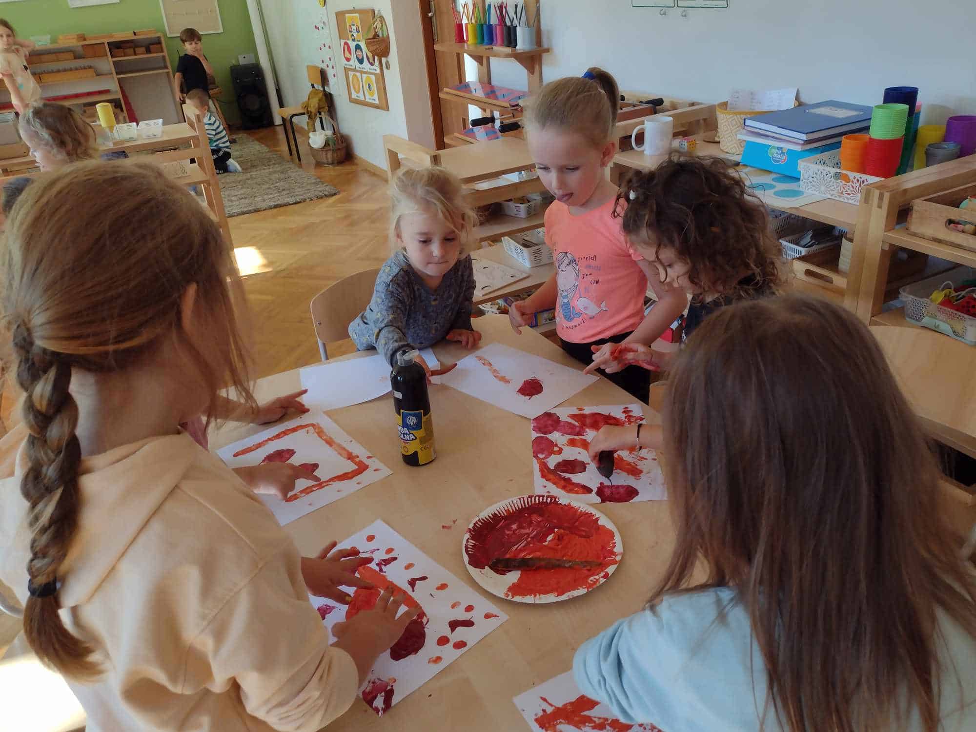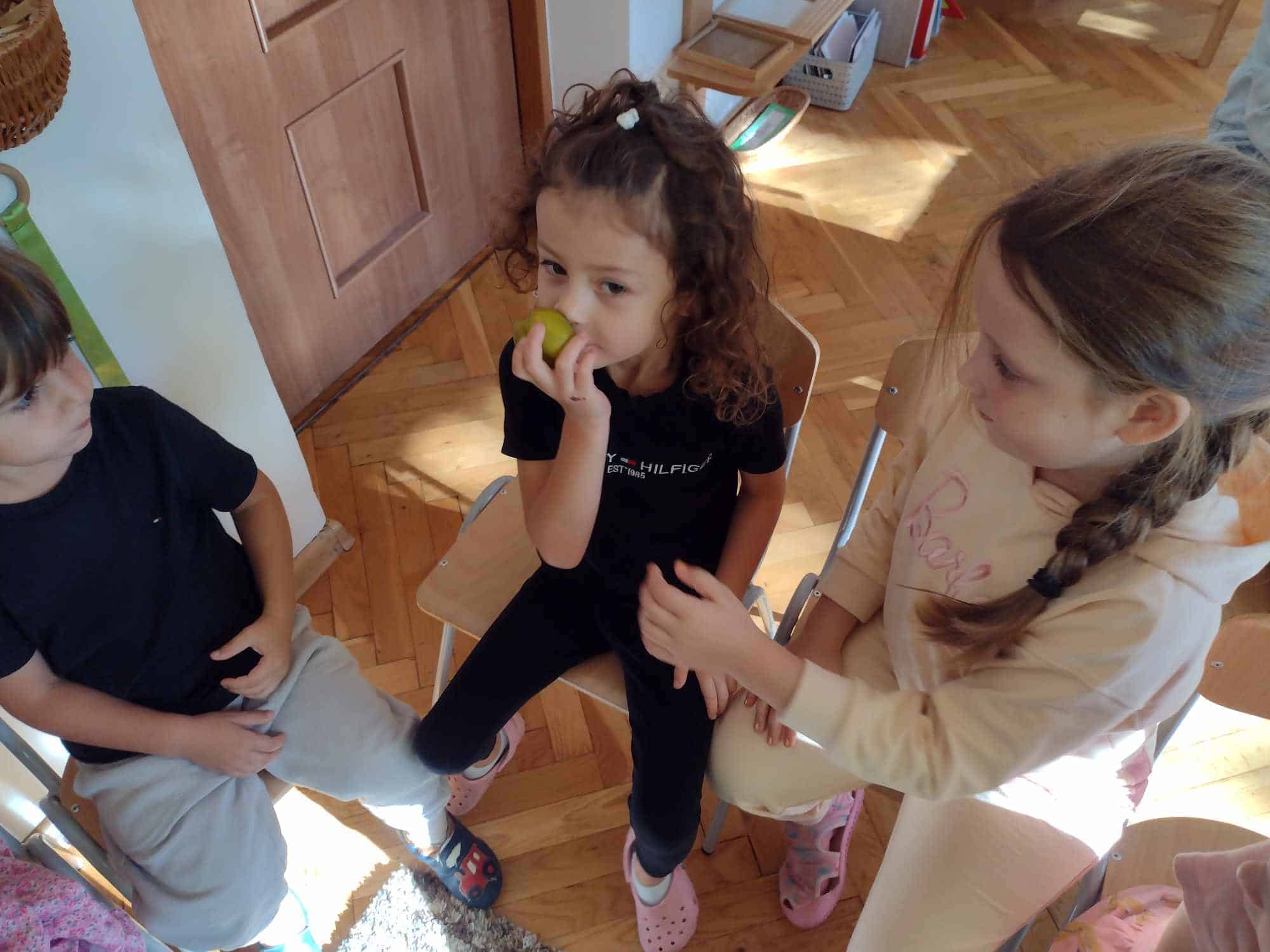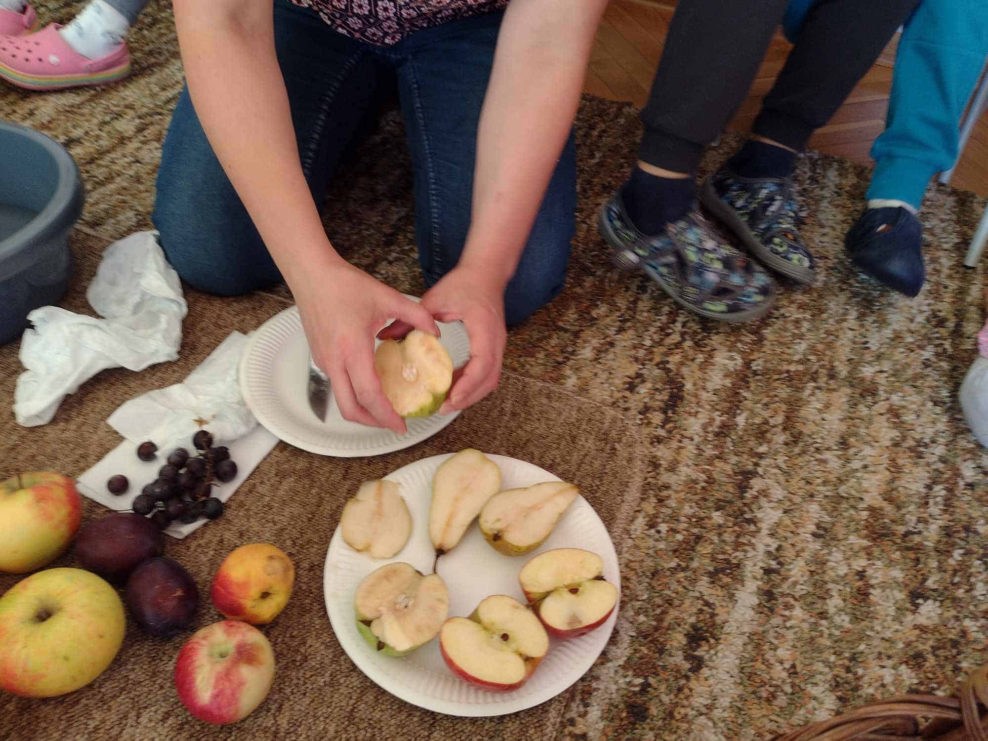 W ostatnim tygodniu dzieci z grupy zielonej przywitały Jesień, która zawitała także do ich sali. Na początku tygodnia przypomnieliśmy sobie nazwy pór roku i dopasowaliśmy nazwy do ilustracji. Później dzieci zaprosiły Jesień do sali – przyszła z pełnym koszem owoców i warzyw, a w torebce przyniosła jesienną pogodę i jesienne zagadki. Dzieci oglądały dary jesieni z grządek, ogrodów i sadów, nazywały je, a także rozdzieliły na zbiór owoców i warzyw. Starszaki dobierały podpisy do owoców i warzyw. Tworzyliśmy też zbiory w danym kolorze, a także zbiory figur geometrycznych i przeliczaliśmy elementy w zbiorach. Nauczyliśmy się piosenki o Jesieni z pełnym koszem, wspólnie zaśpiewaliśmy i zagraliśmy na instrumentach. Aby usprawnić motorykę małą i przygotować rękę do pisania, dzieci pracowały z metalowymi matrycami, odrysowując kształty owoców (jabłka gruszki i śliwki), które następnie wypełniały suchymi pastelami. Poznaliśmy też budowę dyni przy pomocy kart trójdzielnych, a następnie użyliśmy prawdziwej dyni – dzieci wskazywały poszczególne elementy, wyłuskiwały i przeliczały pestki. Graliśmy też w dyniowe kręgle. Był też czas na owocowe wyszywanki, pracę z szorstkim, ruchomym i żłobionym alfabetem. Rozmawialiśmy o przygotowaniu jedzenia do spożycia, myliśmy owoce, oglądaliśmy i porównywaliśmy wnętrze owoców i warzyw. Mówiliśmy o witaminach, które zawarte są w owocach i warzywach, sprawdzaliśmy jakie kolory pozostawiają warzywne stemple. Chłopcy intensywnie zajęli się łuskaniem fasoli i orzechów, a na koniec mogliśmy spróbować jak smakują przyniesione przez dzieci dary Jesieni.