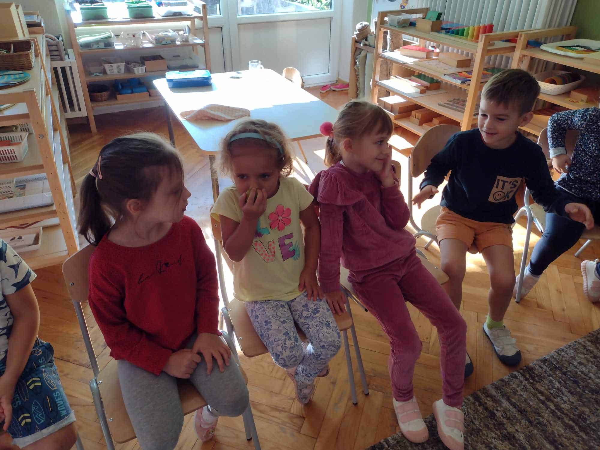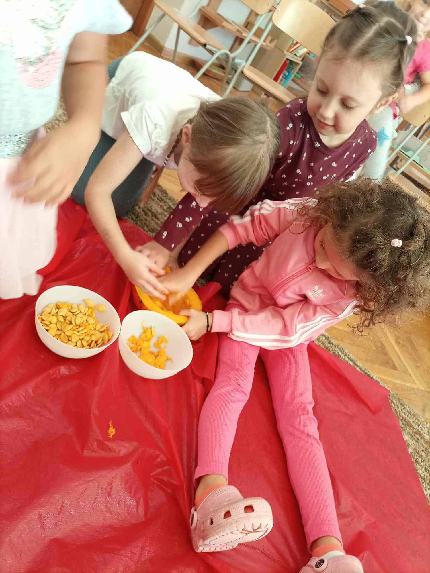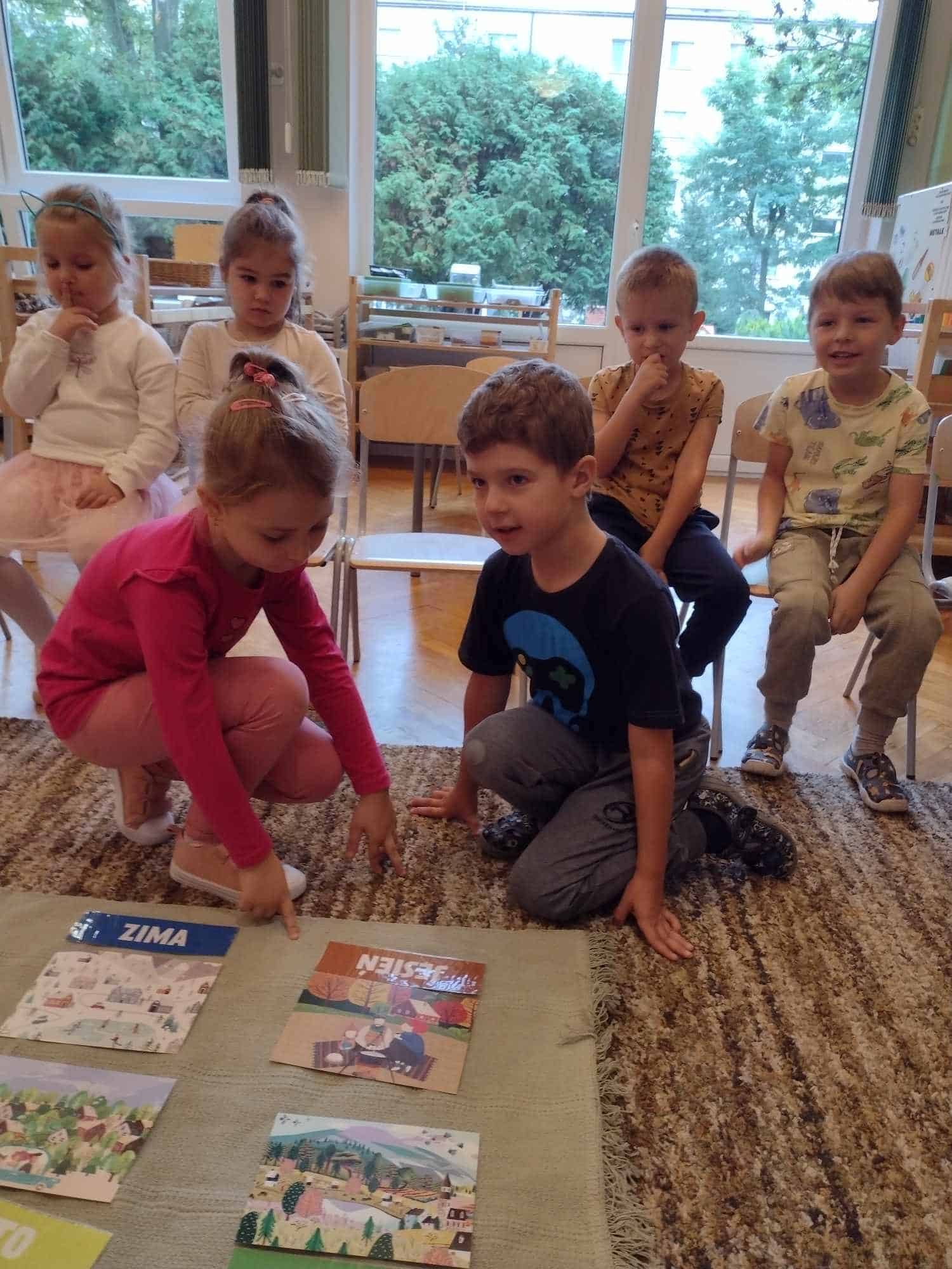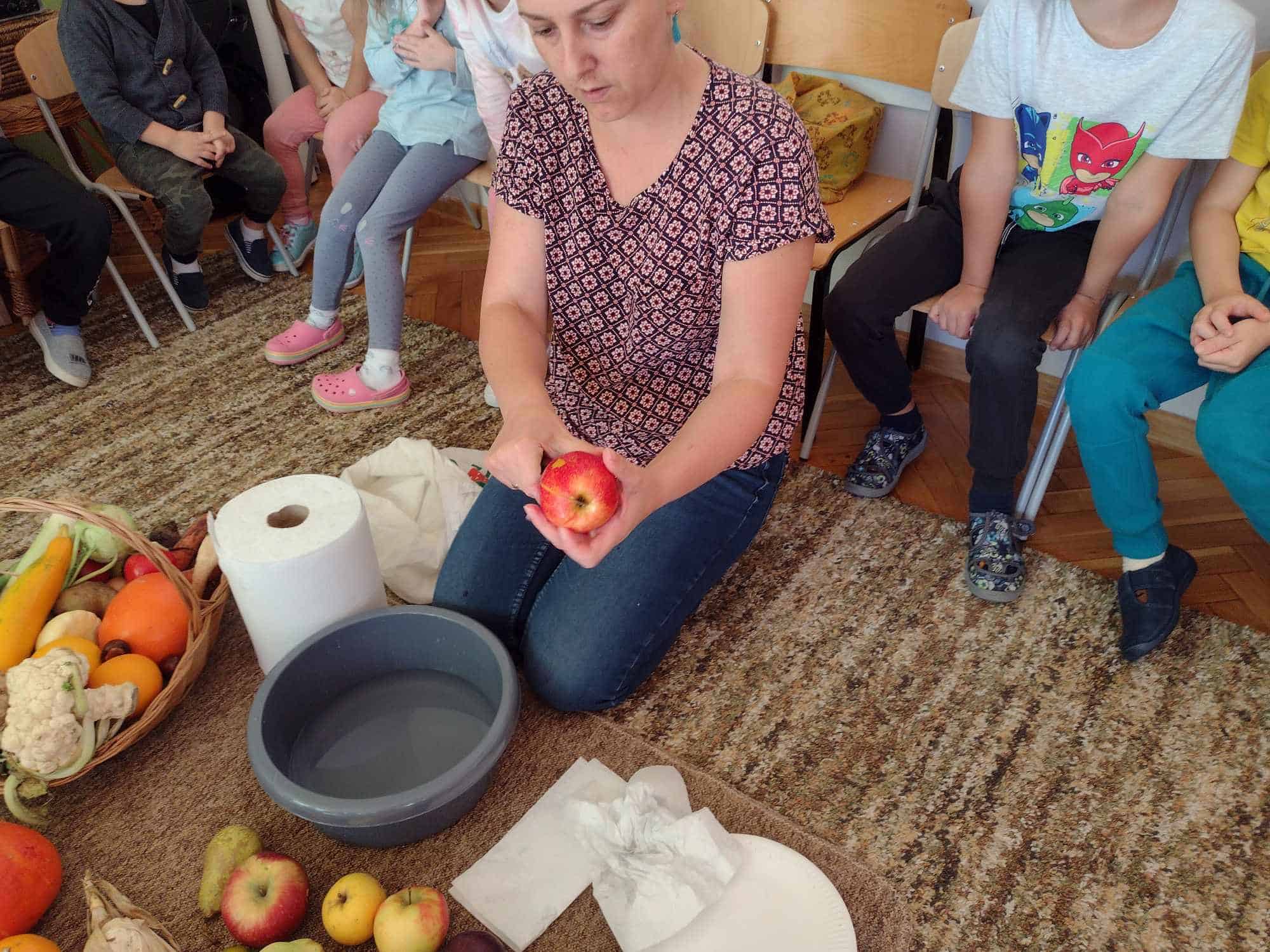 W ostatnim tygodniu dzieci z grupy zielonej przywitały Jesień, która zawitała także do ich sali. Na początku tygodnia przypomnieliśmy sobie nazwy pór roku i dopasowaliśmy nazwy do ilustracji. Później dzieci zaprosiły Jesień do sali – przyszła z pełnym koszem owoców i warzyw, a w torebce przyniosła jesienną pogodę i jesienne zagadki. Dzieci oglądały dary jesieni z grządek, ogrodów i sadów, nazywały je, a także rozdzieliły na zbiór owoców i warzyw. Starszaki dobierały podpisy do owoców i warzyw. Tworzyliśmy też zbiory w danym kolorze, a także zbiory figur geometrycznych i przeliczaliśmy elementy w zbiorach. Nauczyliśmy się piosenki o Jesieni z pełnym koszem, wspólnie zaśpiewaliśmy i zagraliśmy na instrumentach. Aby usprawnić motorykę małą i przygotować rękę do pisania, dzieci pracowały z metalowymi matrycami, odrysowując kształty owoców (jabłka gruszki i śliwki), które następnie wypełniały suchymi pastelami. Poznaliśmy też budowę dyni przy pomocy kart trójdzielnych, a następnie użyliśmy prawdziwej dyni – dzieci wskazywały poszczególne elementy, wyłuskiwały i przeliczały pestki. Graliśmy też w dyniowe kręgle. Był też czas na owocowe wyszywanki, pracę z szorstkim, ruchomym i żłobionym alfabetem. Rozmawialiśmy o przygotowaniu jedzenia do spożycia, myliśmy owoce, oglądaliśmy i porównywaliśmy wnętrze owoców i warzyw. Mówiliśmy o witaminach, które zawarte są w owocach i warzywach, sprawdzaliśmy jakie kolory pozostawiają warzywne stemple. Chłopcy intensywnie zajęli się łuskaniem fasoli i orzechów, a na koniec mogliśmy spróbować jak smakują przyniesione przez dzieci dary Jesieni.
