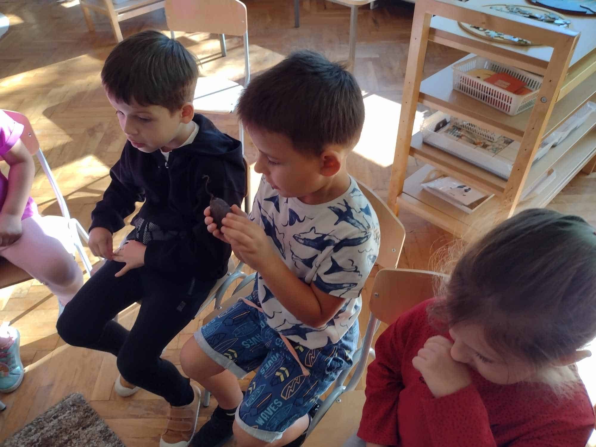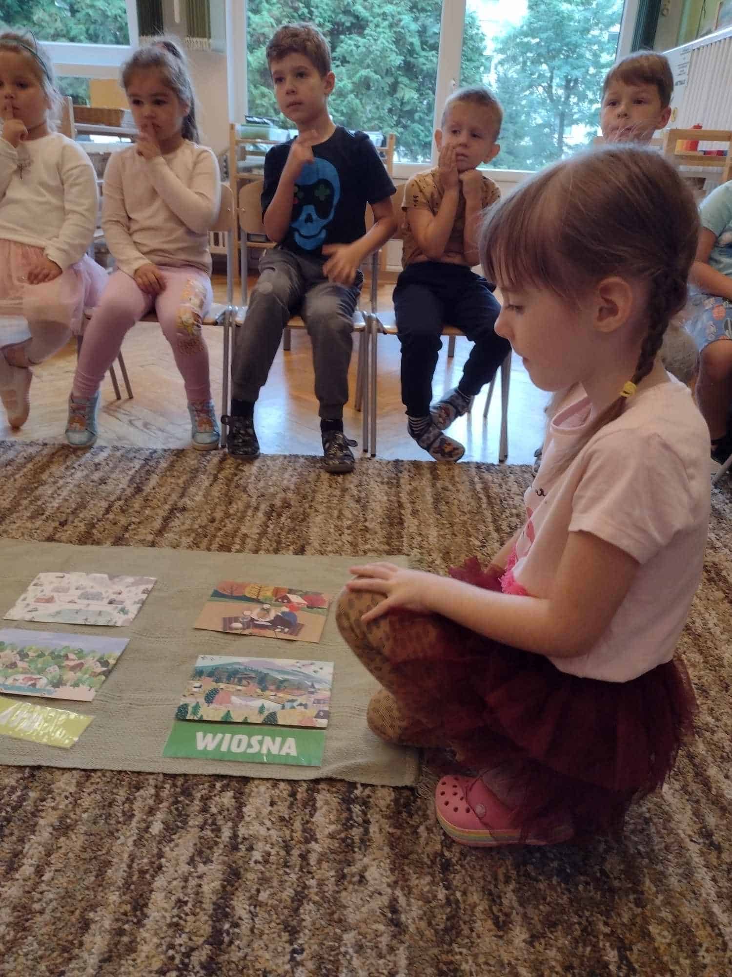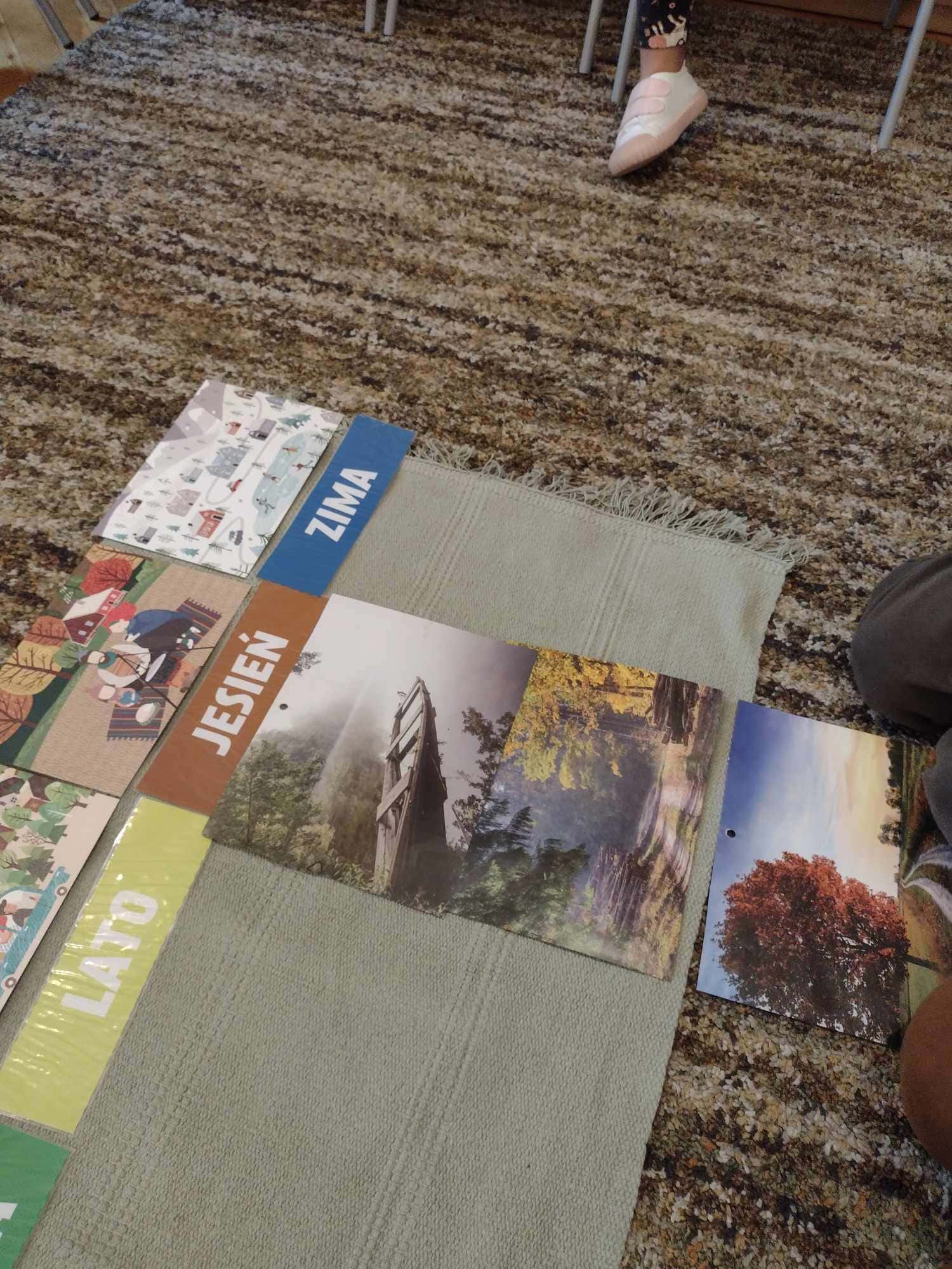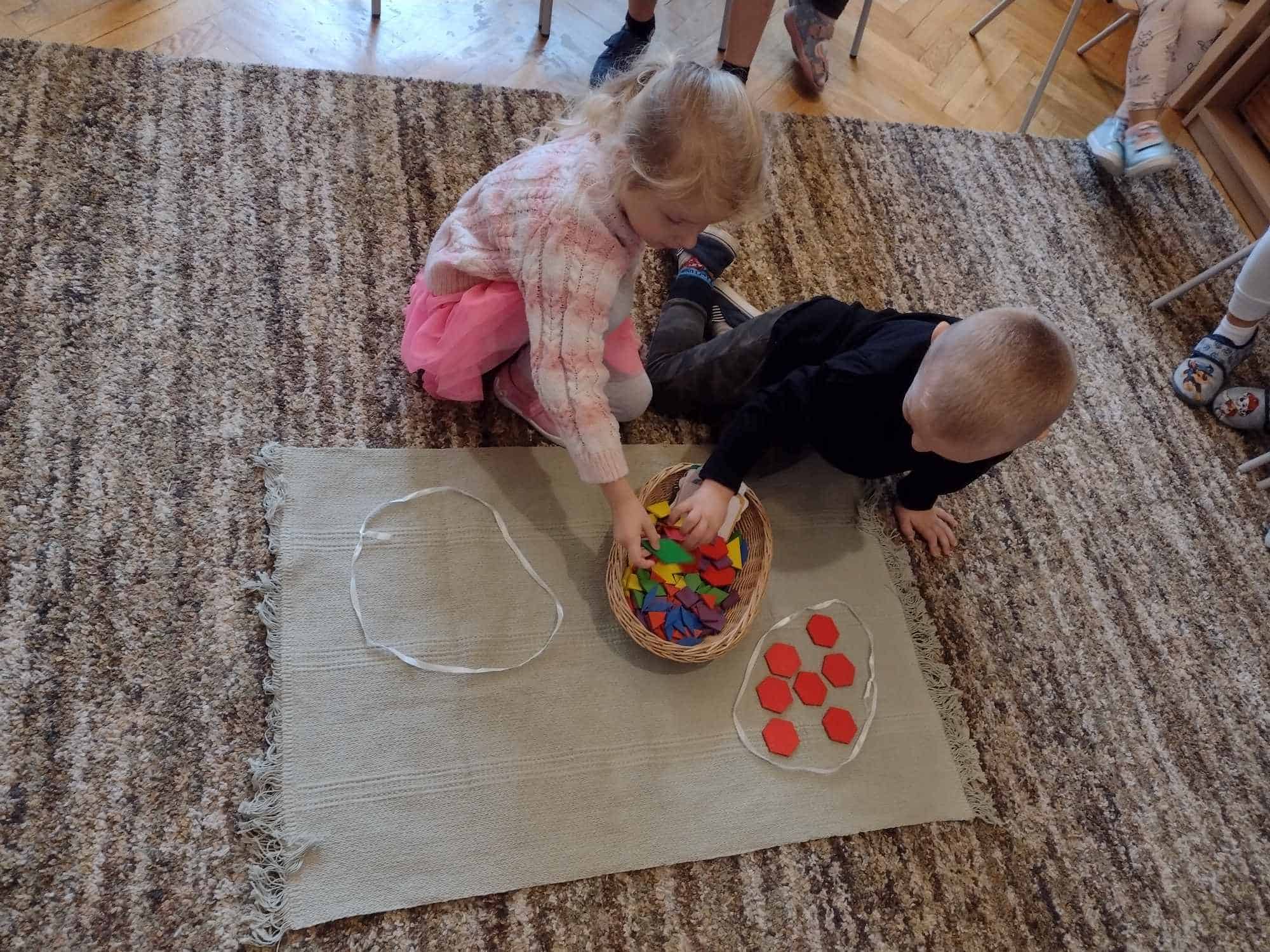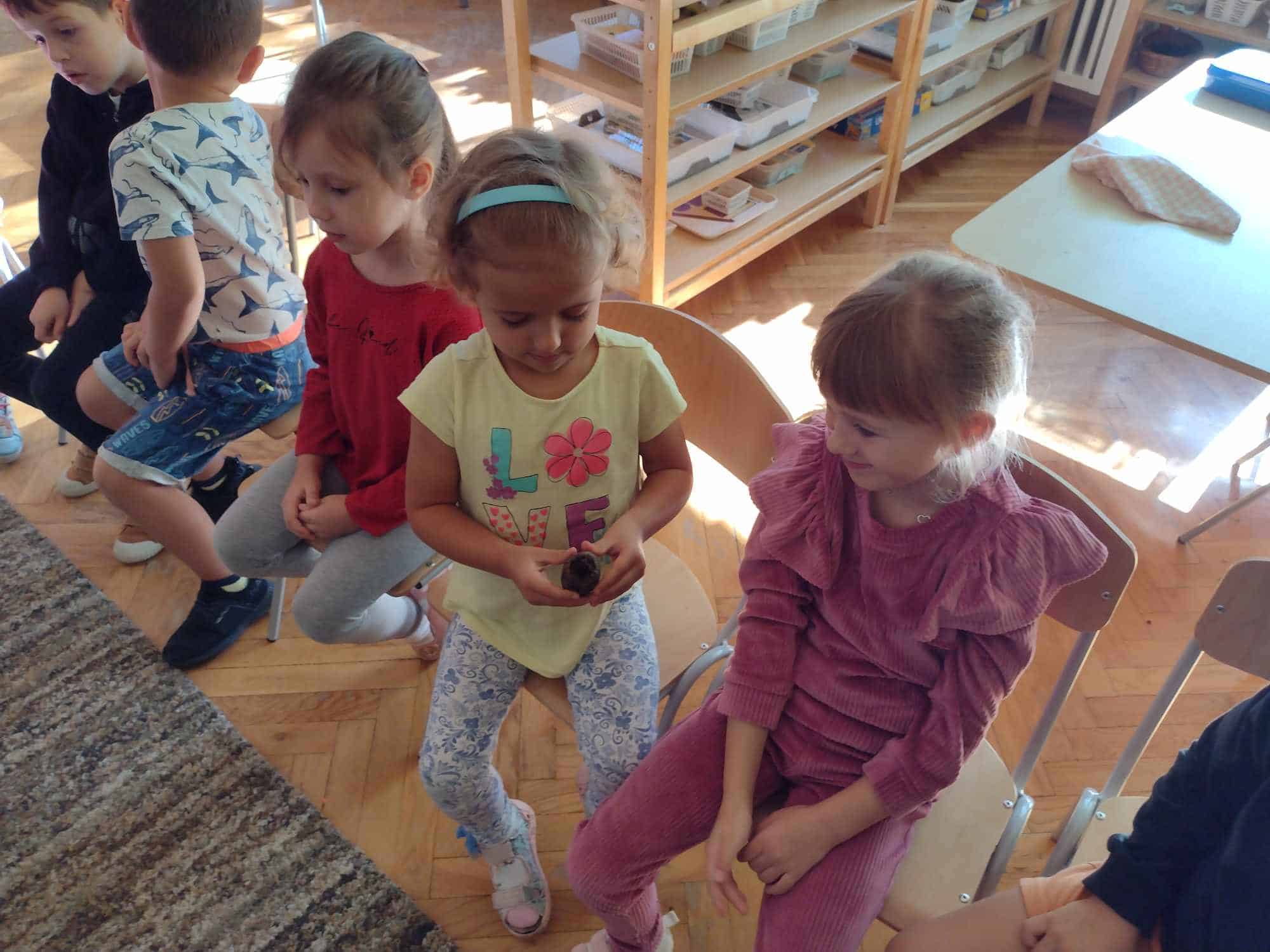 W ostatnim tygodniu dzieci z grupy zielonej przywitały Jesień, która zawitała także do ich sali. Na początku tygodnia przypomnieliśmy sobie nazwy pór roku i dopasowaliśmy nazwy do ilustracji. Później dzieci zaprosiły Jesień do sali – przyszła z pełnym koszem owoców i warzyw, a w torebce przyniosła jesienną pogodę i jesienne zagadki. Dzieci oglądały dary jesieni z grządek, ogrodów i sadów, nazywały je, a także rozdzieliły na zbiór owoców i warzyw. Starszaki dobierały podpisy do owoców i warzyw. Tworzyliśmy też zbiory w danym kolorze, a także zbiory figur geometrycznych i przeliczaliśmy elementy w zbiorach. Nauczyliśmy się piosenki o Jesieni z pełnym koszem, wspólnie zaśpiewaliśmy i zagraliśmy na instrumentach. Aby usprawnić motorykę małą i przygotować rękę do pisania, dzieci pracowały z metalowymi matrycami, odrysowując kształty owoców (jabłka gruszki i śliwki), które następnie wypełniały suchymi pastelami. Poznaliśmy też budowę dyni przy pomocy kart trójdzielnych, a następnie użyliśmy prawdziwej dyni – dzieci wskazywały poszczególne elementy, wyłuskiwały i przeliczały pestki. Graliśmy też w dyniowe kręgle. Był też czas na owocowe wyszywanki, pracę z szorstkim, ruchomym i żłobionym alfabetem. Rozmawialiśmy o przygotowaniu jedzenia do spożycia, myliśmy owoce, oglądaliśmy i porównywaliśmy wnętrze owoców i warzyw. Mówiliśmy o witaminach, które zawarte są w owocach i warzywach, sprawdzaliśmy jakie kolory pozostawiają warzywne stemple. Chłopcy intensywnie zajęli się łuskaniem fasoli i orzechów, a na koniec mogliśmy spróbować jak smakują przyniesione przez dzieci dary Jesieni.