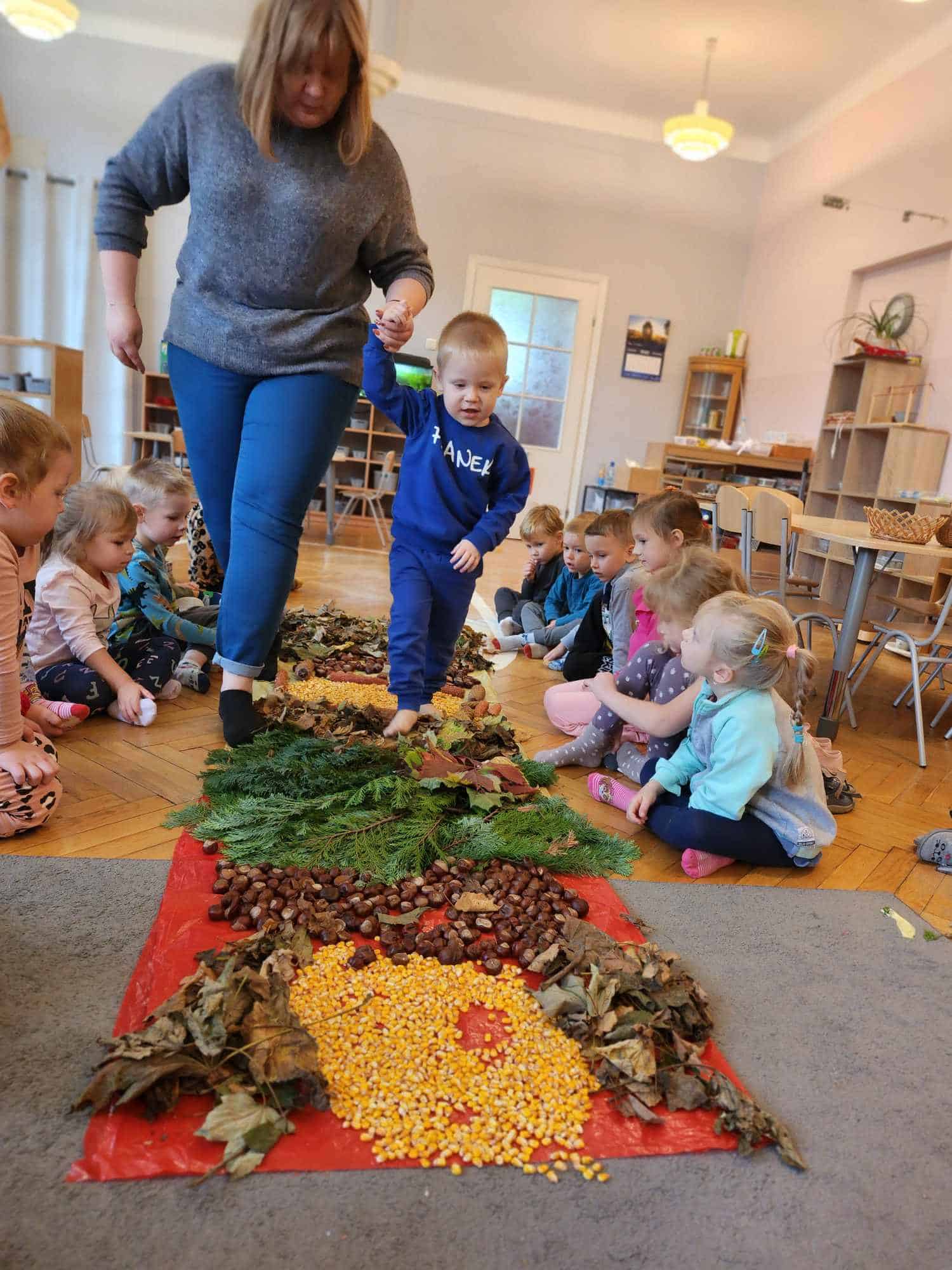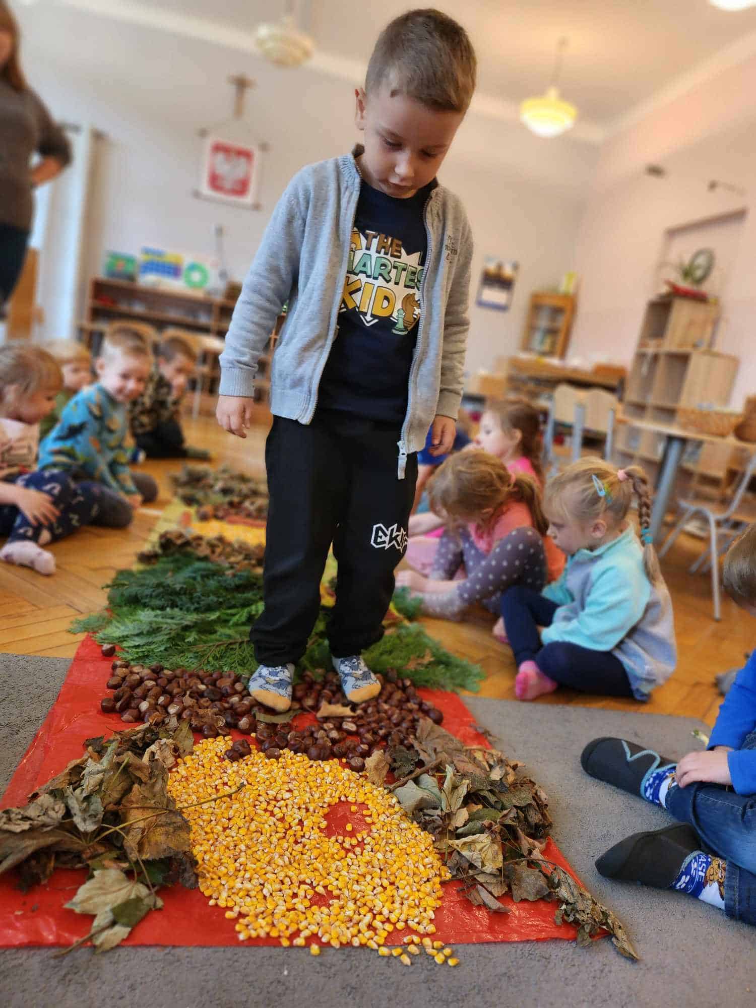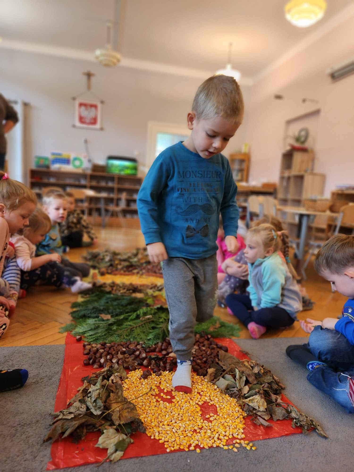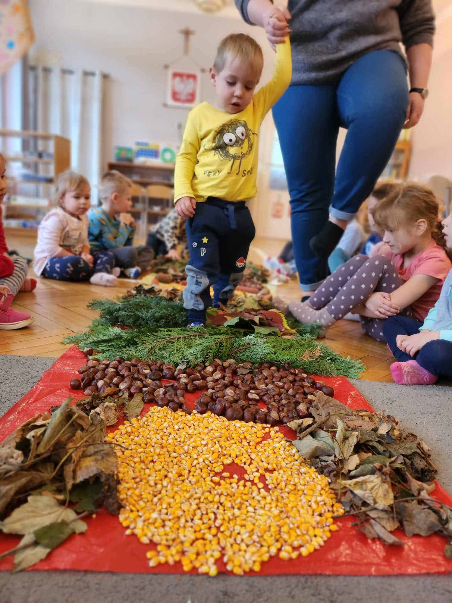Wykorzystaliśmy do stworzenia naszej jesiennej ścieżki liście, kasztany, szyszki, kolby i ziarna kukurydzy. Następnie wszyscy bardzo chętnie nawet kilkukrotnie przechodziliśmy po niej bez butów by poczuć pod stopami ich różnorodną strukturę. Spacer po niej sprawił naszym przedszkolakom mnóstwo radości.