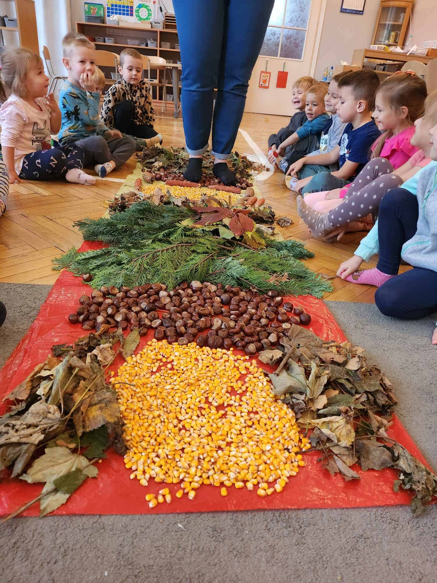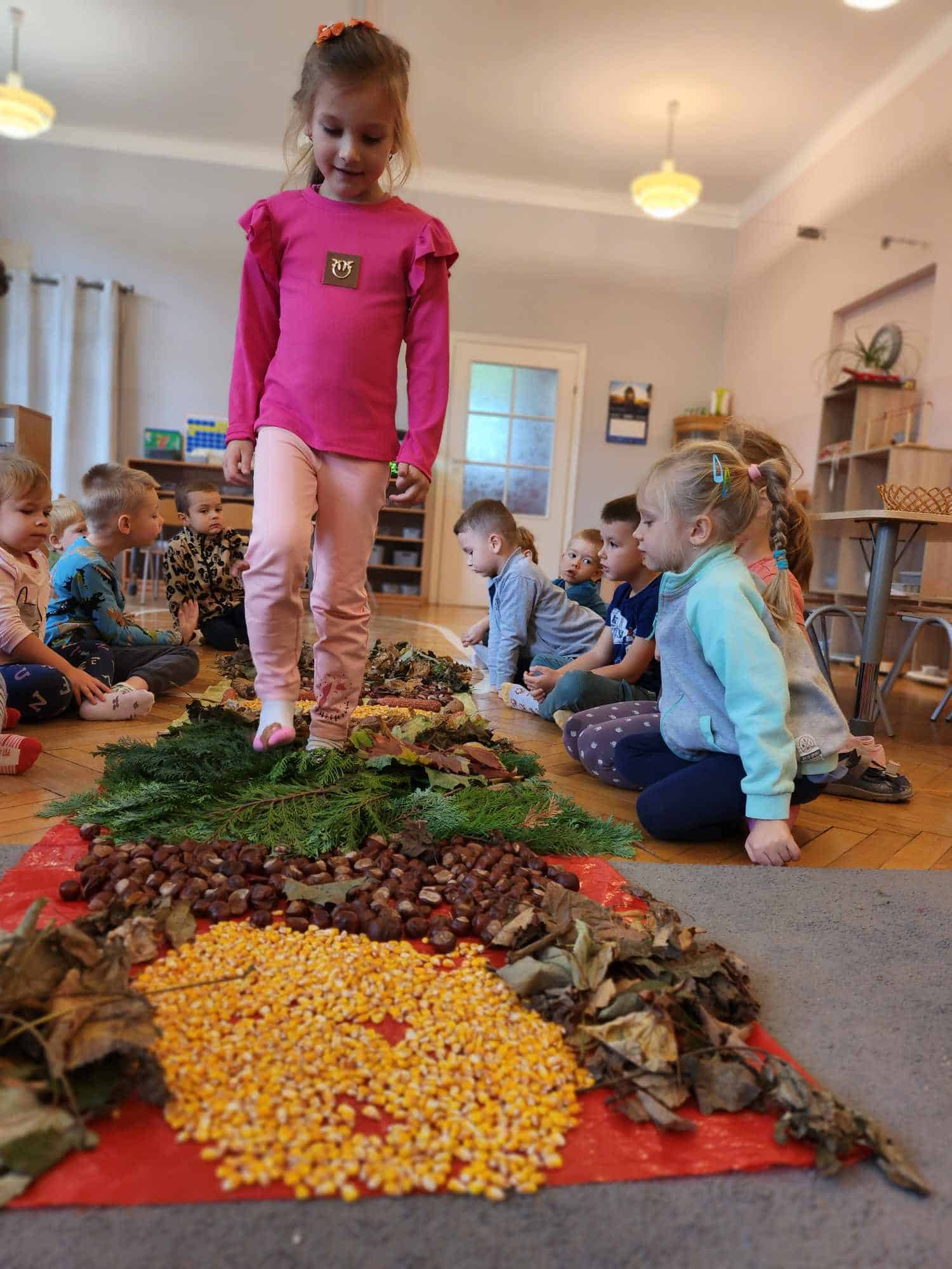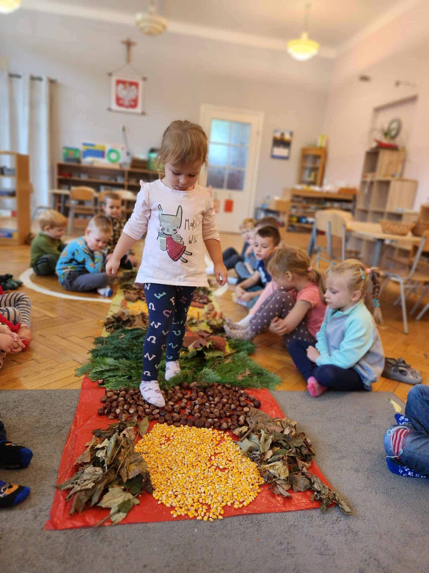 Wykorzystaliśmy do stworzenia naszej jesiennej ścieżki liście, kasztany, szyszki, kolby i ziarna kukurydzy. Następnie wszyscy bardzo chętnie nawet kilkukrotnie przechodziliśmy po niej bez butów by poczuć pod stopami ich różnorodną strukturę. Spacer po niej sprawił naszym przedszkolakom mnóstwo radości.