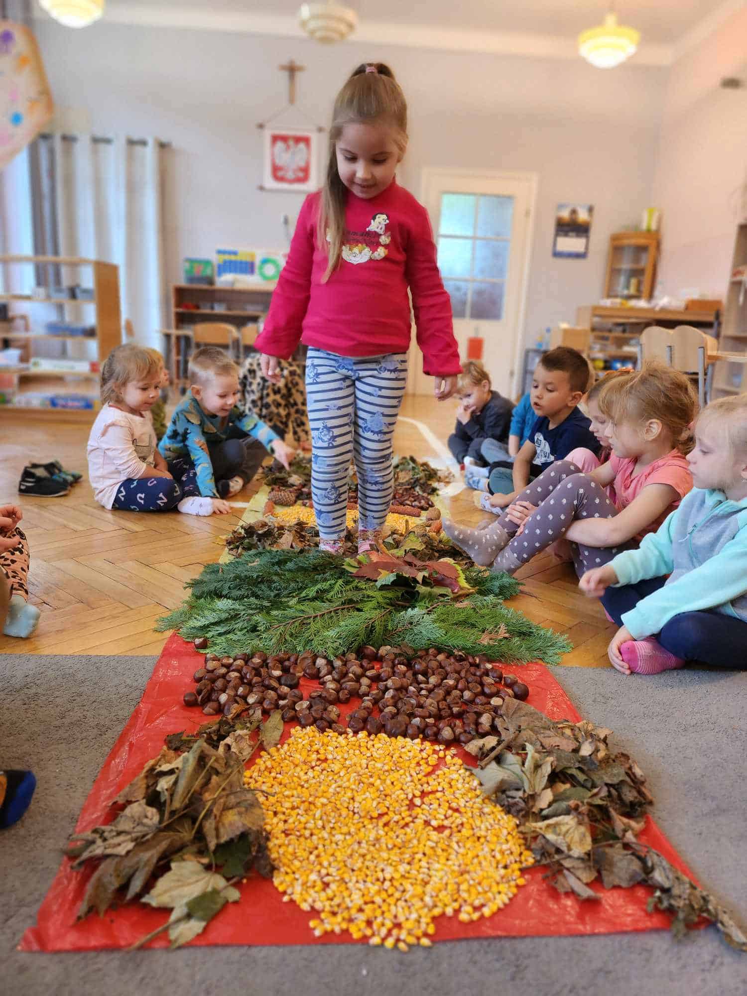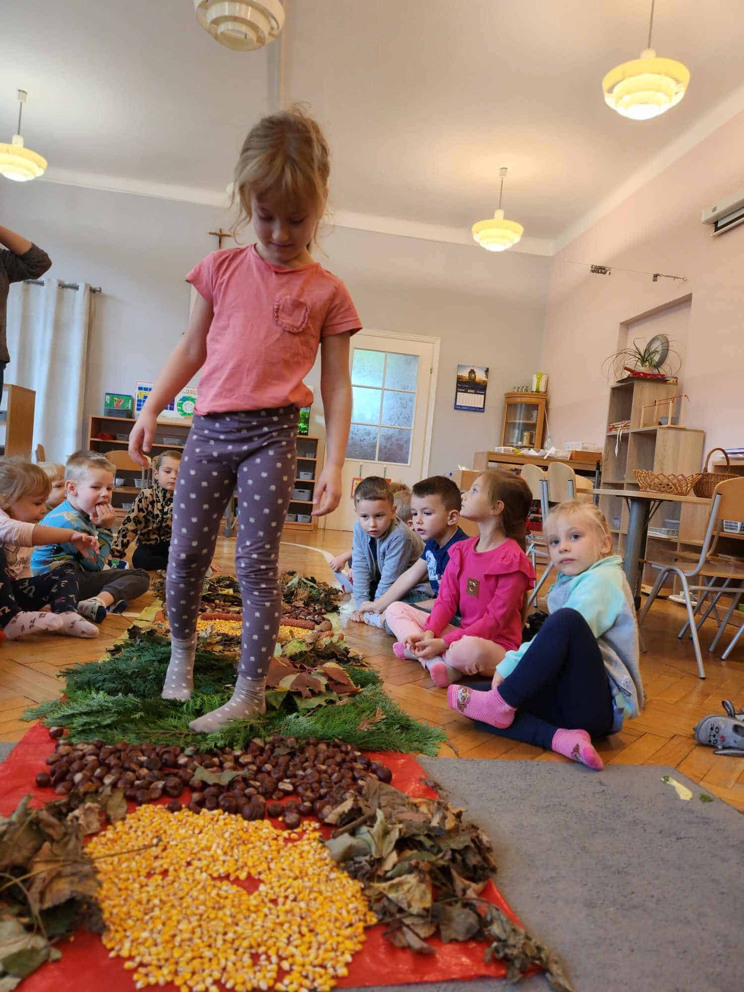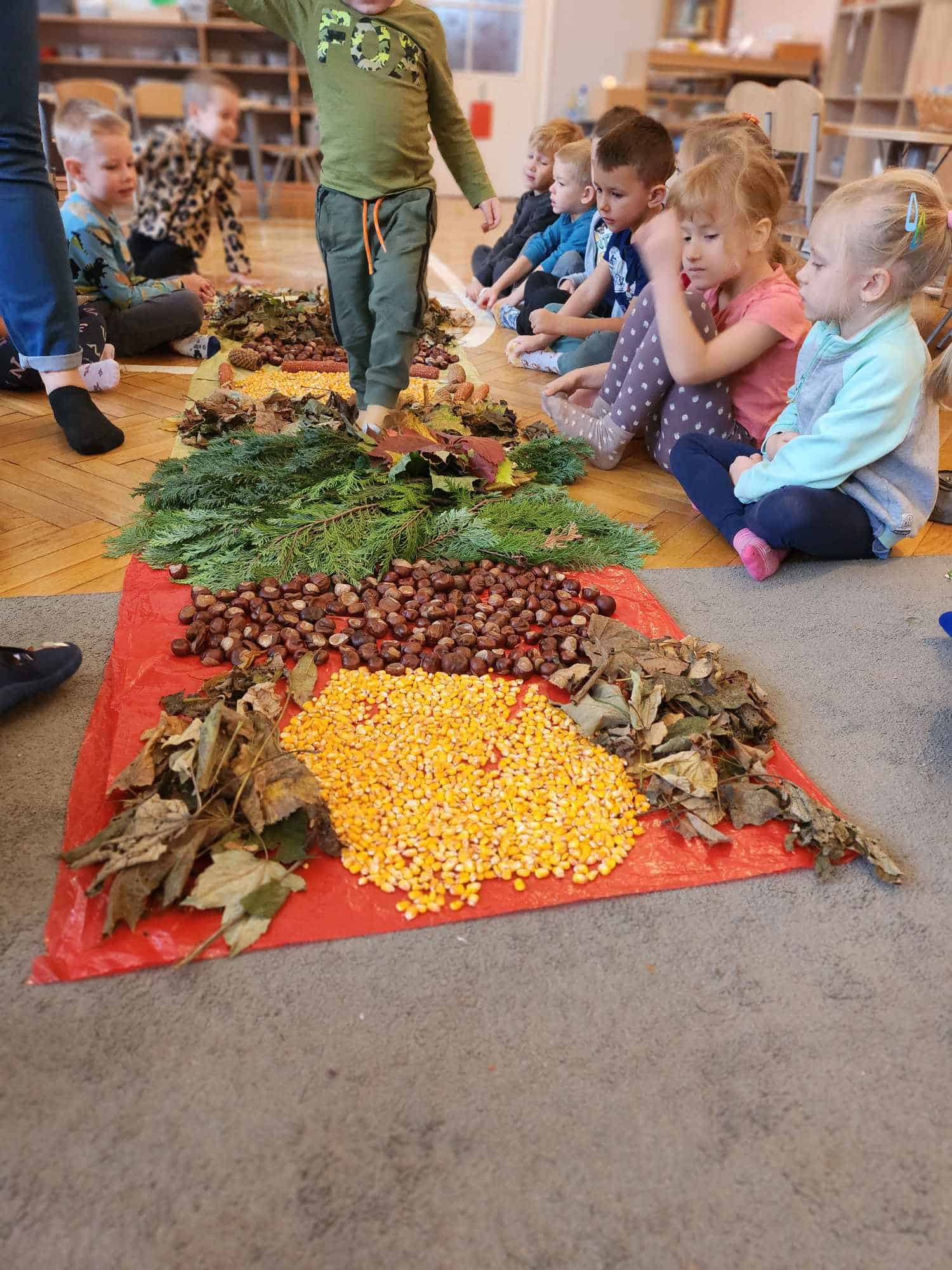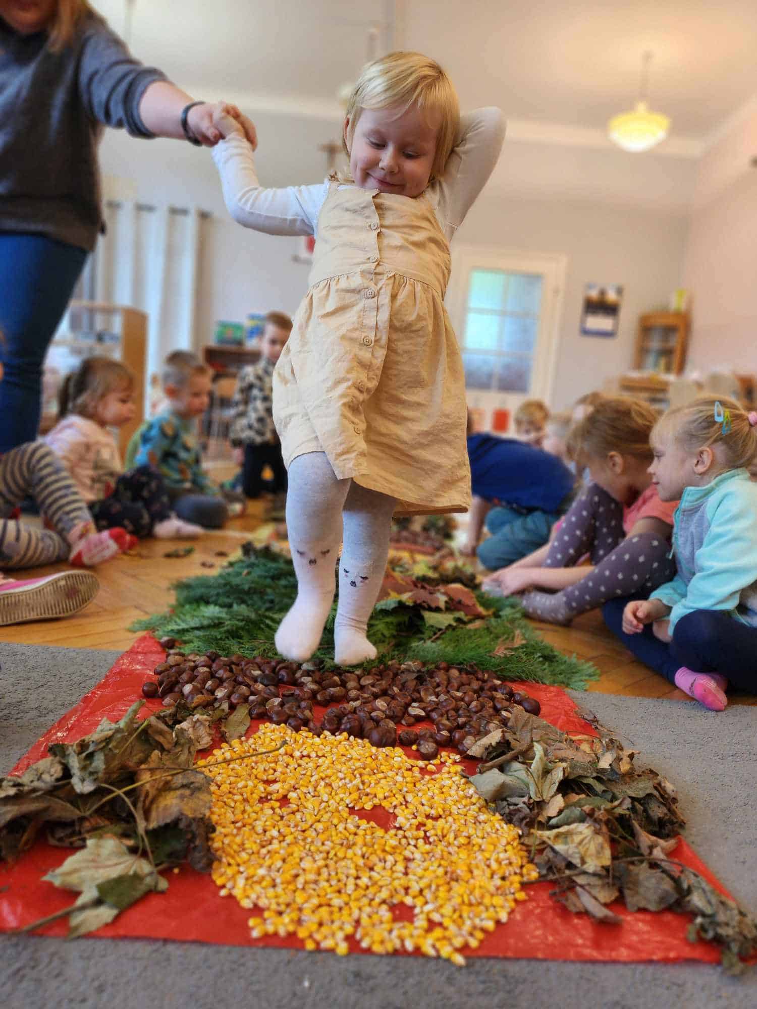 Wykorzystaliśmy do stworzenia naszej jesiennej ścieżki liście, kasztany, szyszki, kolby i ziarna kukurydzy. Następnie wszyscy bardzo chętnie nawet kilkukrotnie przechodziliśmy po niej bez butów by poczuć pod stopami ich różnorodną strukturę. Spacer po niej sprawił naszym przedszkolakom mnóstwo radości.
