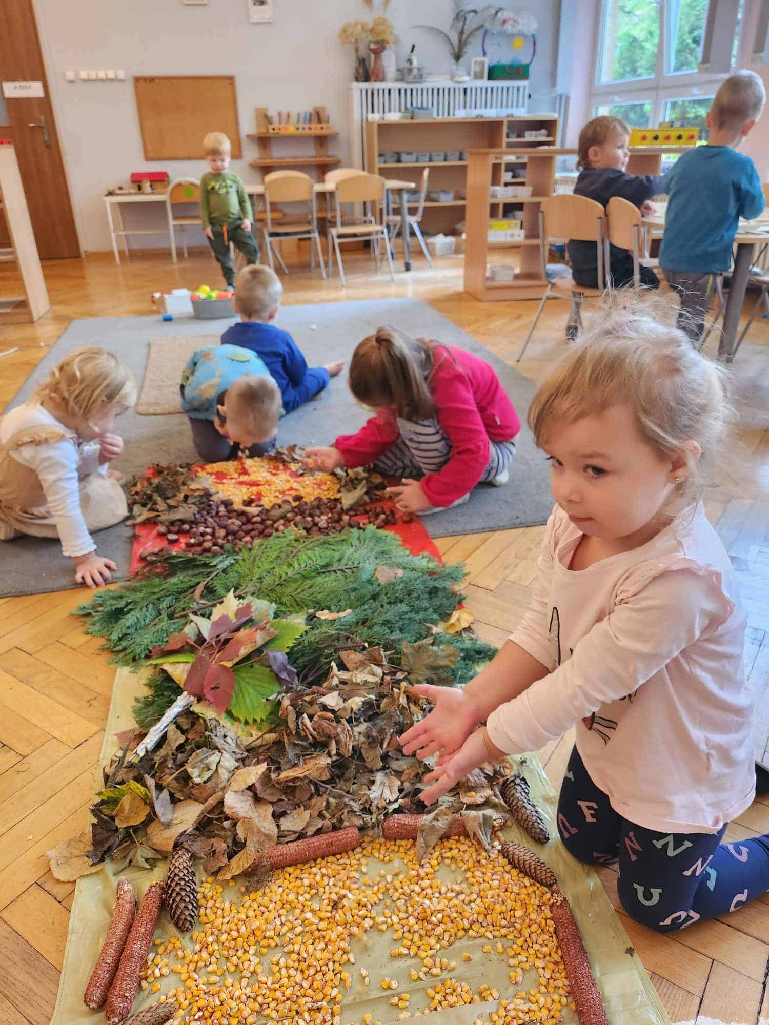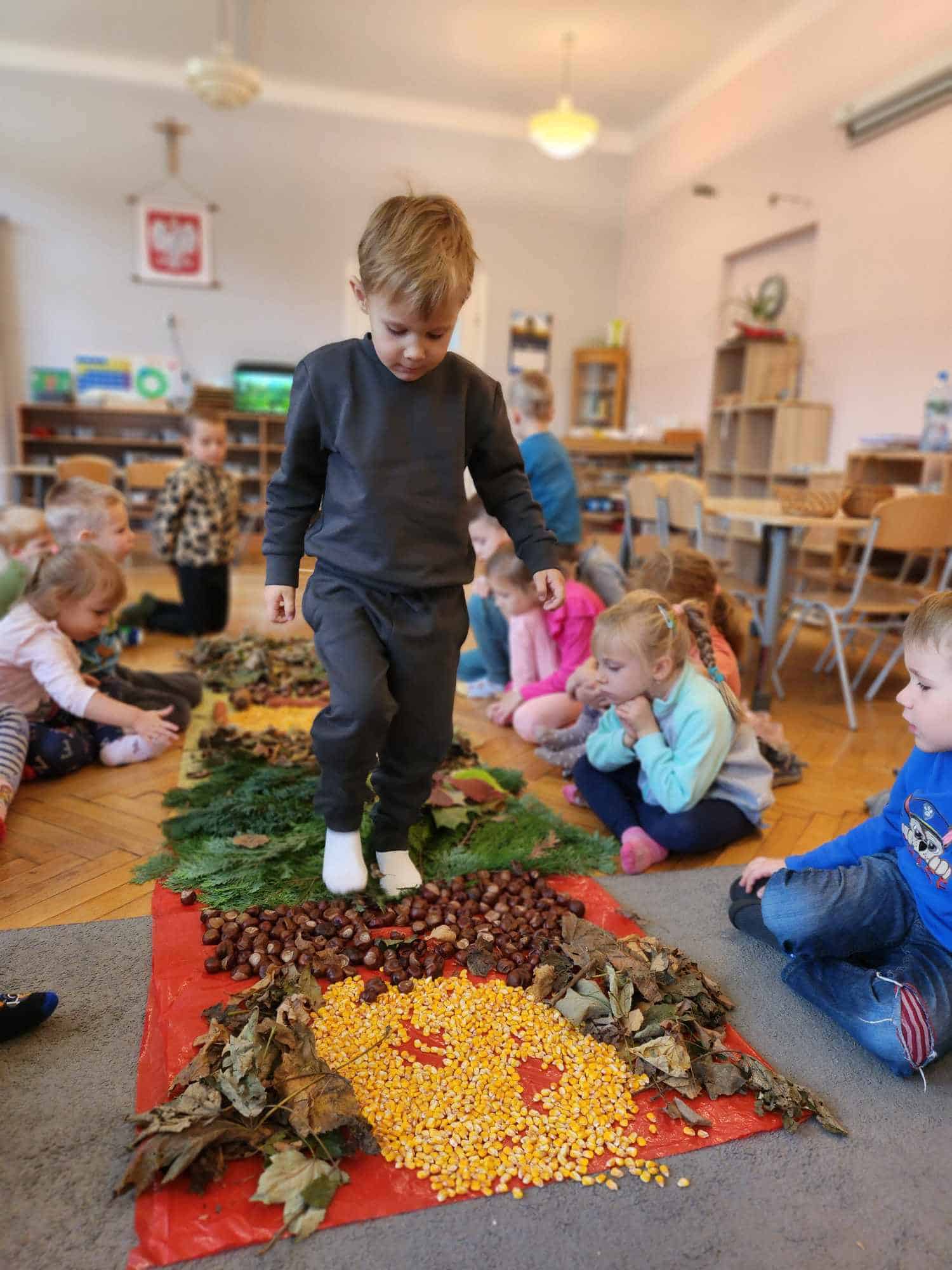W tym tygodniu nasze przedszkolaki przyglądały się uważnie tym darom. Poznawały je ich kształty, kolory, sprawdzały dłońmi ich strukturę, a także zapach. Wraz z dziećmi w naszej sali stworzyliśmy jesienną ścieżkę sensoryczną.