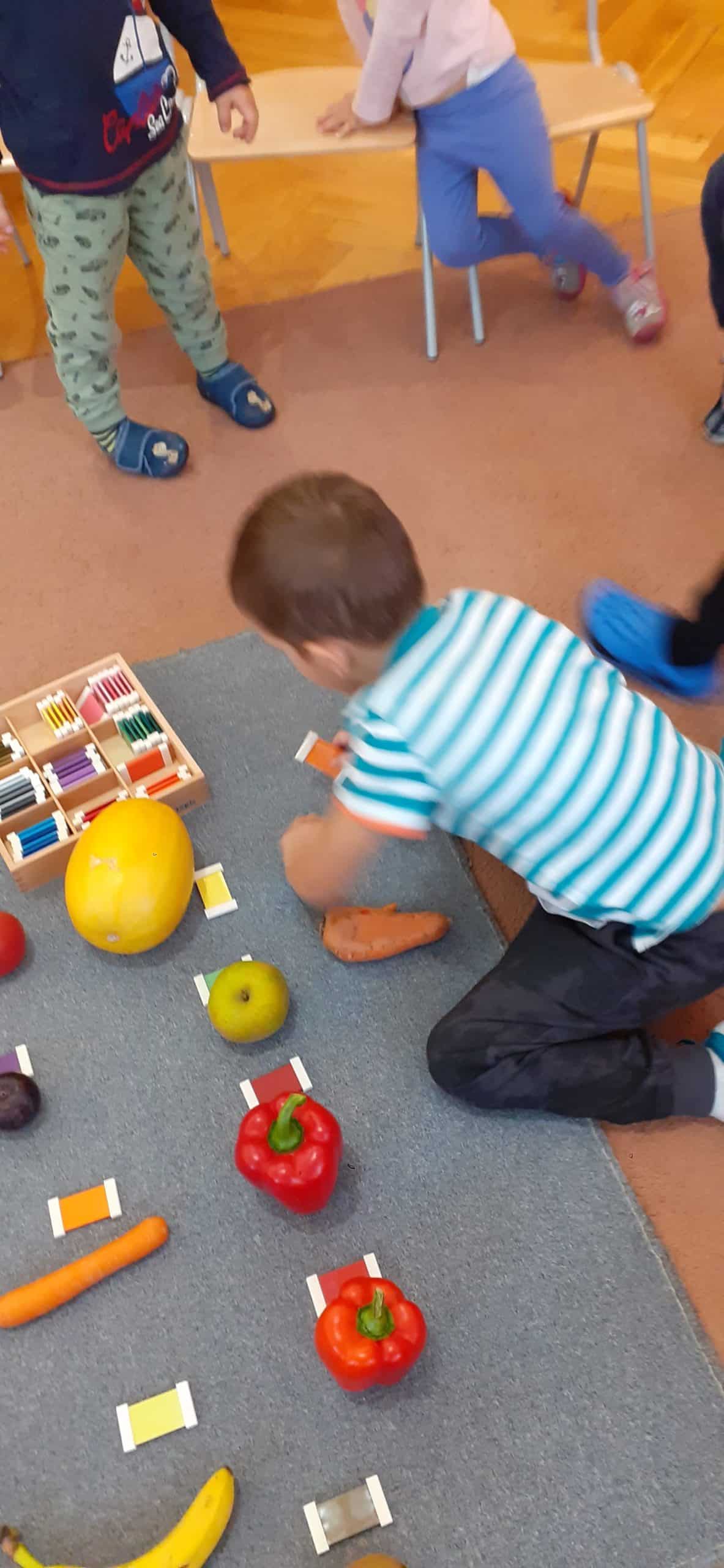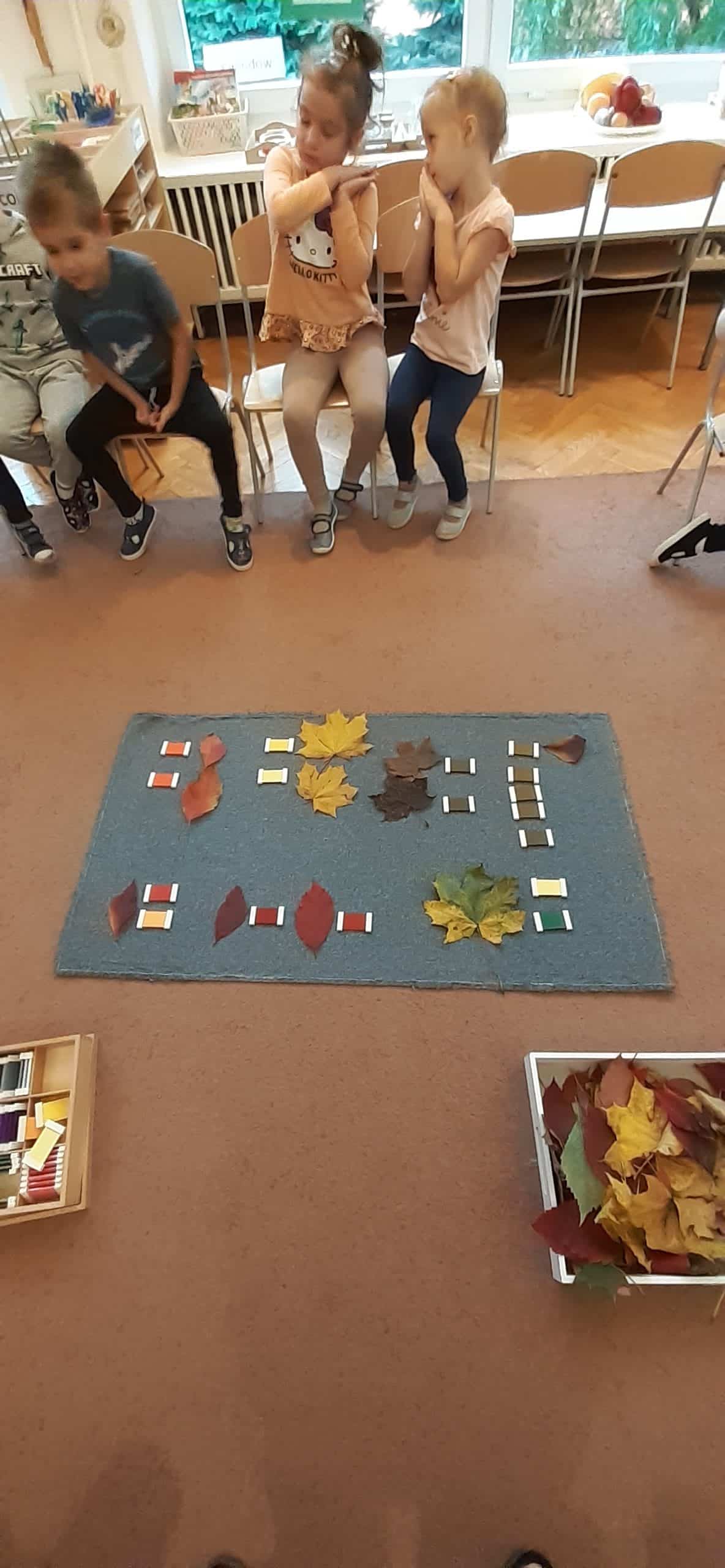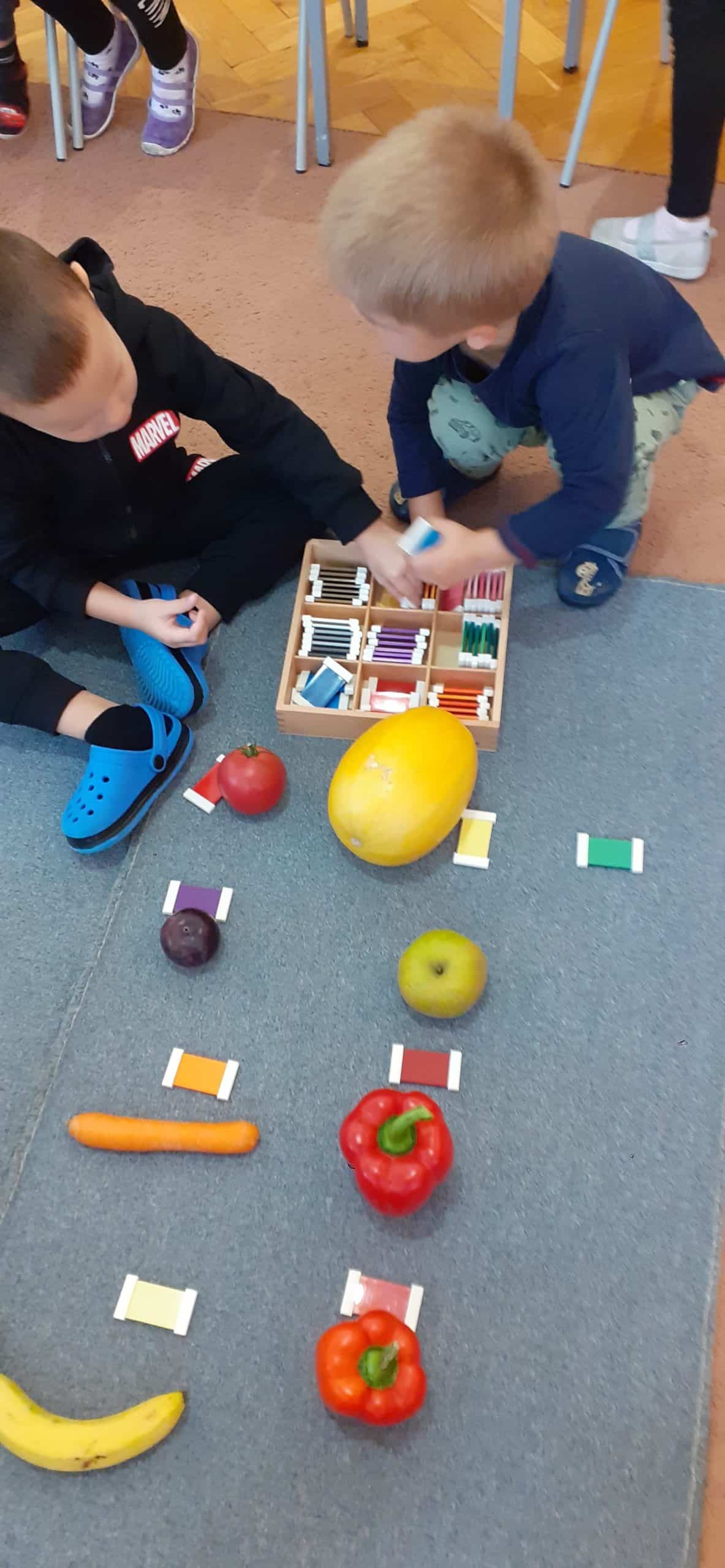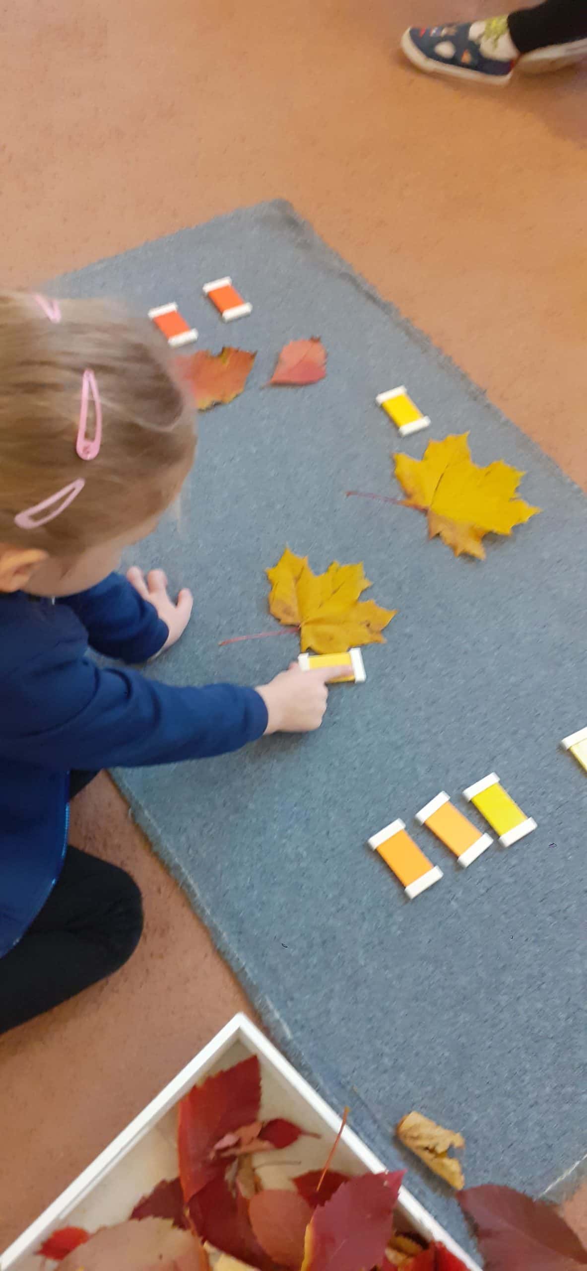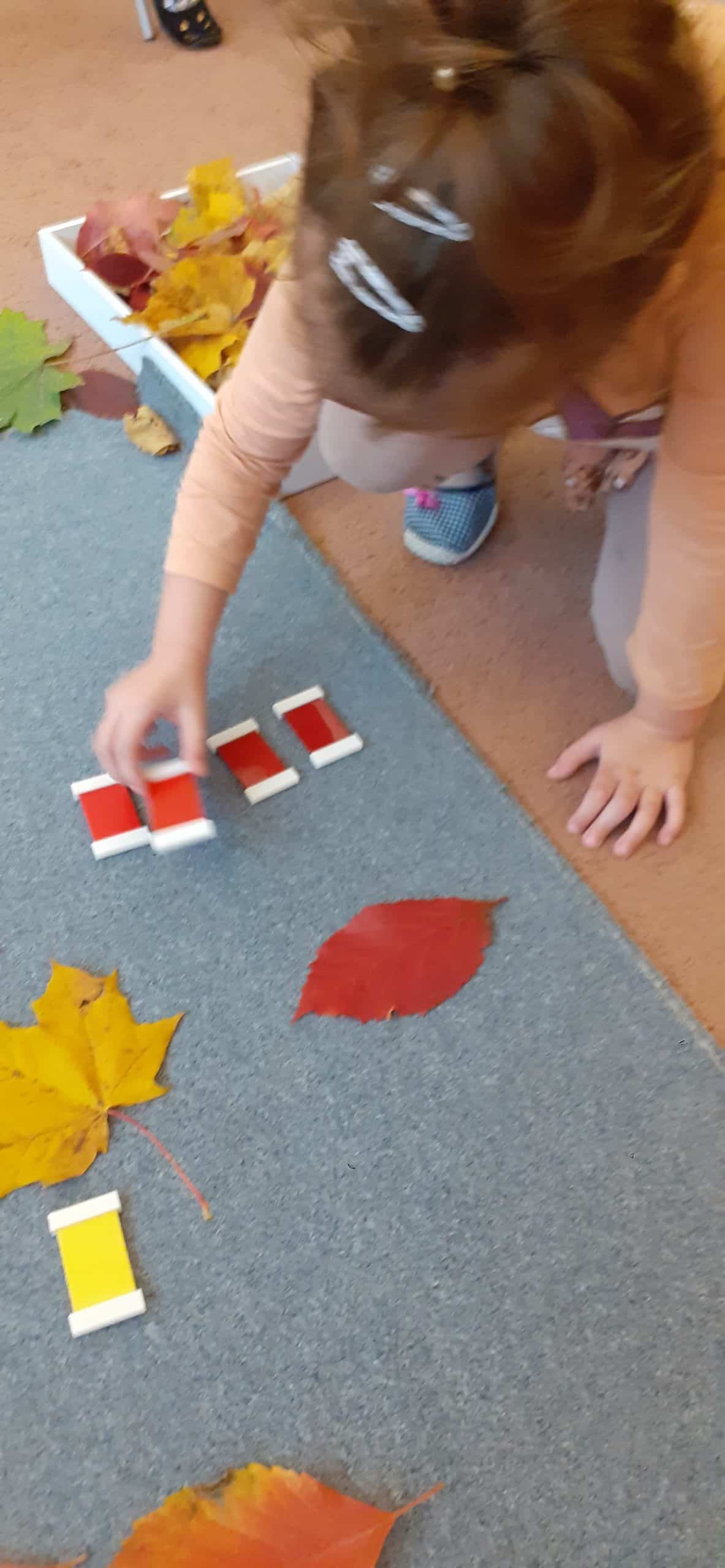 Dzieci bardzo lubią zabawy z kolorami. Malowanie farbami,tworzenie nowych kolorów przez mieszanie barw podstawowych, barwienie wody i uzyskiwanie nowych pochodnych kolorów to ulubione aktywności dzieci. Jesień jest szczególną porą roku jeśli chodzi o kolory. Zabawy w ogrodzie przedszkolnym w odnajdywanie całej gamy kolorystycznej liści bardzo angażują dzieci. Większość dzieci rozróżnia i nazywa kolory podstawowe, to kompetencja już dziecka 3 letniego. W pedagogice Montessori ogromna wagę przywiązuje się do kształcenia zmysłów. Podstawowym materiałem rozwojowym do kształcenia zmysłu wzroku są tabliczki barwne. To pomoc Montessori z zakresu nauki kolorów, rozwija i uwrażliwia zmysł wzroku, uczy stopniowania kolorów. Przy okazji dzieci poznają pojęcia: jasny kolor, ciemny, jaśniejszy od… , ciemniejszy od…, najjaśniejszy, najciemniejszy. Stopniowanie kolorów, czyli układanie od najjaśniejszego koloru do najciemniejszego nie jest łatwe , wymaga dostrzegania drobnych różnic kolorystycznych. Ale dzieci lubią takie zabawy. Tym razem odszukiwały odcienie kolorów identyczne z kolorem owoców, warzyw i liści znalezionych w ogrodzie przedszkolnym.