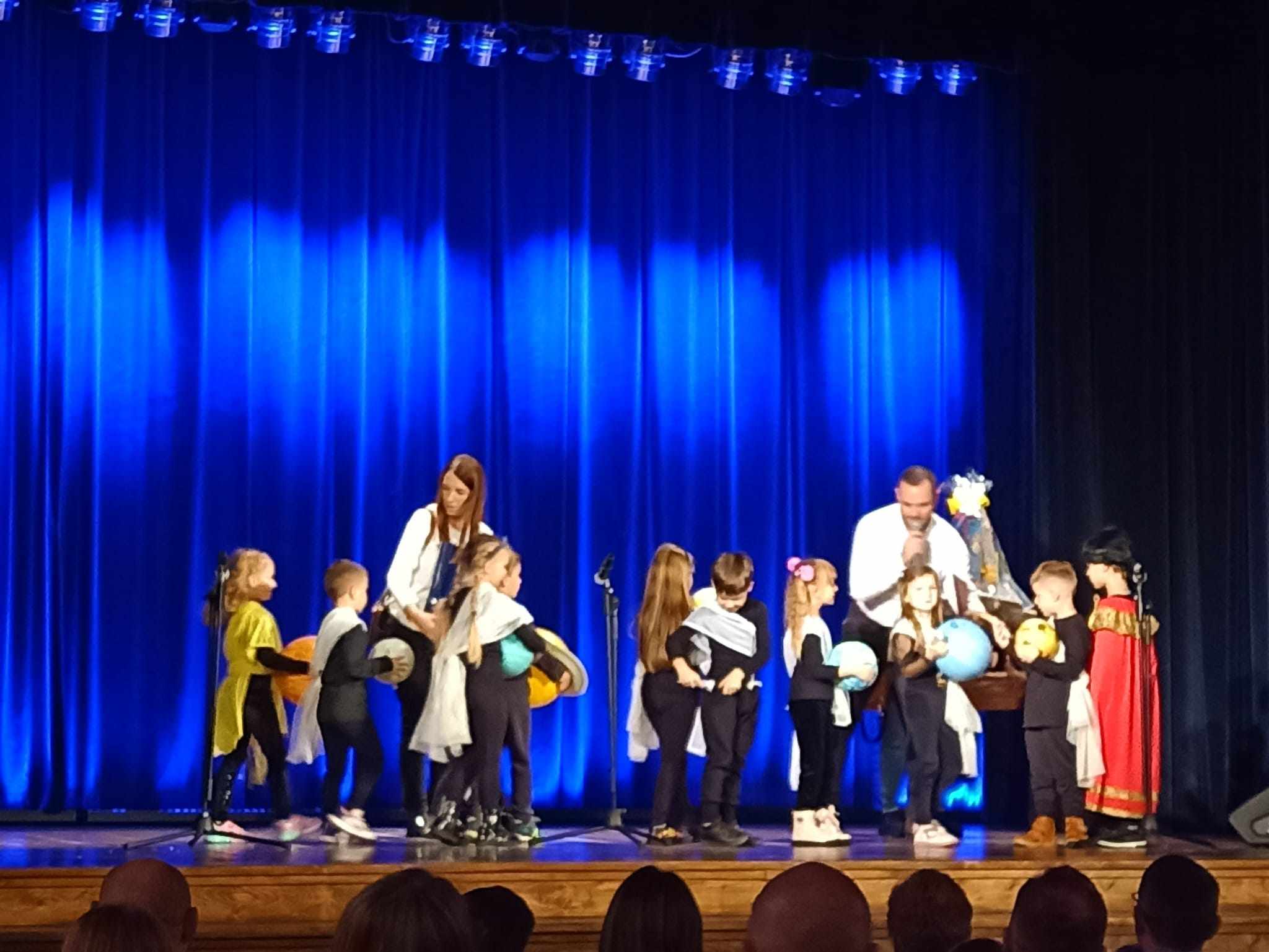 W sobotę 28 października nasze przedszkolaki wzięły udział w XX Przeglądzie Twórczości Dziecięcej „Bajkowy Świat”. Organizatorem przeglądu był Ośrodek Rehabilitacyjno-Edukacyjno-Wychowawczy im. Krystyny Rajtar w Jarosławiu.  Tegoroczny przegląd odbył się w Jarosławskim Ośrodku Kultury i Sztuki, a jego tematem przewodnim była teoria heliocentryczna Mikołaja Kopernika. Nasze Przedszkolaki zaprezentowały montaż słowno-muzyczny pt. Kosmos bez tajemnic”🪐🪐🪐  Mali aktorzy poradzili sobie świetnie, dla niektórych był to debiut na tak dużej scenie. Gratulujemy Wam serdecznie i życzymy dalszych sukcesów. Dostaliśmy piękny prezent, ilustrowaną księgę o naszym mieście Jarosławiu, dyplom, bańki mydlane, ciastolinę, dynamiczny piasek oraz grę zręcznościową – Tańczący robak. Otrzymane prezenty sprawiły dzieciom dużo radości – DZIĘKUJEMY!