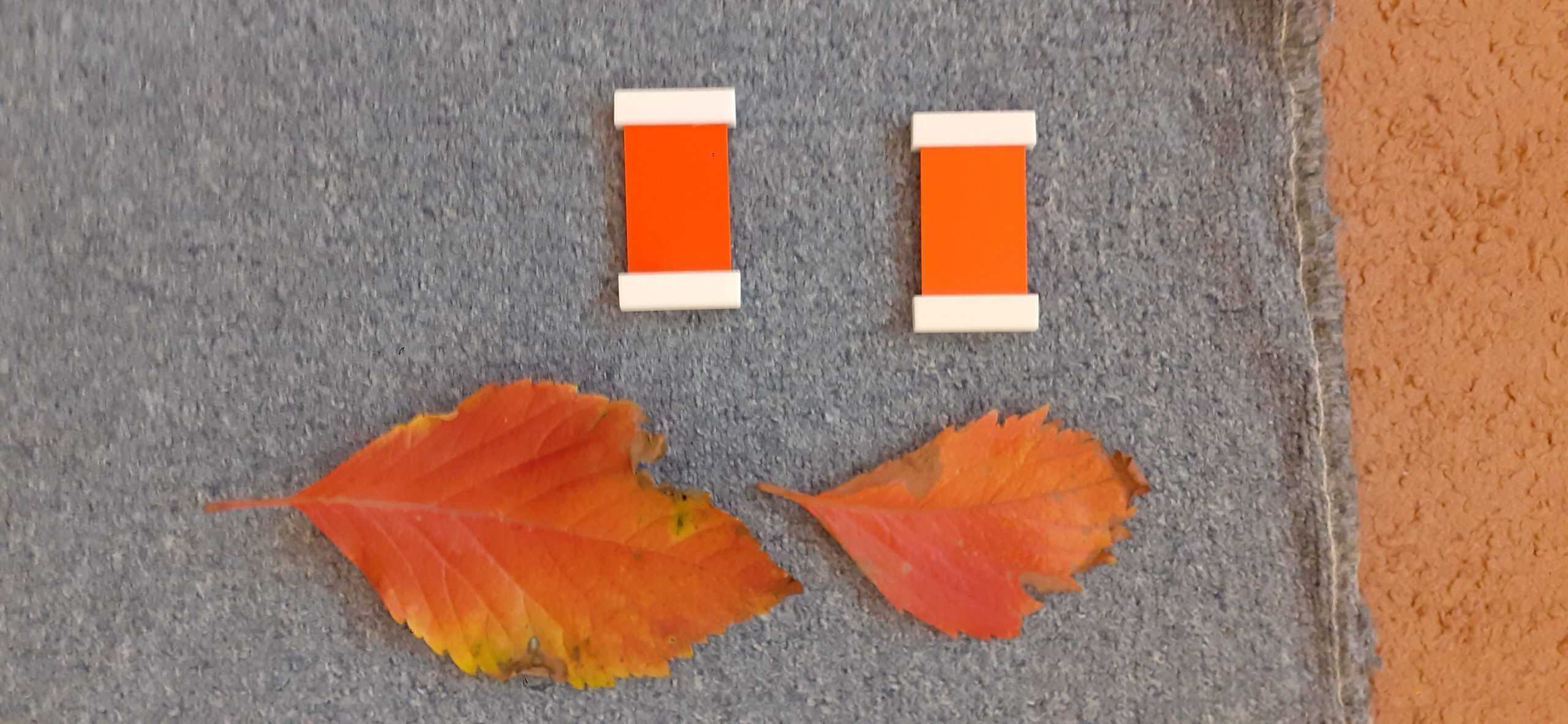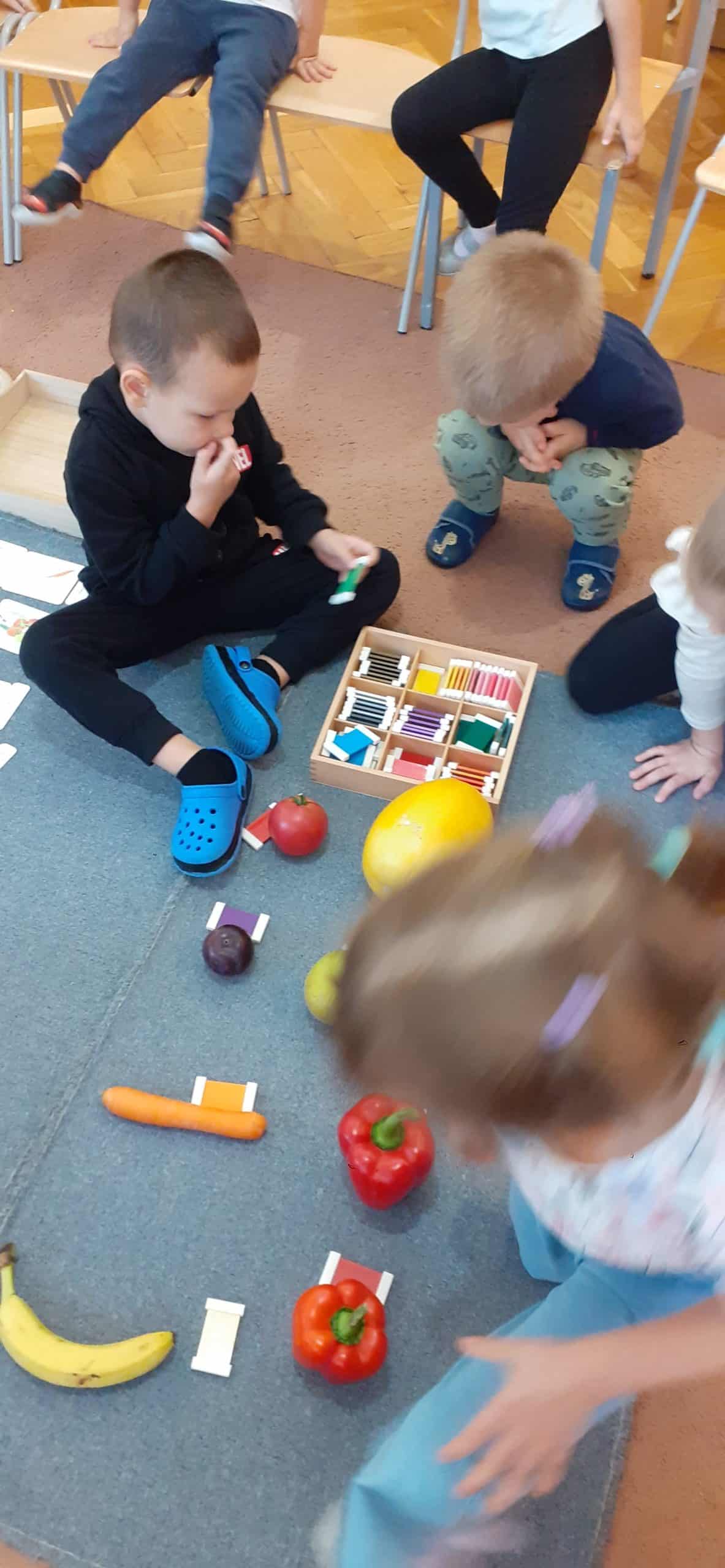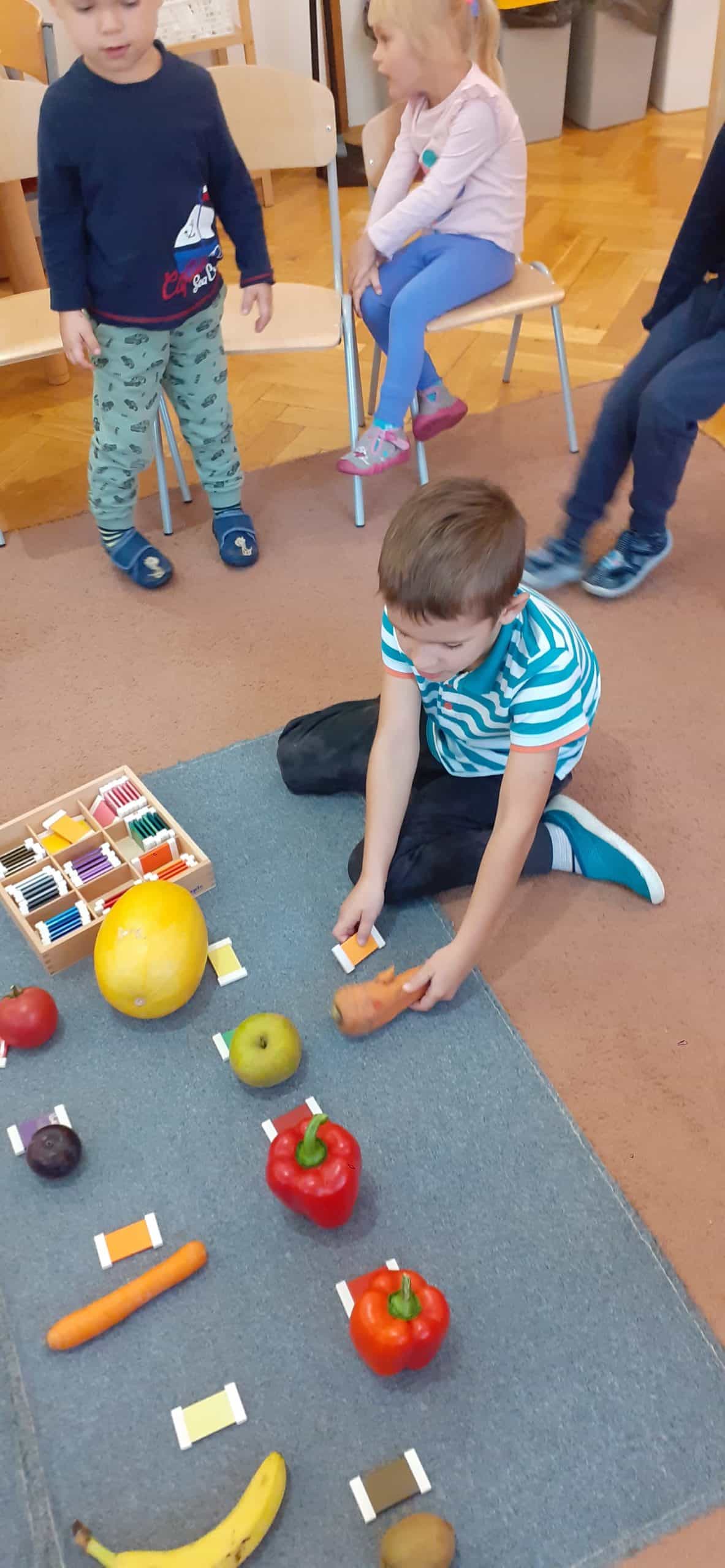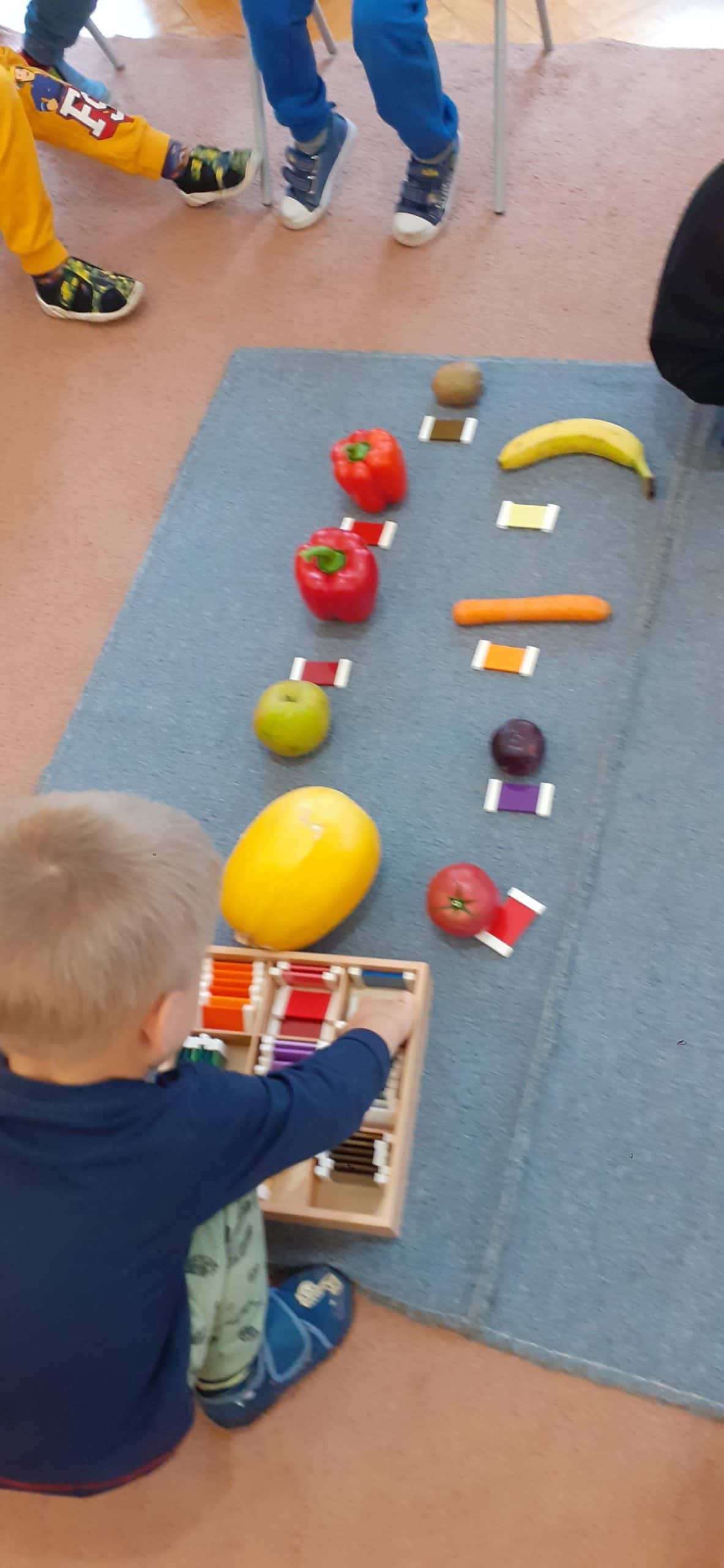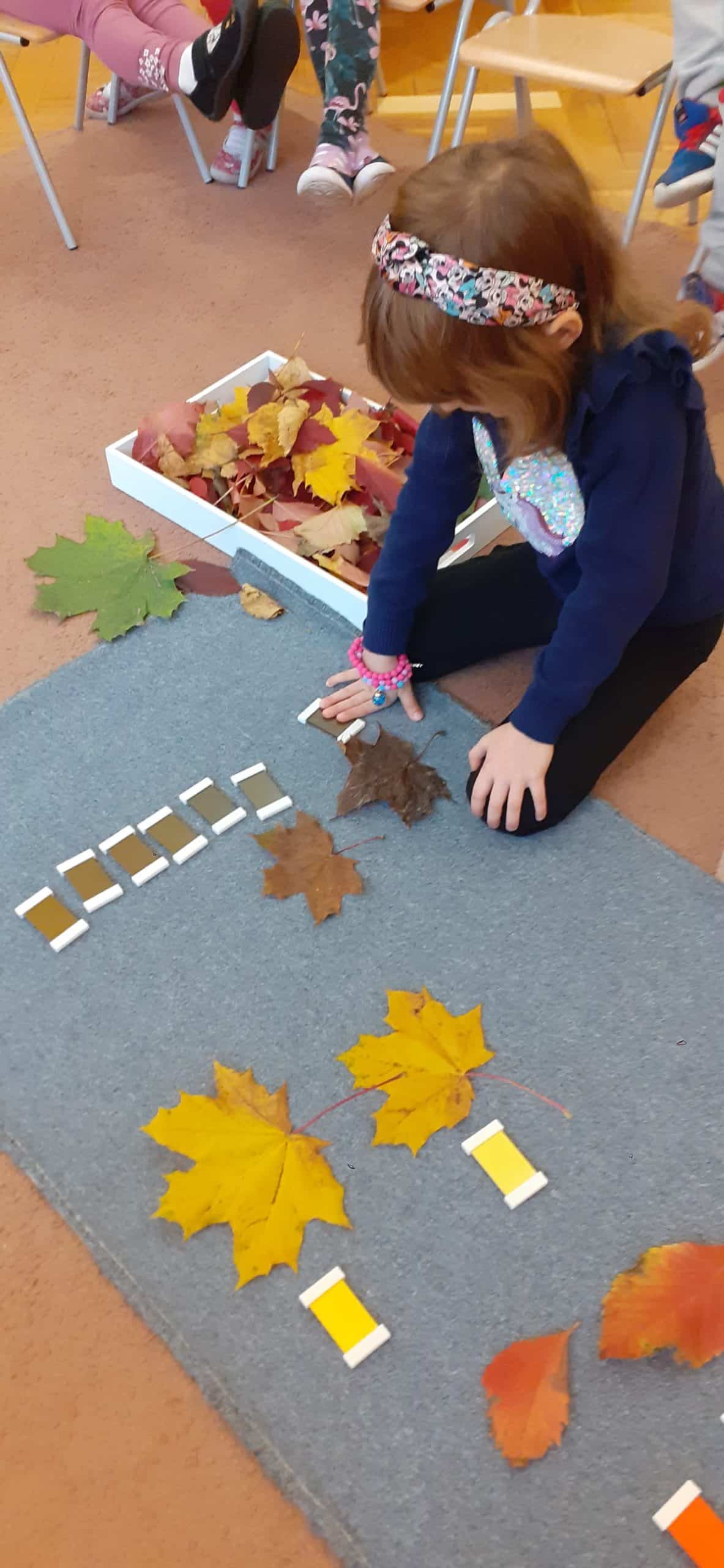 Dzieci bardzo lubią zabawy z kolorami. Malowanie farbami,tworzenie nowych kolorów przez mieszanie barw podstawowych, barwienie wody i uzyskiwanie nowych pochodnych kolorów to ulubione aktywności dzieci. Jesień jest szczególną porą roku jeśli chodzi o kolory. Zabawy w ogrodzie przedszkolnym w odnajdywanie całej gamy kolorystycznej liści bardzo angażują dzieci. Większość dzieci rozróżnia i nazywa kolory podstawowe, to kompetencja już dziecka 3 letniego. W pedagogice Montessori ogromna wagę przywiązuje się do kształcenia zmysłów. Podstawowym materiałem rozwojowym do kształcenia zmysłu wzroku są tabliczki barwne. To pomoc Montessori z zakresu nauki kolorów, rozwija i uwrażliwia zmysł wzroku, uczy stopniowania kolorów. Przy okazji dzieci poznają pojęcia: jasny kolor, ciemny, jaśniejszy od… , ciemniejszy od…, najjaśniejszy, najciemniejszy. Stopniowanie kolorów, czyli układanie od najjaśniejszego koloru do najciemniejszego nie jest łatwe , wymaga dostrzegania drobnych różnic kolorystycznych. Ale dzieci lubią takie zabawy. Tym razem odszukiwały odcienie kolorów identyczne z kolorem owoców, warzyw i liści znalezionych w ogrodzie przedszkolnym.