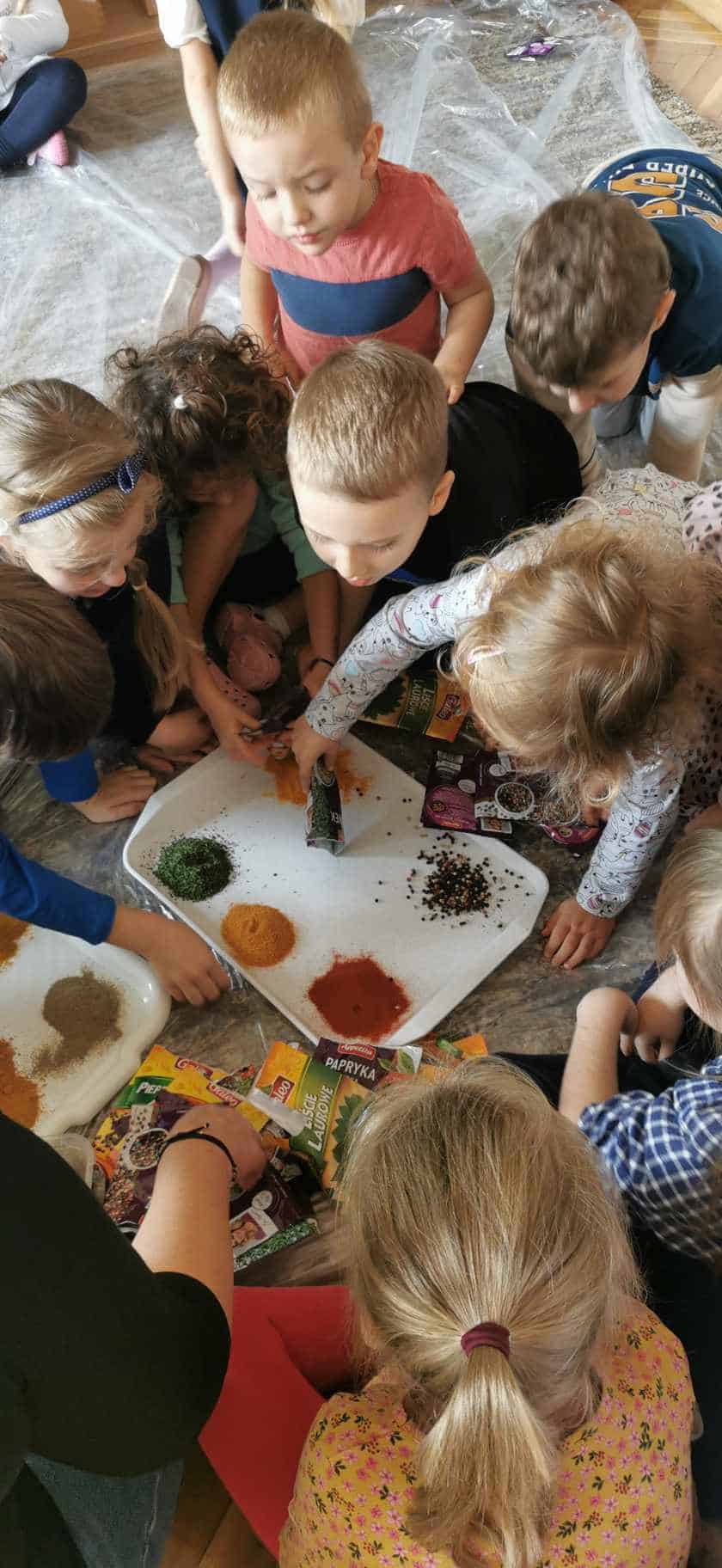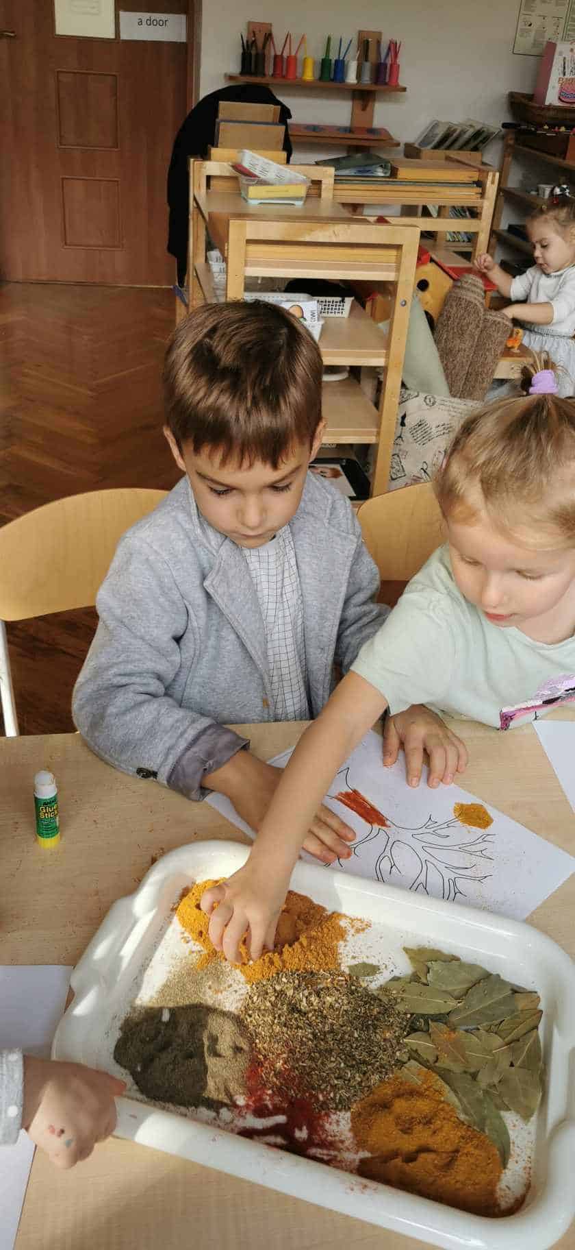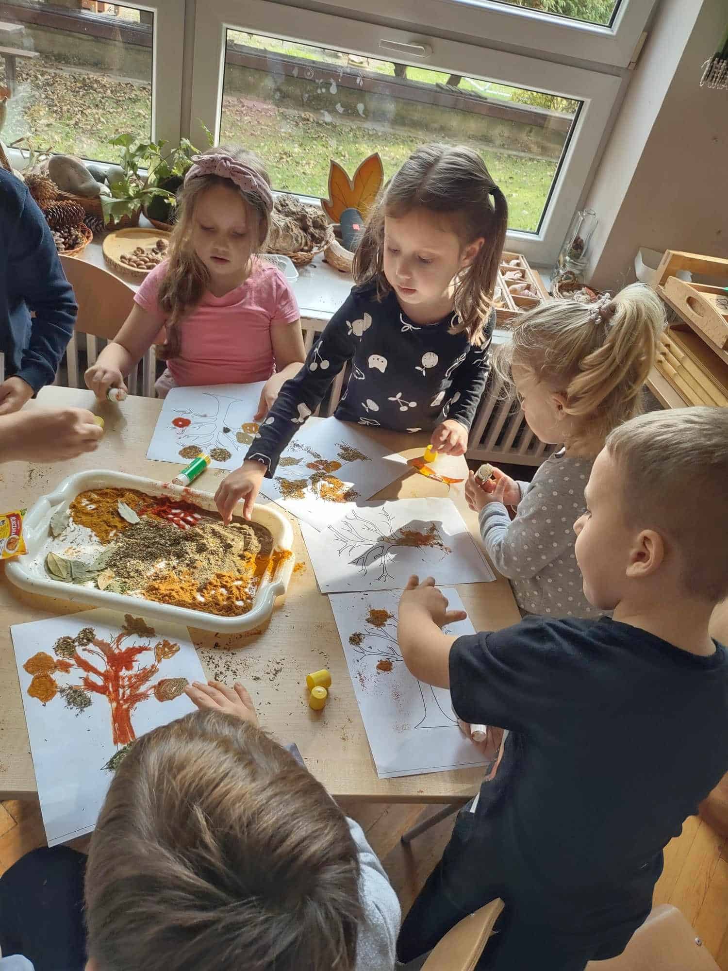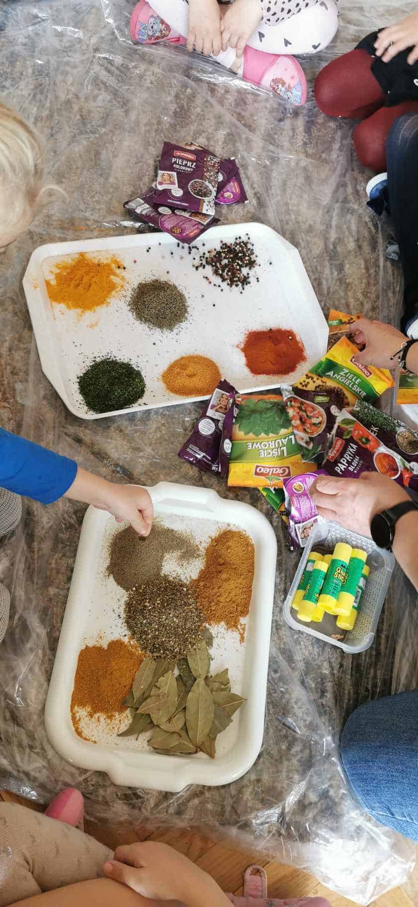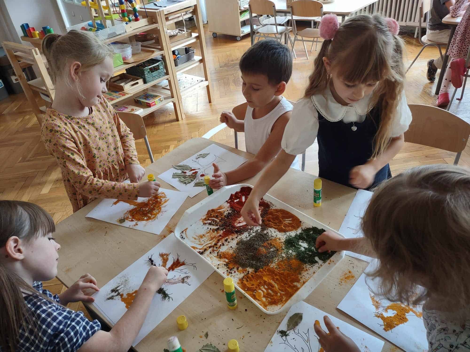 Motywem przewodnim większości jesiennych prac są oczywiście drzewa. Piękne jesienne kolory towarzyszą im niezmiennie. Dzieci z Grupy Zielonej, chcąc jeszcze bardziej „zanurzyć” się w kolorach jesieni postanowiły wykonać drzewo jesienne przy użyciu kleju i … przypraw ☺️, tak dokładnie przypraw dostępnych w każdej kuchni. Do naszych prac wykorzystaliśmy czerwoną paprykę, pieprz czarny, ziołowy i kolorowy, kminek, kurkumę, curry, ziele angielskie, liść laurowy, gałkę muszkatołowa, majeranek, bazylię, koperek i rozmaryn. Malowanie przyprawami było dla nas nie tylko fantastyczną zabawą, ale także ciekawą lekcją, podczas której nazywaliśmy poszczególne przyprawy i uczyliśmy się je rozróżniać po wyglądzie i zapachu. To był bardzo twórczo i pachnąco spędzony czas 😍