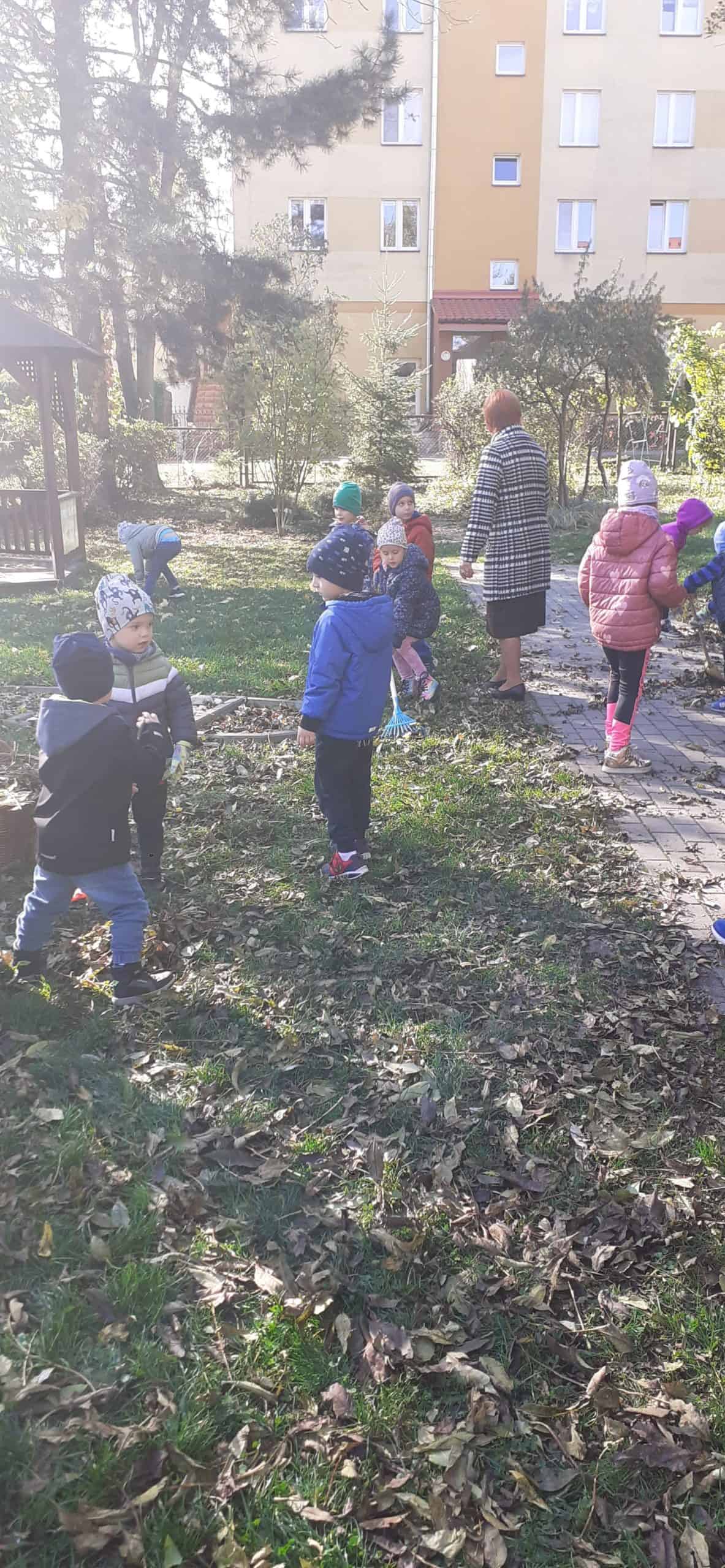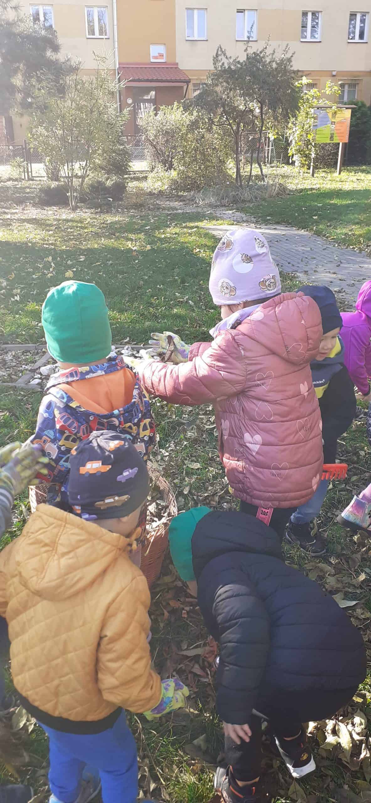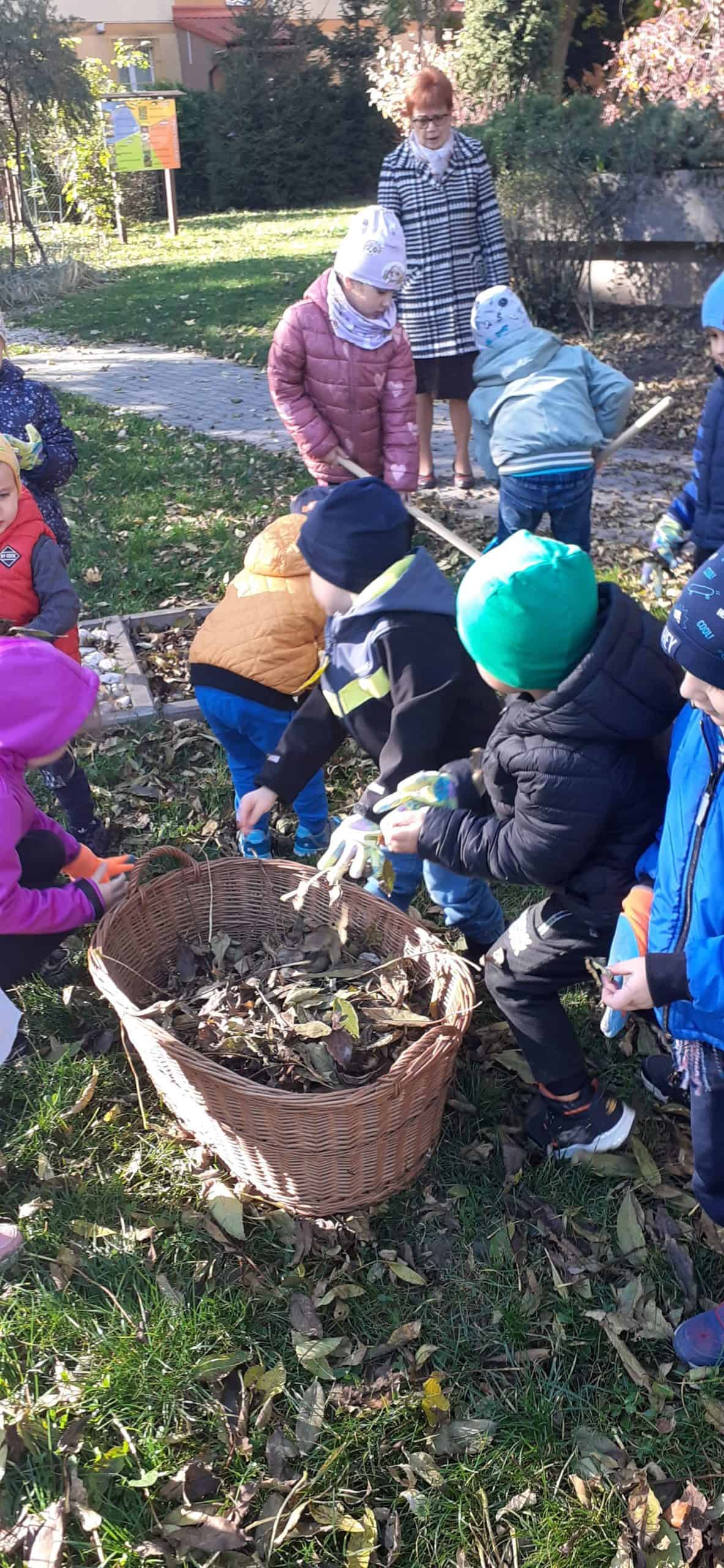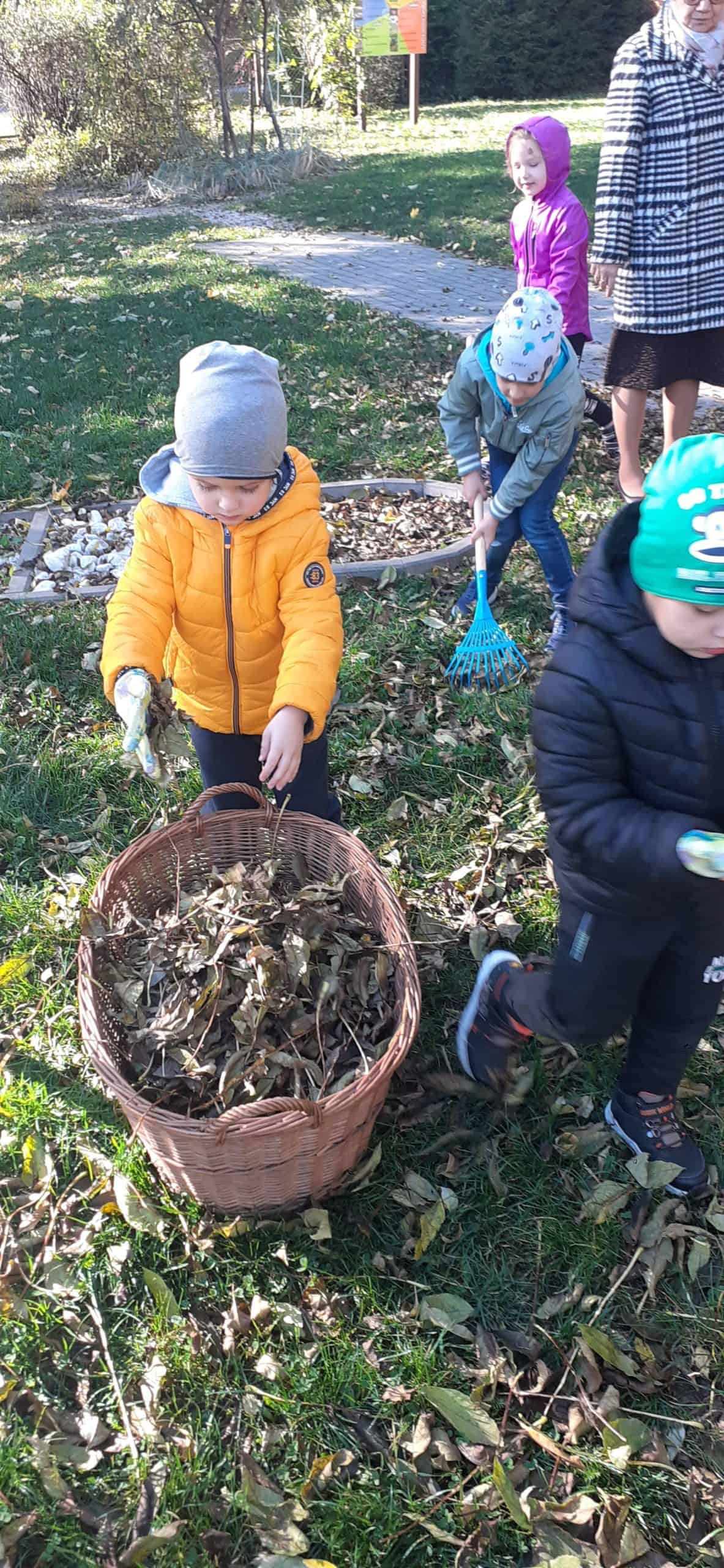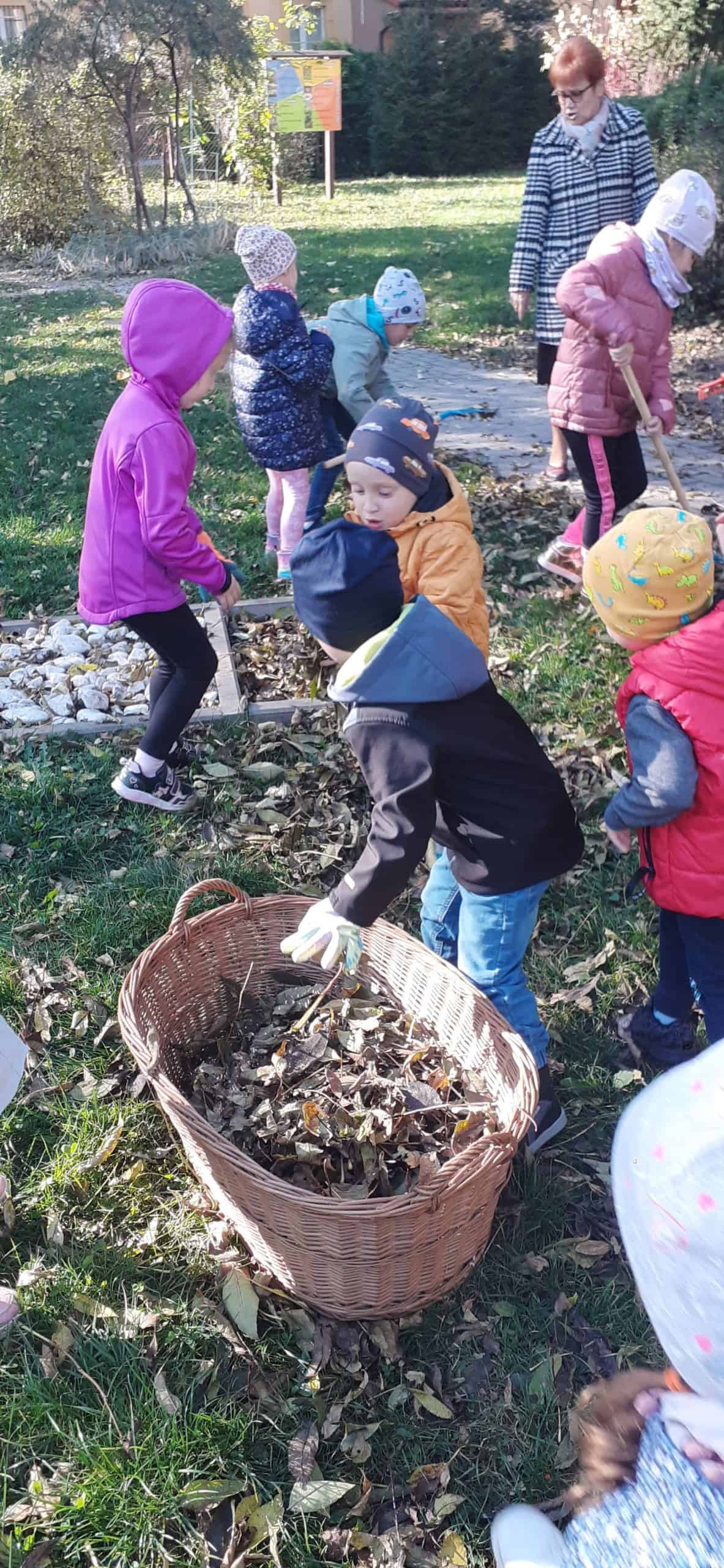 Nasze ostanie obserwacje przyrodnicze w ogrodzie przedszkolnym i na terenie przyrodniczej ścieżki edukacyjnej wyraźnie pokazały nam, że nadszedł czas jesiennych porządków w ogrodzie. Prace w ogrodzie zostały poprzedzone zajęciami odnoszącymi się do potrzeb roślin w okresie jesieni, kiedy to rośliny są już praktycznie w uśpieniu. Dzieci dowidziały się o podstawowych pracach jesiennych – koszenie trawnika, okrywanie delikatnych roślin włókniną, obwiązywanie sznurkiem rozłożystych roślin, przycinanie suchych i spróchniałych gałązek drzew i krzewów. Są to bardzo ważne zbiegi pielęgnacyjne, dzięki którym ogród bezpiecznie przetrwa zimę i będzie na nowo cieszył na wiosnę. Dzieci z ochotą zabrały się do pracy, a ich zadaniem było usunięcie suchych liści z trawnika. Ze skrzyni dzieci pobrały rękawice ochronne oraz niezbędne narzędzia ogrodnicze i do dzieła. W chwilę wiklinowy kosz zapełnił się zebranym przez dzieci listkami. Dzieci zrozumiały, że pomogły roślinom przygotować się do zimowego snu.