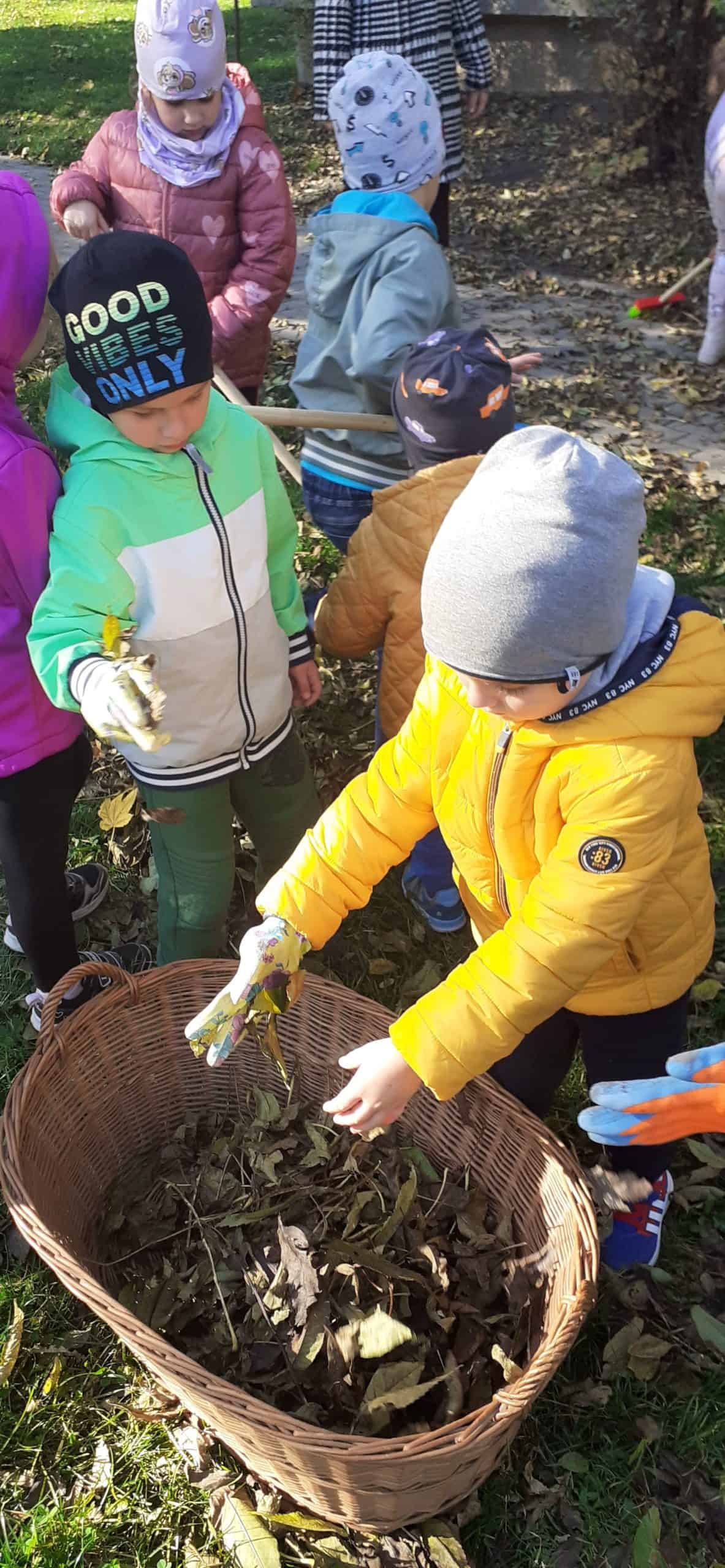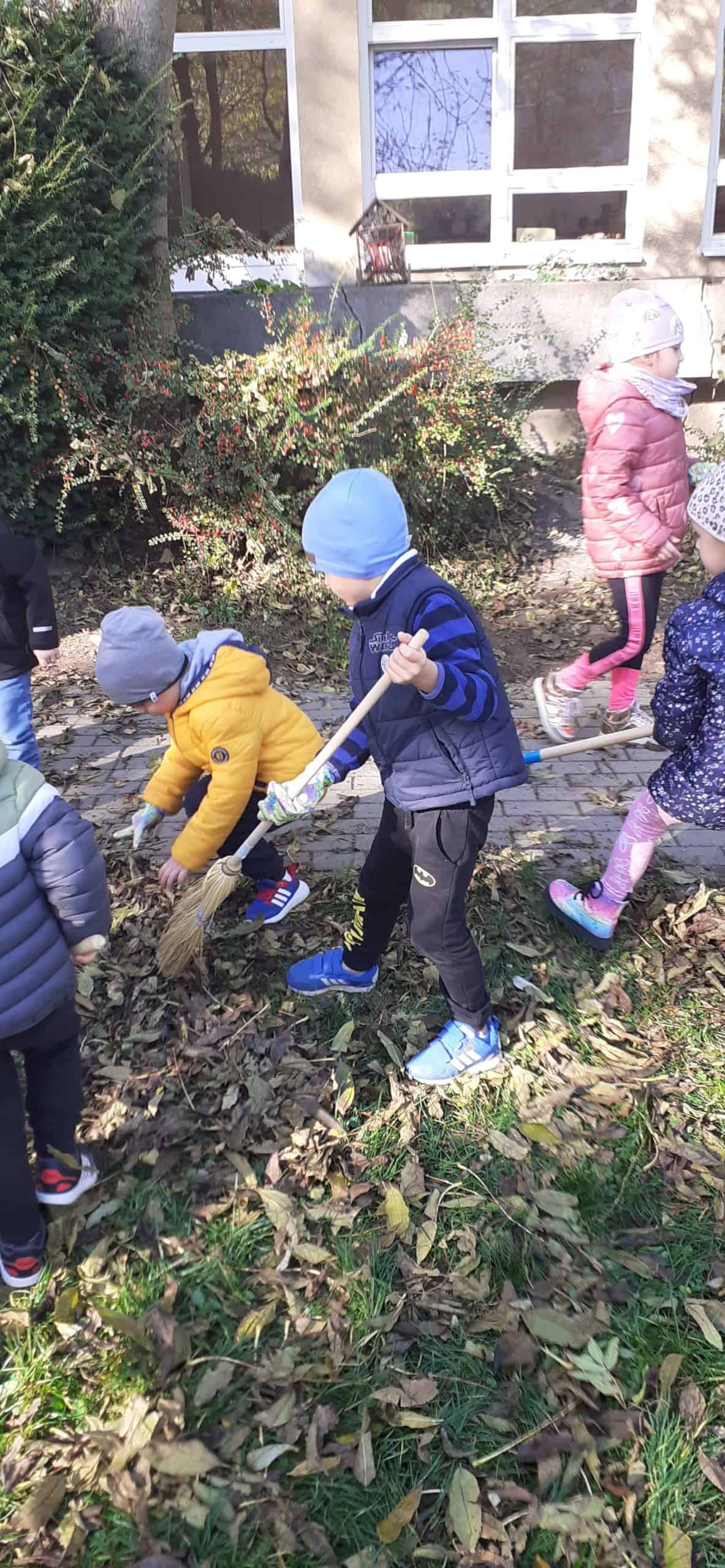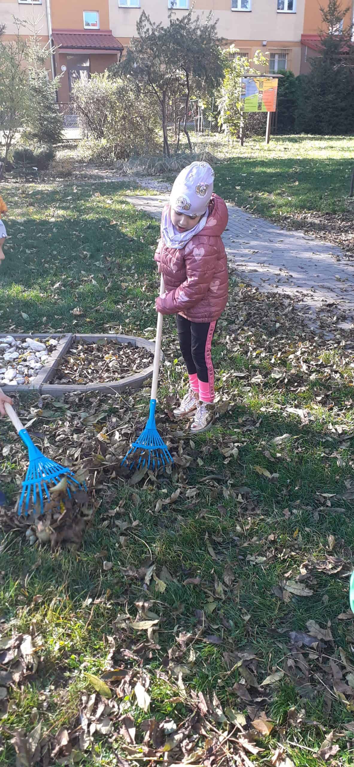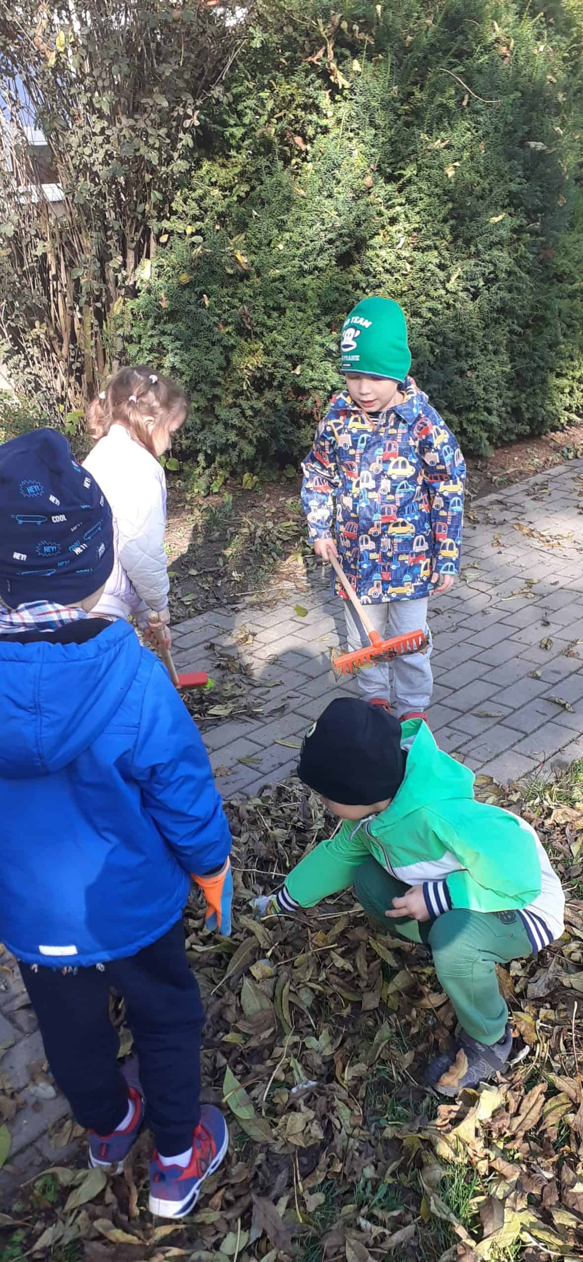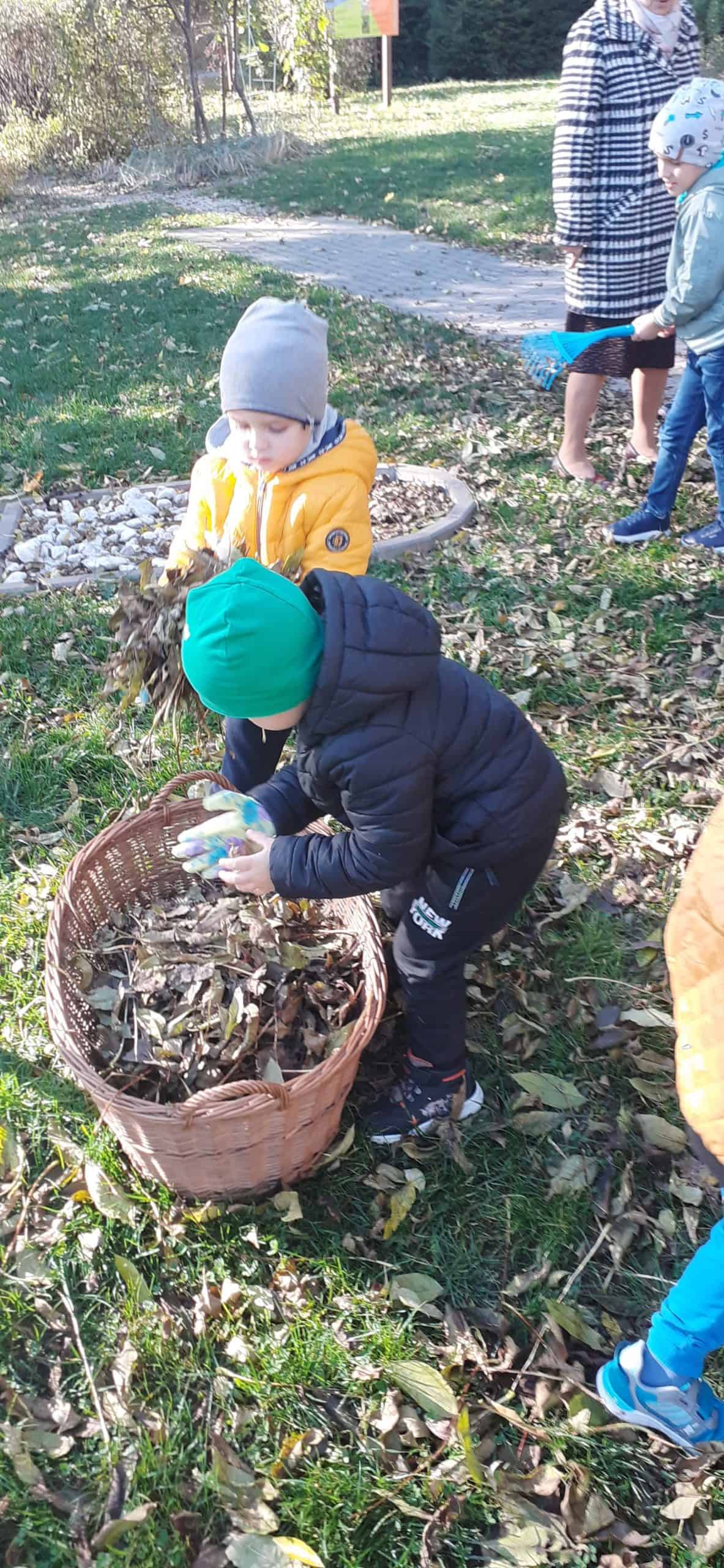 Nasze ostanie obserwacje przyrodnicze w ogrodzie przedszkolnym i na terenie przyrodniczej ścieżki edukacyjnej wyraźnie pokazały nam, że nadszedł czas jesiennych porządków w ogrodzie. Prace w ogrodzie zostały poprzedzone zajęciami odnoszącymi się do potrzeb roślin w okresie jesieni, kiedy to rośliny są już praktycznie w uśpieniu. Dzieci dowidziały się o podstawowych pracach jesiennych – koszenie trawnika, okrywanie delikatnych roślin włókniną, obwiązywanie sznurkiem rozłożystych roślin, przycinanie suchych i spróchniałych gałązek drzew i krzewów. Są to bardzo ważne zbiegi pielęgnacyjne, dzięki którym ogród bezpiecznie przetrwa zimę i będzie na nowo cieszył na wiosnę. Dzieci z ochotą zabrały się do pracy, a ich zadaniem było usunięcie suchych liści z trawnika. Ze skrzyni dzieci pobrały rękawice ochronne oraz niezbędne narzędzia ogrodnicze i do dzieła. W chwilę wiklinowy kosz zapełnił się zebranym przez dzieci listkami. Dzieci zrozumiały, że pomogły roślinom przygotować się do zimowego snu.