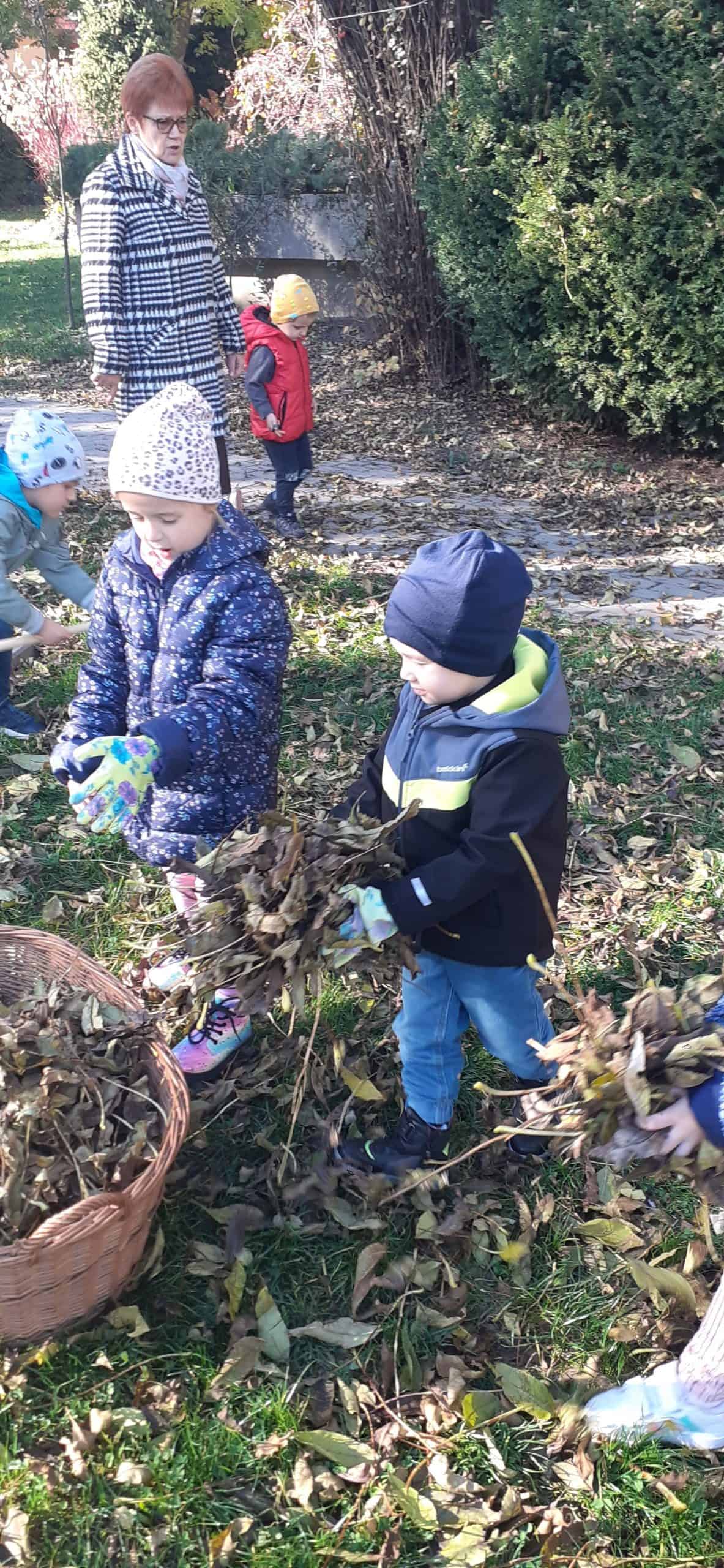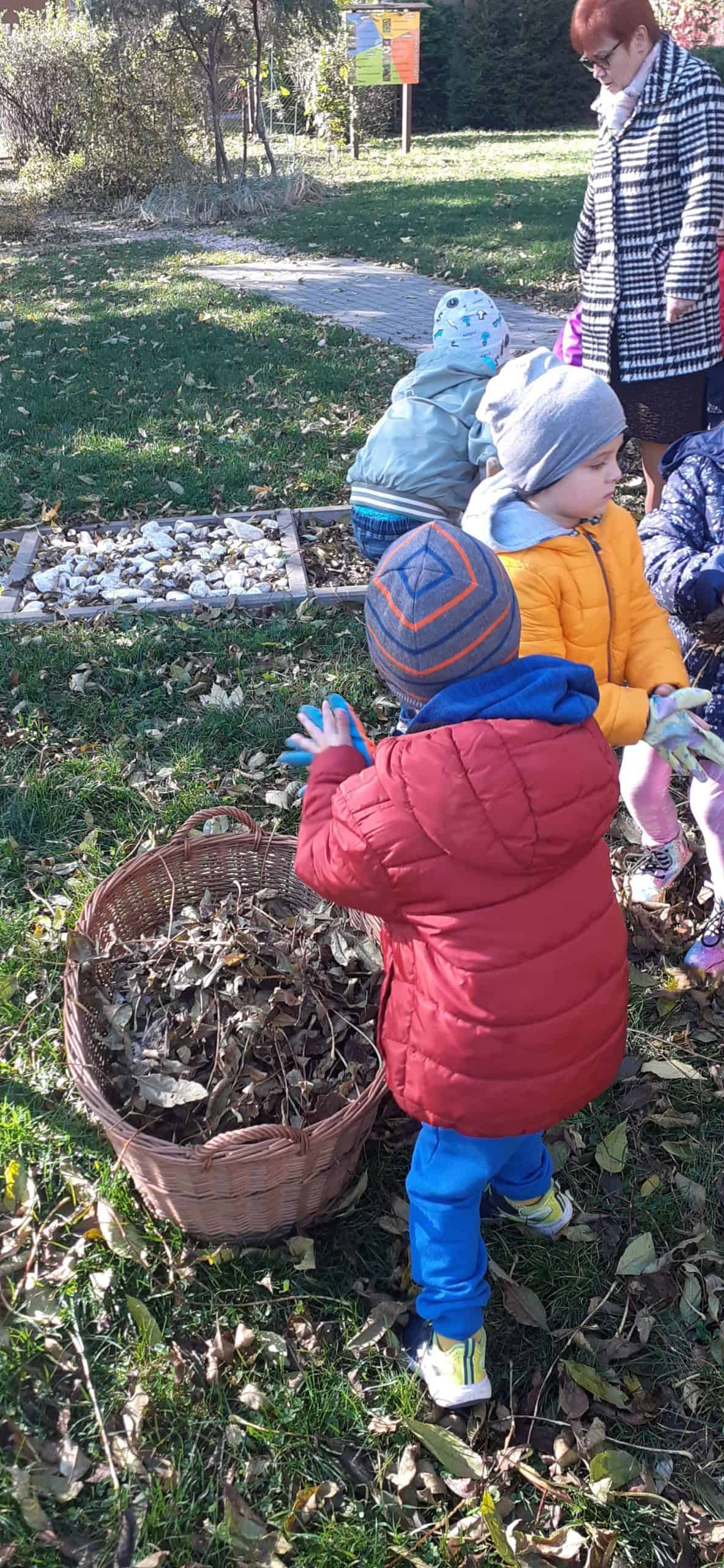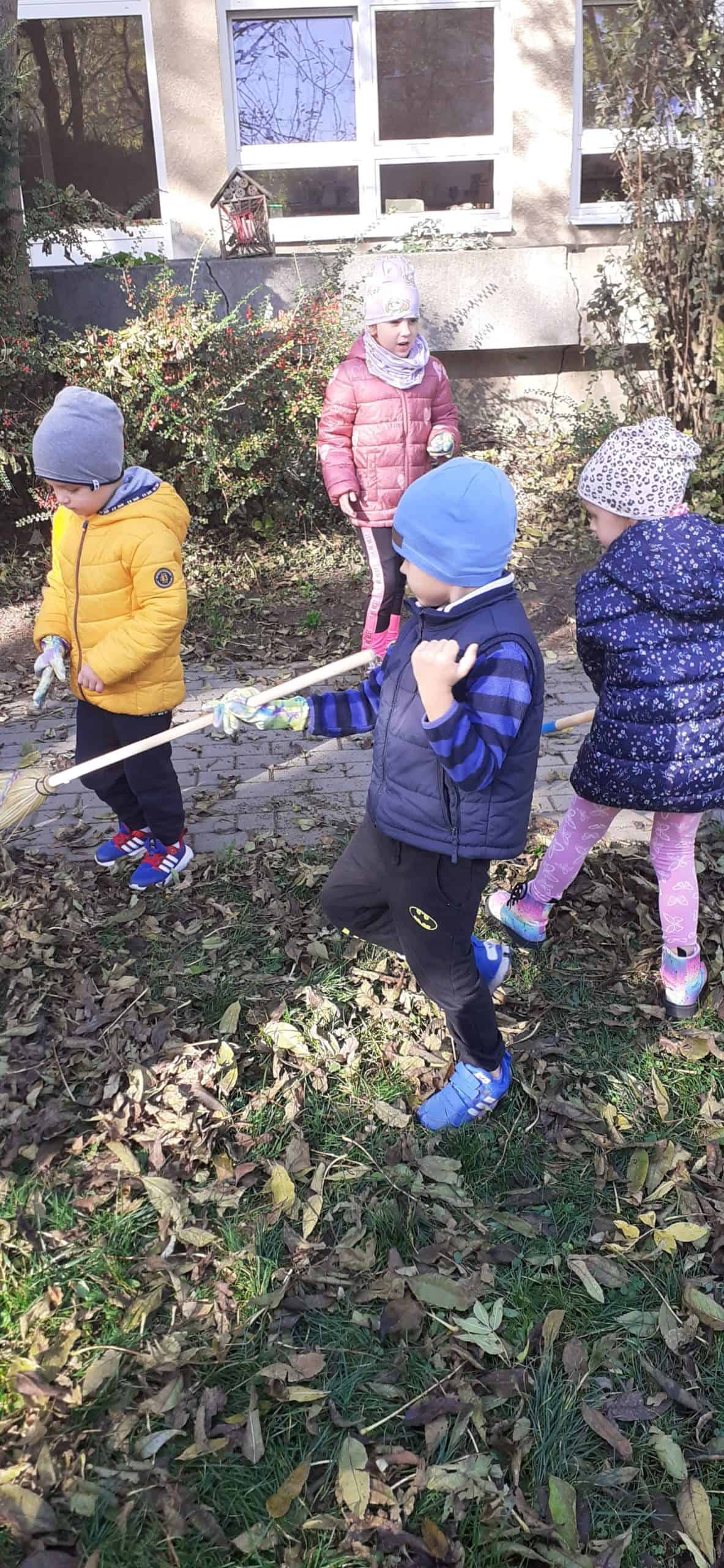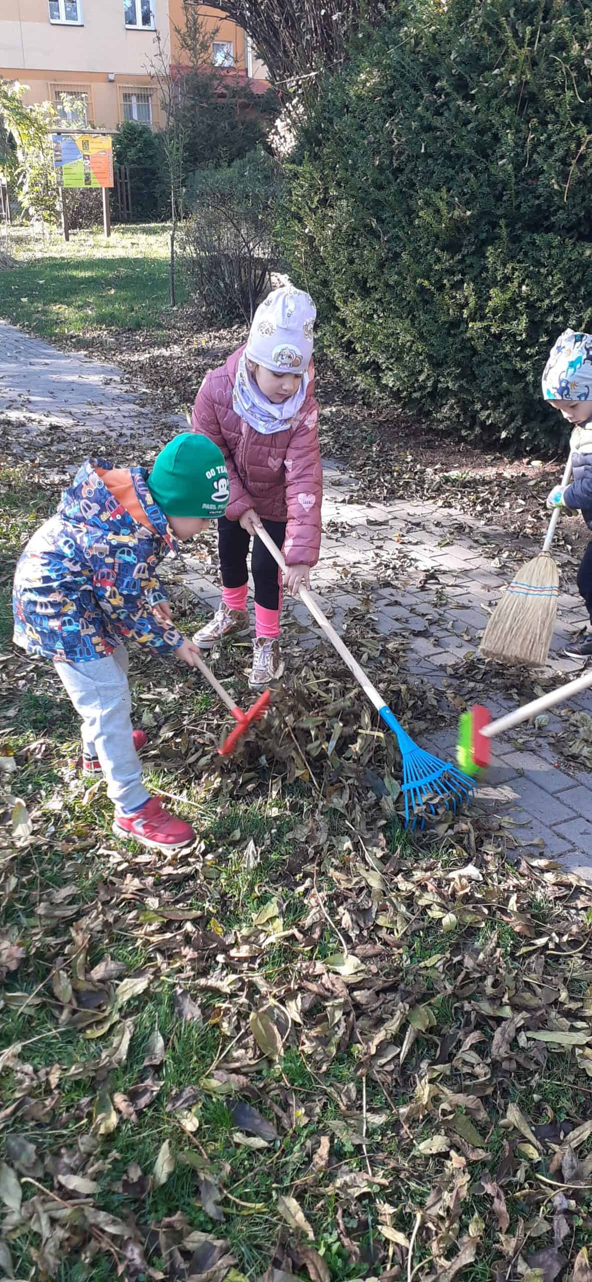 Nasze ostanie obserwacje przyrodnicze w ogrodzie przedszkolnym i na terenie przyrodniczej ścieżki edukacyjnej wyraźnie pokazały nam, że nadszedł czas jesiennych porządków w ogrodzie. Prace w ogrodzie zostały poprzedzone zajęciami odnoszącymi się do potrzeb roślin w okresie jesieni, kiedy to rośliny są już praktycznie w uśpieniu. Dzieci dowidziały się o podstawowych pracach jesiennych – koszenie trawnika, okrywanie delikatnych roślin włókniną, obwiązywanie sznurkiem rozłożystych roślin, przycinanie suchych i spróchniałych gałązek drzew i krzewów. Są to bardzo ważne zbiegi pielęgnacyjne, dzięki którym ogród bezpiecznie przetrwa zimę i będzie na nowo cieszył na wiosnę. Dzieci z ochotą zabrały się do pracy, a ich zadaniem było usunięcie suchych liści z trawnika. Ze skrzyni dzieci pobrały rękawice ochronne oraz niezbędne narzędzia ogrodnicze i do dzieła. W chwilę wiklinowy kosz zapełnił się zebranym przez dzieci listkami. Dzieci zrozumiały, że pomogły roślinom przygotować się do zimowego snu.