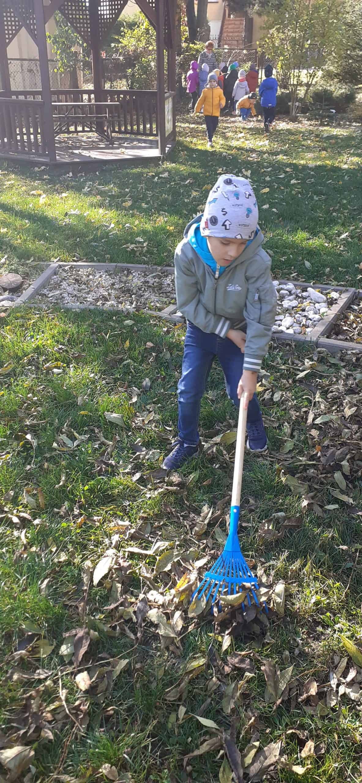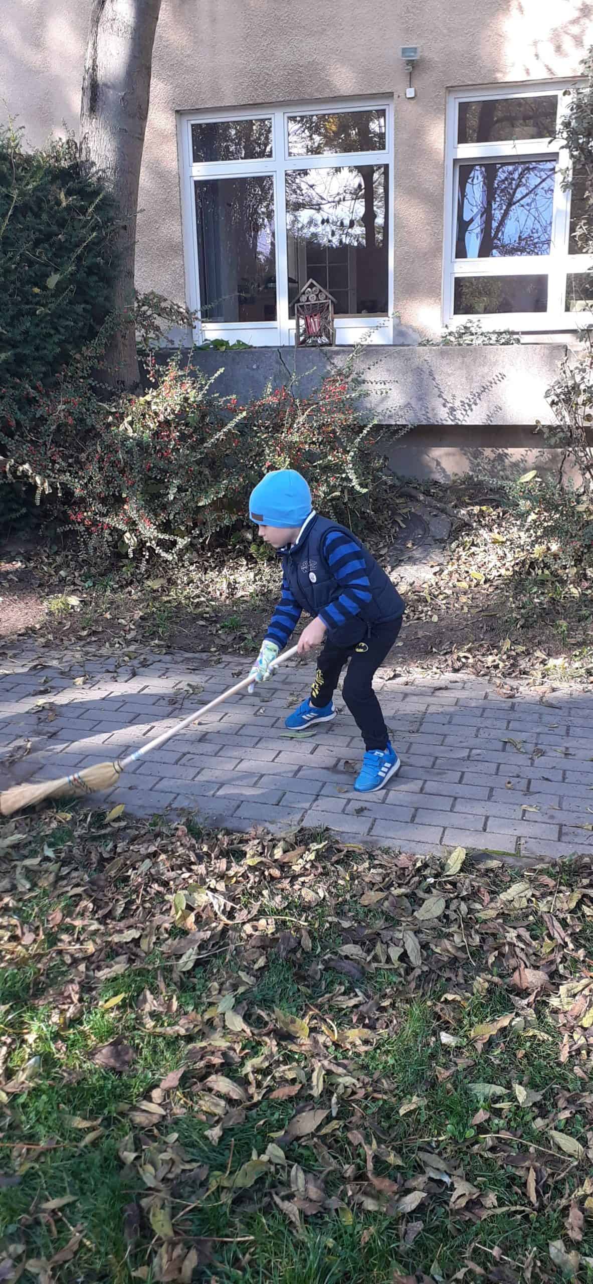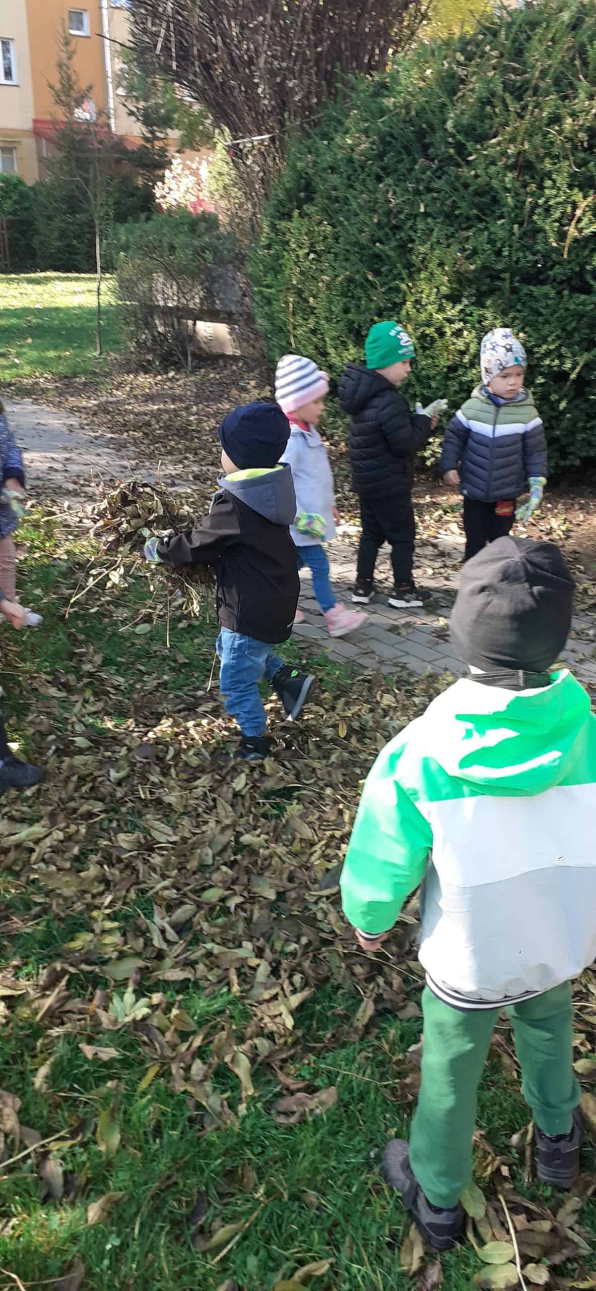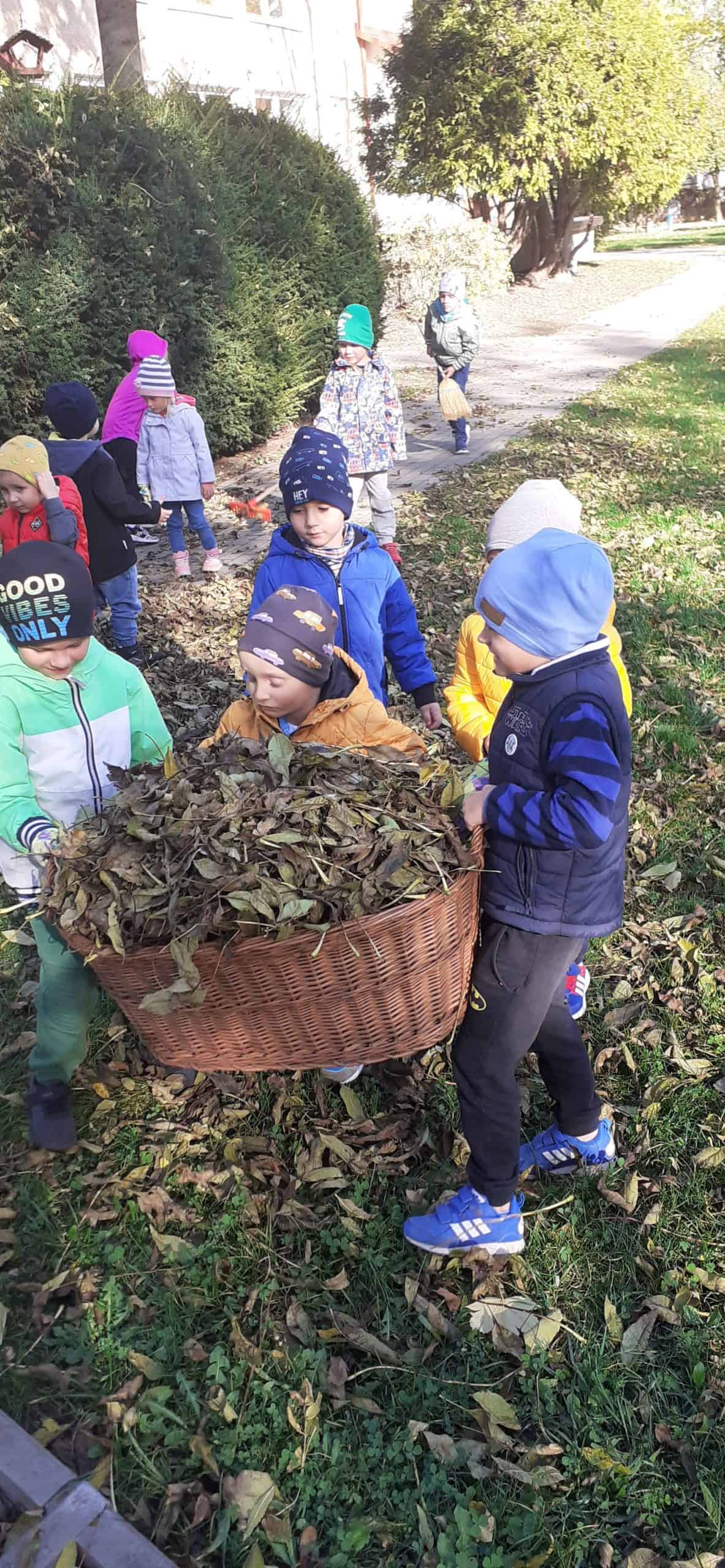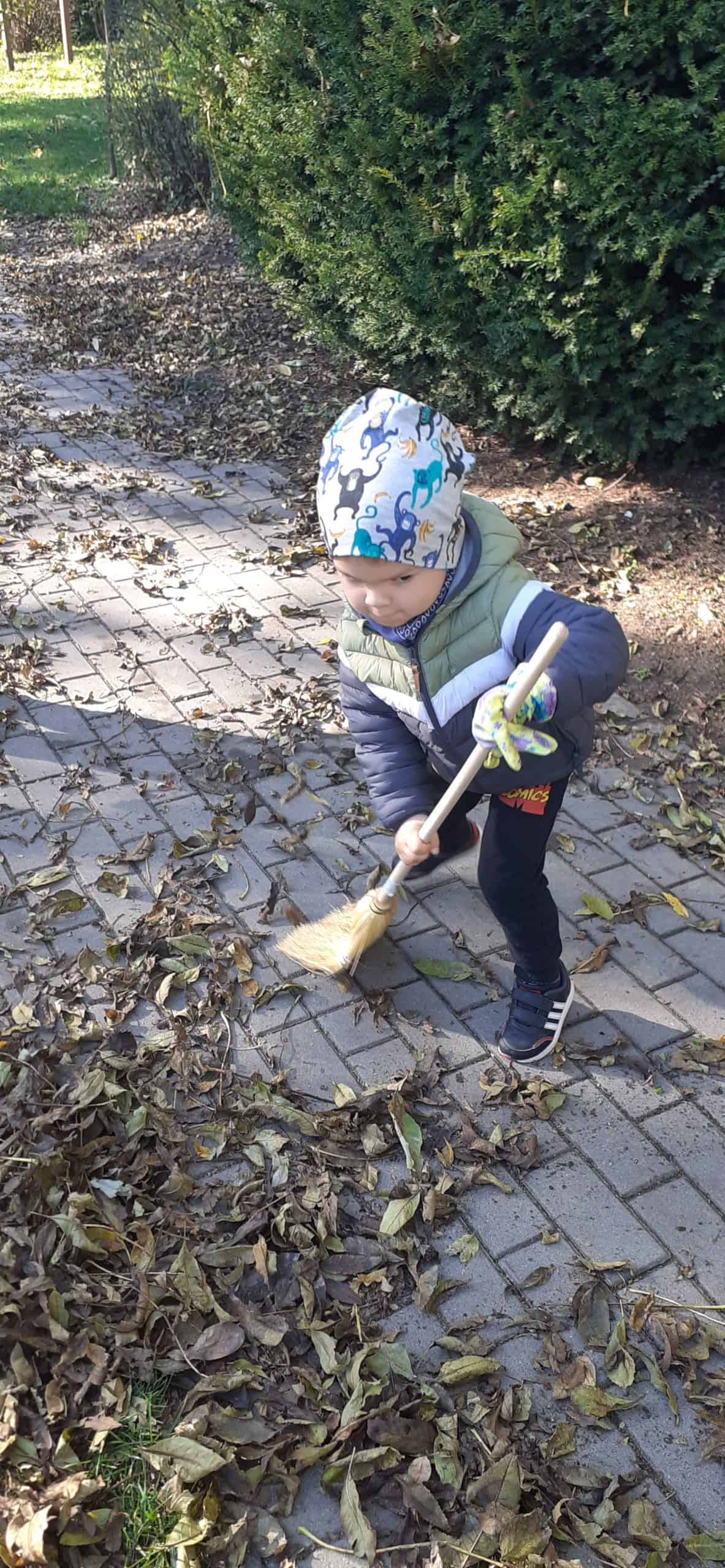 Nasze ostanie obserwacje przyrodnicze w ogrodzie przedszkolnym i na terenie przyrodniczej ścieżki edukacyjnej wyraźnie pokazały nam, że nadszedł czas jesiennych porządków w ogrodzie. Prace w ogrodzie zostały poprzedzone zajęciami odnoszącymi się do potrzeb roślin w okresie jesieni, kiedy to rośliny są już praktycznie w uśpieniu. Dzieci dowidziały się o podstawowych pracach jesiennych – koszenie trawnika, okrywanie delikatnych roślin włókniną, obwiązywanie sznurkiem rozłożystych roślin, przycinanie suchych i spróchniałych gałązek drzew i krzewów. Są to bardzo ważne zbiegi pielęgnacyjne, dzięki którym ogród bezpiecznie przetrwa zimę i będzie na nowo cieszył na wiosnę. Dzieci z ochotą zabrały się do pracy, a ich zadaniem było usunięcie suchych liści z trawnika. Ze skrzyni dzieci pobrały rękawice ochronne oraz niezbędne narzędzia ogrodnicze i do dzieła. W chwilę wiklinowy kosz zapełnił się zebranym przez dzieci listkami. Dzieci zrozumiały, że pomogły roślinom przygotować się do zimowego snu.