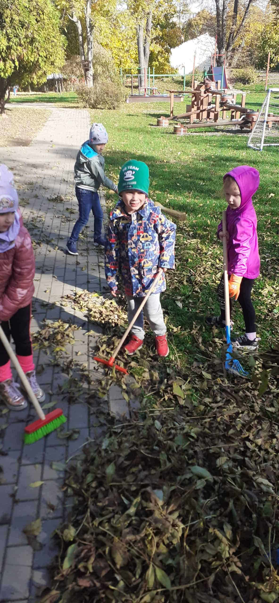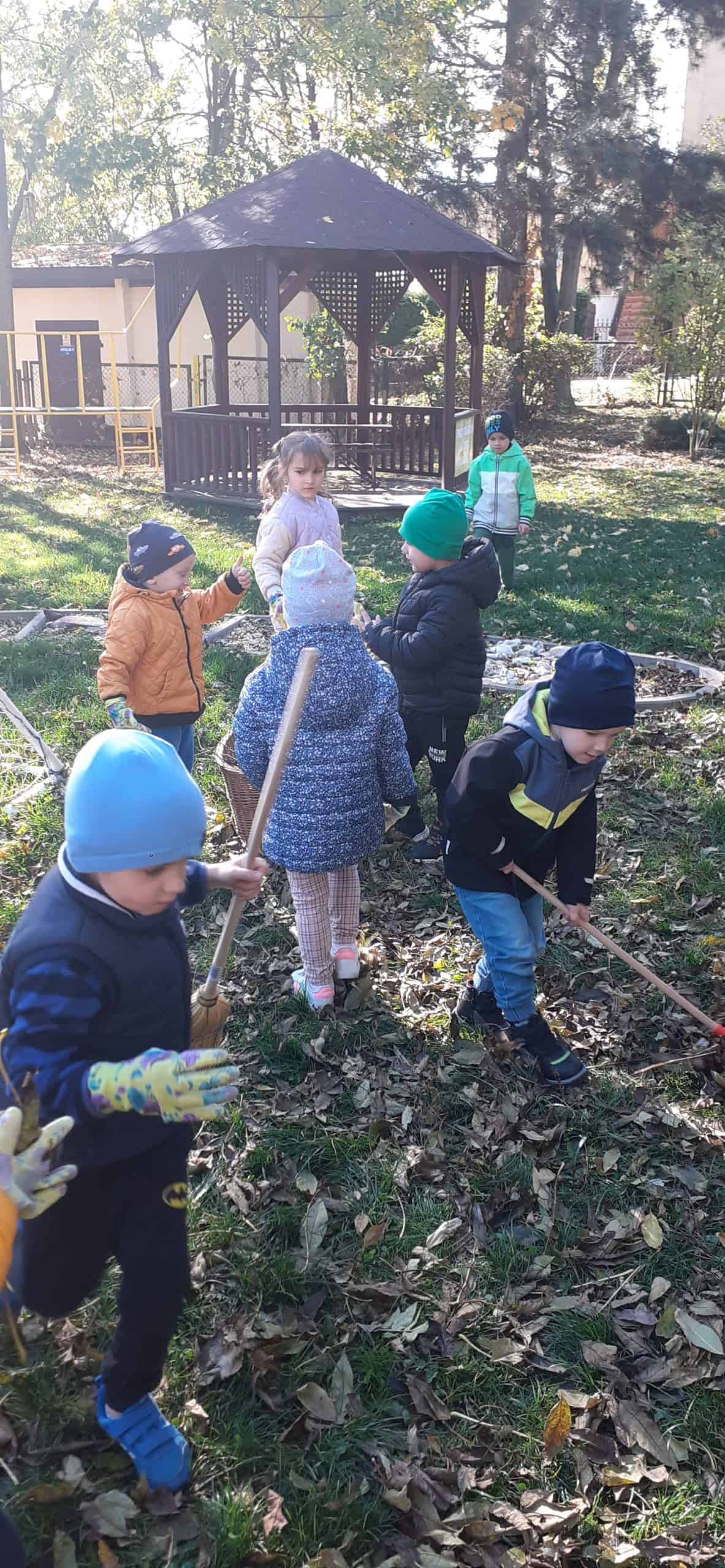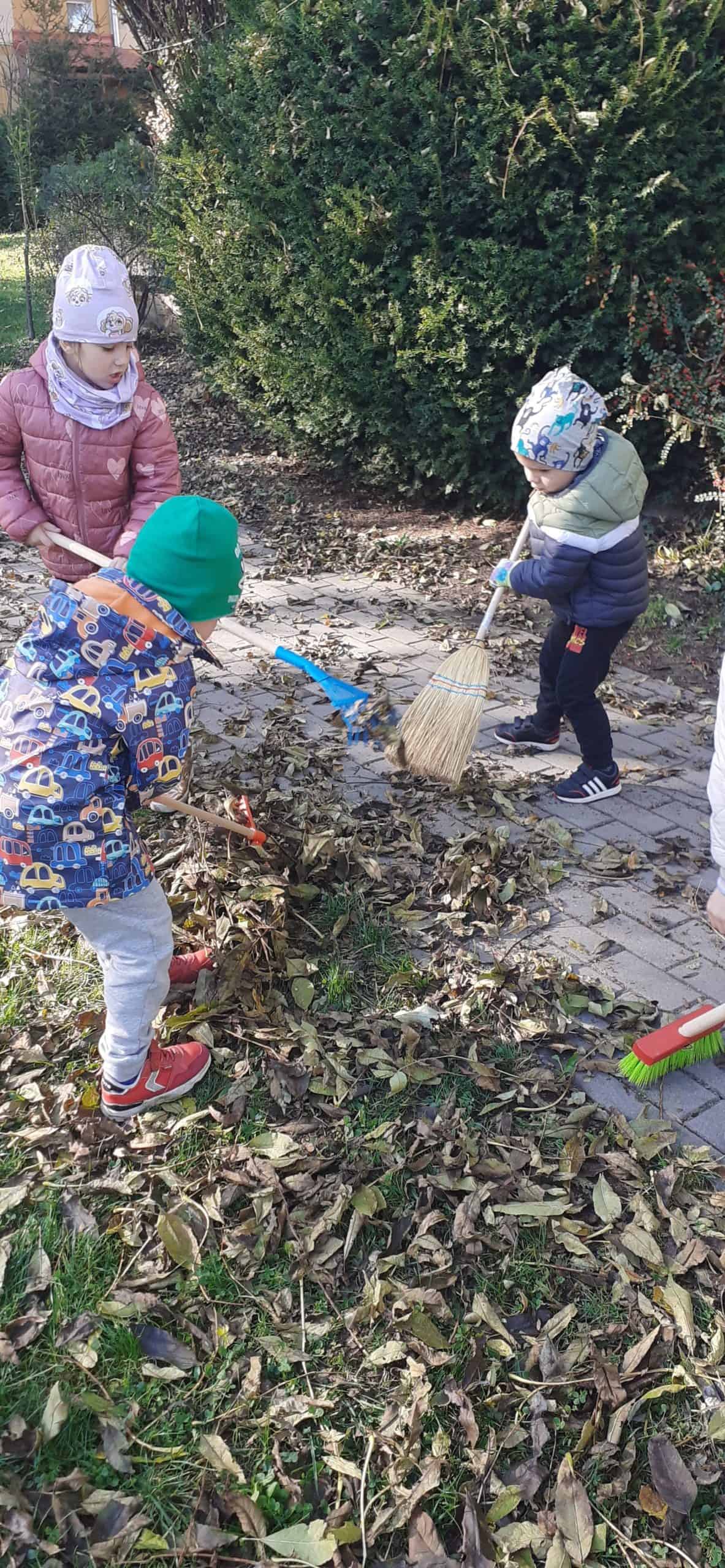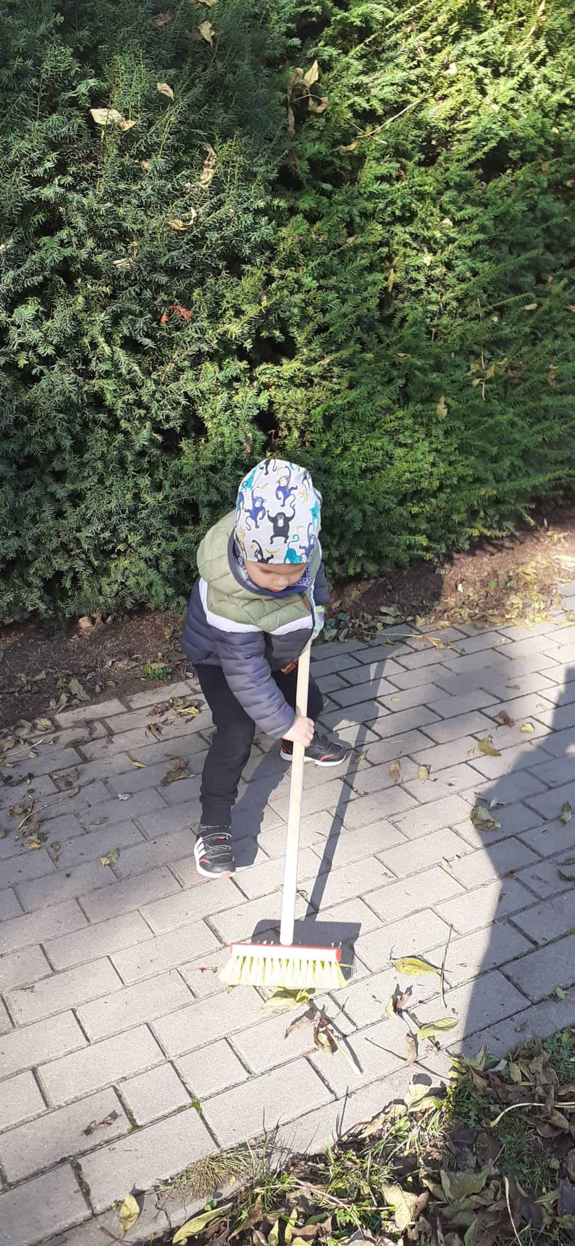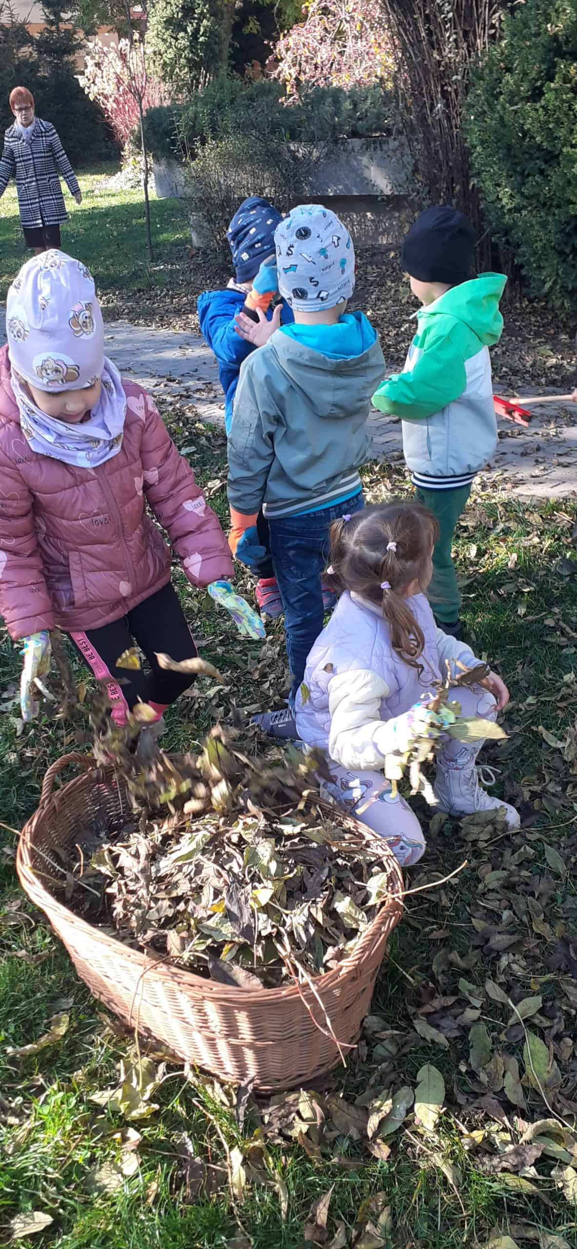 Nasze ostanie obserwacje przyrodnicze w ogrodzie przedszkolnym i na terenie przyrodniczej ścieżki edukacyjnej wyraźnie pokazały nam, że nadszedł czas jesiennych porządków w ogrodzie. Prace w ogrodzie zostały poprzedzone zajęciami odnoszącymi się do potrzeb roślin w okresie jesieni, kiedy to rośliny są już praktycznie w uśpieniu. Dzieci dowidziały się o podstawowych pracach jesiennych – koszenie trawnika, okrywanie delikatnych roślin włókniną, obwiązywanie sznurkiem rozłożystych roślin, przycinanie suchych i spróchniałych gałązek drzew i krzewów. Są to bardzo ważne zbiegi pielęgnacyjne, dzięki którym ogród bezpiecznie przetrwa zimę i będzie na nowo cieszył na wiosnę. Dzieci z ochotą zabrały się do pracy, a ich zadaniem było usunięcie suchych liści z trawnika. Ze skrzyni dzieci pobrały rękawice ochronne oraz niezbędne narzędzia ogrodnicze i do dzieła. W chwilę wiklinowy kosz zapełnił się zebranym przez dzieci listkami. Dzieci zrozumiały, że pomogły roślinom przygotować się do zimowego snu.