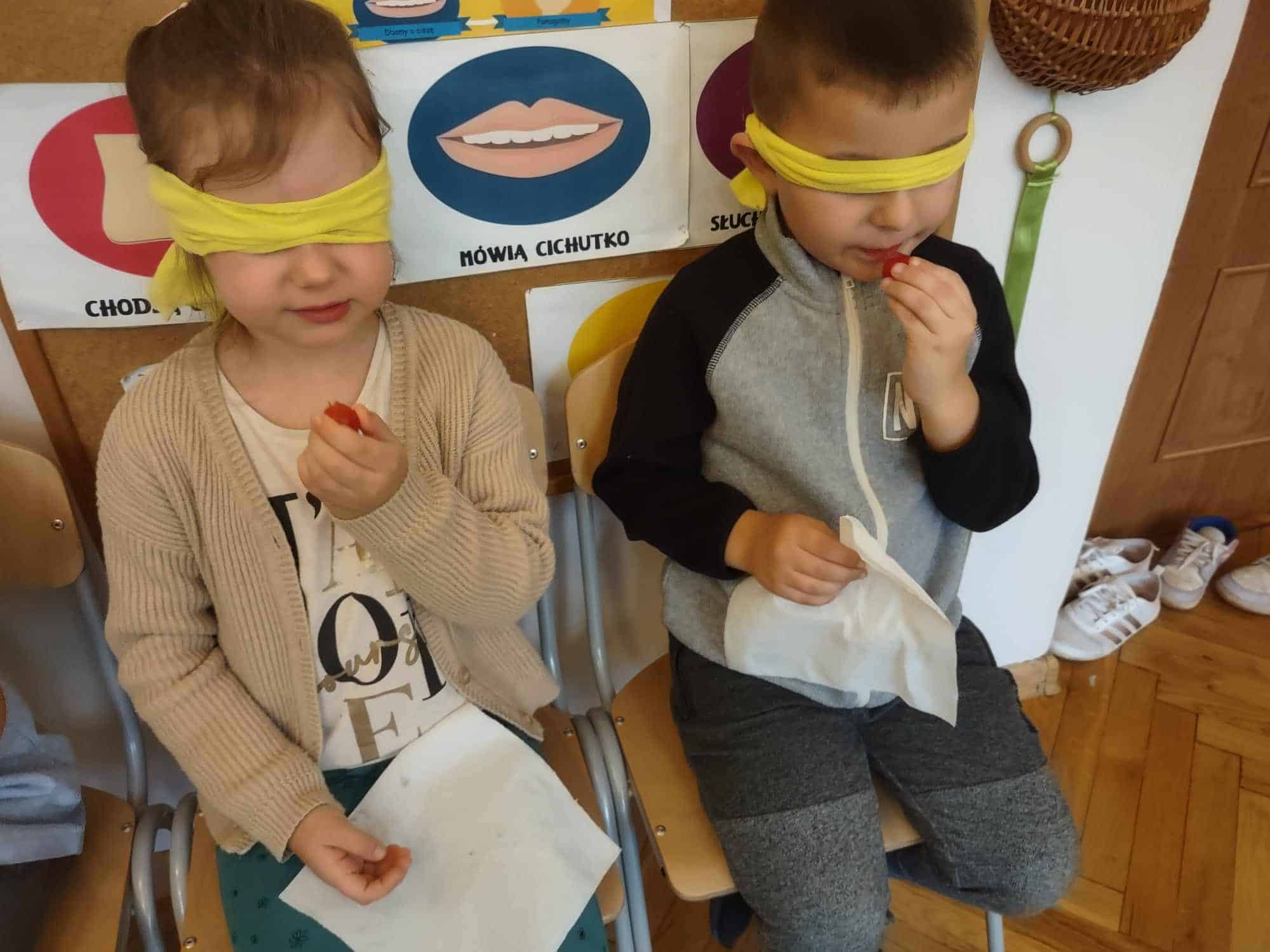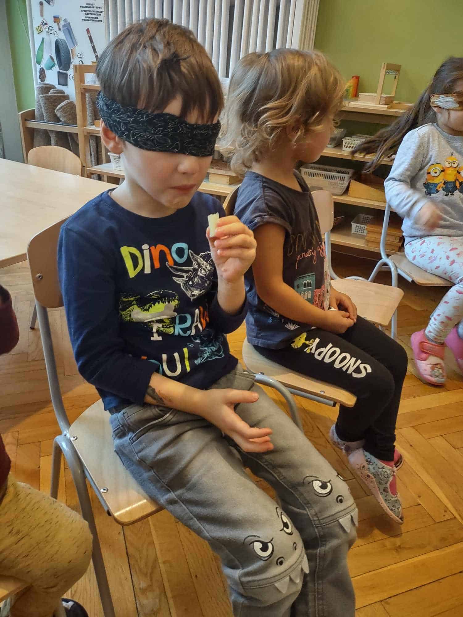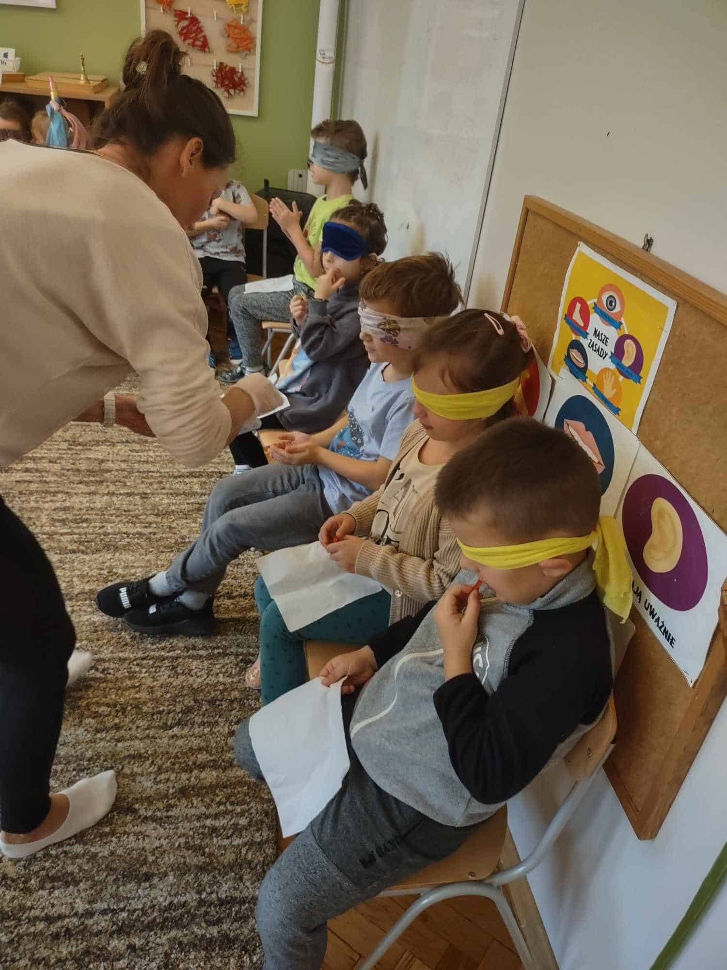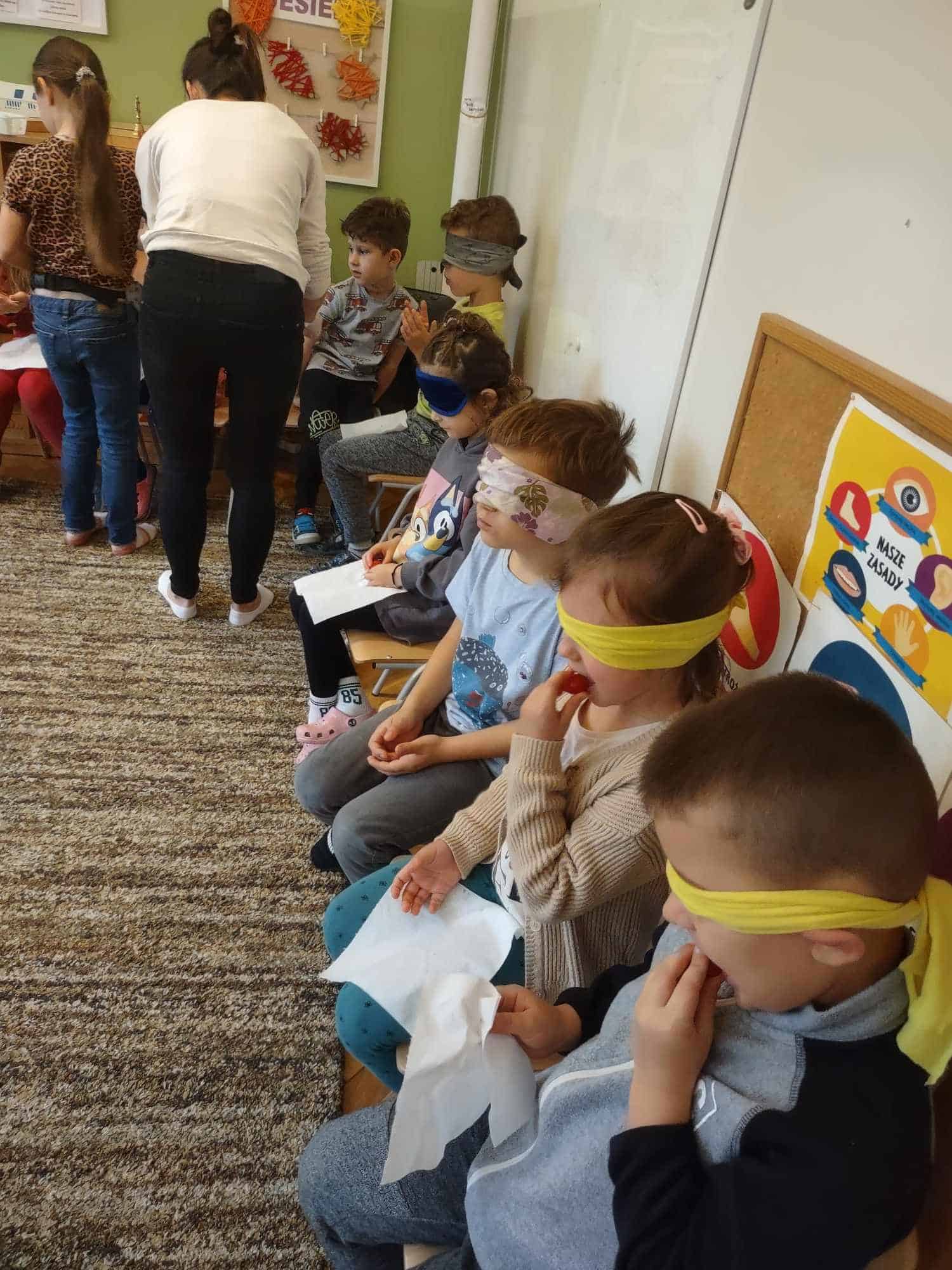 Na początku zajęć, Pani Madzia wprowadziła dzieci w świat owoców i warzyw. Dzieci odgadywały ich nazw, dzieliły na kategorie. To zadanie nie należało wcale do najłatwiejszych, gdyż w przygotowanych przez Panią Madzię zbiorach owoców i warzyw znajdowały się takie, które były dzieciom całkowicie nieznane (bataty, granat, melon czy mango), ale była to doskonała okazja, aby rozszerzyć wiedzę z tego zakresu ☺️ Po części teoretycznej przeszliśmy do działań praktycznych. Tutaj dzieci zamieniły się w prawdziwych detektywów i próbowały rozwikłać zagadki z kategorii „odgadujemy nazwy owoców i warzyw po ich smaku i zapachu”. Do tego zadania miały dzieciom posłużyć ich nosy, język i dłonie. Z doświadczania zostały wyłączone oczy, bo na tym właśnie miała polegać cała trudność naszych detektywów. Dzieci z przepasanymi chustką oczami, smakowały poszczególnych warzyw i owoców i odgadywały ich nazwy. Byli wśród nas tacy dzielni detektywi, którzy przeszli wszystkie 10 rund i za to ogromne brawa dla Was kochane przedszkolaki 👏👏👏