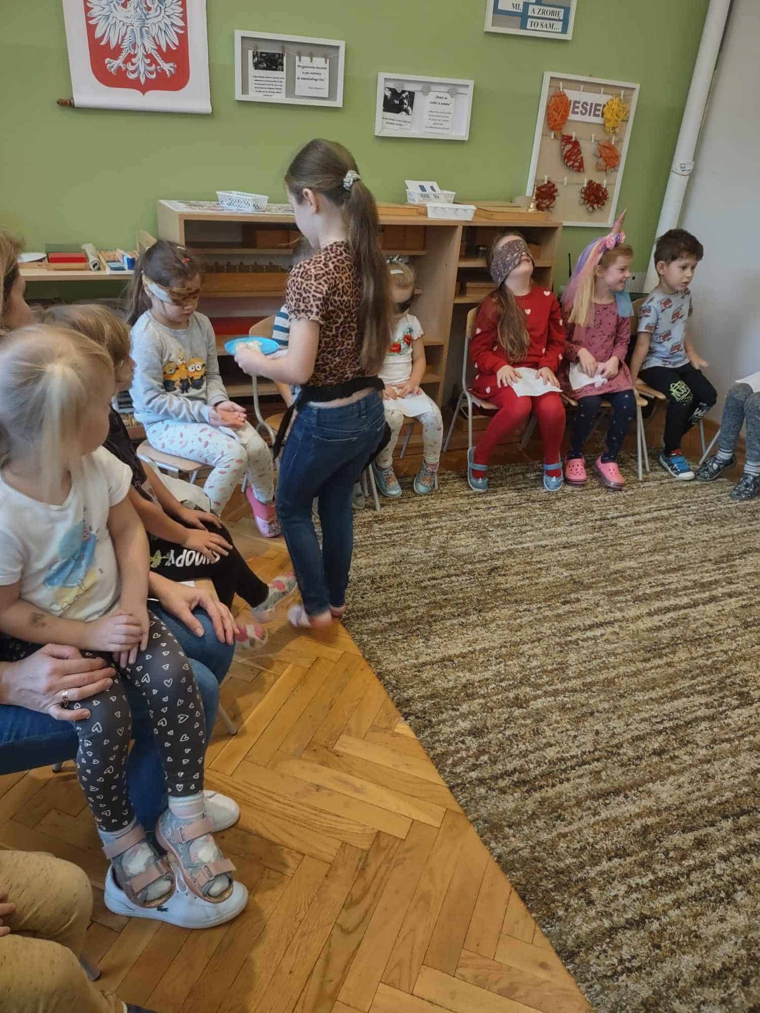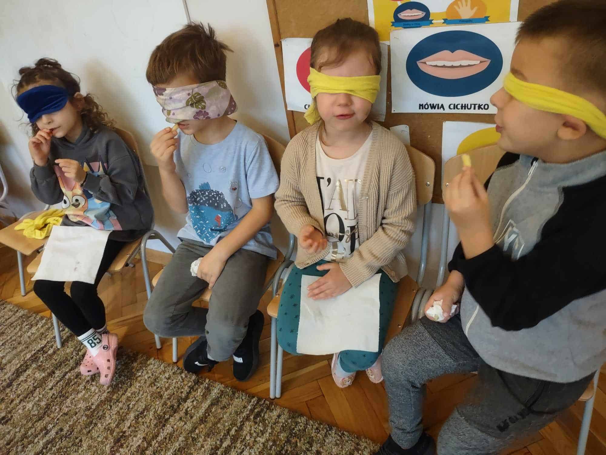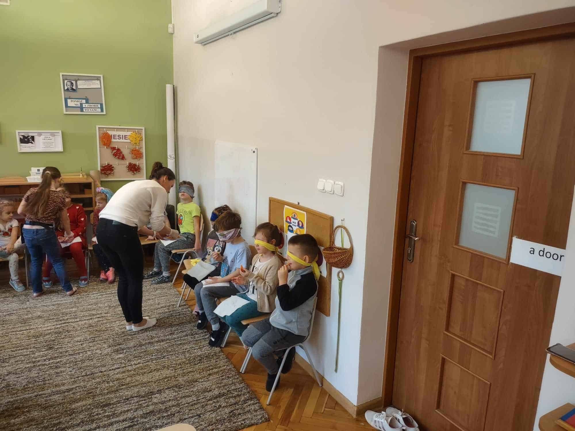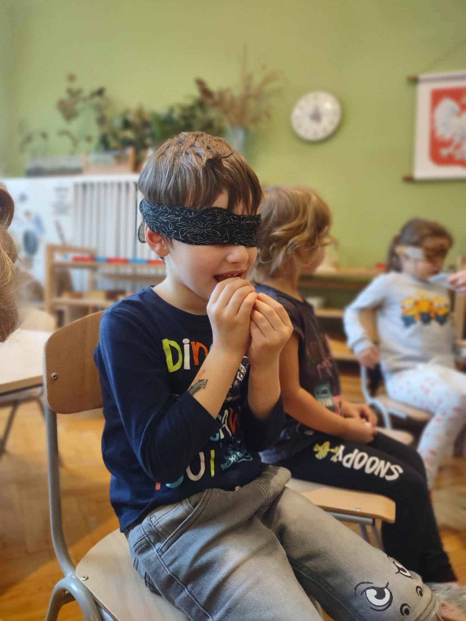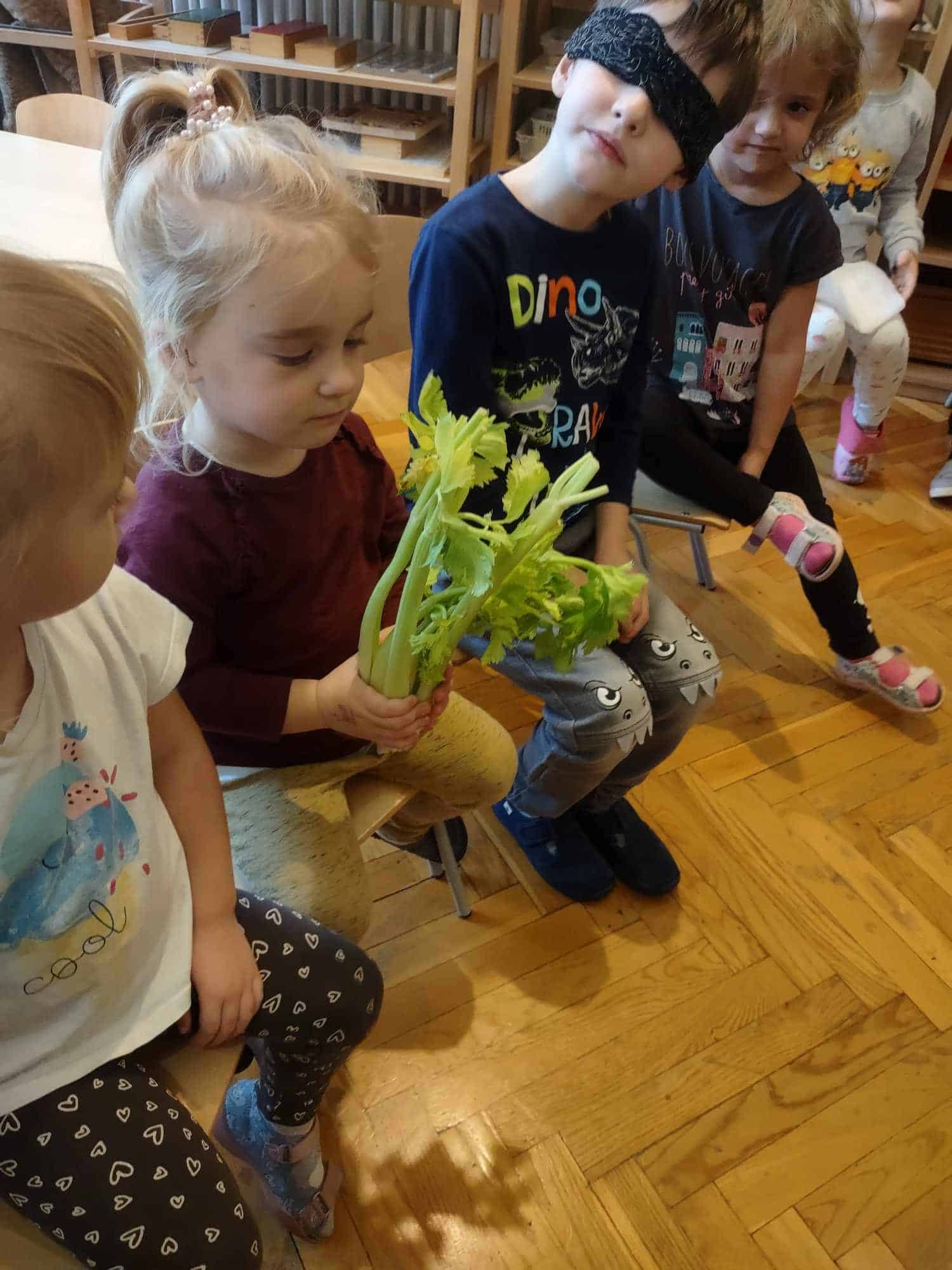 Na początku zajęć, Pani Madzia wprowadziła dzieci w świat owoców i warzyw. Dzieci odgadywały ich nazw, dzieliły na kategorie. To zadanie nie należało wcale do najłatwiejszych, gdyż w przygotowanych przez Panią Madzię zbiorach owoców i warzyw znajdowały się takie, które były dzieciom całkowicie nieznane (bataty, granat, melon czy mango), ale była to doskonała okazja, aby rozszerzyć wiedzę z tego zakresu ☺️ Po części teoretycznej przeszliśmy do działań praktycznych. Tutaj dzieci zamieniły się w prawdziwych detektywów i próbowały rozwikłać zagadki z kategorii „odgadujemy nazwy owoców i warzyw po ich smaku i zapachu”. Do tego zadania miały dzieciom posłużyć ich nosy, język i dłonie. Z doświadczania zostały wyłączone oczy, bo na tym właśnie miała polegać cała trudność naszych detektywów. Dzieci z przepasanymi chustką oczami, smakowały poszczególnych warzyw i owoców i odgadywały ich nazwy. Byli wśród nas tacy dzielni detektywi, którzy przeszli wszystkie 10 rund i za to ogromne brawa dla Was kochane przedszkolaki 👏👏👏