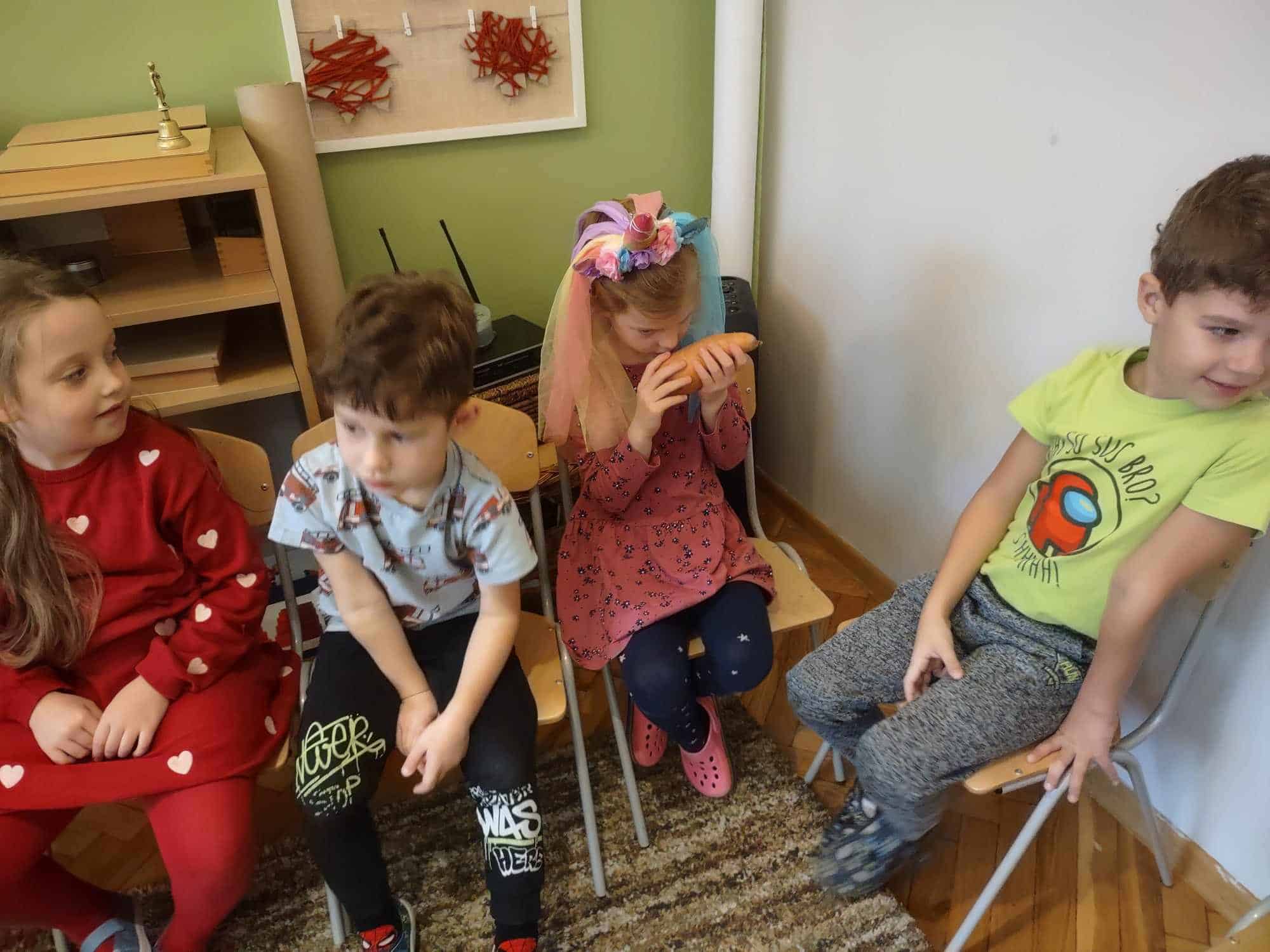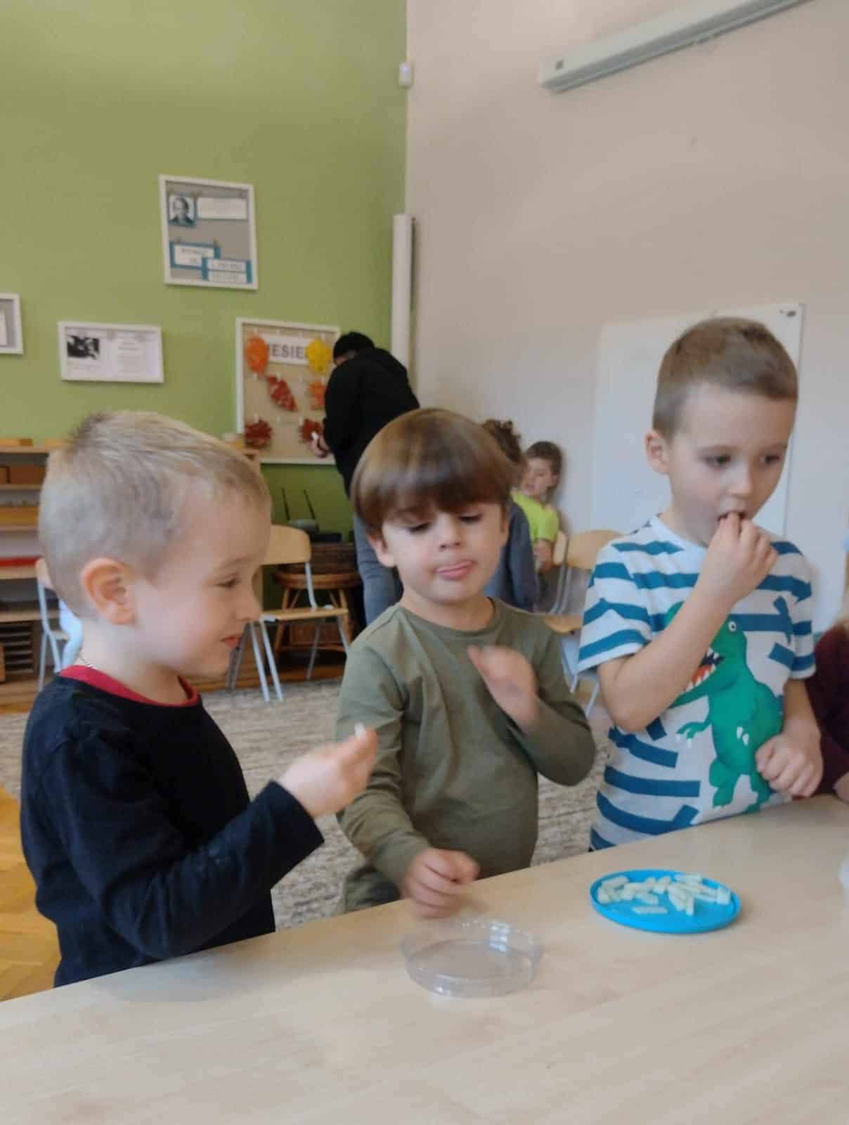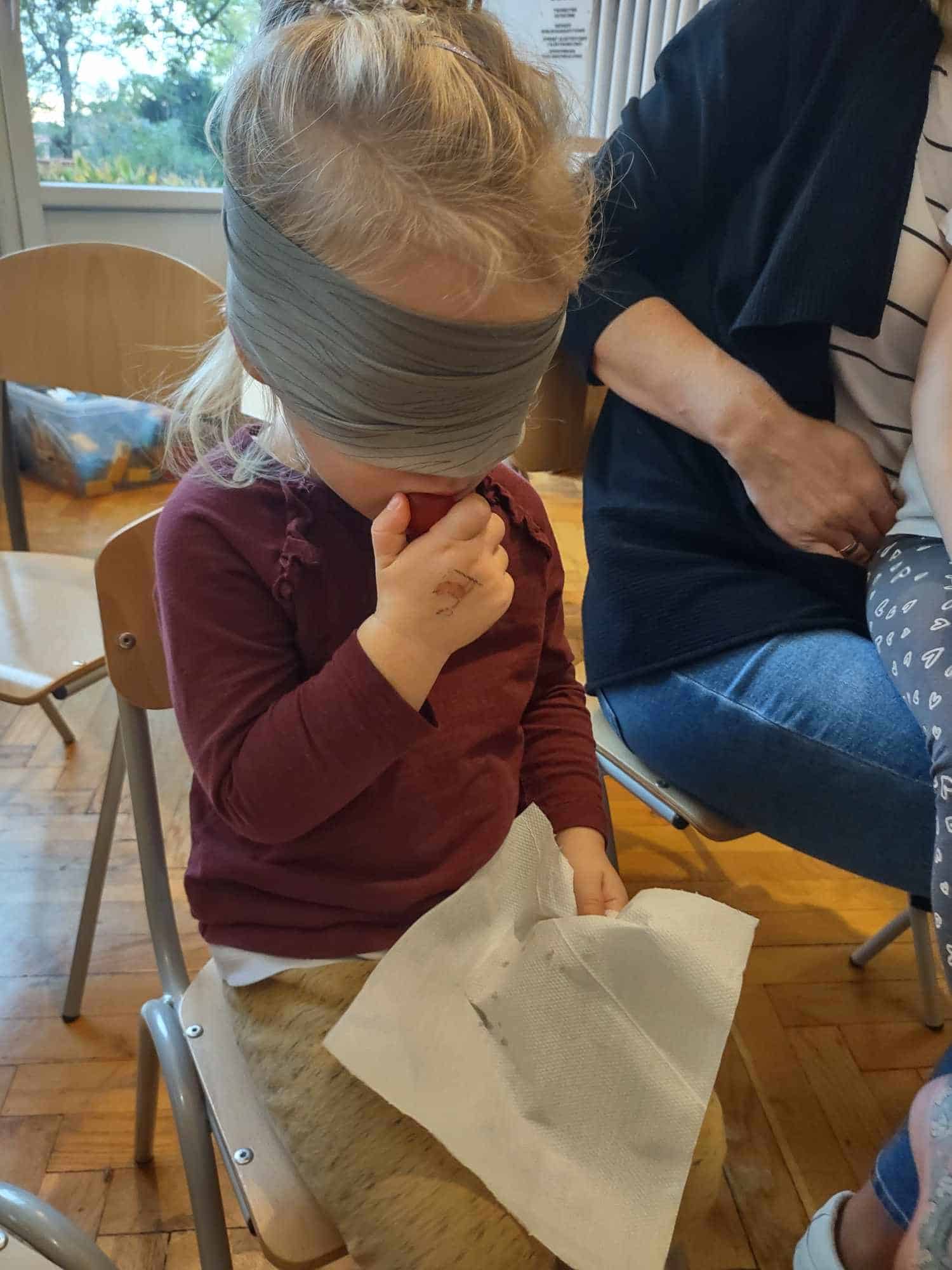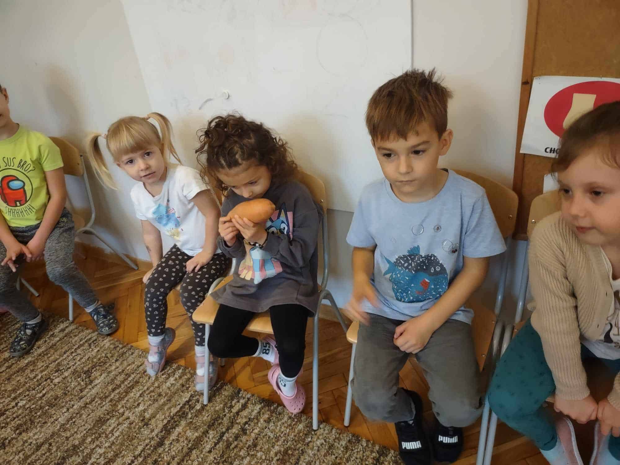 Na początku zajęć, Pani Madzia wprowadziła dzieci w świat owoców i warzyw. Dzieci odgadywały ich nazw, dzieliły na kategorie. To zadanie nie należało wcale do najłatwiejszych, gdyż w przygotowanych przez Panią Madzię zbiorach owoców i warzyw znajdowały się takie, które były dzieciom całkowicie nieznane (bataty, granat, melon czy mango), ale była to doskonała okazja, aby rozszerzyć wiedzę z tego zakresu ☺️ Po części teoretycznej przeszliśmy do działań praktycznych. Tutaj dzieci zamieniły się w prawdziwych detektywów i próbowały rozwikłać zagadki z kategorii „odgadujemy nazwy owoców i warzyw po ich smaku i zapachu”. Do tego zadania miały dzieciom posłużyć ich nosy, język i dłonie. Z doświadczania zostały wyłączone oczy, bo na tym właśnie miała polegać cała trudność naszych detektywów. Dzieci z przepasanymi chustką oczami, smakowały poszczególnych warzyw i owoców i odgadywały ich nazwy. Byli wśród nas tacy dzielni detektywi, którzy przeszli wszystkie 10 rund i za to ogromne brawa dla Was kochane przedszkolaki 👏👏👏