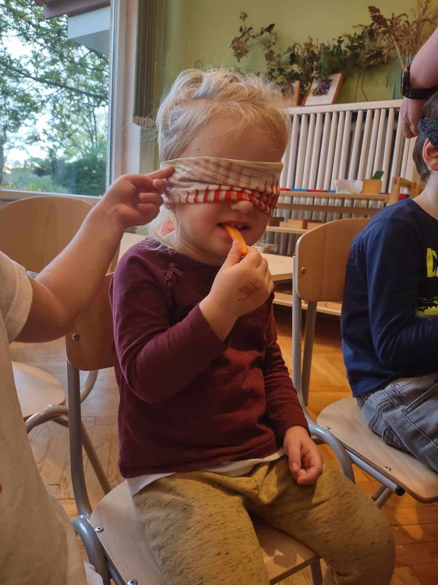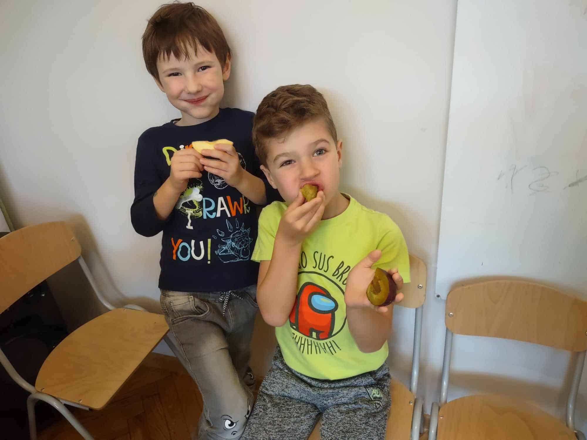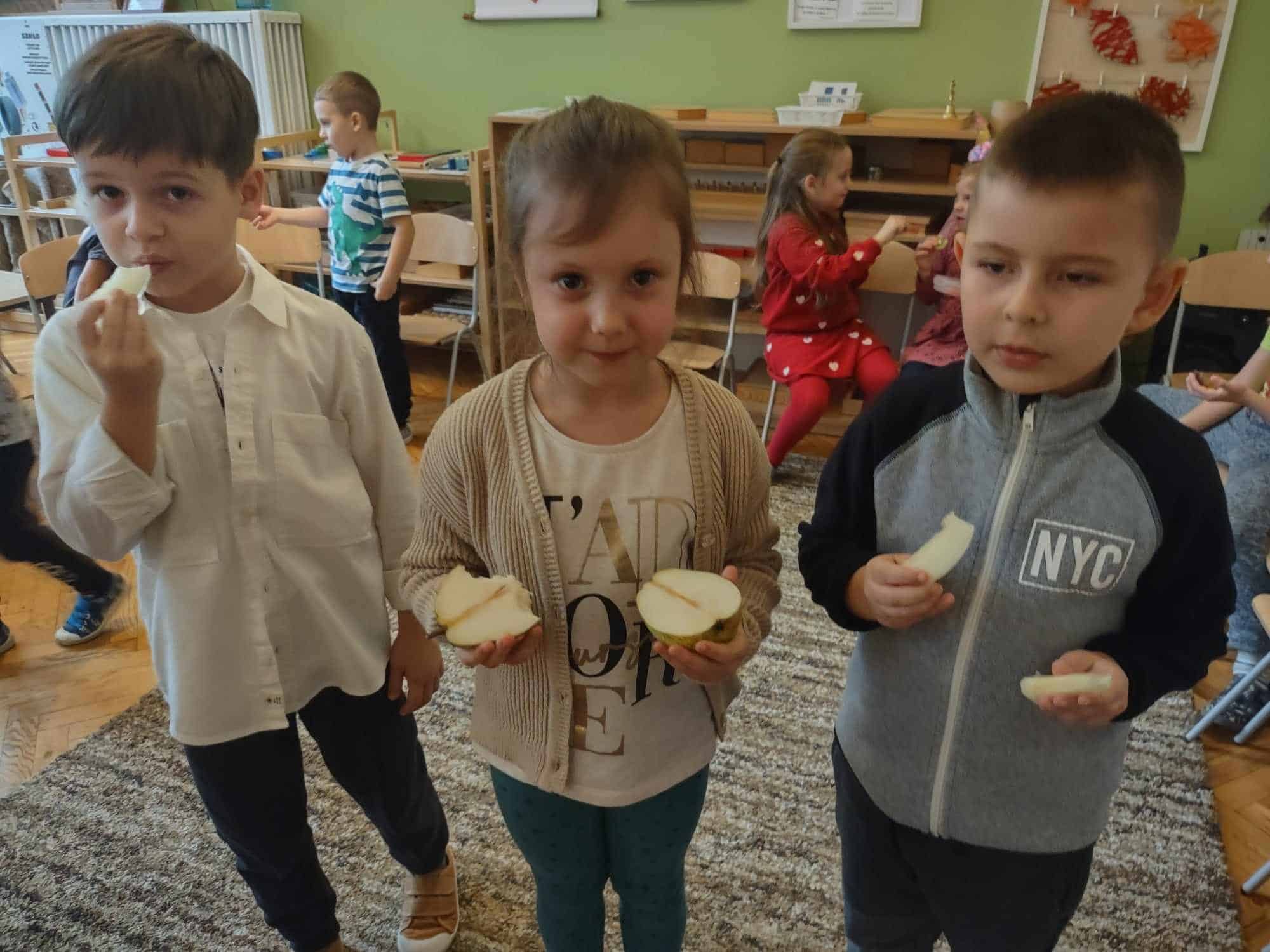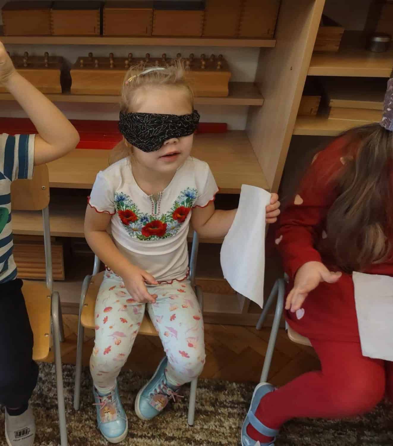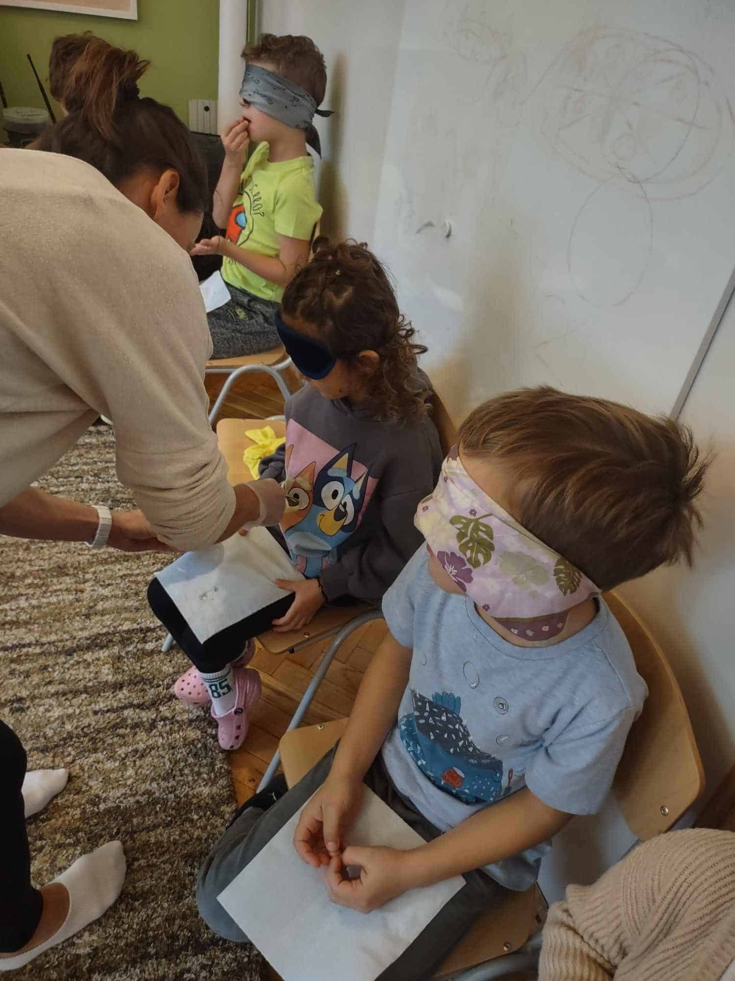 Na początku zajęć, Pani Madzia wprowadziła dzieci w świat owoców i warzyw. Dzieci odgadywały ich nazw, dzieliły na kategorie. To zadanie nie należało wcale do najłatwiejszych, gdyż w przygotowanych przez Panią Madzię zbiorach owoców i warzyw znajdowały się takie, które były dzieciom całkowicie nieznane (bataty, granat, melon czy mango), ale była to doskonała okazja, aby rozszerzyć wiedzę z tego zakresu ☺️ Po części teoretycznej przeszliśmy do działań praktycznych. Tutaj dzieci zamieniły się w prawdziwych detektywów i próbowały rozwikłać zagadki z kategorii „odgadujemy nazwy owoców i warzyw po ich smaku i zapachu”. Do tego zadania miały dzieciom posłużyć ich nosy, język i dłonie. Z doświadczania zostały wyłączone oczy, bo na tym właśnie miała polegać cała trudność naszych detektywów. Dzieci z przepasanymi chustką oczami, smakowały poszczególnych warzyw i owoców i odgadywały ich nazwy. Byli wśród nas tacy dzielni detektywi, którzy przeszli wszystkie 10 rund i za to ogromne brawa dla Was kochane przedszkolaki 👏👏👏