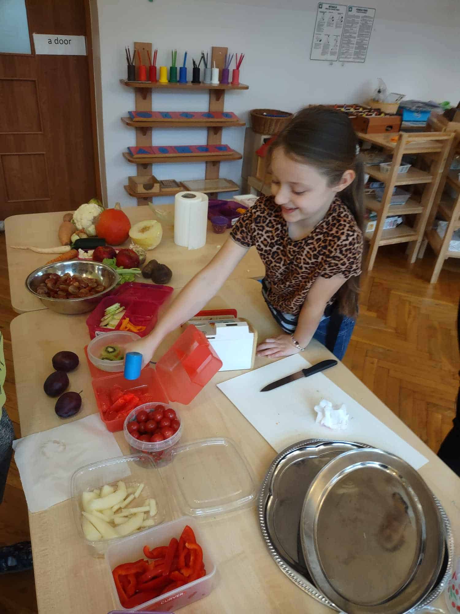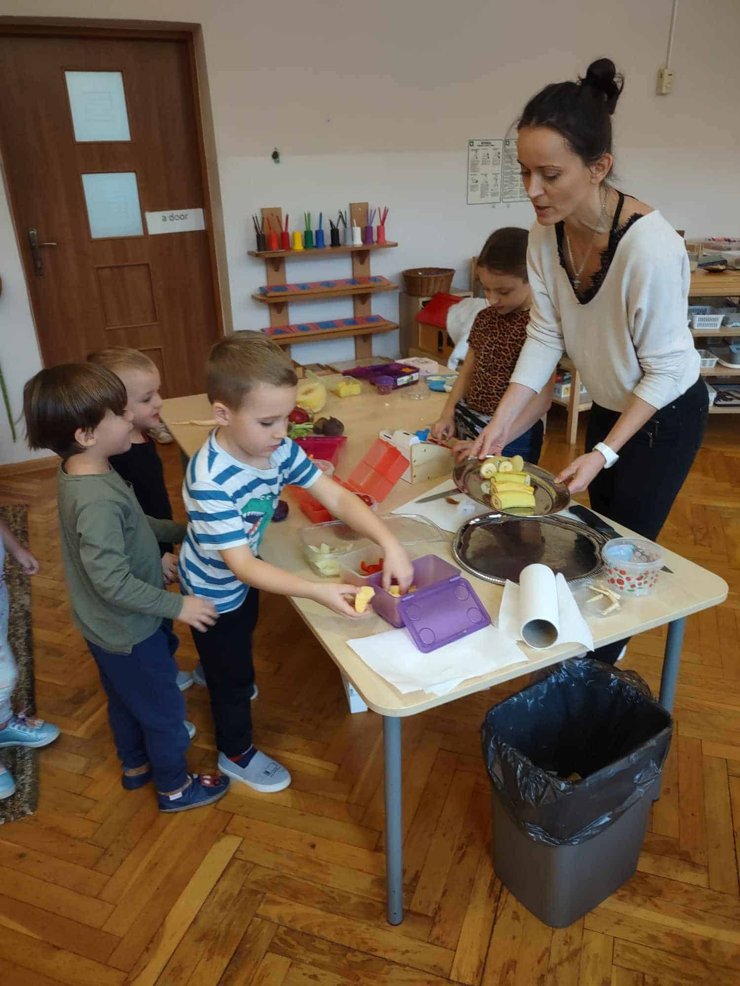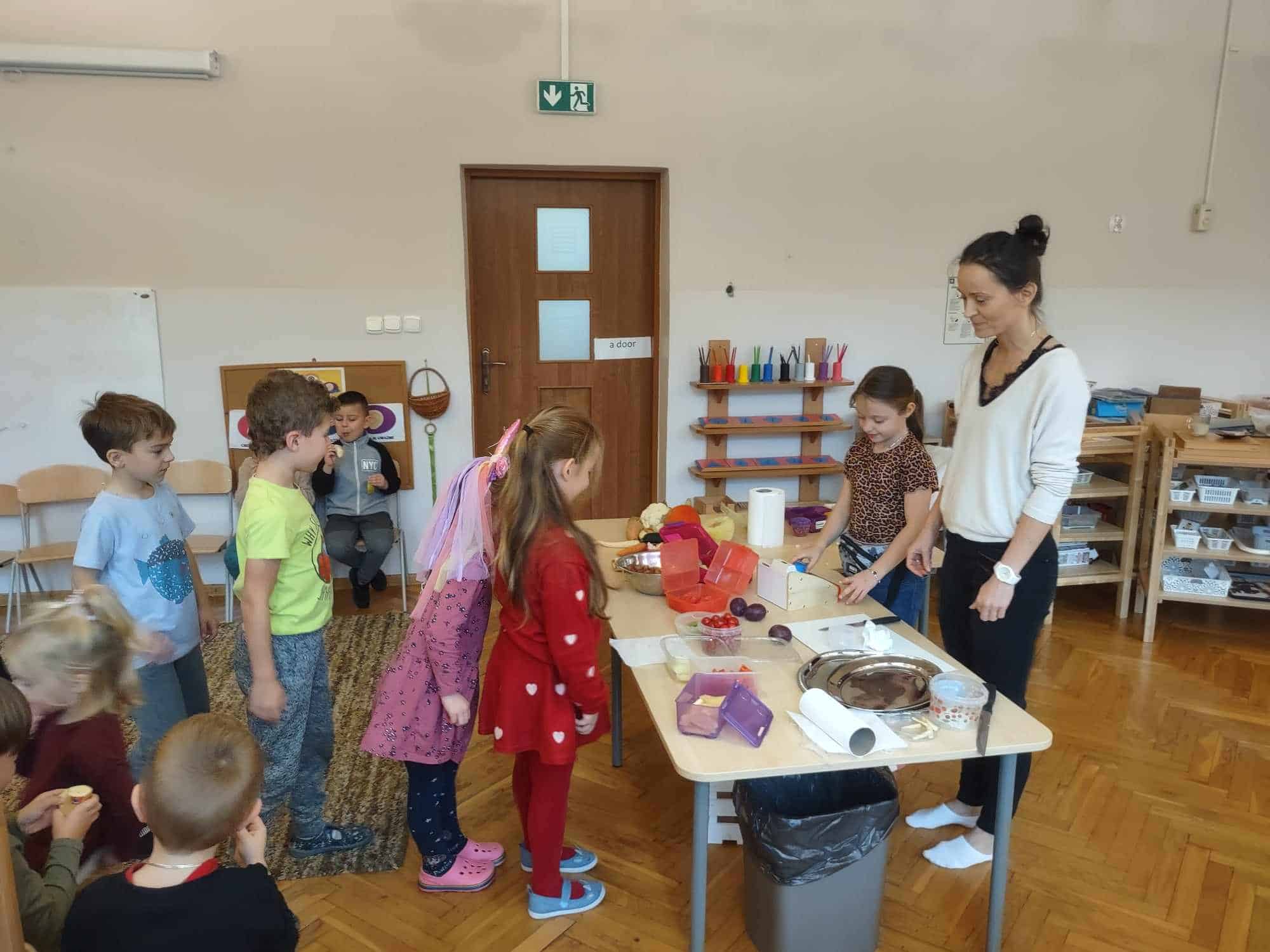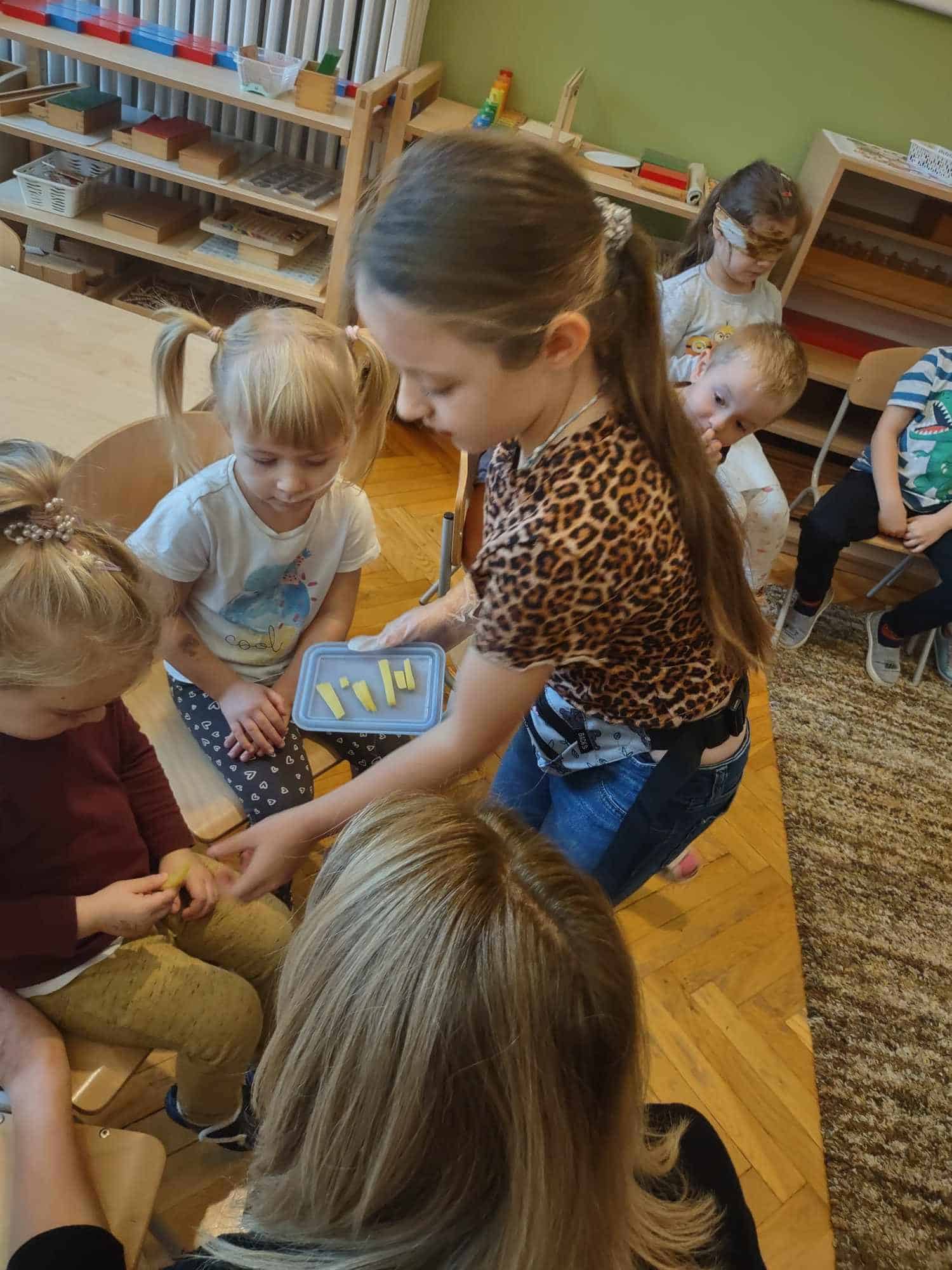 Na początku zajęć, Pani Madzia wprowadziła dzieci w świat owoców i warzyw. Dzieci odgadywały ich nazw, dzieliły na kategorie. To zadanie nie należało wcale do najłatwiejszych, gdyż w przygotowanych przez Panią Madzię zbiorach owoców i warzyw znajdowały się takie, które były dzieciom całkowicie nieznane (bataty, granat, melon czy mango), ale była to doskonała okazja, aby rozszerzyć wiedzę z tego zakresu ☺️ Po części teoretycznej przeszliśmy do działań praktycznych. Tutaj dzieci zamieniły się w prawdziwych detektywów i próbowały rozwikłać zagadki z kategorii „odgadujemy nazwy owoców i warzyw po ich smaku i zapachu”. Do tego zadania miały dzieciom posłużyć ich nosy, język i dłonie. Z doświadczania zostały wyłączone oczy, bo na tym właśnie miała polegać cała trudność naszych detektywów. Dzieci z przepasanymi chustką oczami, smakowały poszczególnych warzyw i owoców i odgadywały ich nazwy. Byli wśród nas tacy dzielni detektywi, którzy przeszli wszystkie 10 rund i za to ogromne brawa dla Was kochane przedszkolaki 👏👏👏