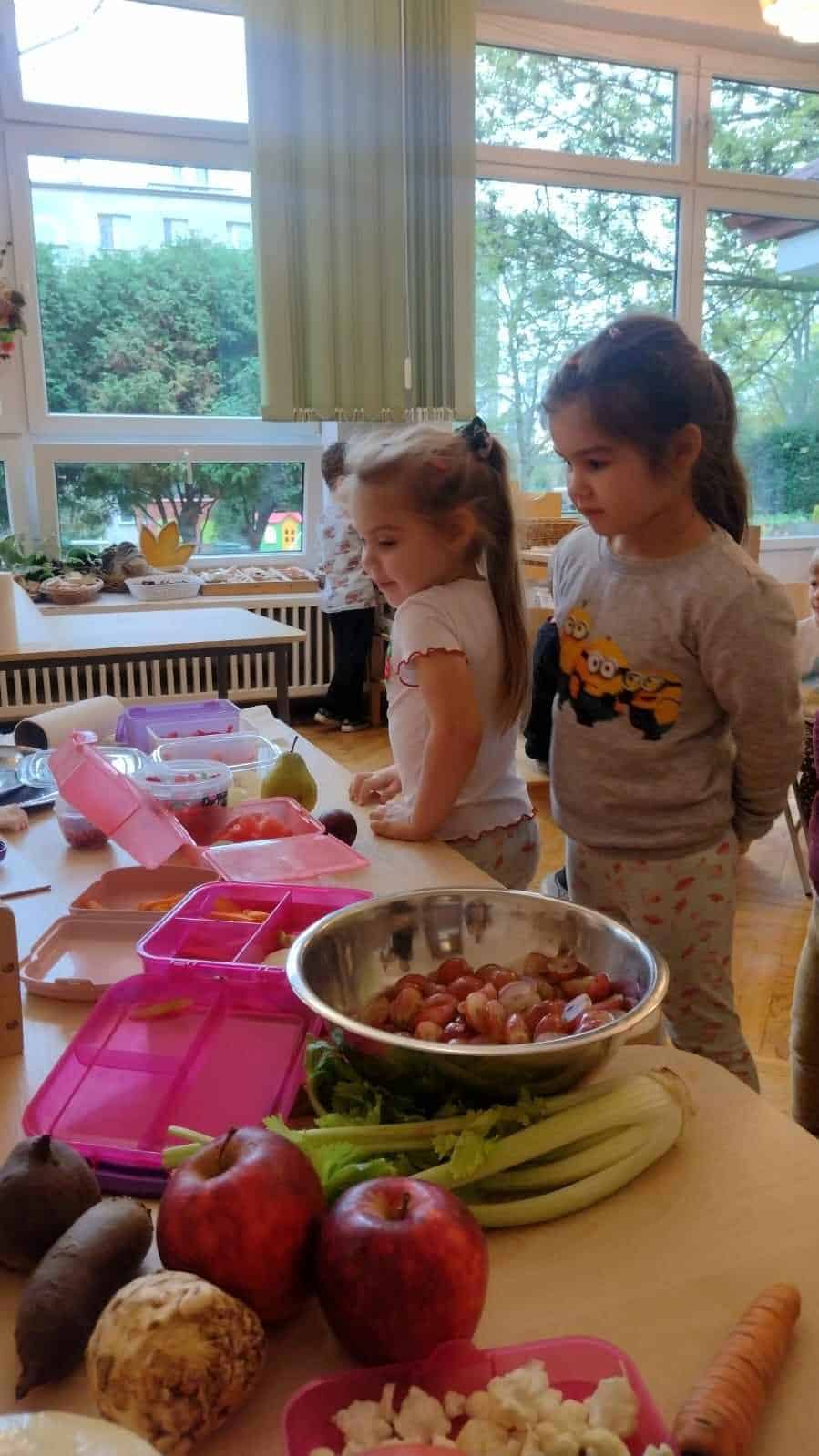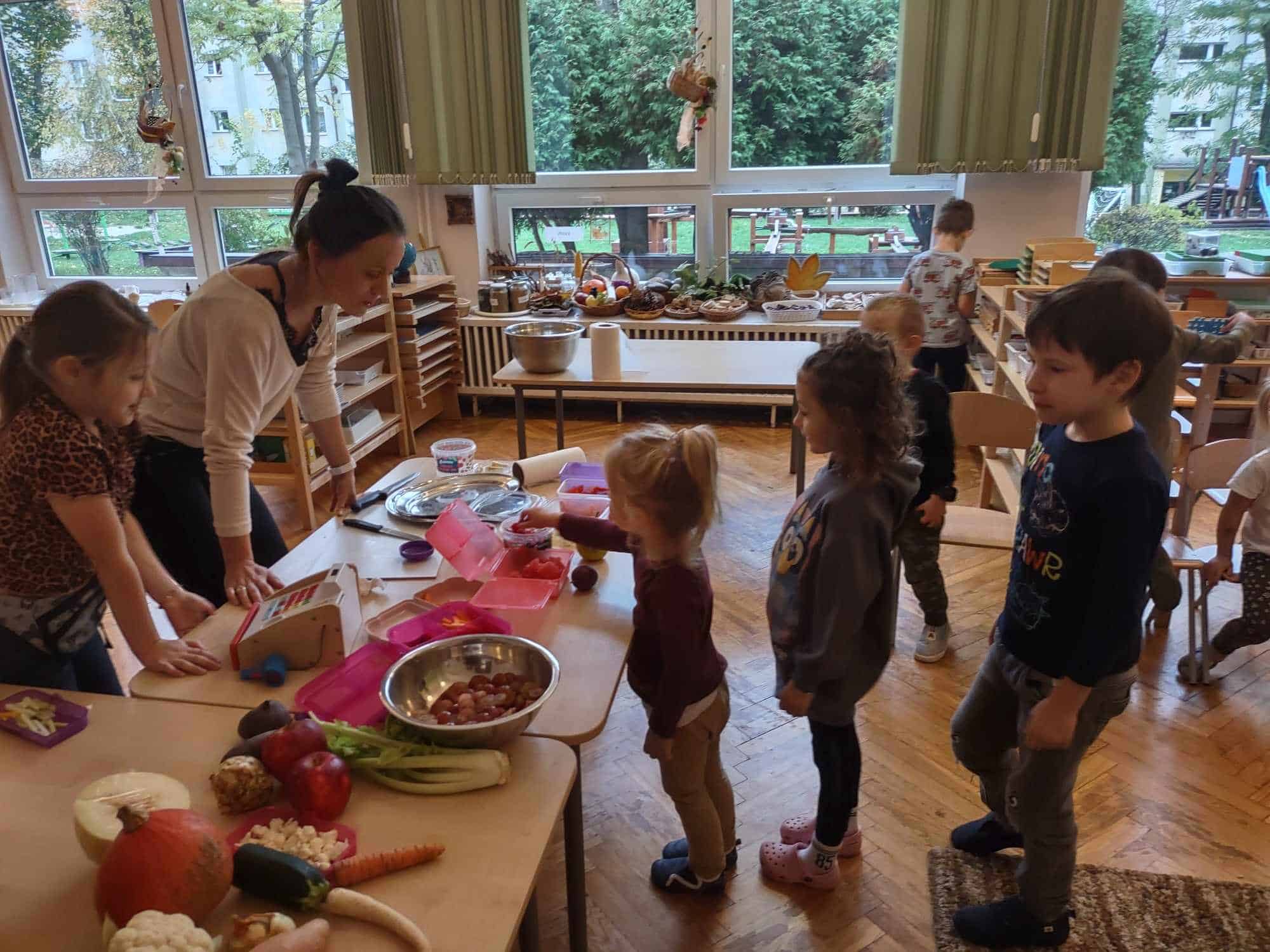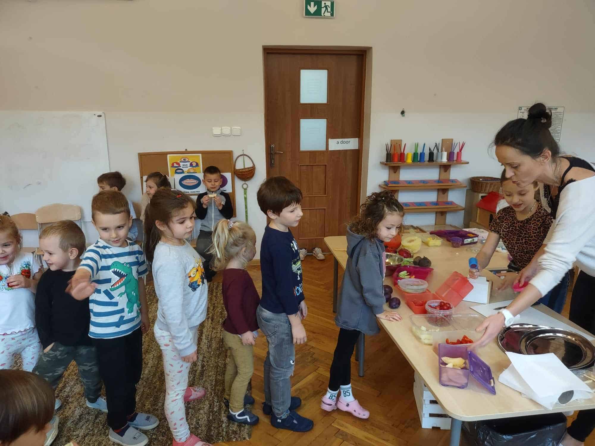 Na zakończenie zajęć Nel razem z mamusią zaprosiły wszystkie dzieci do swojego osiedlowego sklepu owocowo – warzywnego, który oferował klientom same zdrowe i pełnowartościowe produkty. Dzieci ustawiając się w kolejce prosiły o to, na co miały ochotę. Nie zabrakło też chętnych na kosztowanie cebuli i selera naciowego. Brawo!