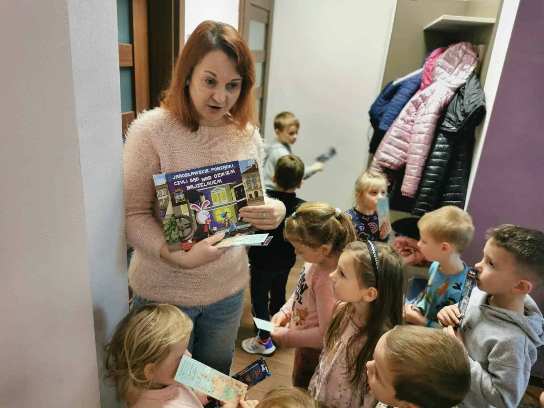 Na zakończenie naszej wizyty dzieci otrzymały zakładki do książek, a nasz grupowy kącik czytelniczy wzbogacił się o dwie pozycje: „Rady na odpady, czyli jak Jarek uczył sortować śmieci” oraz „Jarosławskie porządki, czyli sąd nad Dzikiem Bajzelikiem”.