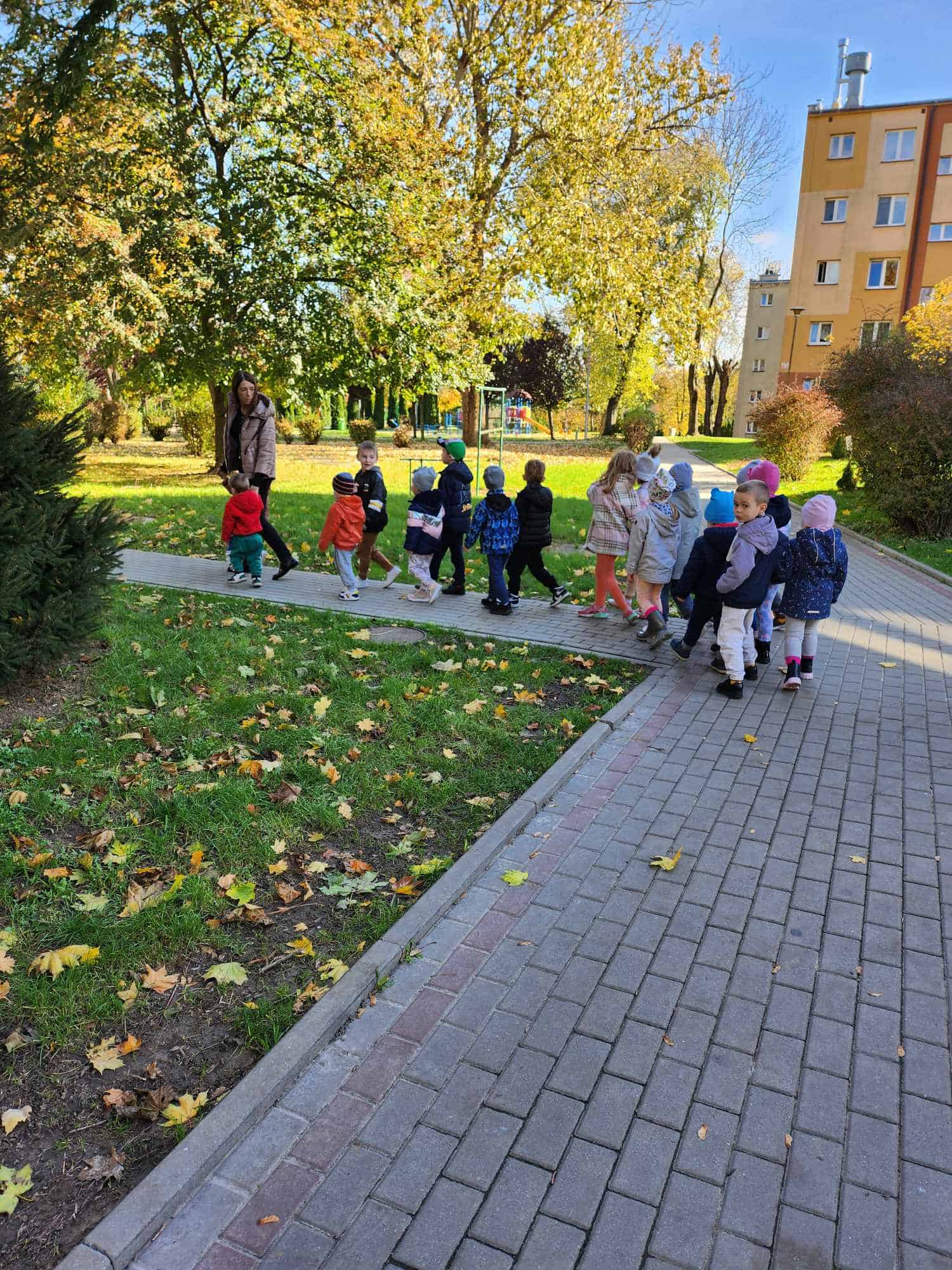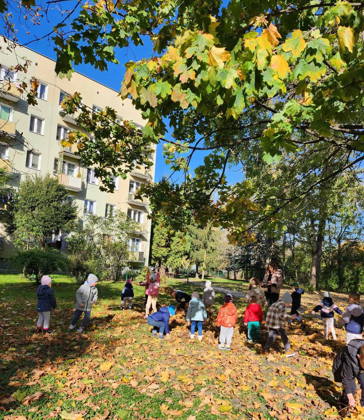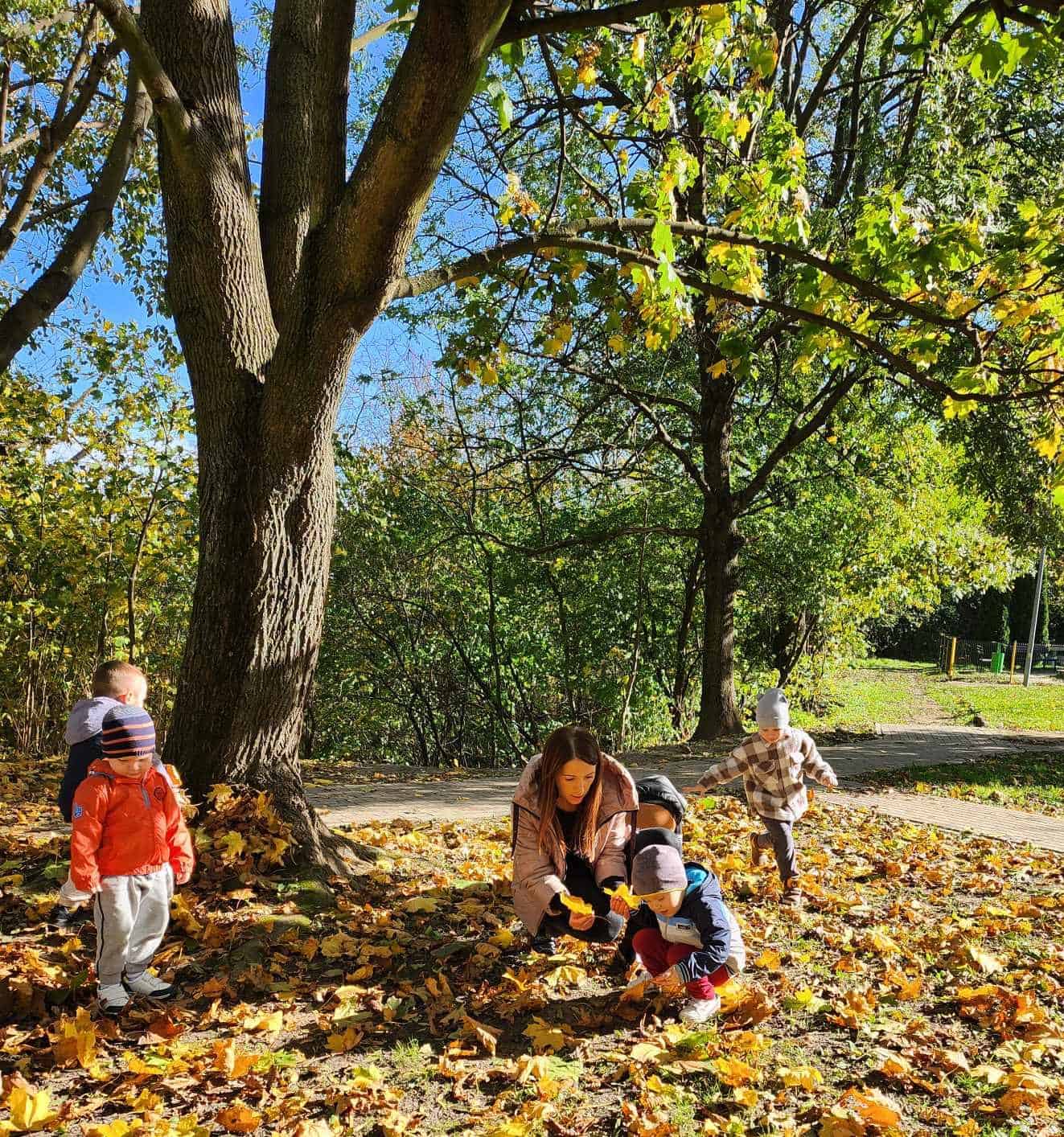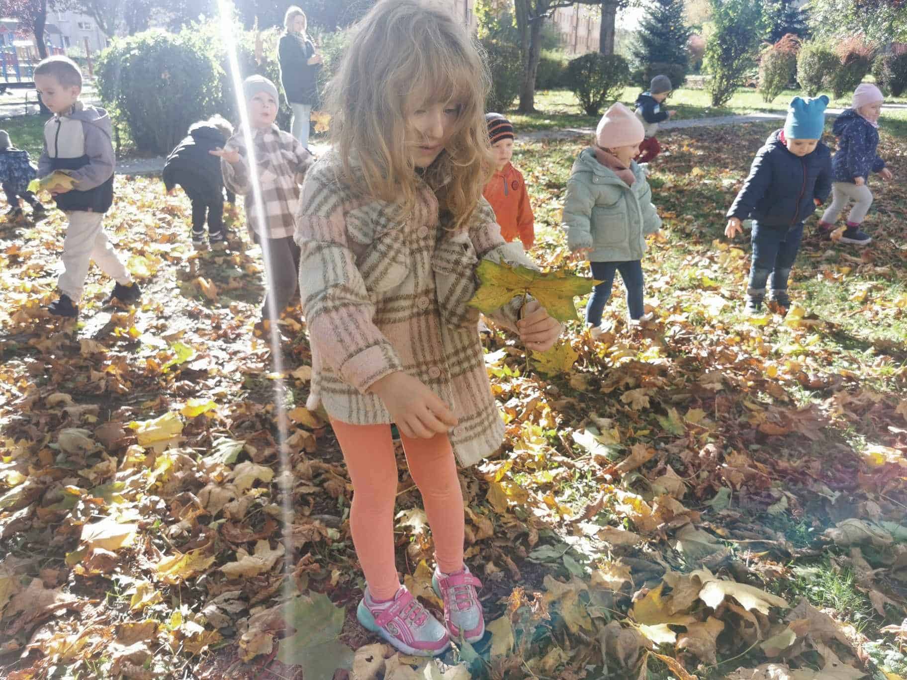 Jesień to piękna pora roku, która zachwyca wyjątkowymi kolorami. Krajobrazy mienią się odcieniami żółtego, czerwonego, pomarańczowego i brązowego koloru. Jesienna pogoda jest zmienna, raz jest zimno, wietrznie i deszczowo, a raz ciepło i słonecznie. Gdy tylko pogoda dopisuje spędzamy czas w naszym ogrodzie lub spacerujemy w pobliżu przedszkola. Mamy to szczęście, że przedszkole znajduje się w spokojnej okolicy, gdzie można spacerować obserwując przyrodę. Dla przedszkolaków to świetna okazja nie tylko by się dotlenić i aktywnie spędzić czas, ale także, aby czegoś się nauczyć. Młodsze dzieci przy okazji zbierania liści mogą utrwalać kolory, a starsze poznawać gatunki drzew.