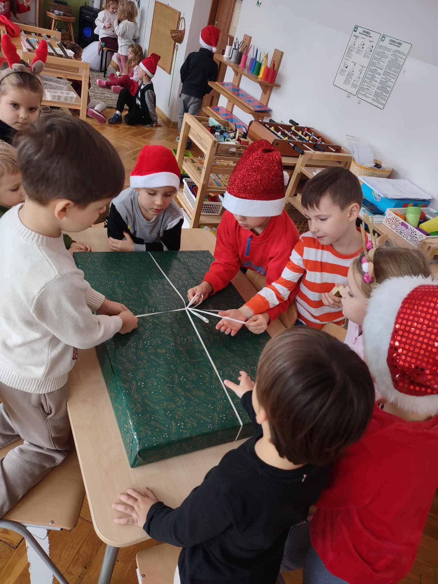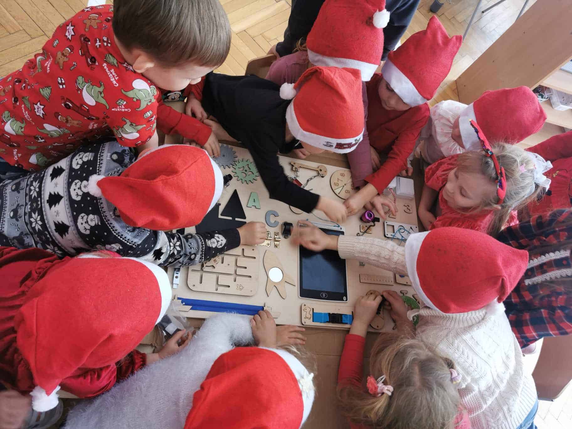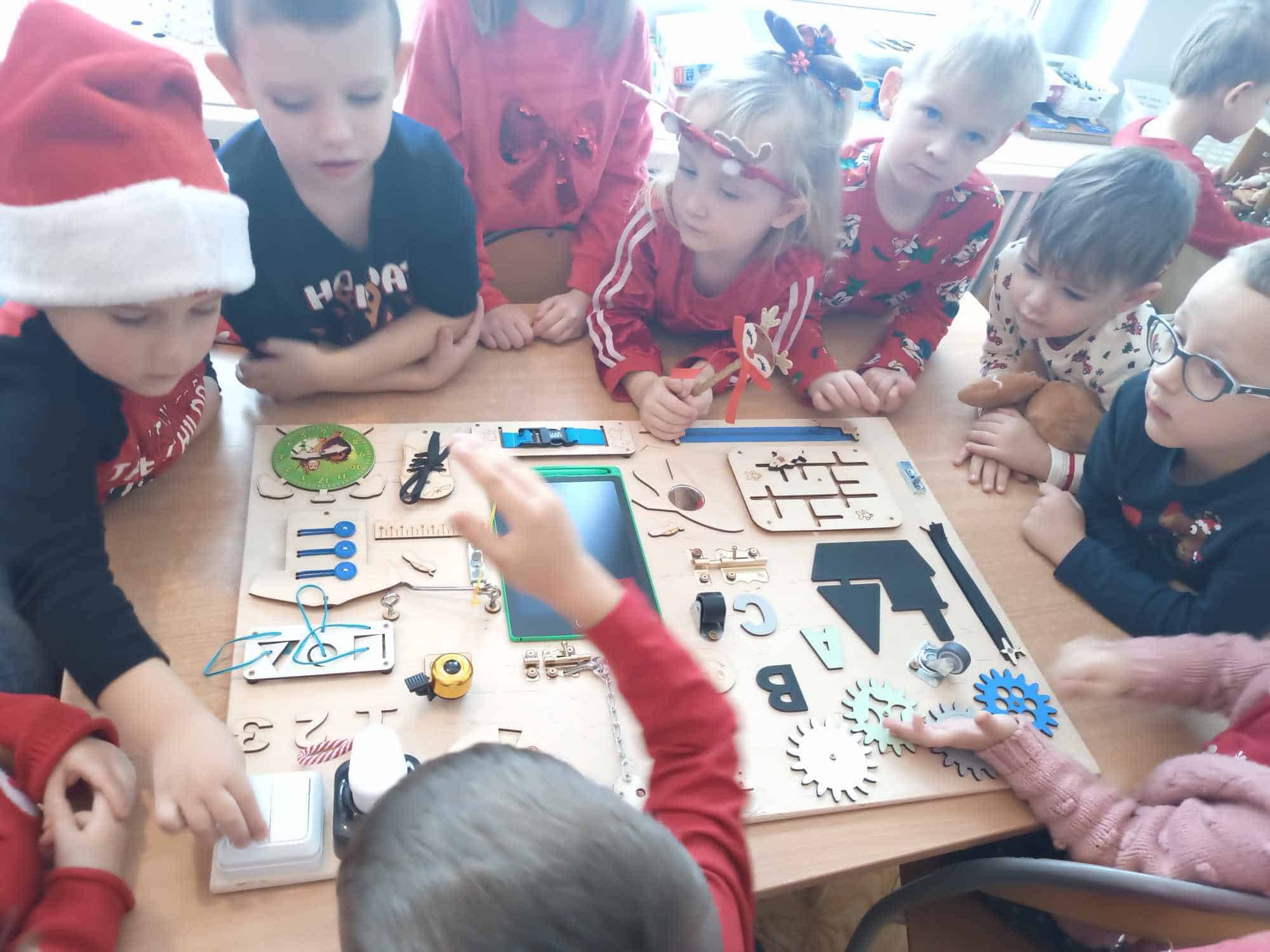 Po wspólnych rozmowach Mikołaj wręczył każdemu wspaniały prezent i musiał się pożegnać, ponieważ czekały na niego jeszcze inne dzieci. Mikołaj zostawił również prezenty dla grup – tablice manipulacyjne. Pomocnikiem Św. Mikołaja w sprawie prezentów grupowych była nasza kochana Pani Dyrektor – za co bardzo dziękujemy 🙂