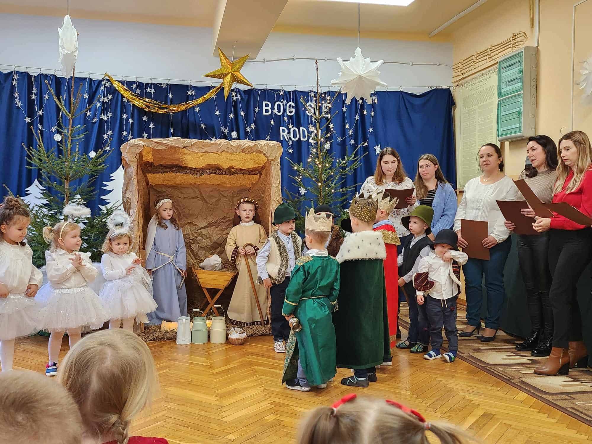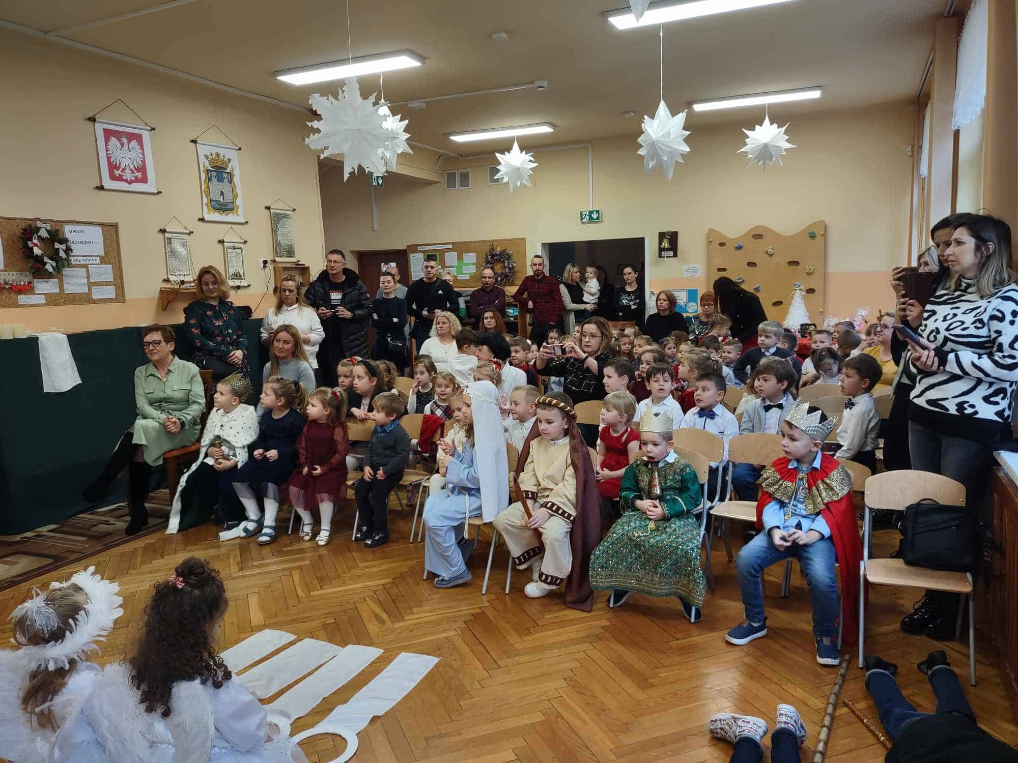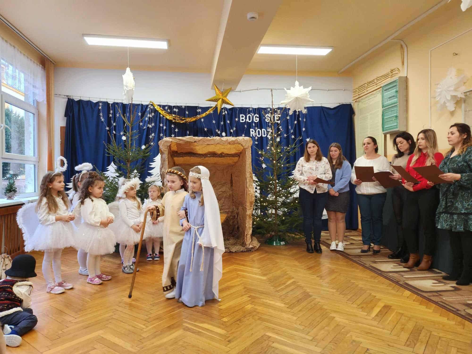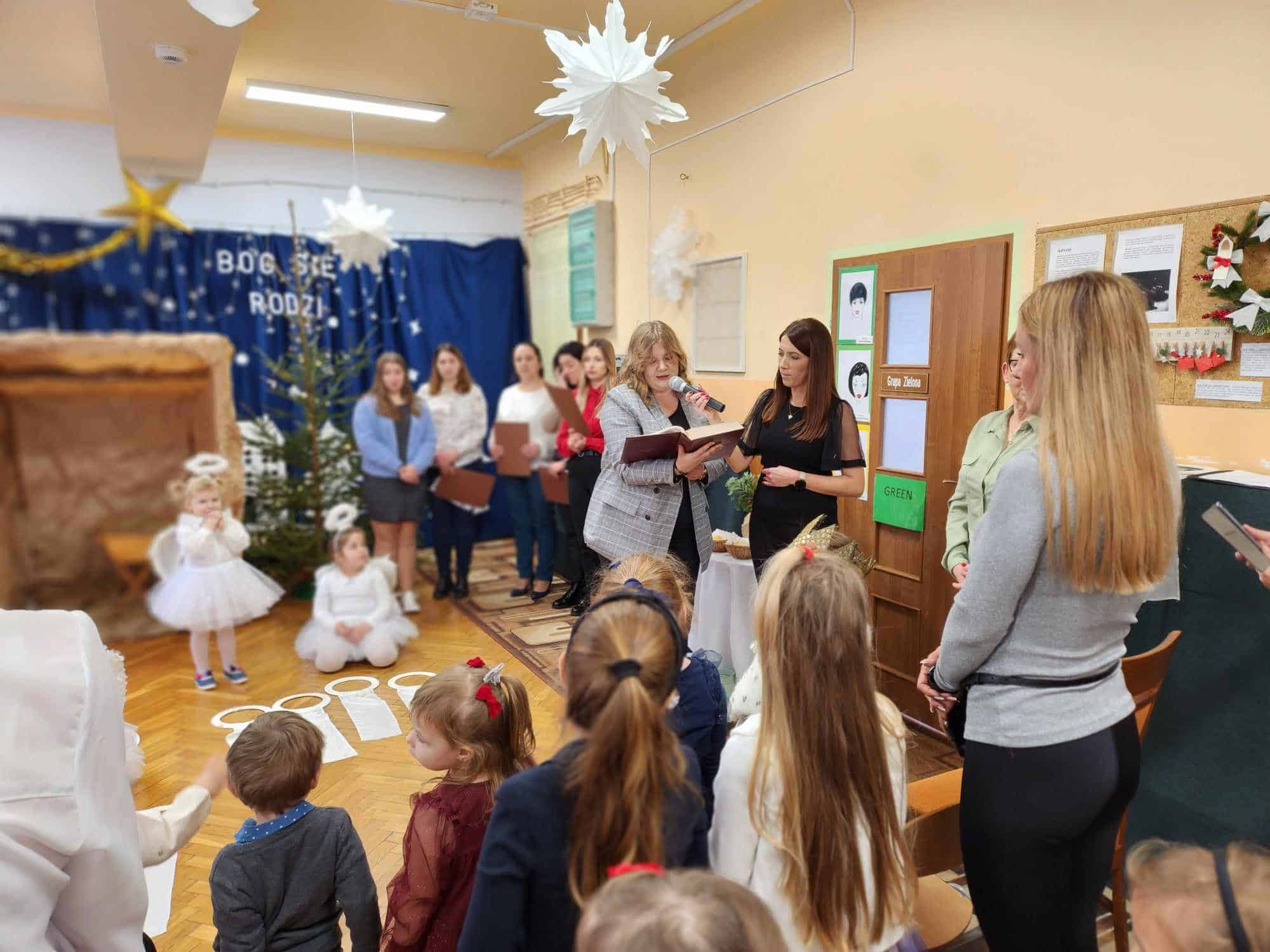 W czwartkowe przedpołudnie cała społeczność przedszkola – przedszkolaki, Dyrekcja, pracownicy przedszkola oraz rodzice zebrali się w holu, aby wspólnie przeżywać historię narodzin Jezusa. W wyjątkowy, świąteczny nastrój wprowadziły nas przedszkolaki z grupy Czerwonej oraz ich mamusie i rodzeństwo. Było pięknie i wzruszająco.