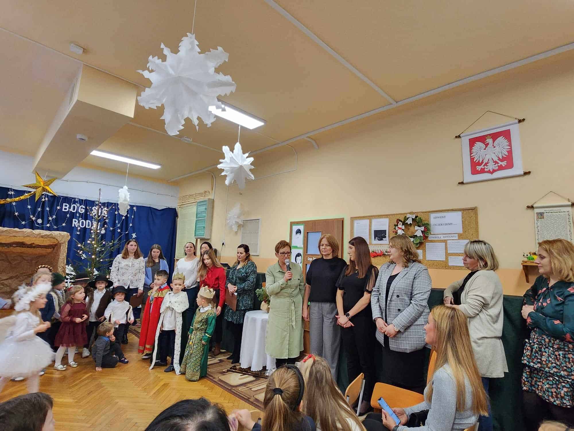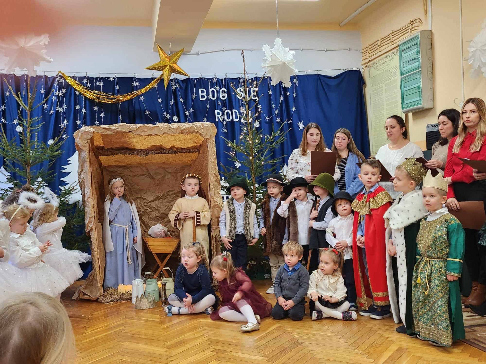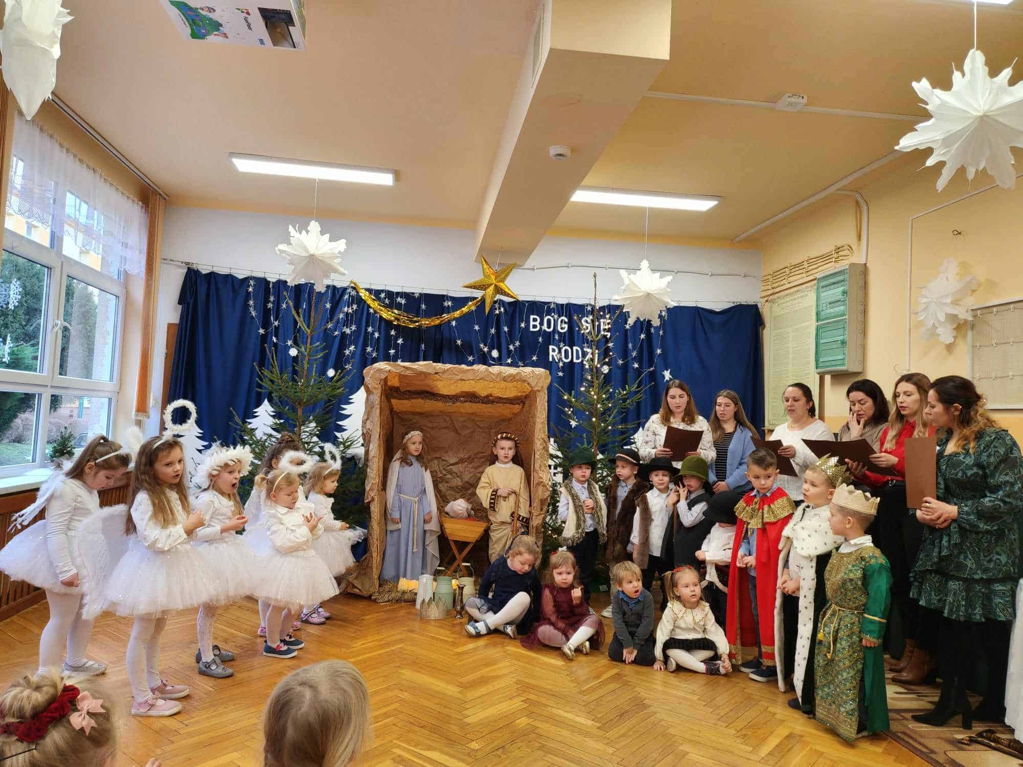 W czwartkowe przedpołudnie cała społeczność przedszkola – przedszkolaki, Dyrekcja, pracownicy przedszkola oraz rodzice zebrali się w holu, aby wspólnie przeżywać historię narodzin Jezusa. W wyjątkowy, świąteczny nastrój wprowadziły nas przedszkolaki z grupy Czerwonej oraz ich mamusie i rodzeństwo. Było pięknie i wzruszająco.