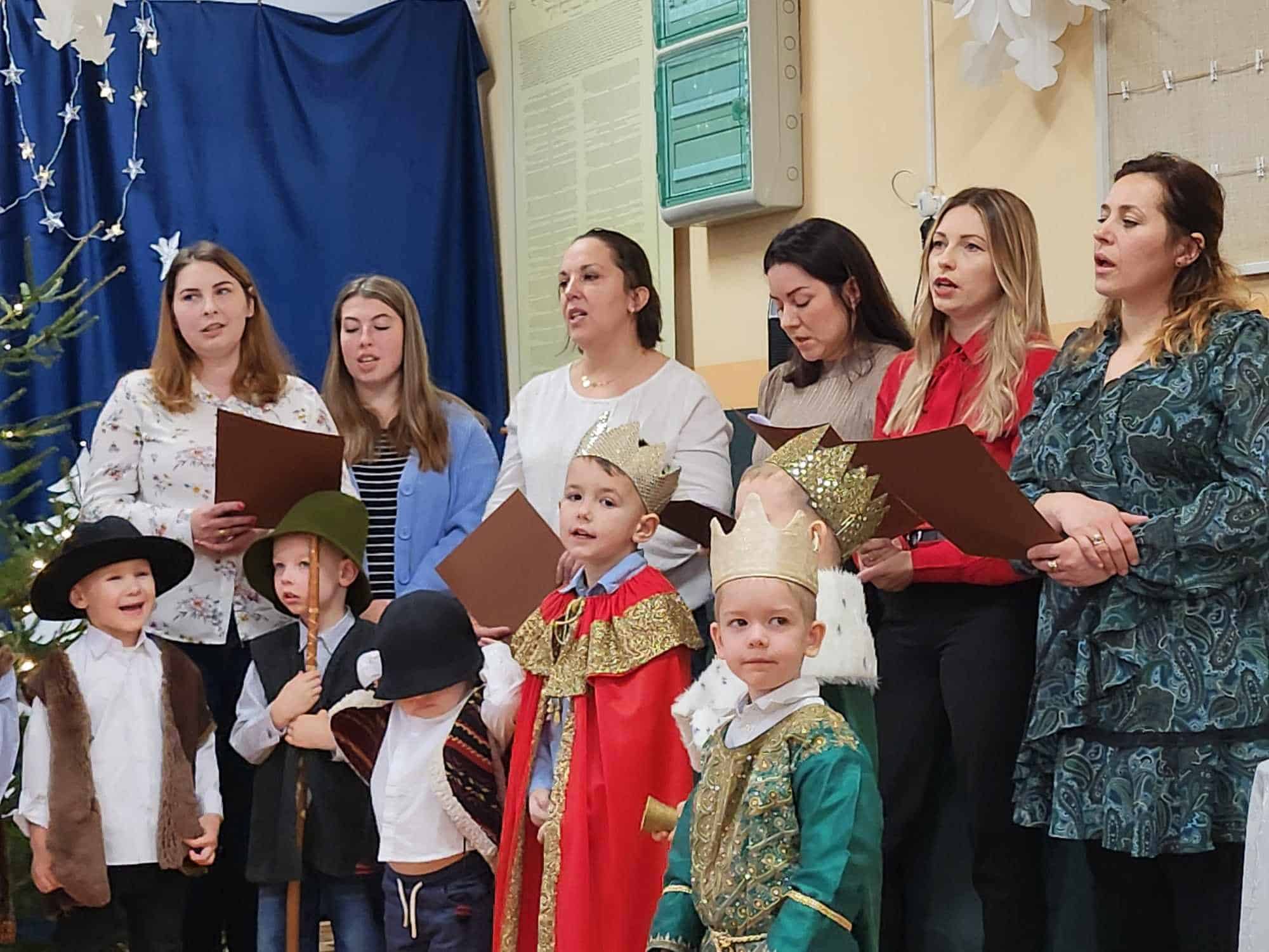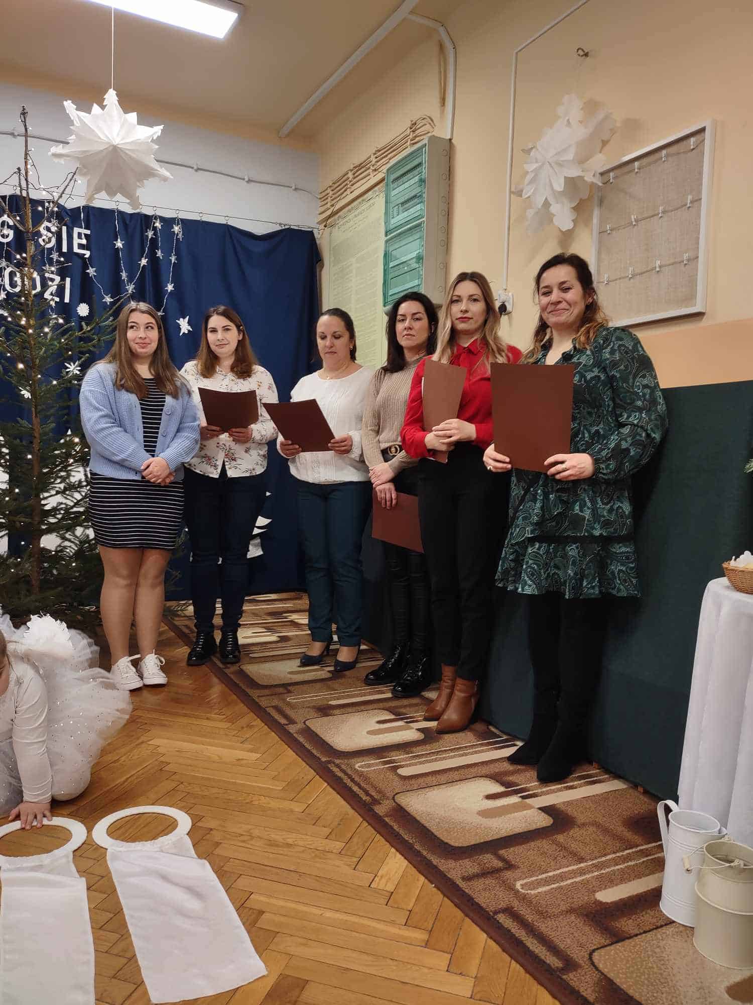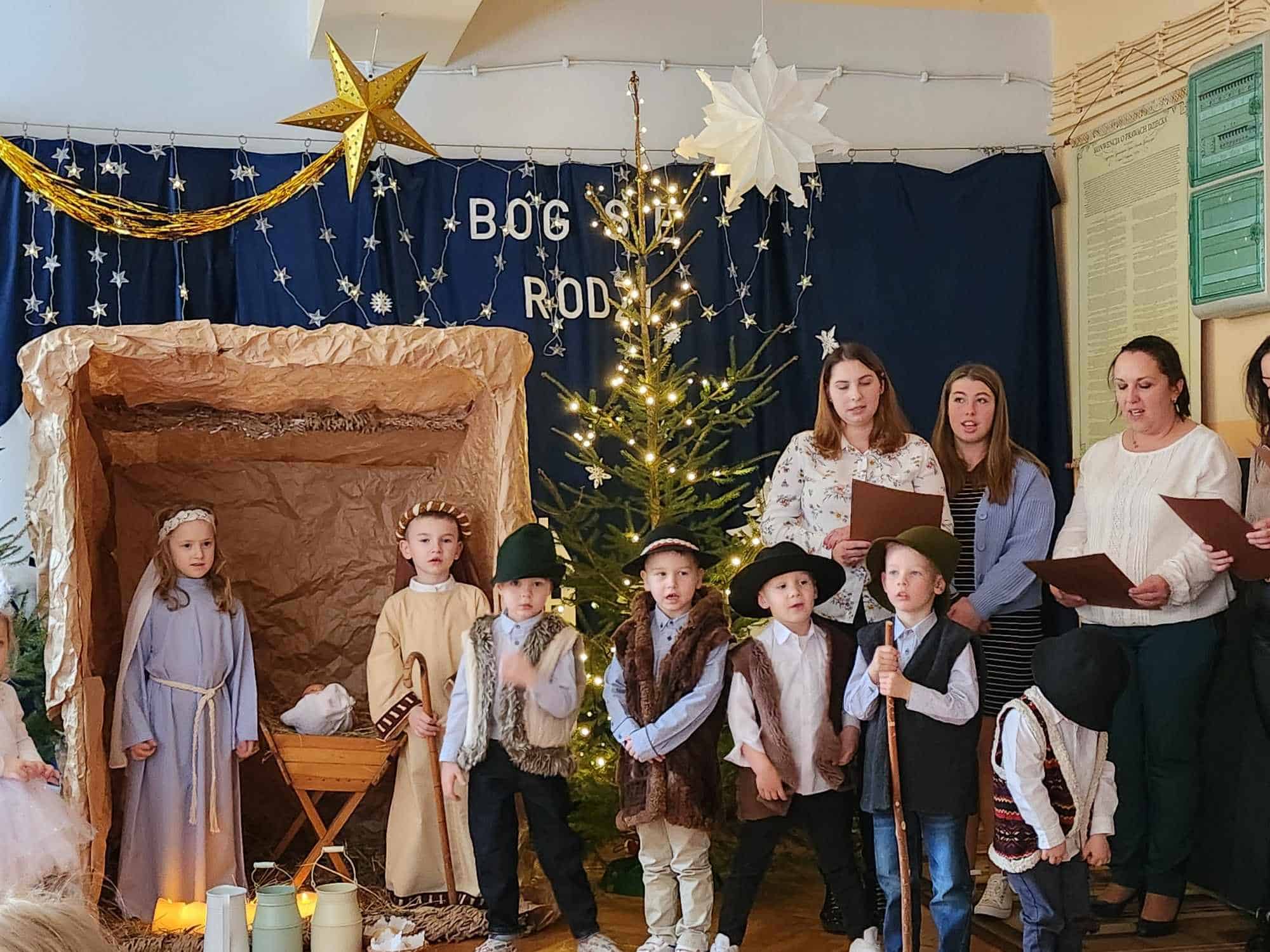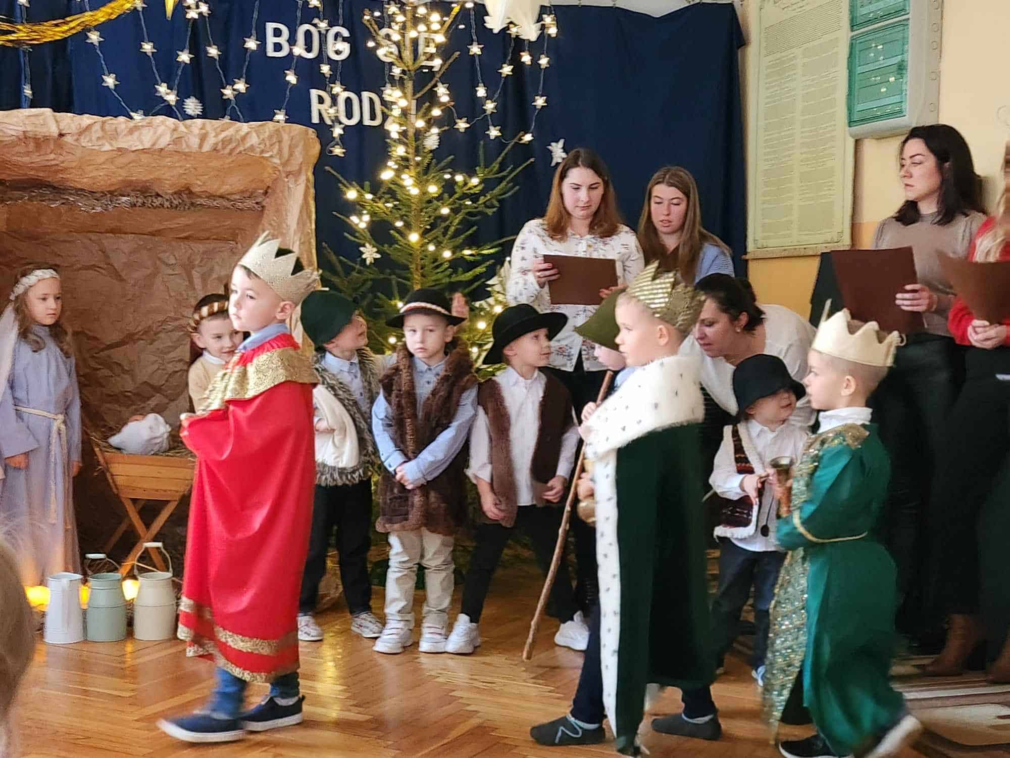 W czwartkowe przedpołudnie cała społeczność przedszkola – przedszkolaki, Dyrekcja, pracownicy przedszkola oraz rodzice zebrali się w holu, aby wspólnie przeżywać historię narodzin Jezusa. W wyjątkowy, świąteczny nastrój wprowadziły nas przedszkolaki z grupy Czerwonej oraz ich mamusie i rodzeństwo. Było pięknie i wzruszająco.