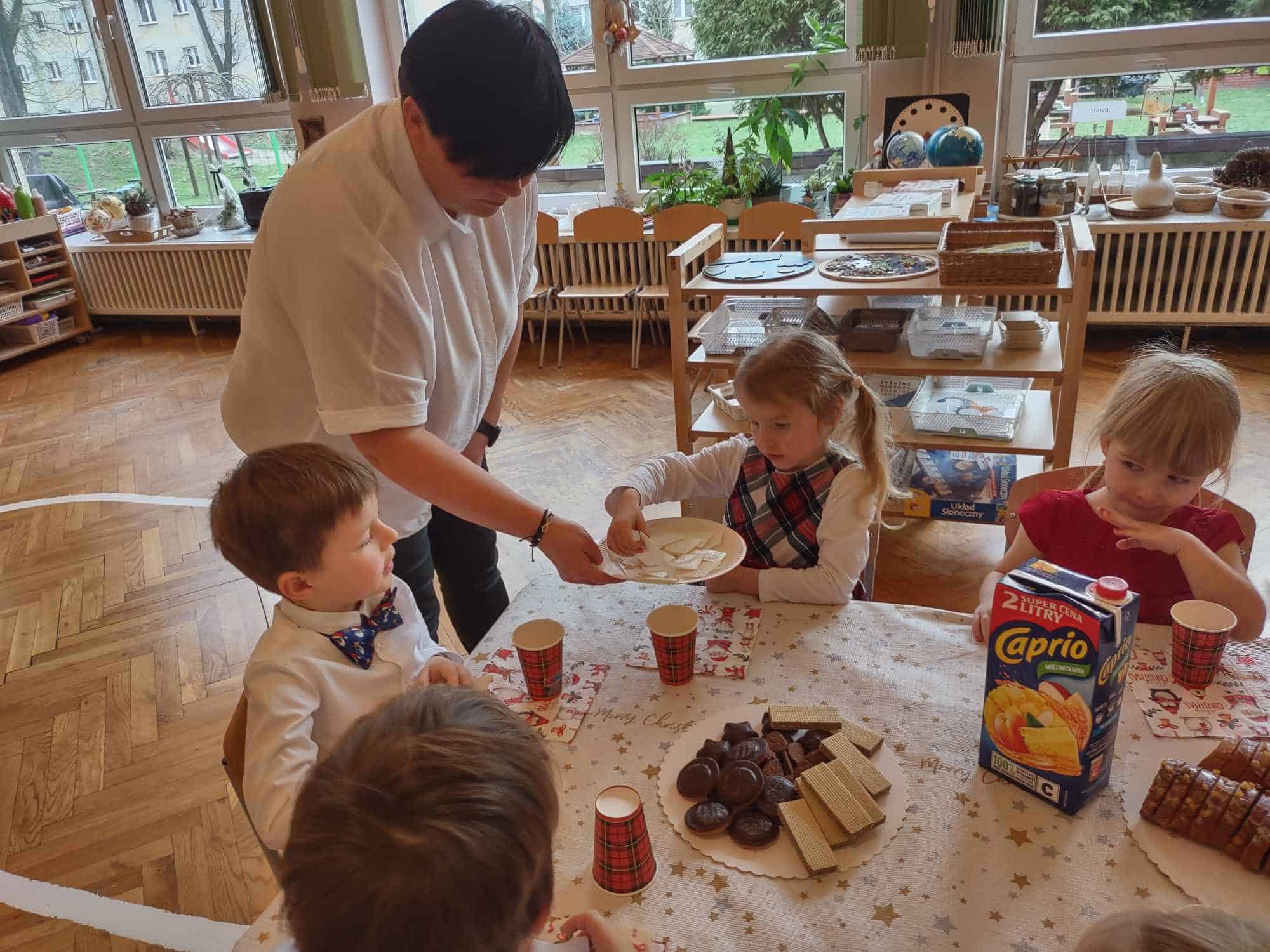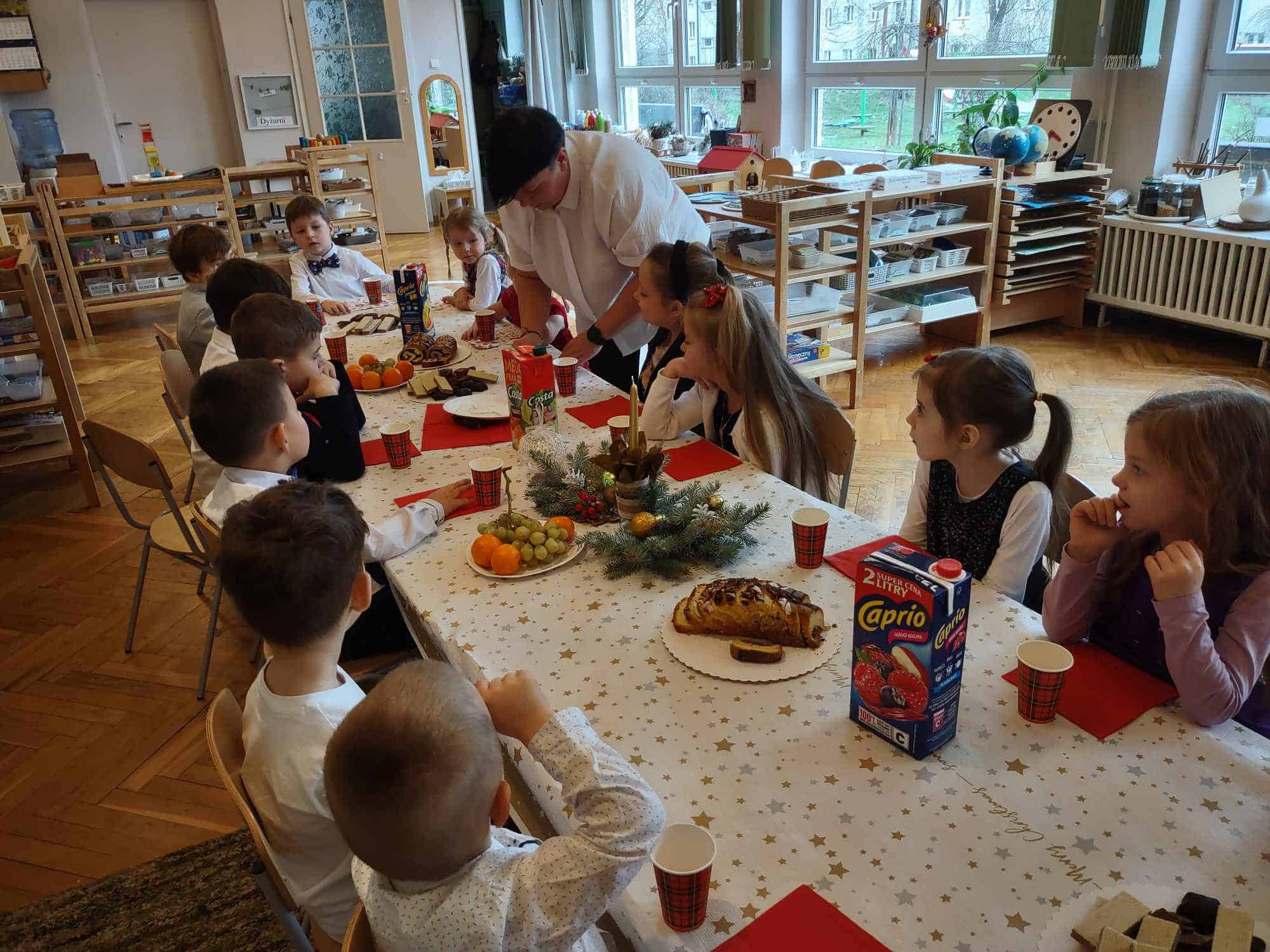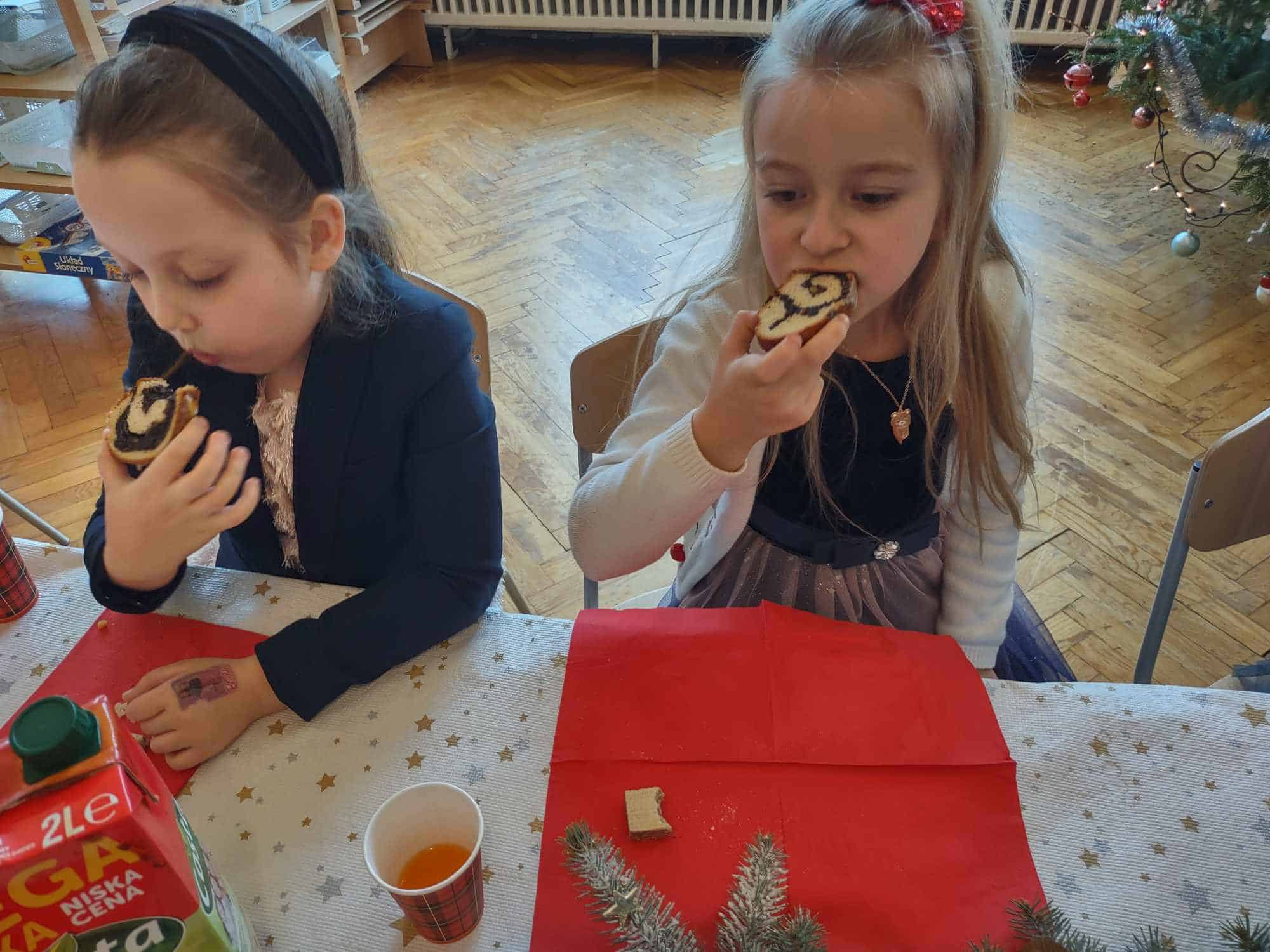 Po opłatku zasiedliśmy przy stole, aby posmakować tradycyjnej, wigilijnej ryby, kapusty z grochem oraz zupy grzybowej. Nie zabrakło także pysznych świątecznych słodkości, którymi ochoczo wszyscy się zajadali 🙂 W tym roku, wśród tak wielu świątecznych symboli, mieliśmy okazję doświadczyć jeszcze jednego, a było to spotkanie z niespodziewanym gościem, który odwiedził naszą grupę, co więcej obdarował nas pysznymi piernikami i ciastem 🙂 Pani Basia, mamusia naszej Blanki, zrobiła nam wszystkim bardzo miłą niespodziankę. Zajęła miejsce przy naszym wigilijnym stole przez co, chociaż na krótką chwilę, mogła stać się częścią naszej przedszkolnej społeczności. Pani Basiu dziękujemy za przemiłą niespodziankę, a jeszcze bardziej dziękujemy za obecność ❤️