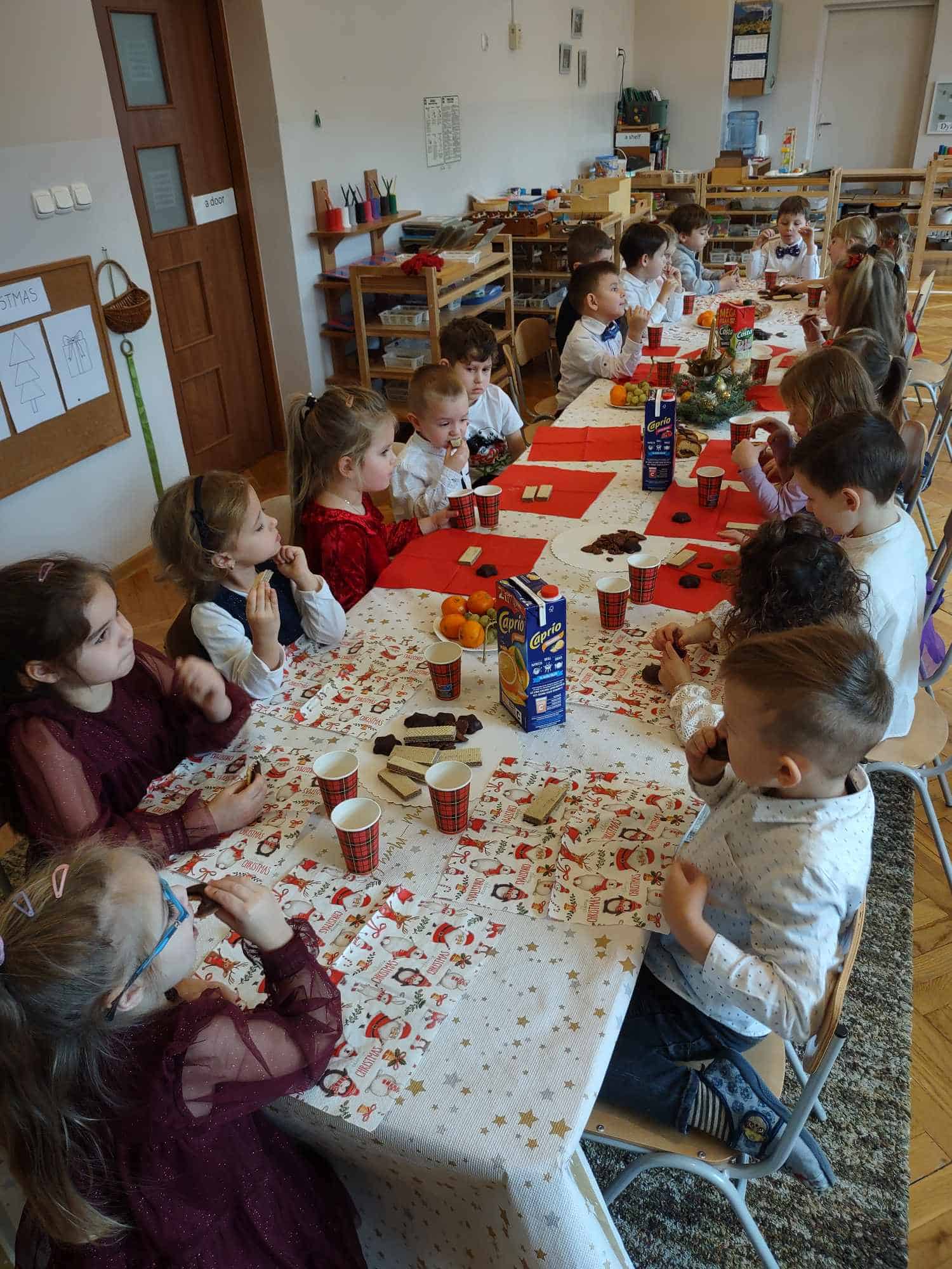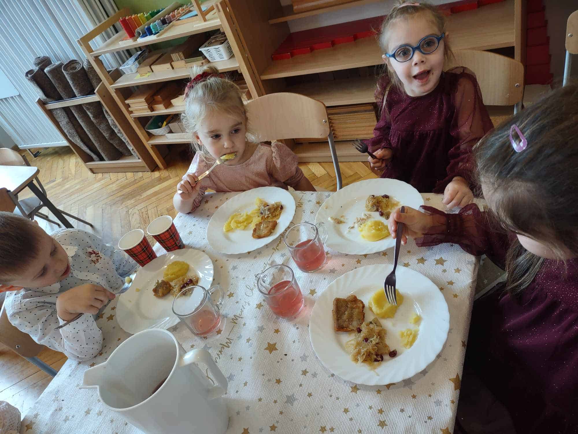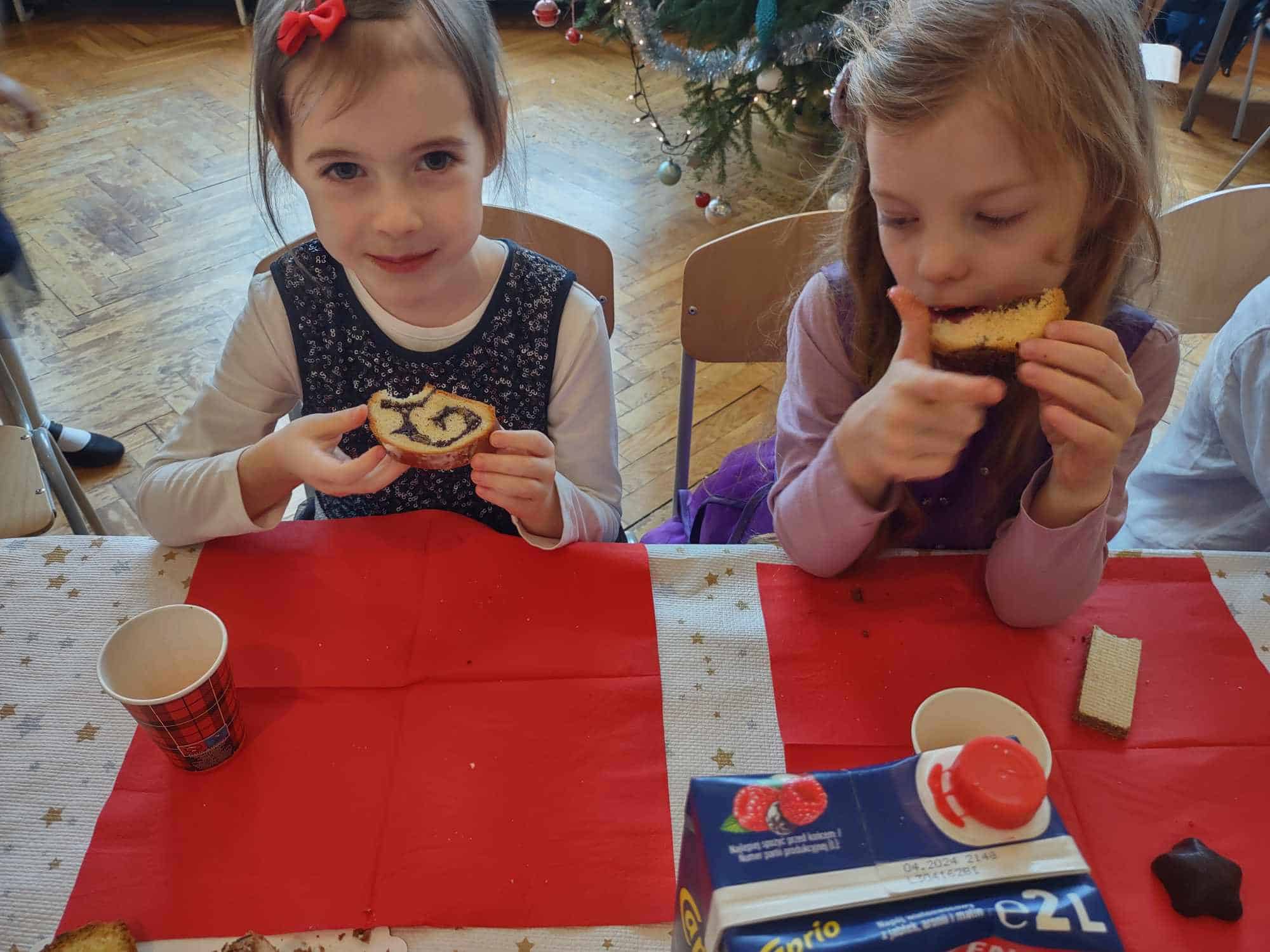 Po opłatku zasiedliśmy przy stole, aby posmakować tradycyjnej, wigilijnej ryby, kapusty z grochem oraz zupy grzybowej. Nie zabrakło także pysznych świątecznych słodkości, którymi ochoczo wszyscy się zajadali 🙂 W tym roku, wśród tak wielu świątecznych symboli, mieliśmy okazję doświadczyć jeszcze jednego, a było to spotkanie z niespodziewanym gościem, który odwiedził naszą grupę, co więcej obdarował nas pysznymi piernikami i ciastem 🙂 Pani Basia, mamusia naszej Blanki, zrobiła nam wszystkim bardzo miłą niespodziankę. Zajęła miejsce przy naszym wigilijnym stole przez co, chociaż na krótką chwilę, mogła stać się częścią naszej przedszkolnej społeczności. Pani Basiu dziękujemy za przemiłą niespodziankę, a jeszcze bardziej dziękujemy za obecność ❤️