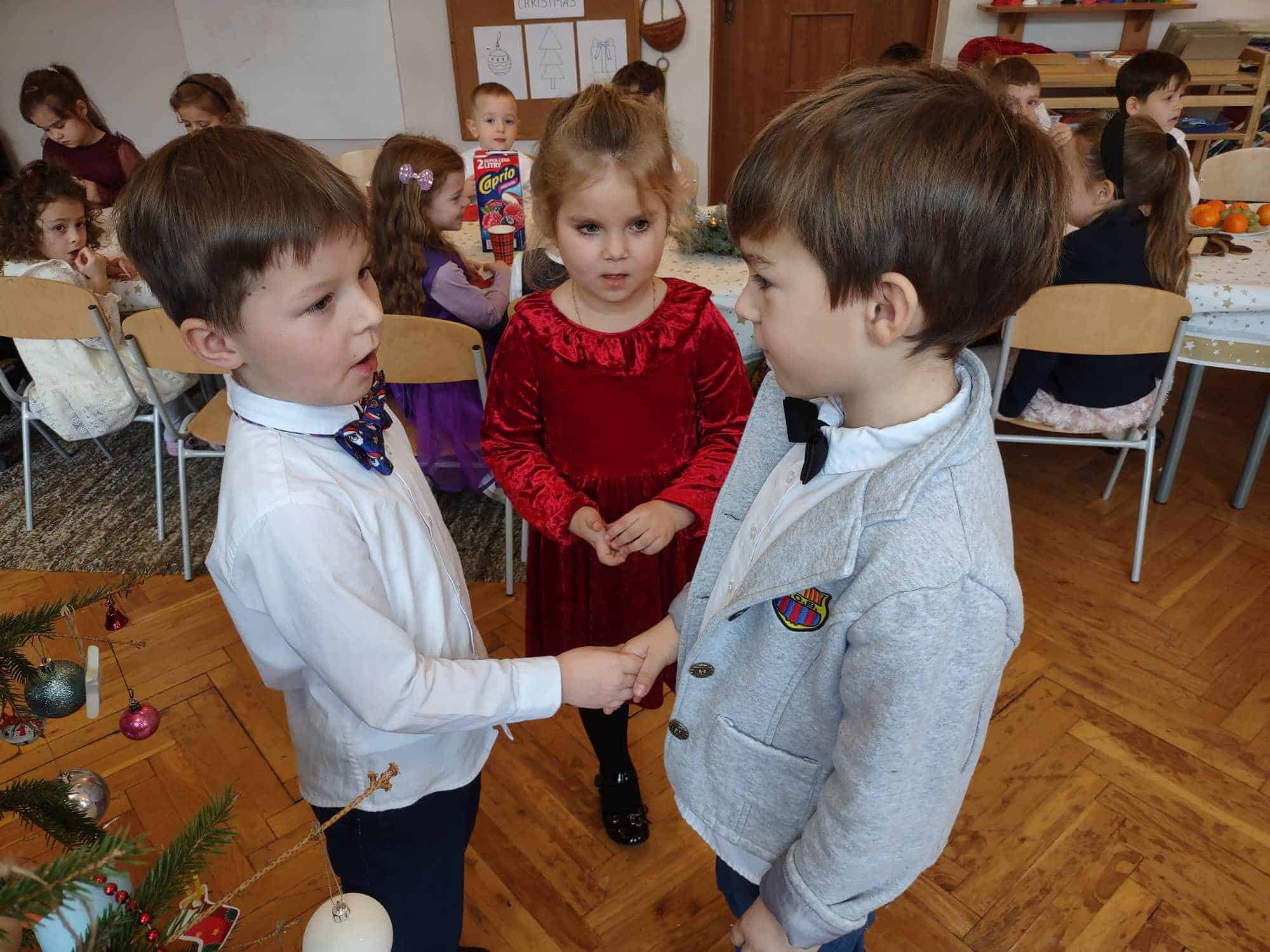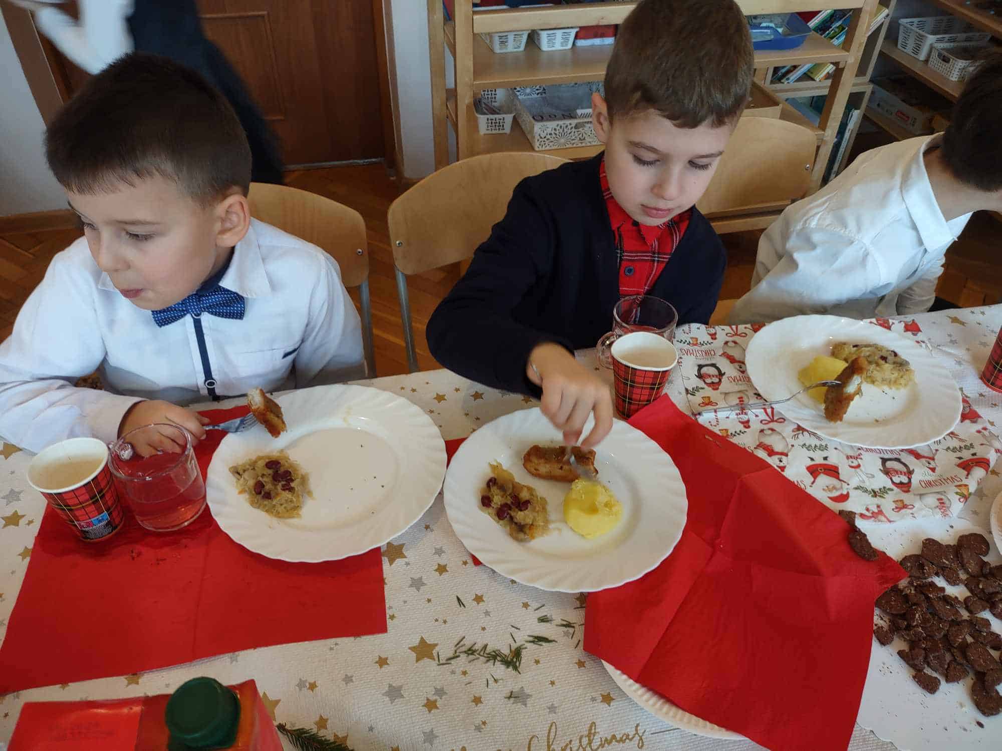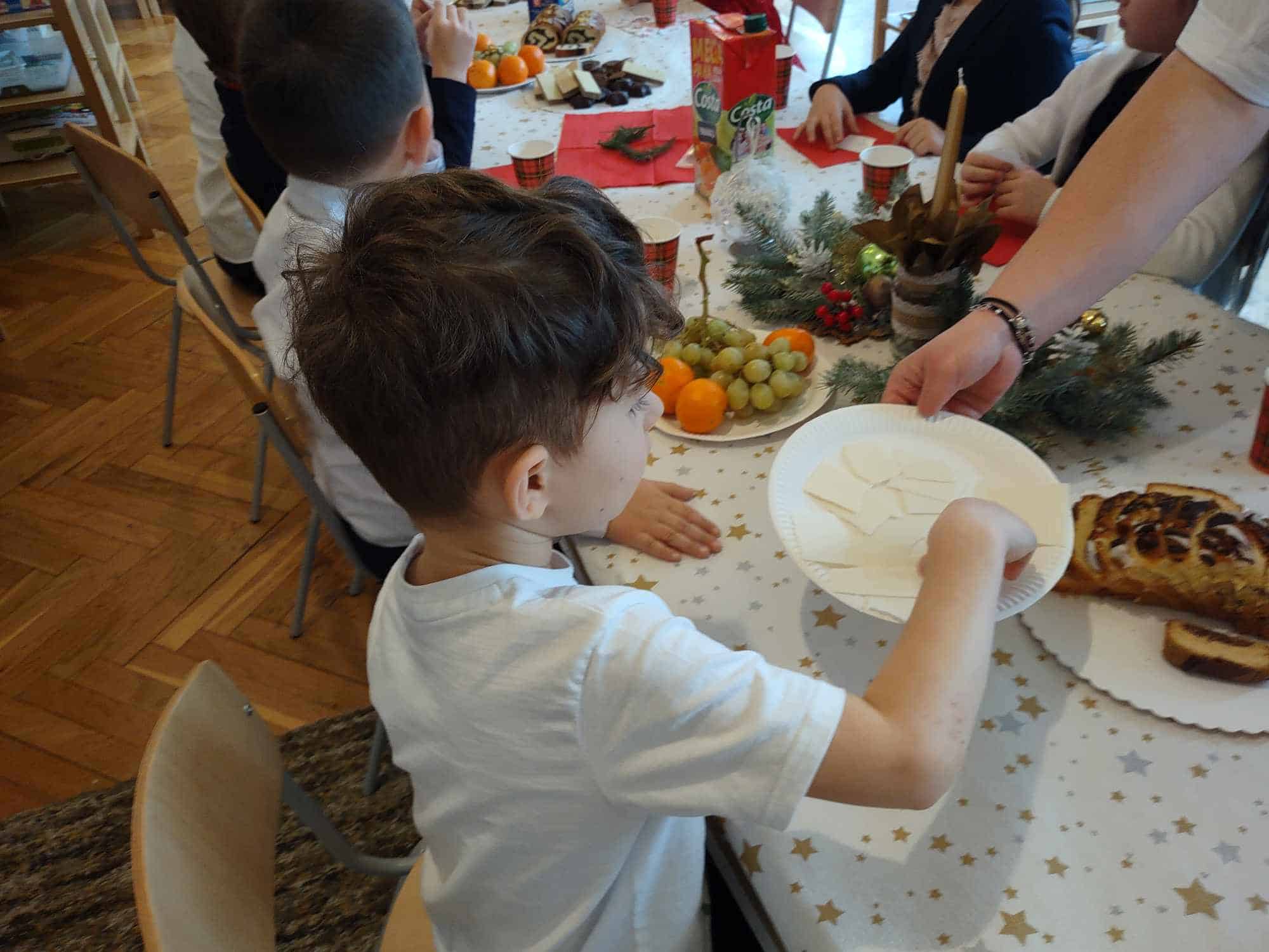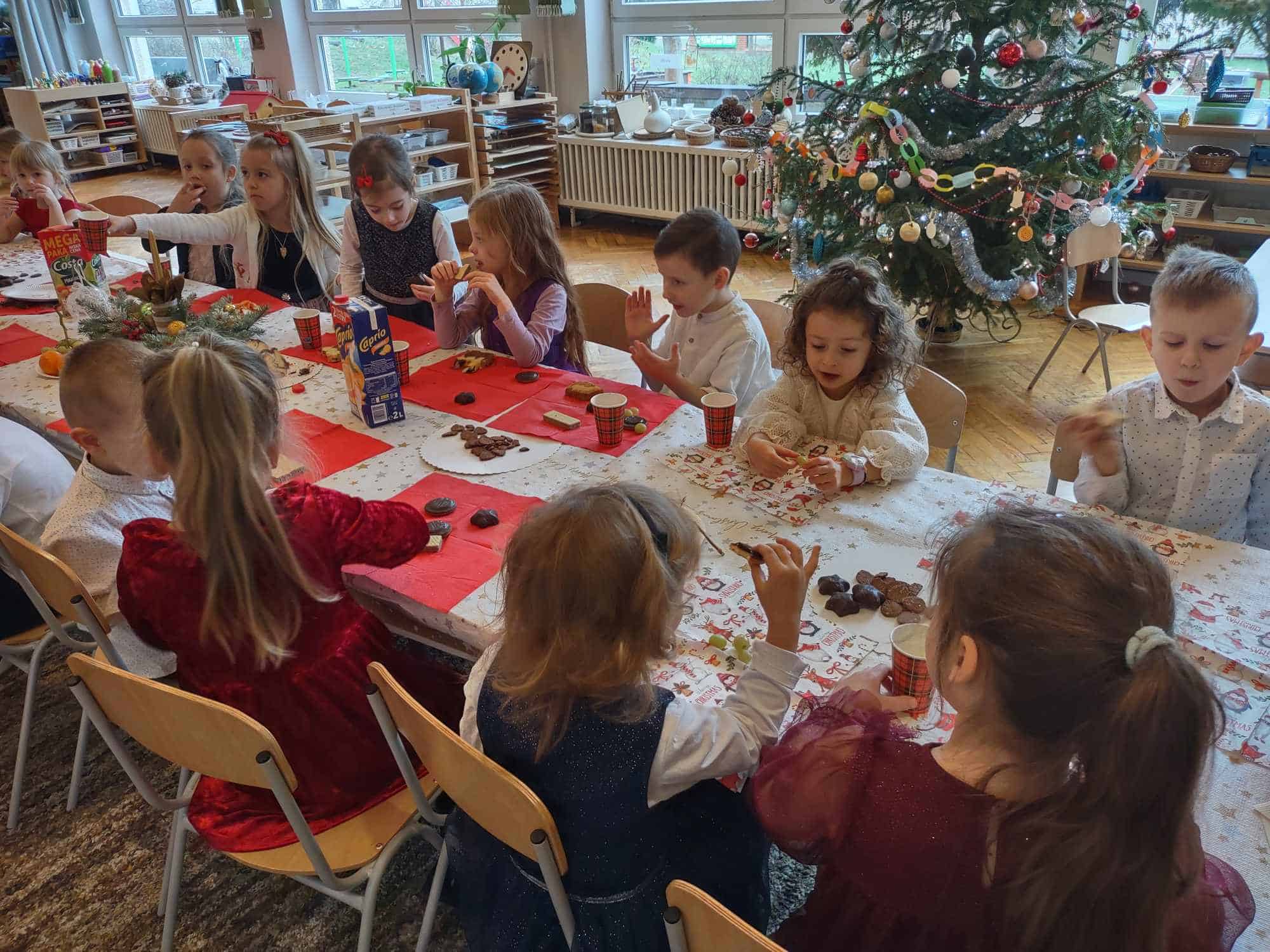 Wigilia Bożego Narodzenia to jeden z najpiękniejszych dni w roku, dlatego w naszej przedszkolnej społeczności przeżywamy go bardzo uroczyście. W tym dniu w każdej grupie, jak i w całym przedszkolu, już od samego rana panowała radosna, ożywiona atmosfera. Dzieci bardzo chętnie pomagały w przygotowaniach. Wspólnie nakrywały do stołu, ustawiały krzesła, rozkładały serwetki. O wyznaczonej  godzinie wszystkie grupy zebrały się w holu naszego przedszkola, aby wziąć udział w uroczystej godzince adwentowej przygotowanej przez Grupę Czerwoną pt. „Dziś jest dzień narodzin Pana Jezusa”, wspólne kolędowanie a później nasza uroczysta, grupowa wigilia wprowadziły nas w czas oczekiwania na najpiękniejsze święta w roku. Nie zabrakło dzielenia się opłatkiem oraz serdecznych, płynących z serca życzeń.