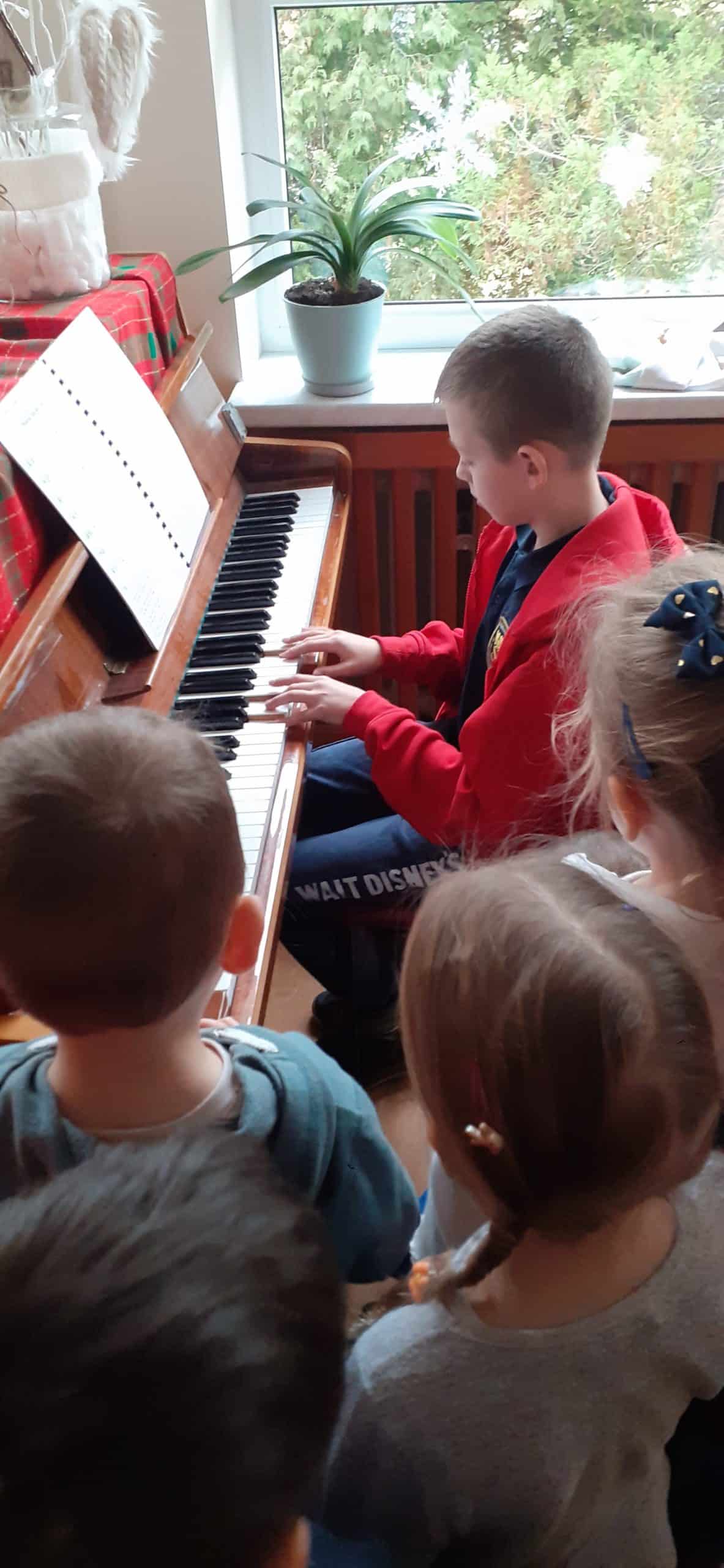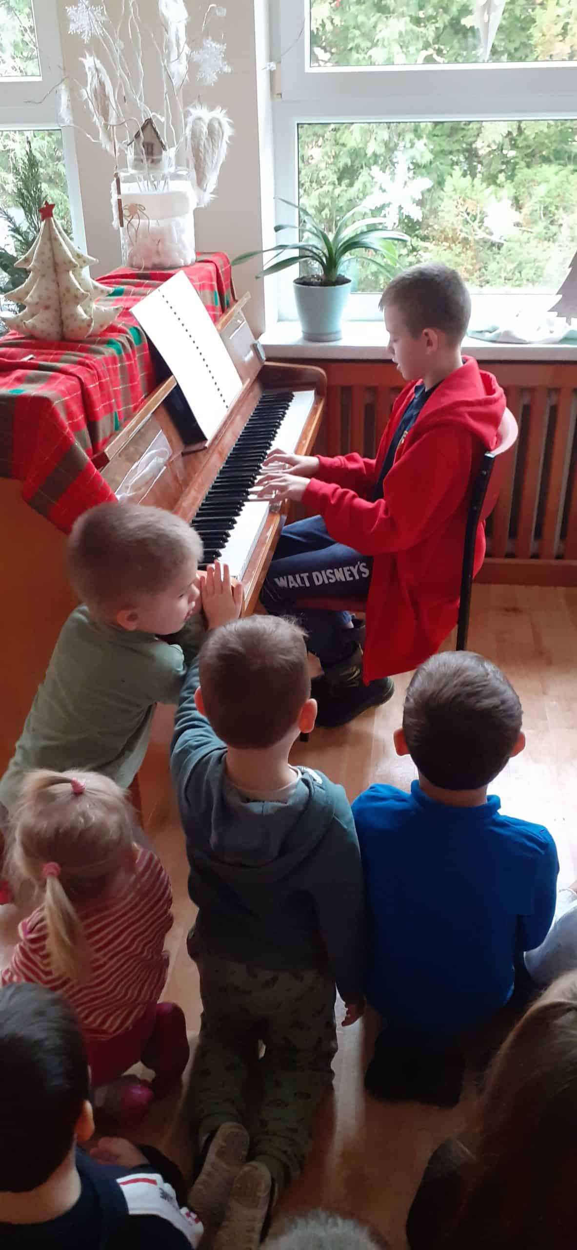 Bartek to brat Jowitki z naszej grupy. To 11 – letni bardzo zdolny absolwent naszego przedszkola, który ma na swoim koncie nie tylko sukcesy sportowe, ale także jest uzdolniony muzycznie. Pięknie gra na pianinie i dlatego ten fakt postanowiliśmy wykorzystać i zaprosić go do przedszkola do wspólnego kolędowania. Atmosfera spotkania była wyjątkowa- Bartuś pięknie grał na pianinie – a my śpiewaliśmy najbardziej znane kolędy. Dziękujemy Bartusiowi za wizytę w przedszkolu i życzymy dalszych sukcesów sportowych, muzycznych i nie tylko. Powodzenia!