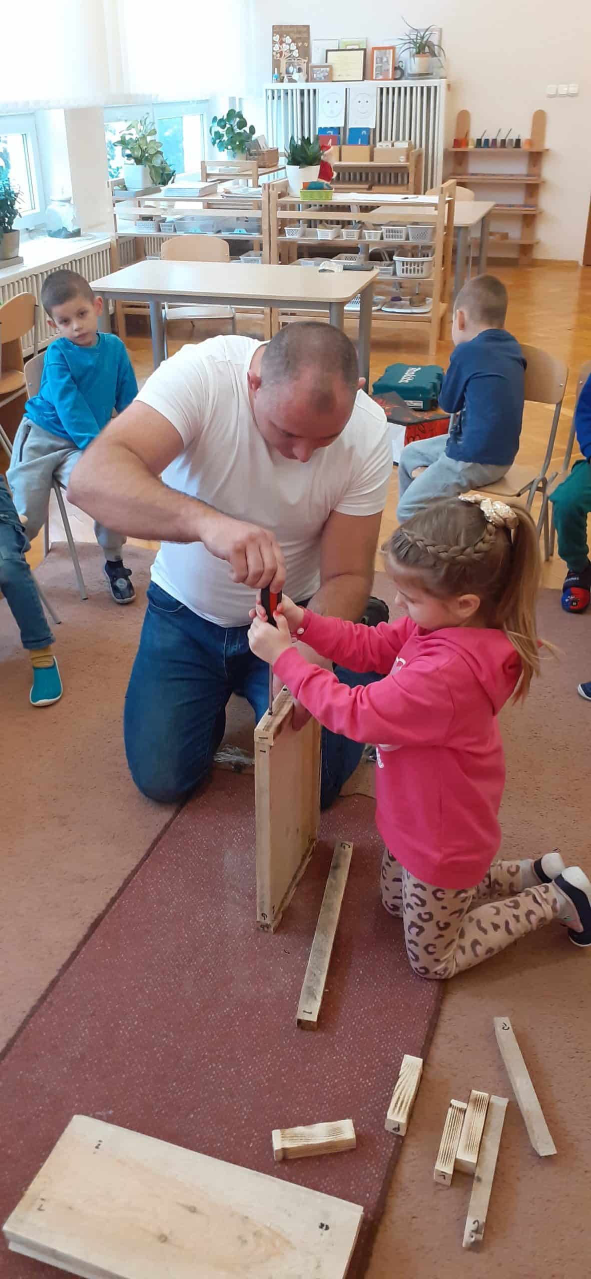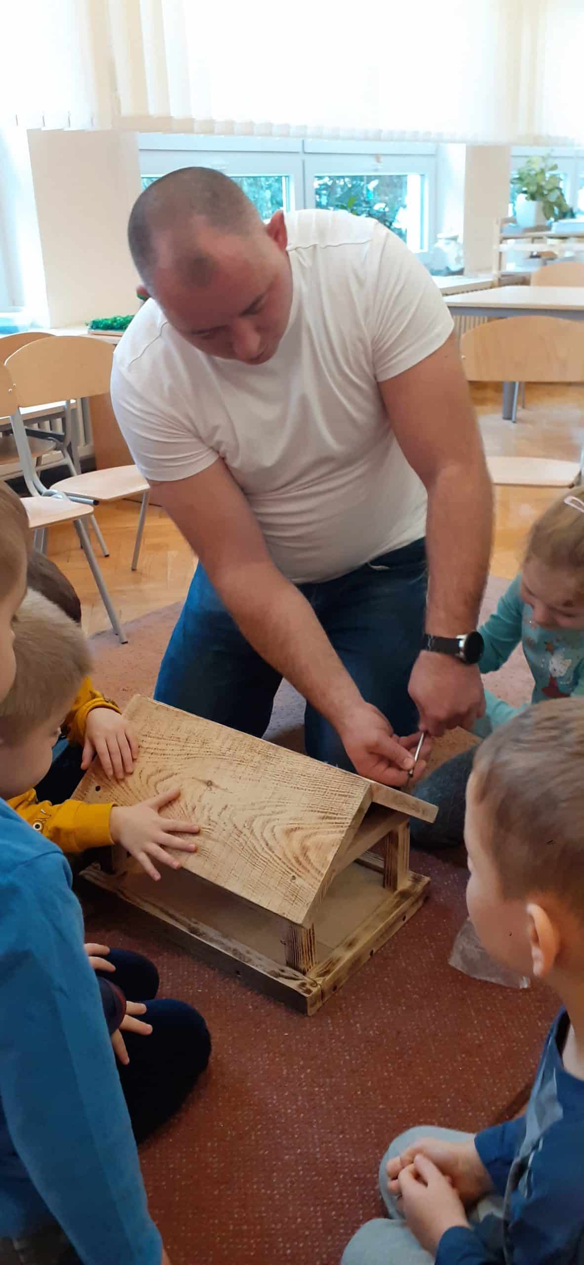 W naszym ogrodzie przedszkolnym rozmieszczonych jest kilka karmników dla ptaków. Jak co roku dzieci dbają o to, aby w karmnikach znalazła się odpowiednia mieszanka pokarmowa dla ptaków. Wiedząc o tym, że Tatuś Jowitki – pan Daniel ma na co dzień do czynienia z drewnem i potraf z niego zrobić fantastyczne rzeczy, poprosiliśmy go, aby wspólnie z dziećmi wykonał kolejny karmik dla ptaków. To było kolejne ciekawe doświadczenie dla dzieci. Dzieci poznały narzędzia potrzebne do wykonania karmnika, nauczyły się nimi posługiwać, poznały także właściwości drewna. Każde dziecko aktywnie brało udział w tworzeniu karmnika. Składanie poszczególnych elementów karnika, łączenie ich za pomocą wkrętów było bardzo interesujące dla dzieci. Dzieci z entuzjazmem pomagały panu Danielowi. A efekt był zachwycający – wspaniały, duży karmnik. Teraz tylko pozostało nam umieścić karmnik w ogrodzie przedszkolnym i dbać o to, aby zawsze wypełniony był odpowiednią mieszanką pokarmową dla ptaków. A ptaki na pewno odwdzięcza się nam pięknym śpiewem. Dziękujemy panu Danielowi za poświęcony nam czas , to była wspaniała lekcja o wrażliwości i dostrzeganiu potrzeb zwierząt zwłaszcza w okresie zimy. DZIĘKUJEMY!!!