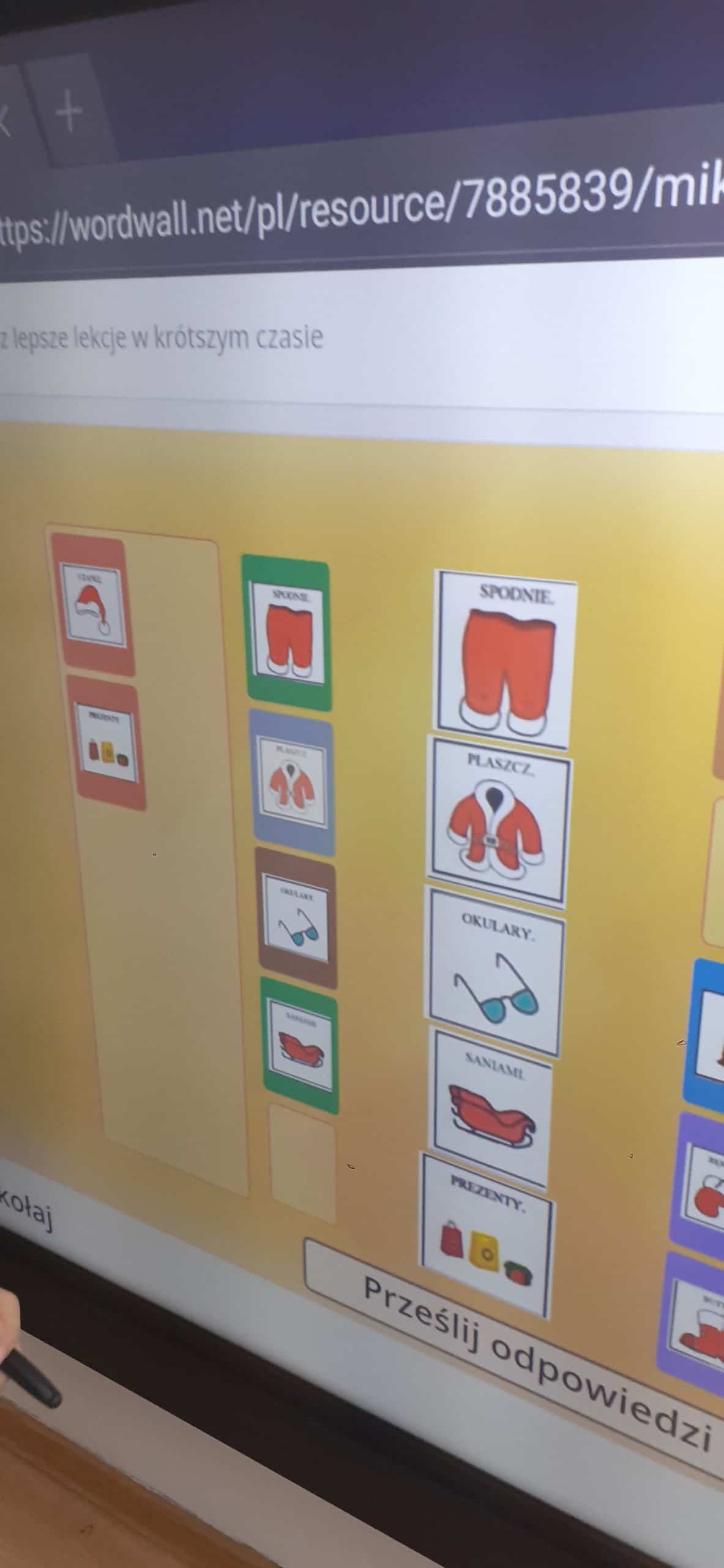 Zabawy i ćwiczenia z wykorzystaniem interaktywnego monitora z dotykowym ekranem są dla dzieci bardzo atrakcyjną formą zabawy i nauki. Tym razem dzieci miały okazje utrwalić treści związane z tradycjami odnoszącymi się do Świąt Bożego Narodzenia. Z ogromnym entuzjazmem odpowiadały na świąteczne zagadki, dobierały obrazki w pary, segregowały obrazki wg kategorii tematycznych, odpowiadały na pytania, zaznaczały prawidłową odpowiedź. Bardzo emocjonujące było sprawdzanie czasu wykonywania zadań i poprawności odpowiedzi.