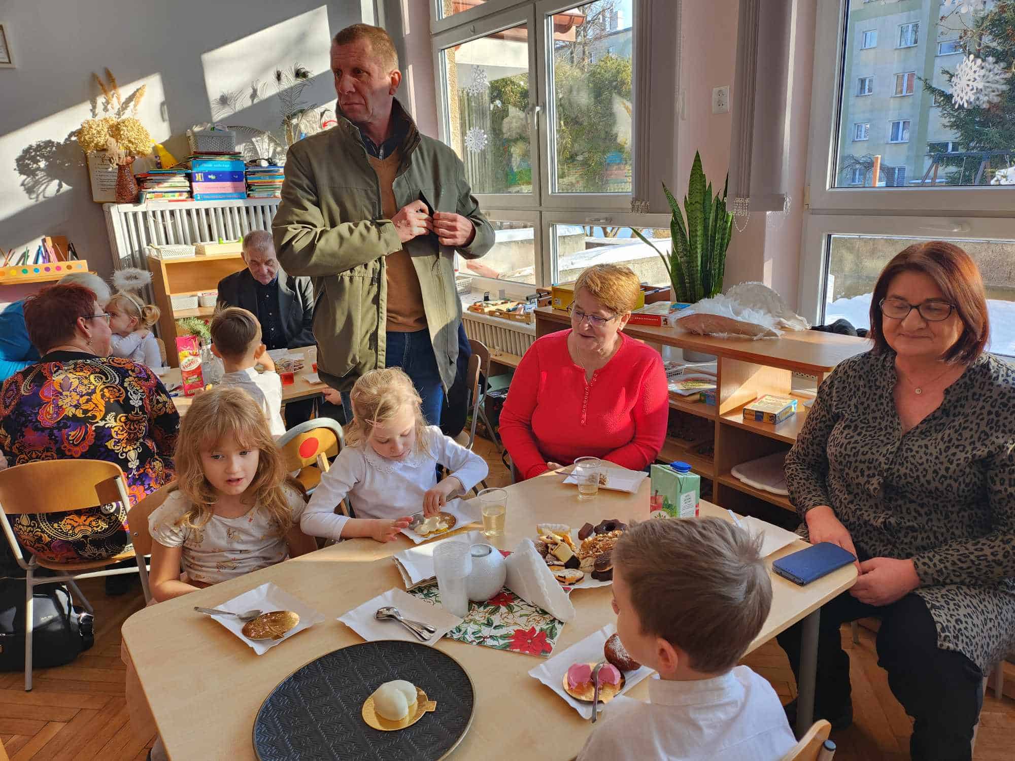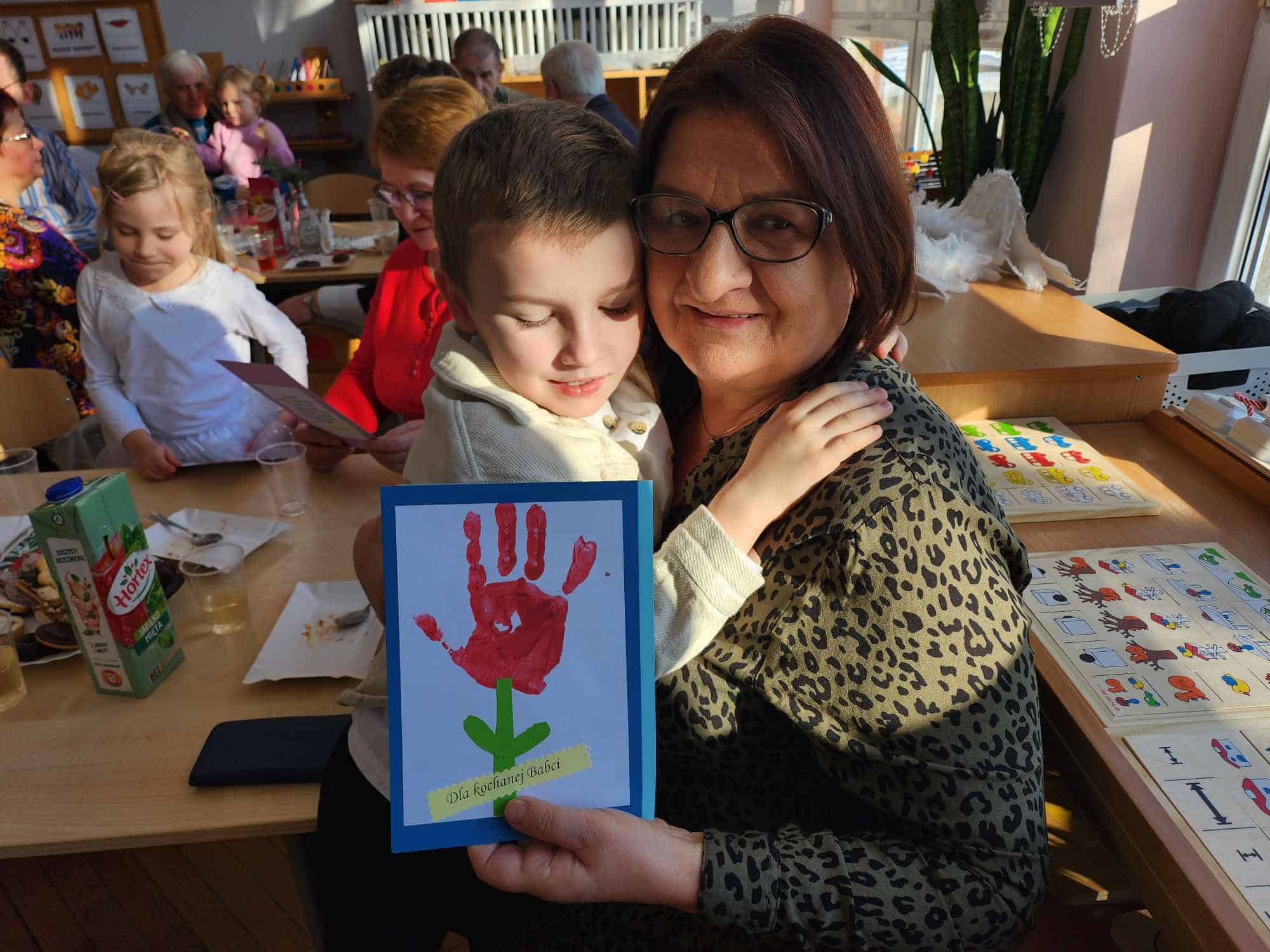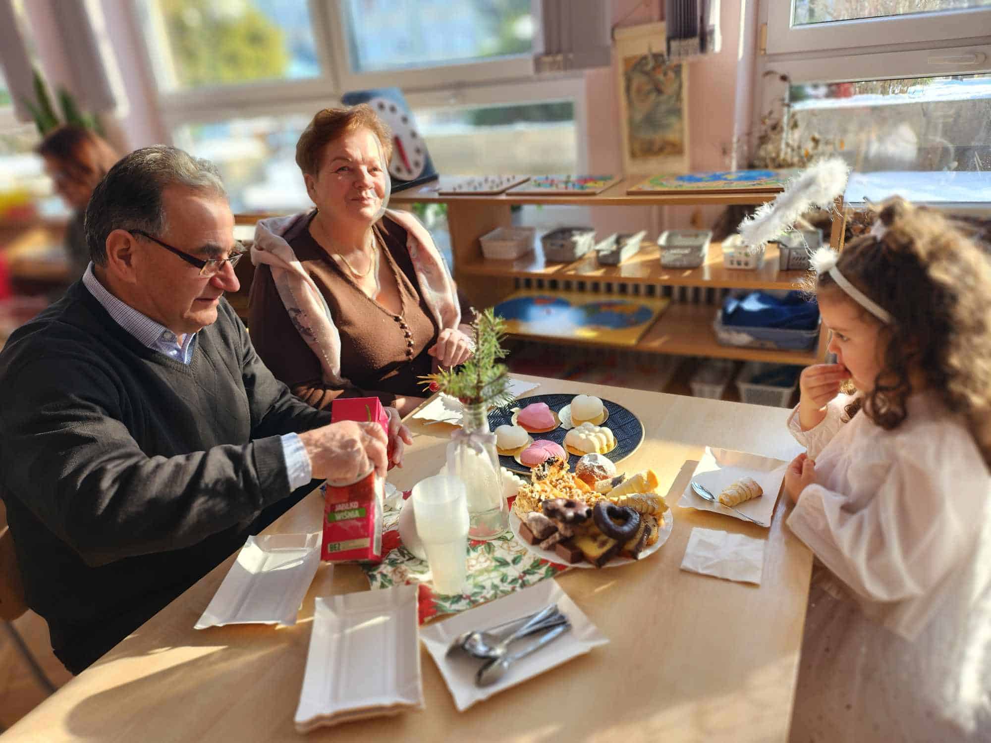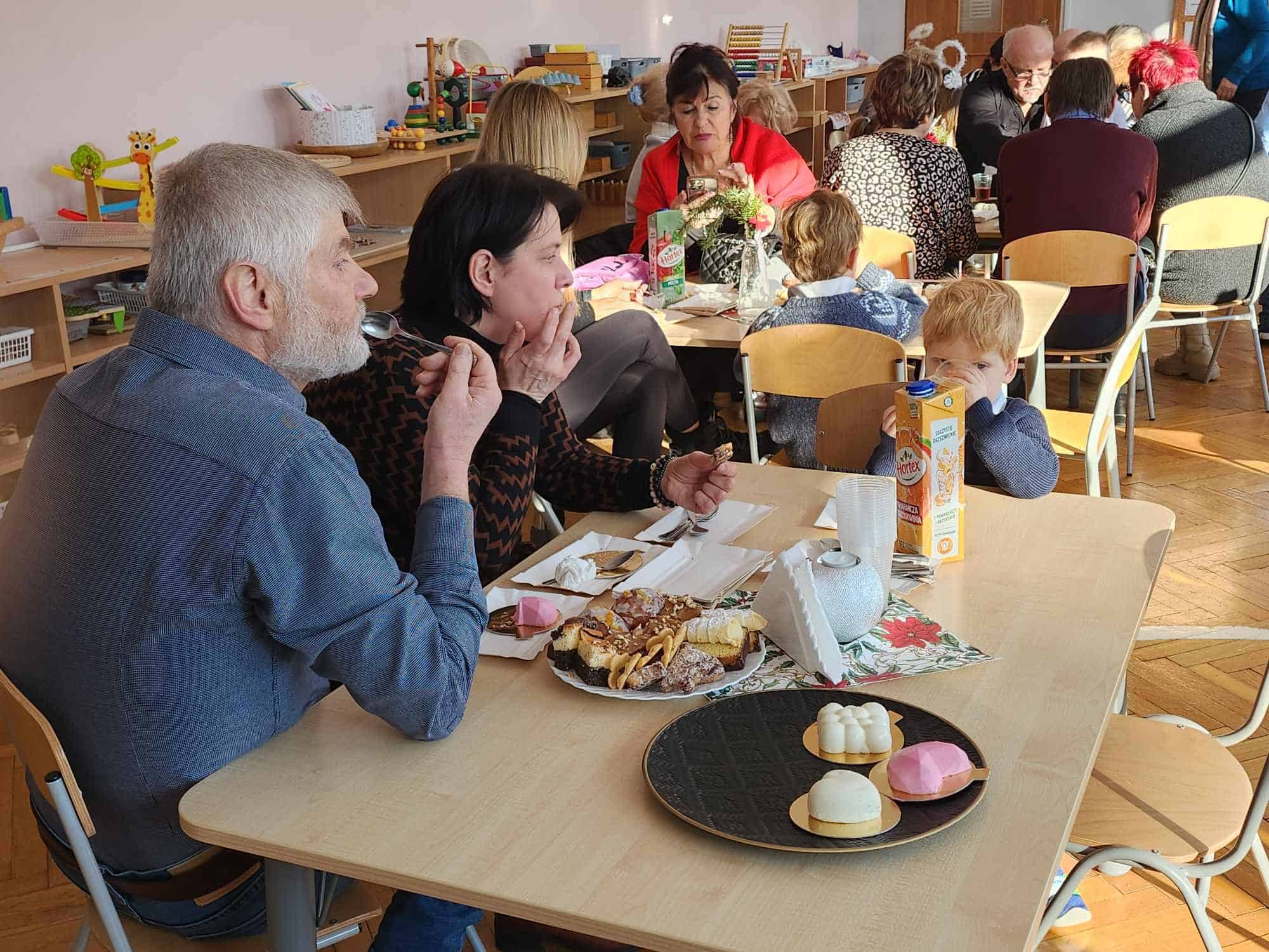 Po części artystycznej zaproszono przybyłych Gości na słodki poczęstunek do sali, gdzie można było porozmawiać i lepiej się poznać. Na zakończenie przedszkolaki wręczyły swoim ukochanym Babciom i Dziadkom laurki – nie zabrakło przy tym życzeń, przytulasów i całusów 🙂