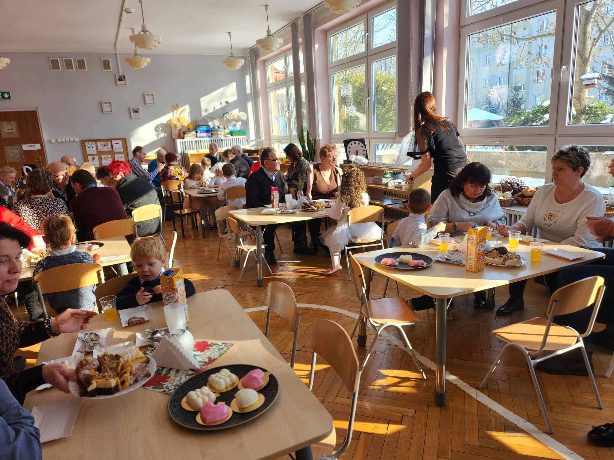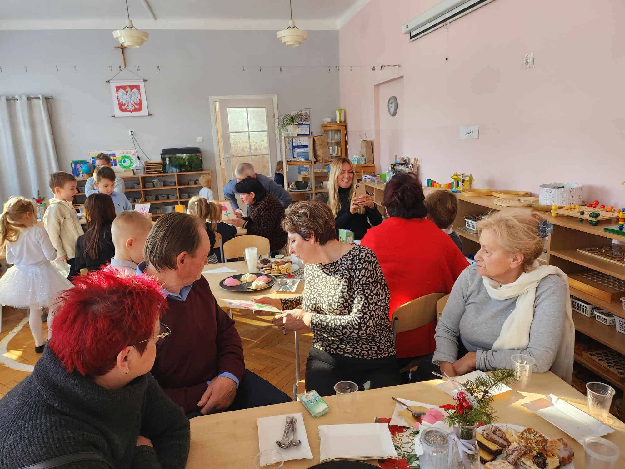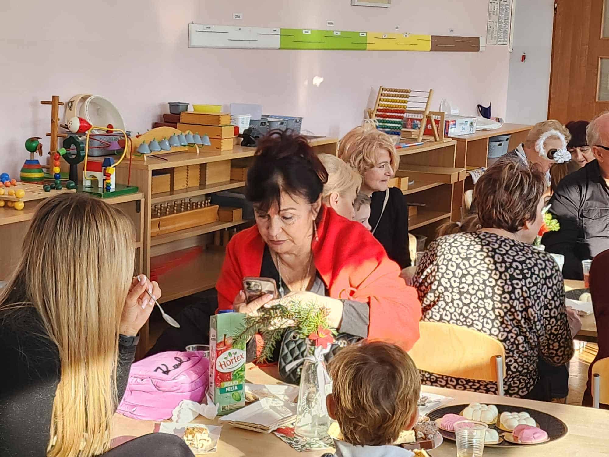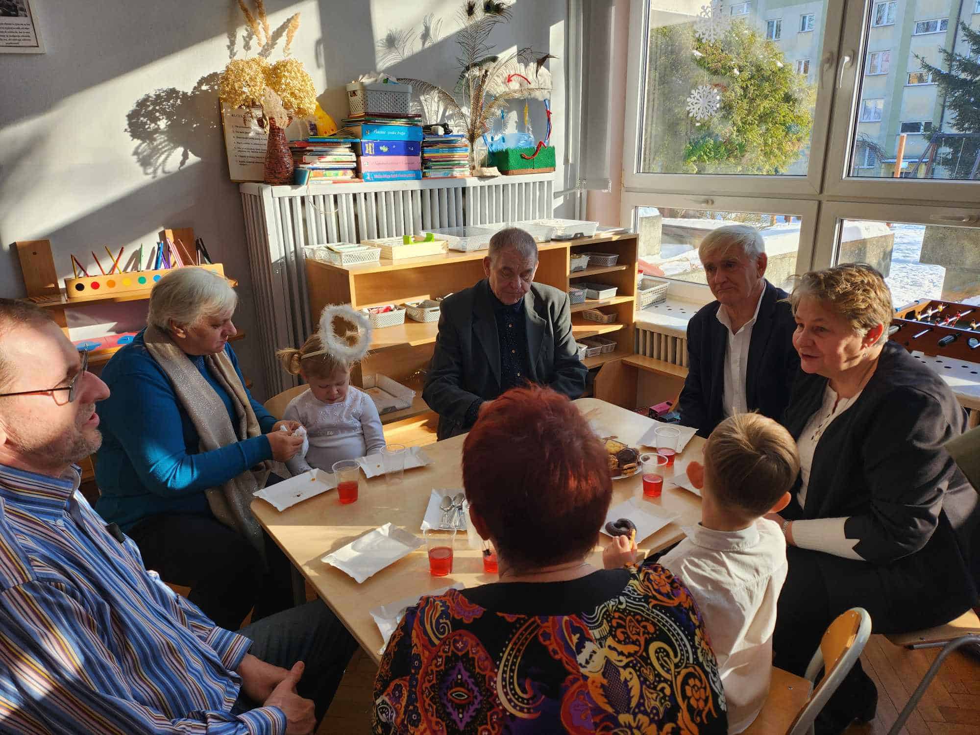 Po części artystycznej zaproszono przybyłych Gości na słodki poczęstunek do sali, gdzie można było porozmawiać i lepiej się poznać. Na zakończenie przedszkolaki wręczyły swoim ukochanym Babciom i Dziadkom laurki – nie zabrakło przy tym życzeń, przytulasów i całusów 🙂