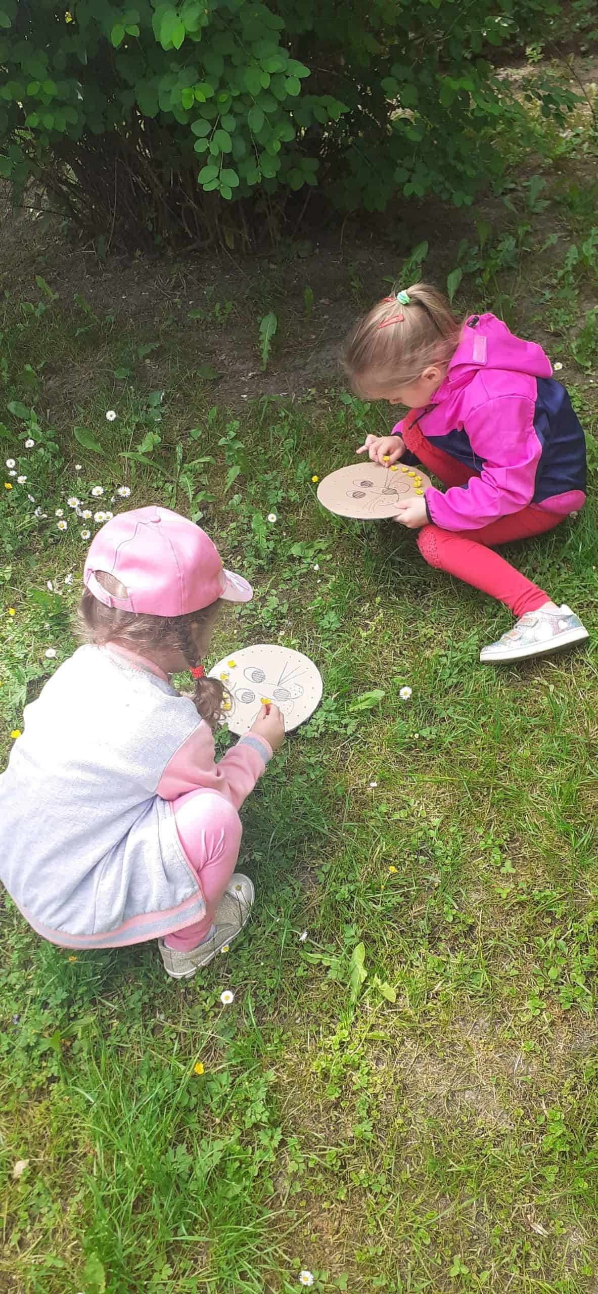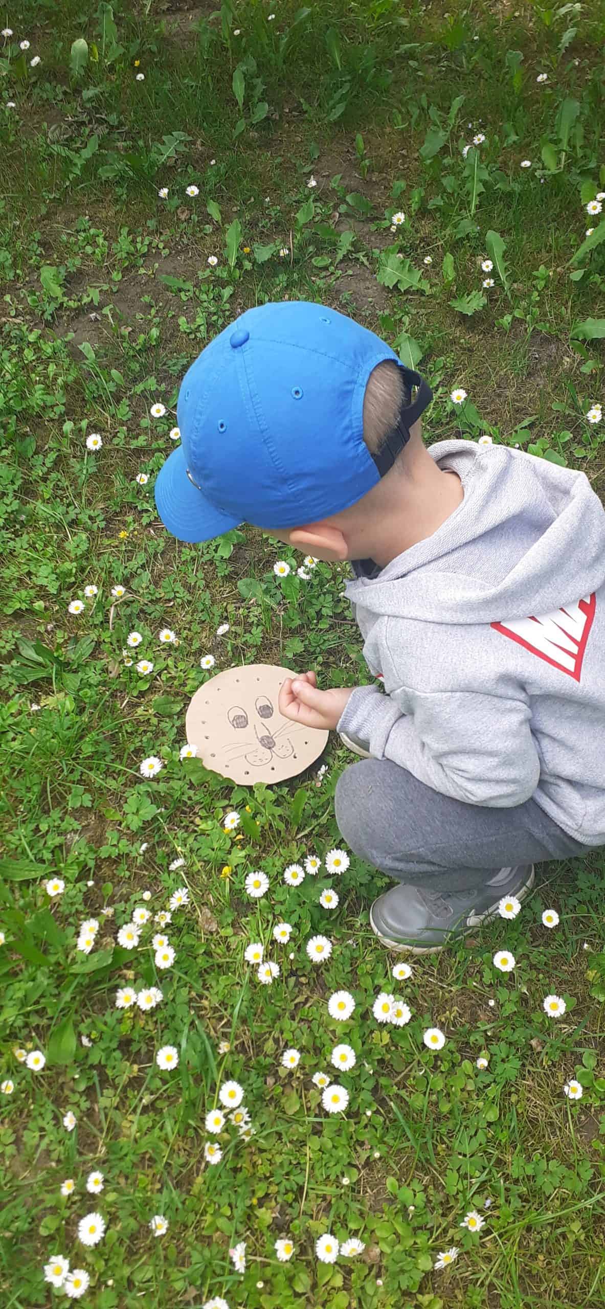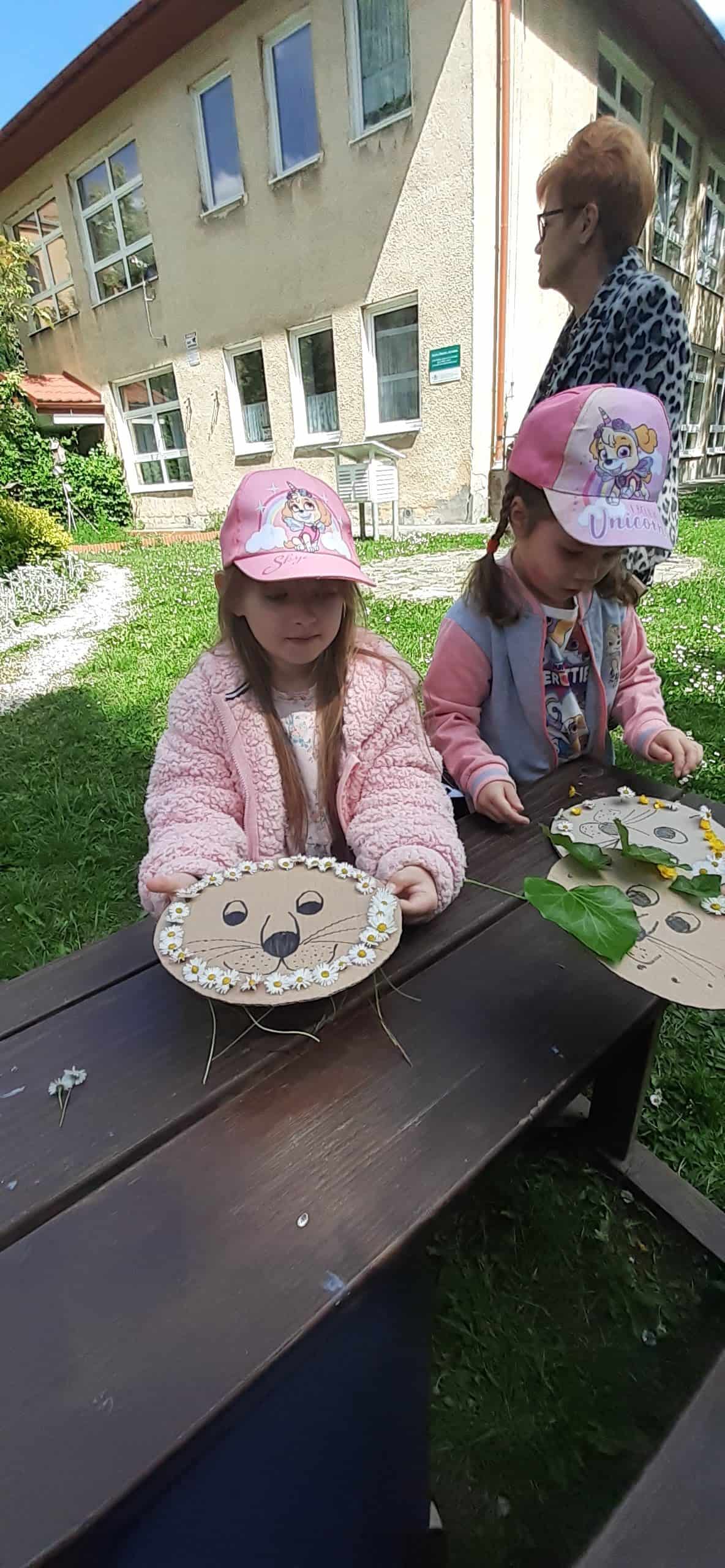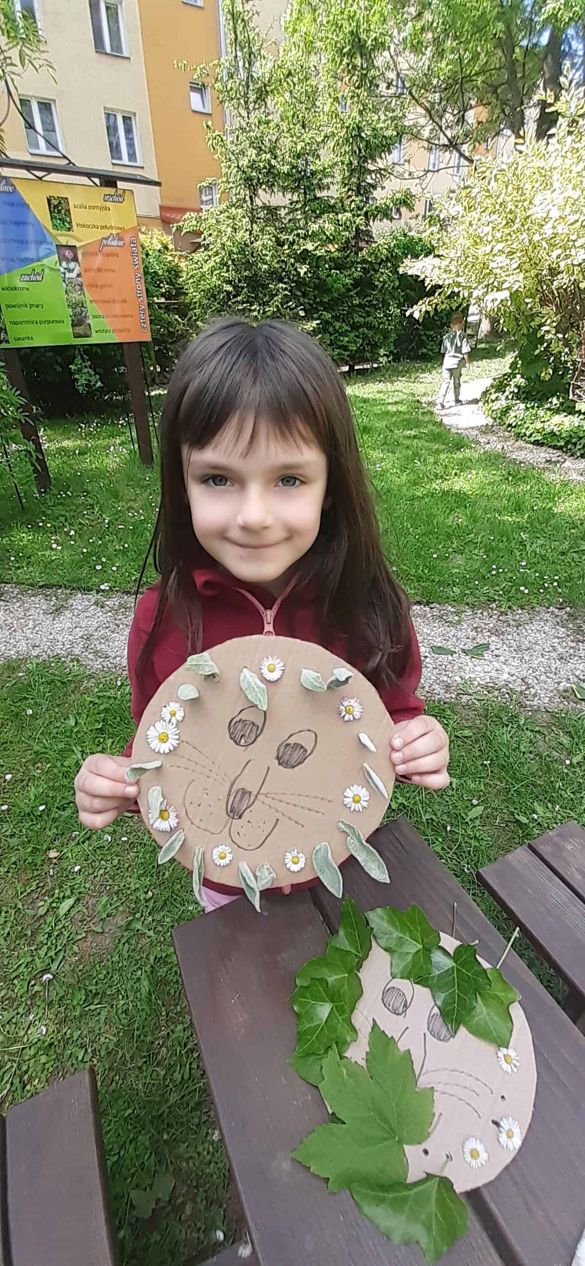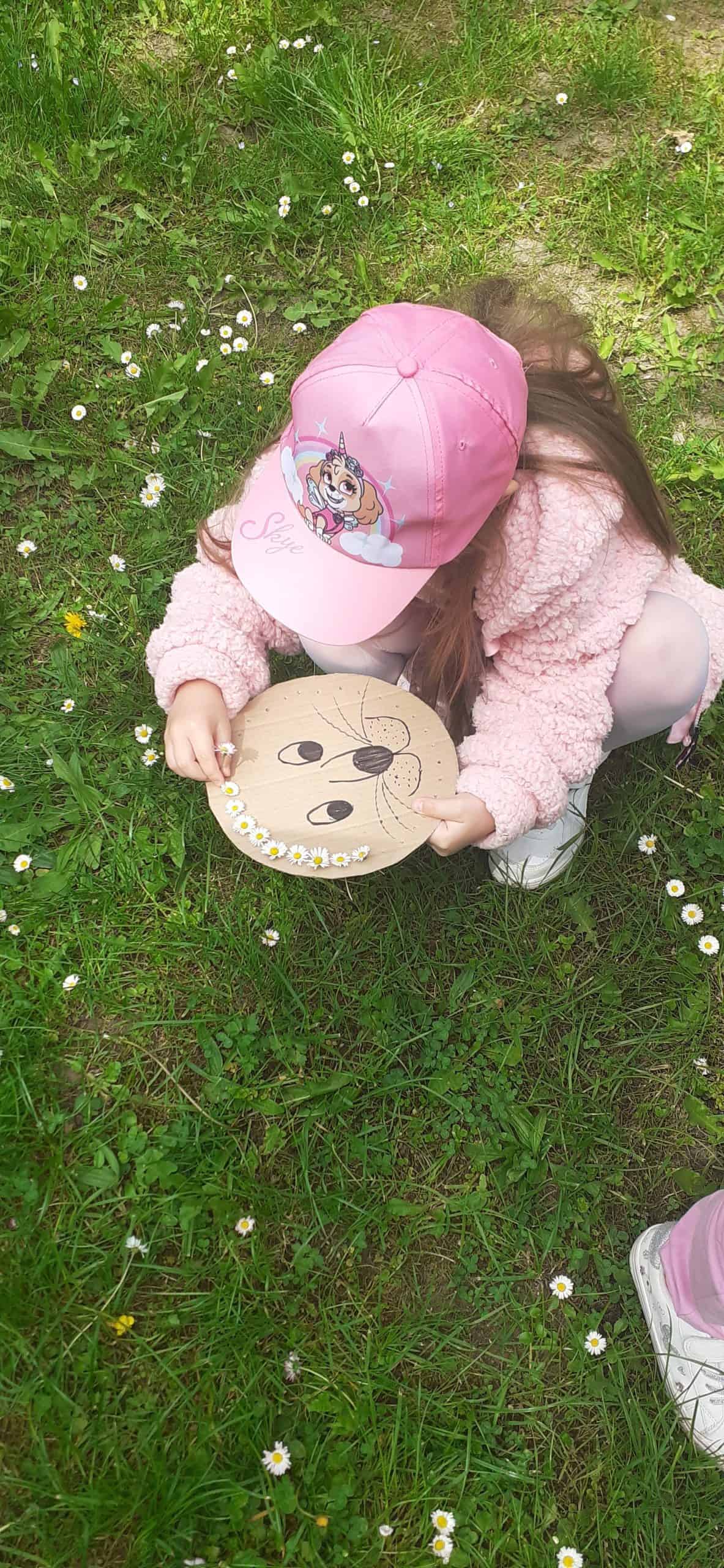 Wiosna w rozkwicie, wszystko dookoła zielenieje i kwitnie. Dzieci wszystkimi zmysłami doświadczają kolorów i zapachów wiosny. Z ochotą odnajdują ciekawe egzemplarze roślin, nazywają je, poznają ich kolorystykę i budowę. Przyrodnicza ścieżka edukacyjna w tym zakresie dostarcza dzieciom mnóstwo możliwości. Tym razem dzieci otrzymały podziurkowaną tekturkę, na której narysowana było głowa lwa. Zadanie dzieci polegało wypełnieniu otworków różnorodnymi roślinami tak, aby powstała oryginalna głowa lwa. Był to proces przekształcania wyobraźni w rzeczywistość, dzieci okazały się bardzo kreatywne, rozwijały swoją wyobraźnię. Wszelkie twórcze działania sprzyjają dziecku w rozwoju jego potencjału, dzieci mają wtedy możliwość wyrażania swojej indywidualności.