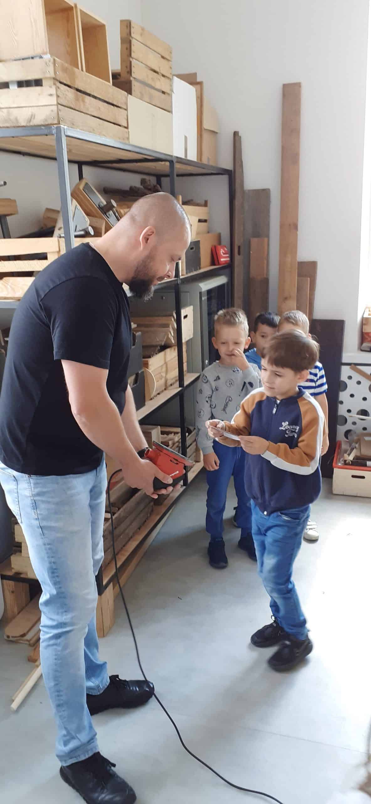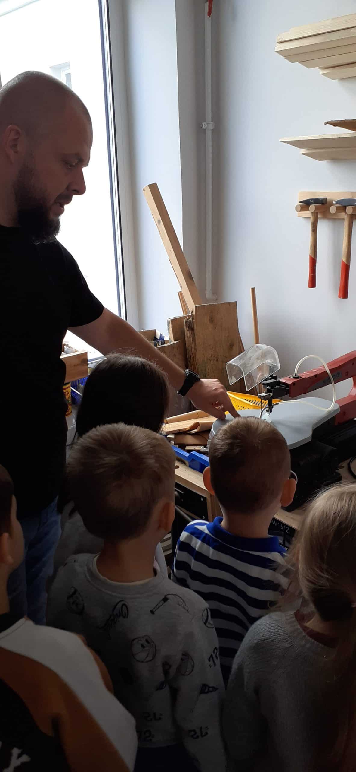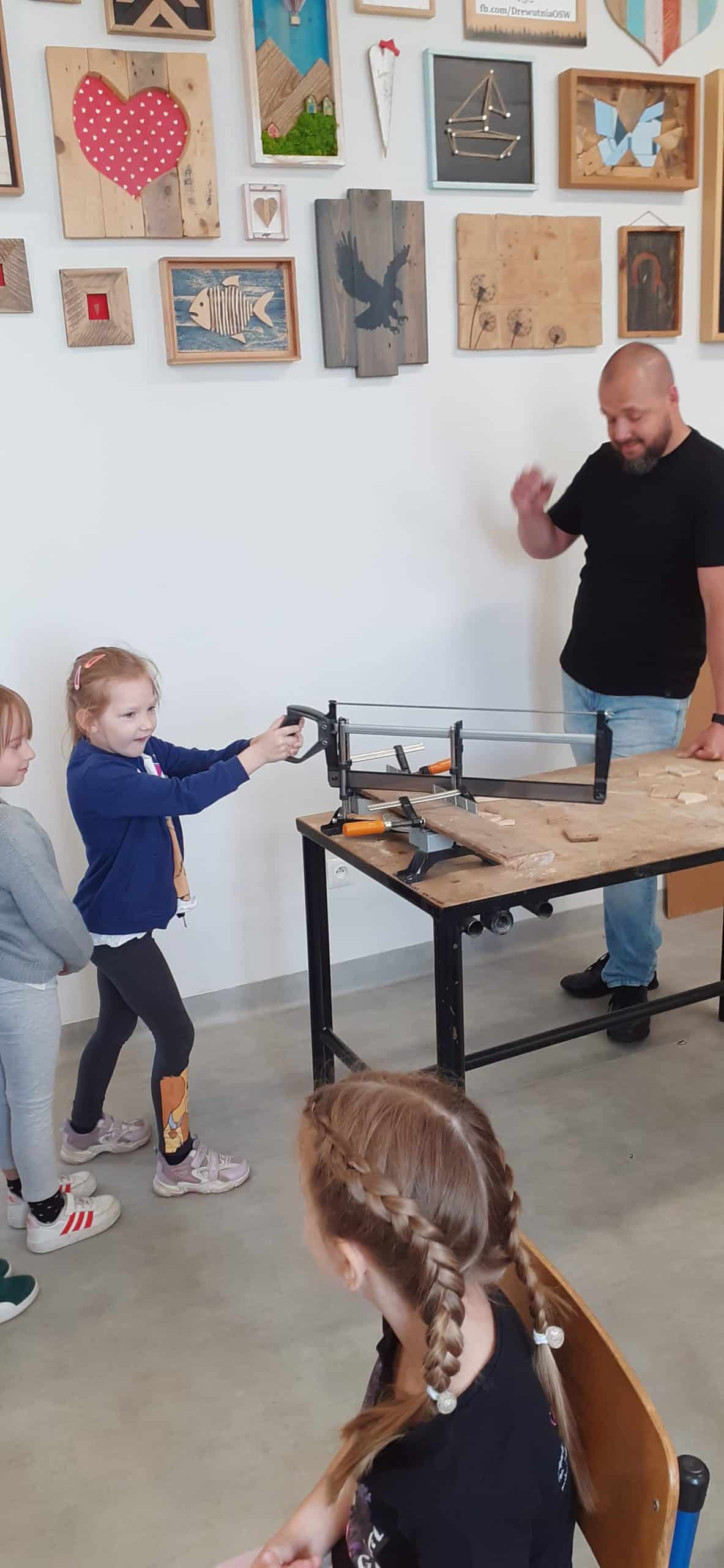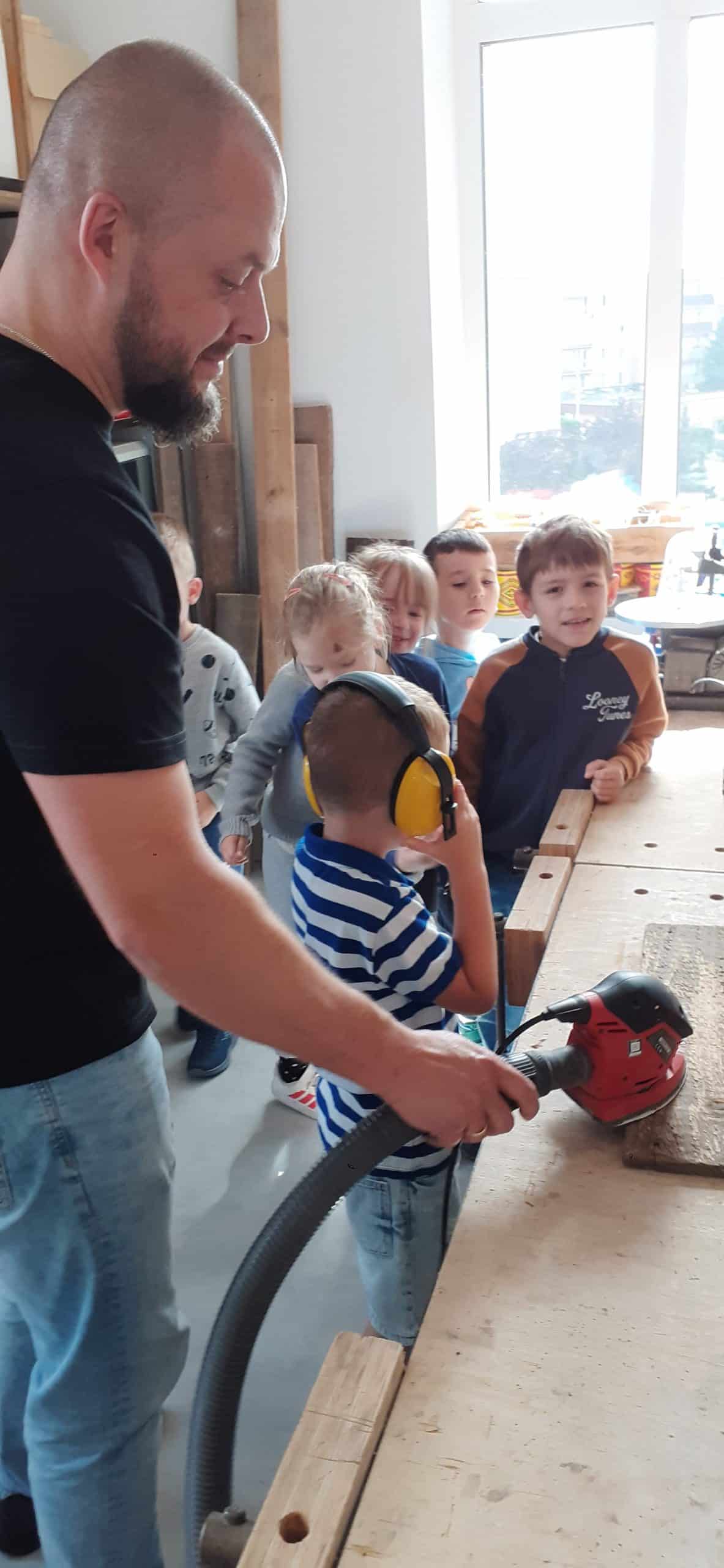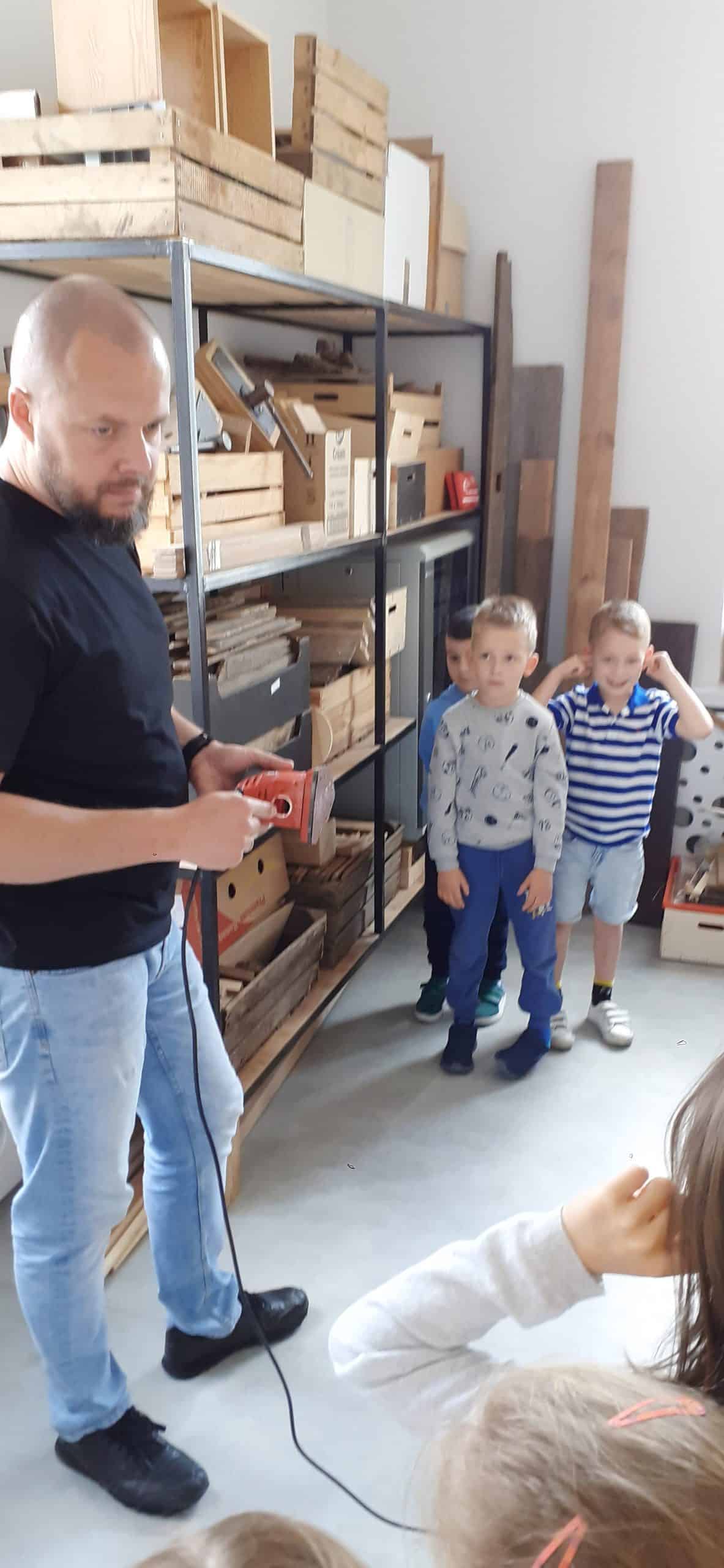 Drewutnia to pracownia stolarska znajdująca się w Ośrodku Szkolno – Wychowawczym. Dzieci miały okazję poznać właściwości drewna i sposoby jego wykorzystania, zwiedzały pracownię, poznały narzędzia stolarskie i pod czujnym okiem Pana Roberta – nauczyciela tego Ośrodka doświadczały jak pracuje się z drewnem z wykorzystaniem rożnych narzędzi. Dzieci podziwiały zawieszone na ścianach pracowni rękodzieła wykonane przez uczniów, to przykład tego, że można dać drugie życie drewnu. Serdecznie dziękujemy Panu Robertowi za możliwość aktywnych działań Przedszkolaków w Drewutni, to kolejne ciekawe doświadczenie dla dzieci.