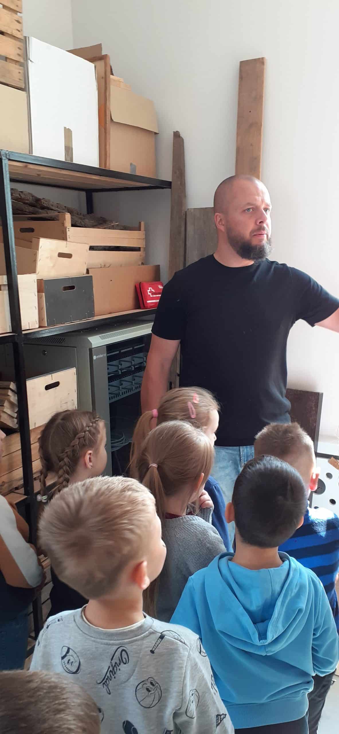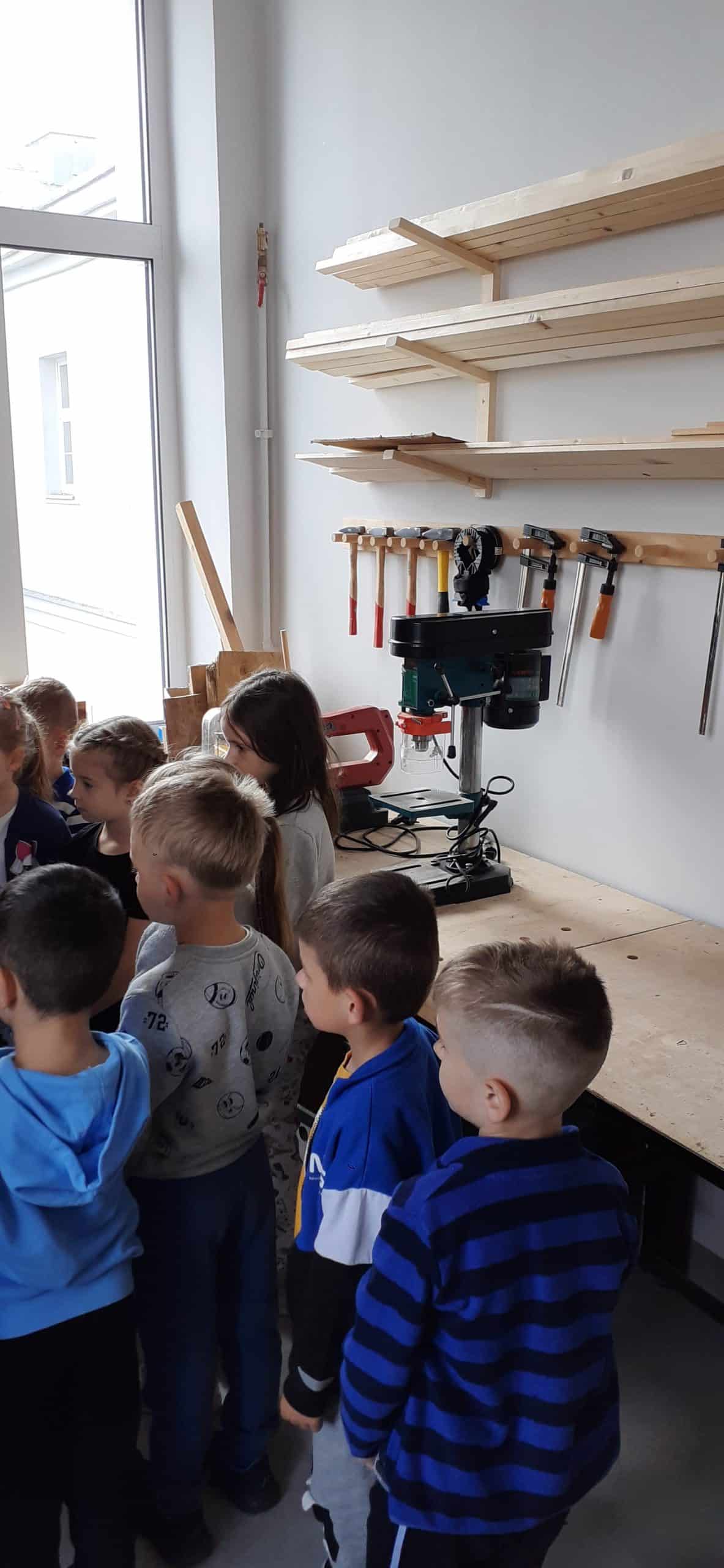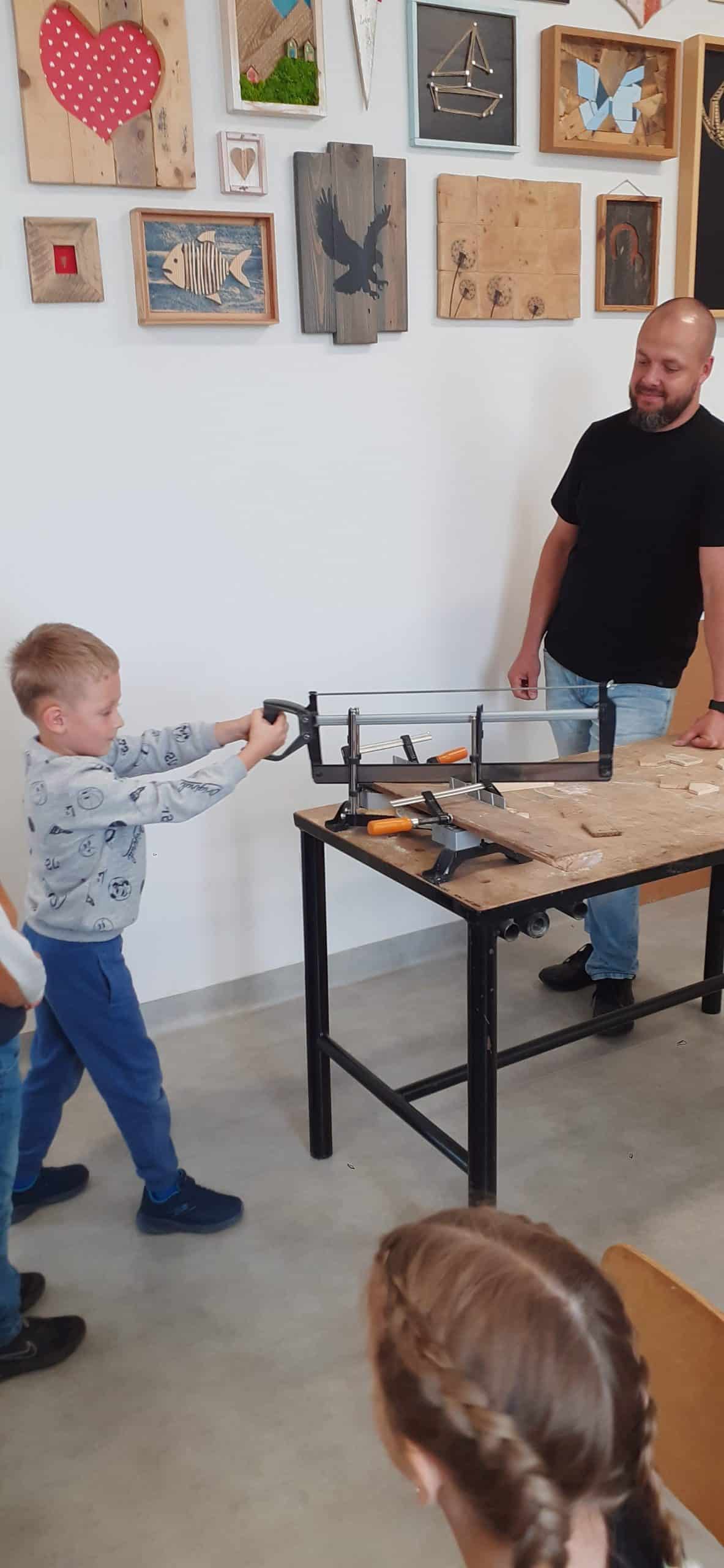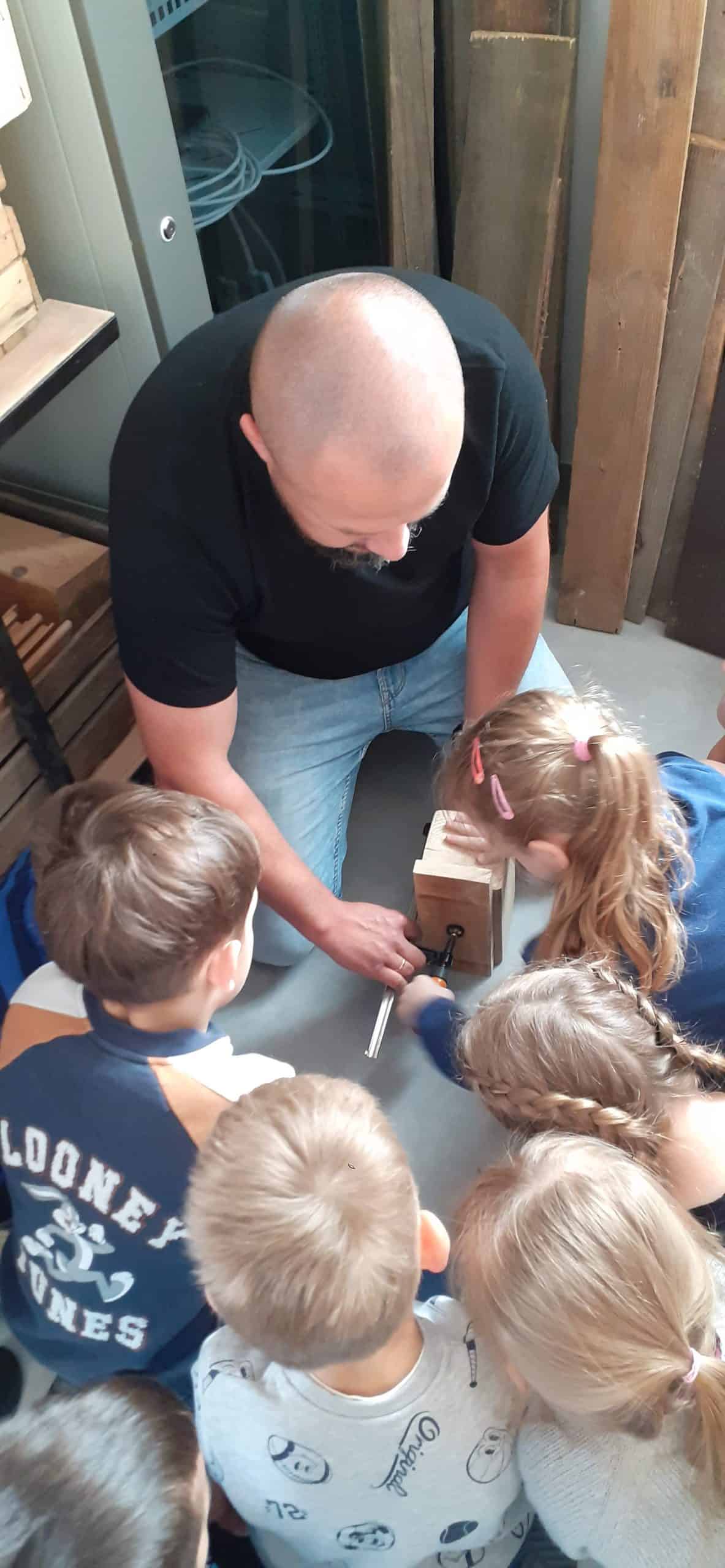 Drewutnia to pracownia stolarska znajdująca się w Ośrodku Szkolno – Wychowawczym. Dzieci miały okazję poznać właściwości drewna i sposoby jego wykorzystania, zwiedzały pracownię, poznały narzędzia stolarskie i pod czujnym okiem Pana Roberta – nauczyciela tego Ośrodka doświadczały jak pracuje się z drewnem z wykorzystaniem rożnych narzędzi. Dzieci podziwiały zawieszone na ścianach pracowni rękodzieła wykonane przez uczniów, to przykład tego, że można dać drugie życie drewnu. Serdecznie dziękujemy Panu Robertowi za możliwość aktywnych działań Przedszkolaków w Drewutni, to kolejne ciekawe doświadczenie dla dzieci.