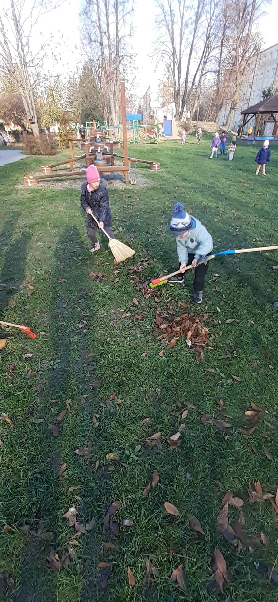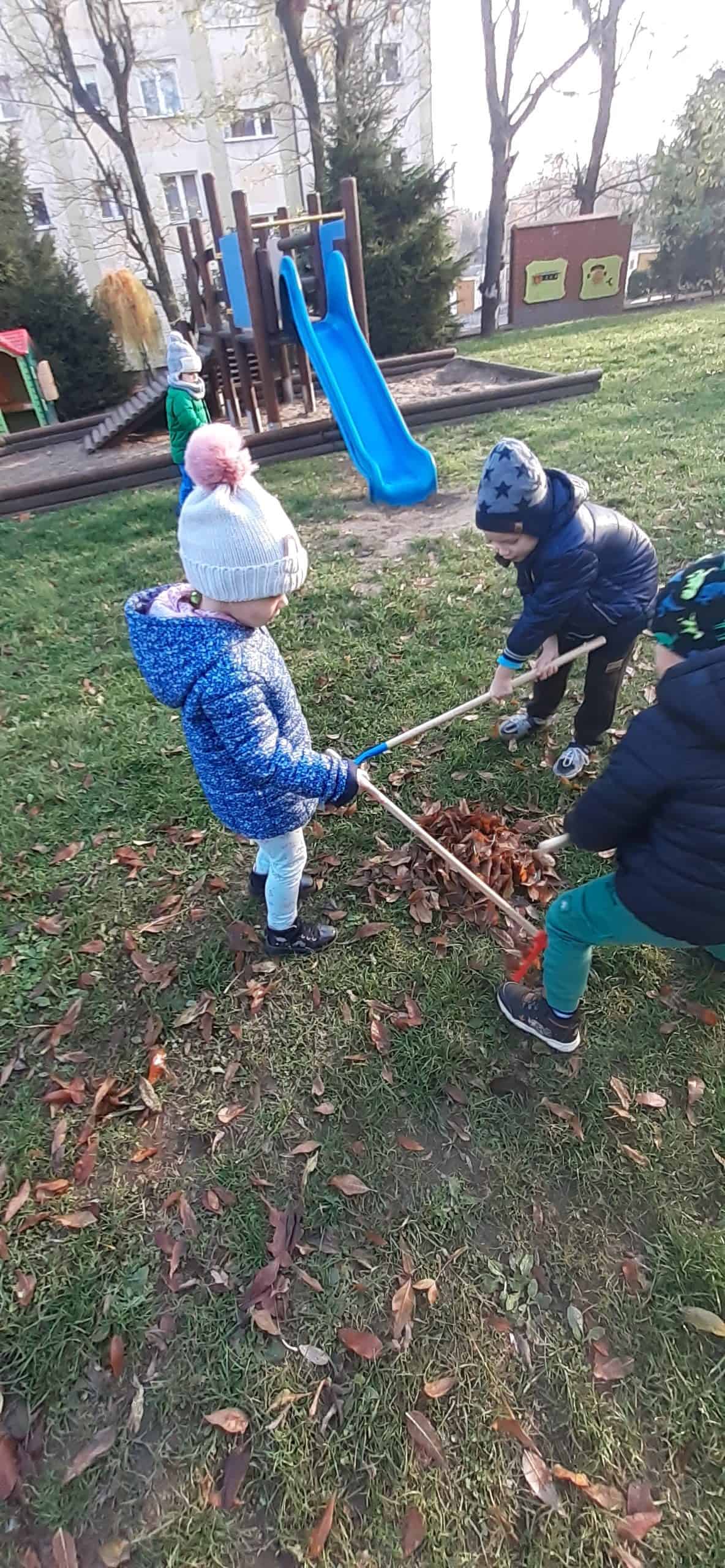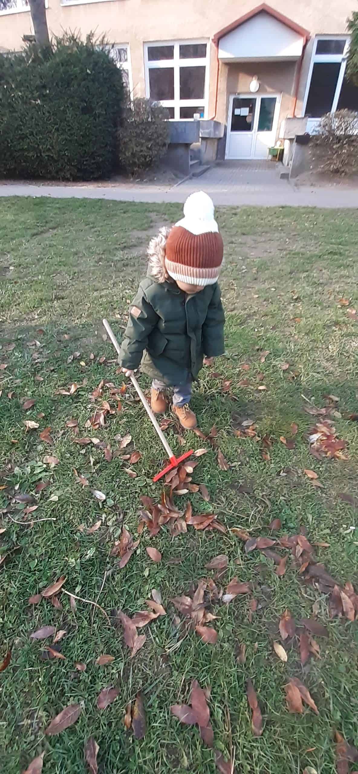 Jesienne porządki w ogrodzie to istotny element  pielęgnacji roślin. Od jakości tej pielęgnacji zależy w jakim stanie  rośliny przetrwają zimę. Dzieci dokonując obserwacji przyrodniczych roślin w okresie jesieni dowiedziały się o podstawowych czynnościach przygotowujących rośliny do  zimy: m.in przycinanie gałęzi, zabezpieczanie bylin przed mrozem  oraz grabienie liści.  Do tej ostatniej czynności dzieci przystąpiły z entuzjazmem. Małe grabki i miotły poszły w ruch, szybko tworzyły się małe skupiska grabionych liści. Dzieci doskonale wiedziały,  że taka warstwa liści to też doskonałe schronienie dla zwierząt  w okresie zimy np  dla jeży. Grabienie liści okazało się bardzo przyjemnych zadaniem dla dzieci.