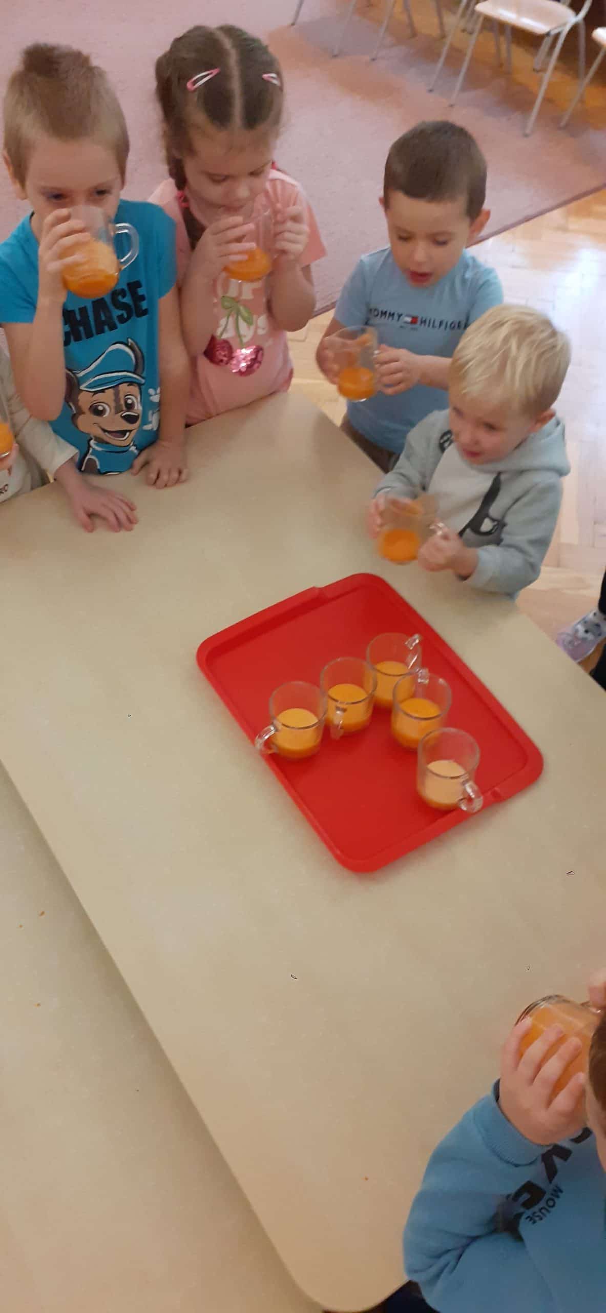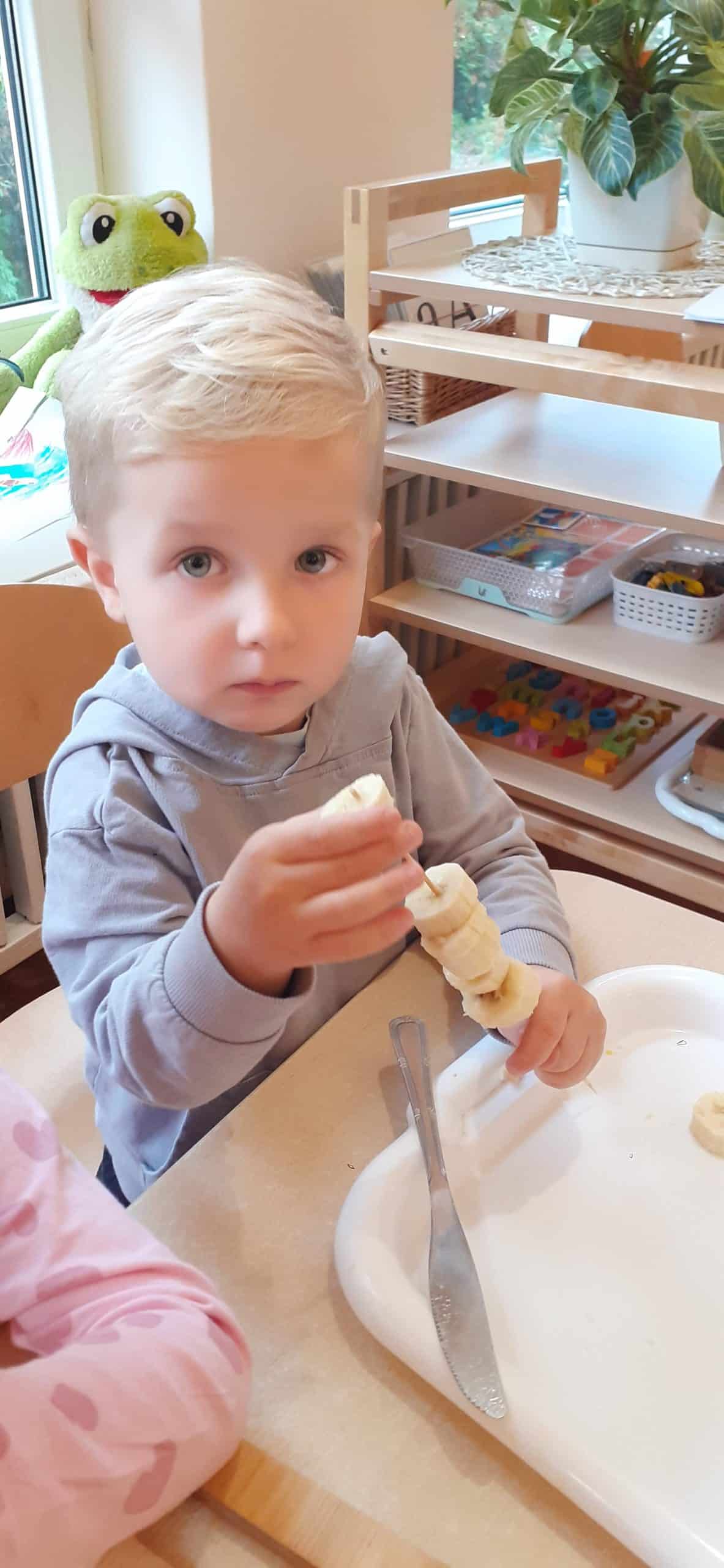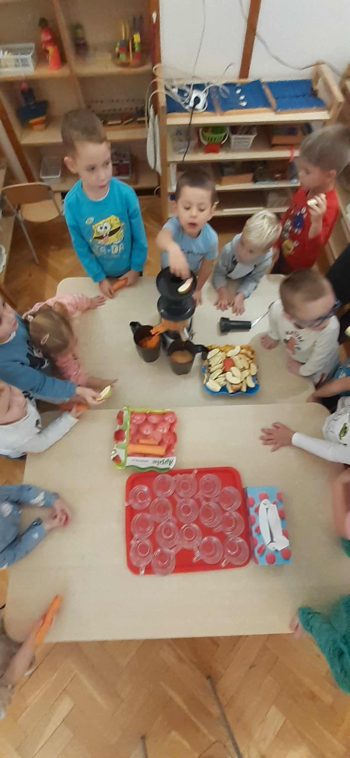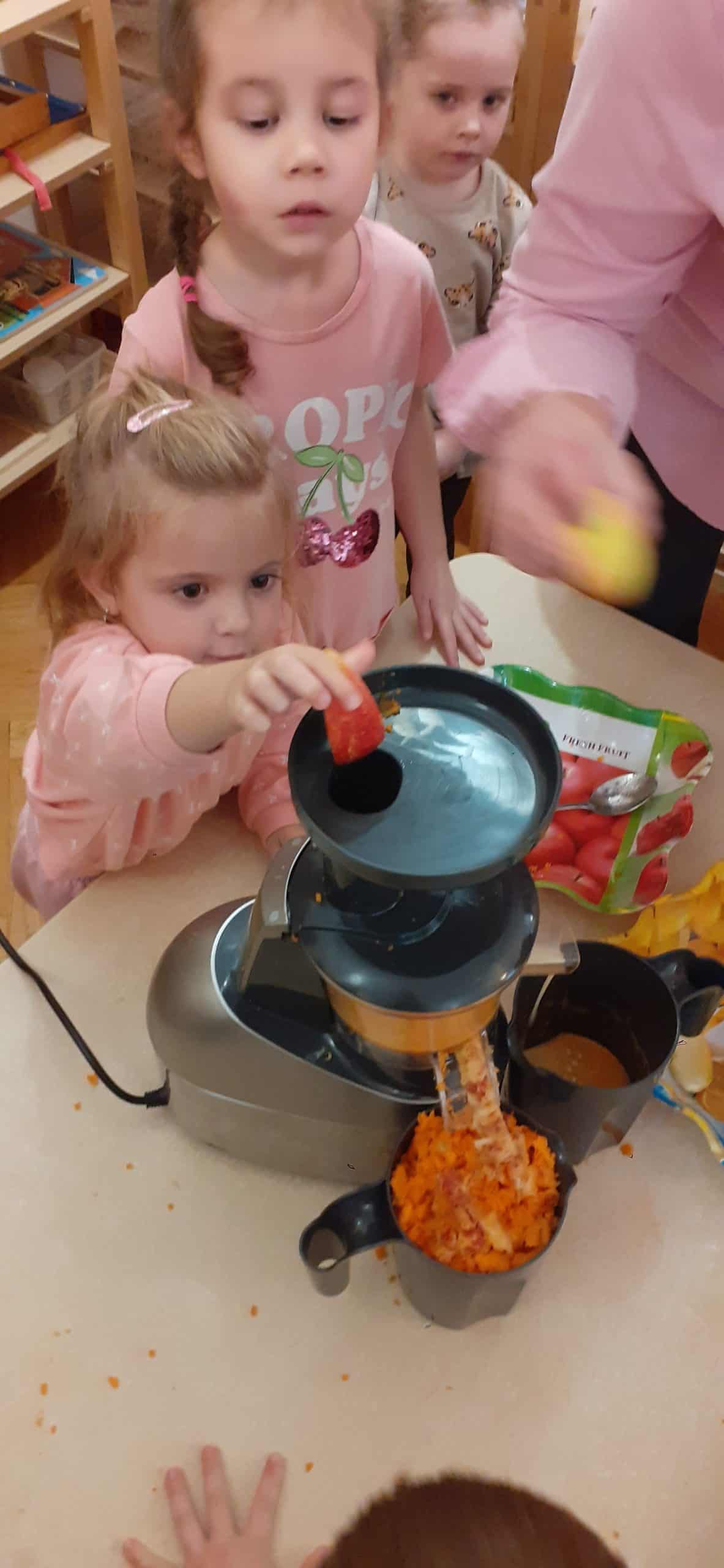 Dzieci z grupy Pomarańczowej z ochotą przystąpiły do wykonania szaszłyków owocowych i soku warzywno – owocowego. Było to podsumowanie wiedzy o darach jesieni pochodzących z sadu i ogrodu warzywnego. Organizowano zróżnicowane sytuacje edukacyjne służące poznaniu roli pestek w owocach i warzywach, poznaniu cyklu produkcyjnego soku i dżemu. Mając pewne doświadczenia dotyczące wzrostu roślin dzieci wskazywały, które dary jesieni rosną na drzewie, na krzewie, nad ziemią i pod ziemią, wskazywały również cześć nadziemną i podziemną. Nie mogło zabraknąć wiedzy na temat wartości odżywczych owoców i warzyw – stąd dzieci podjęły czynności związane z wykonaniem soku owocowo- warzywnego oraz owocowych szaszłyków. Przy okazji doskonaliły czynności dnia codziennego – umiejętność krojenia owoców i warzyw.